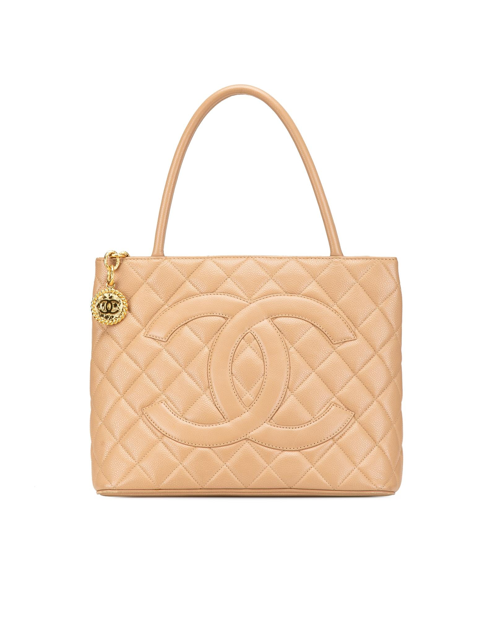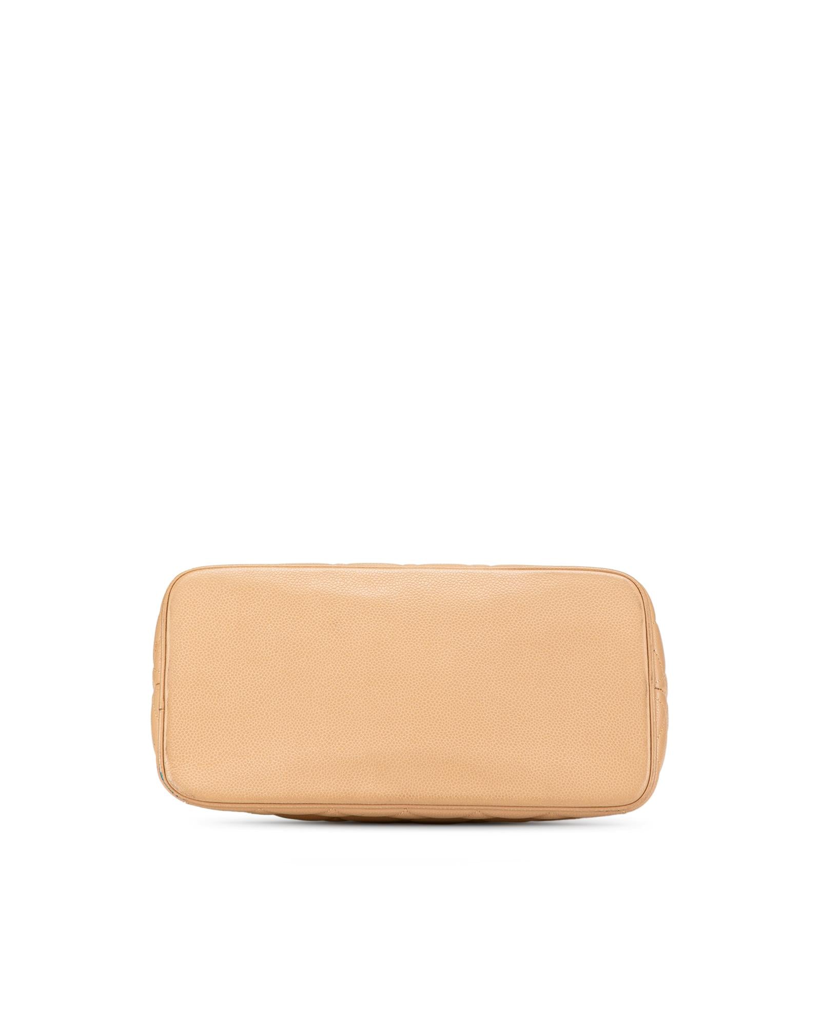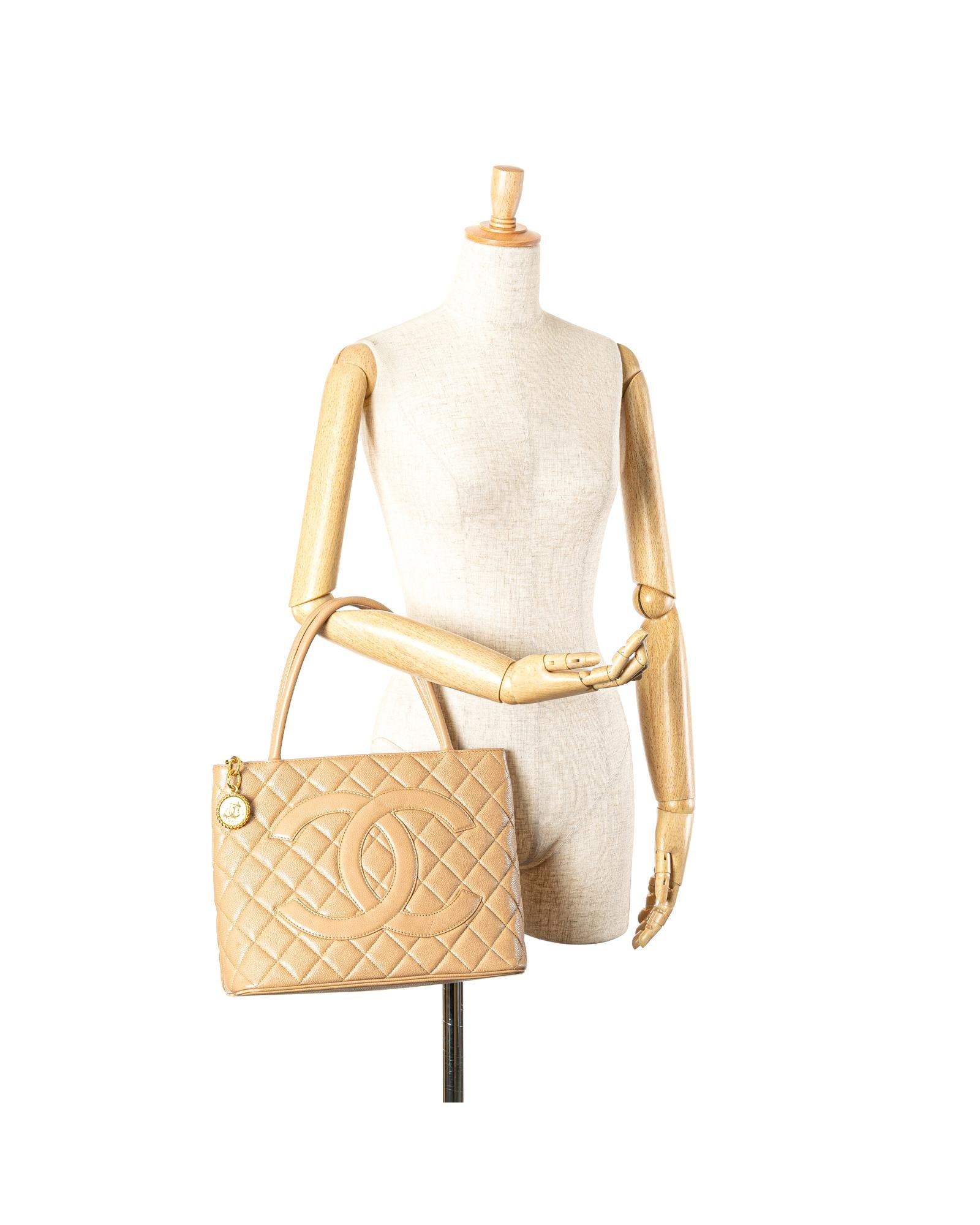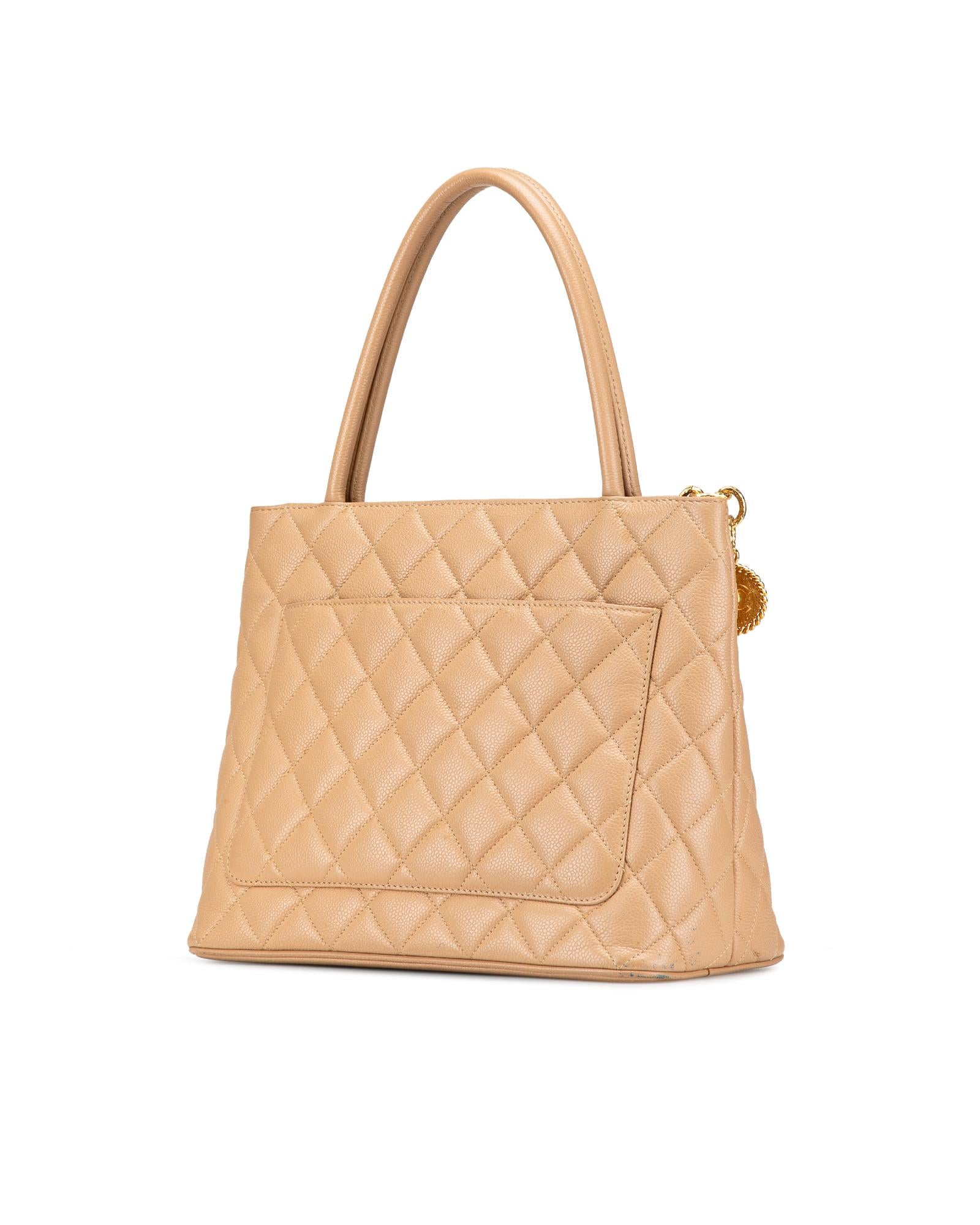 The Medallion tote bag features a quilted caviar leather body rolled leather handles a top zip closure an exterior back slip pocket and interior zip and slip pockets.