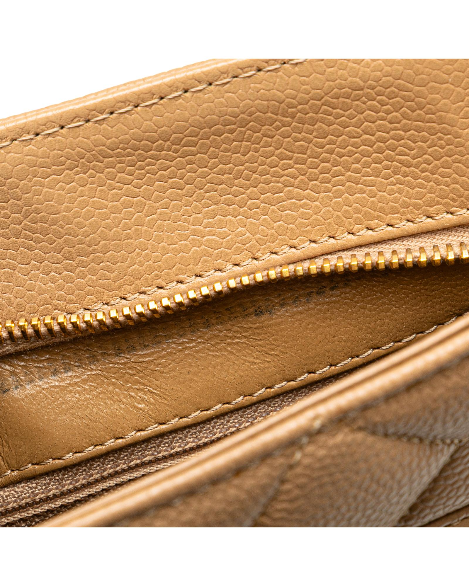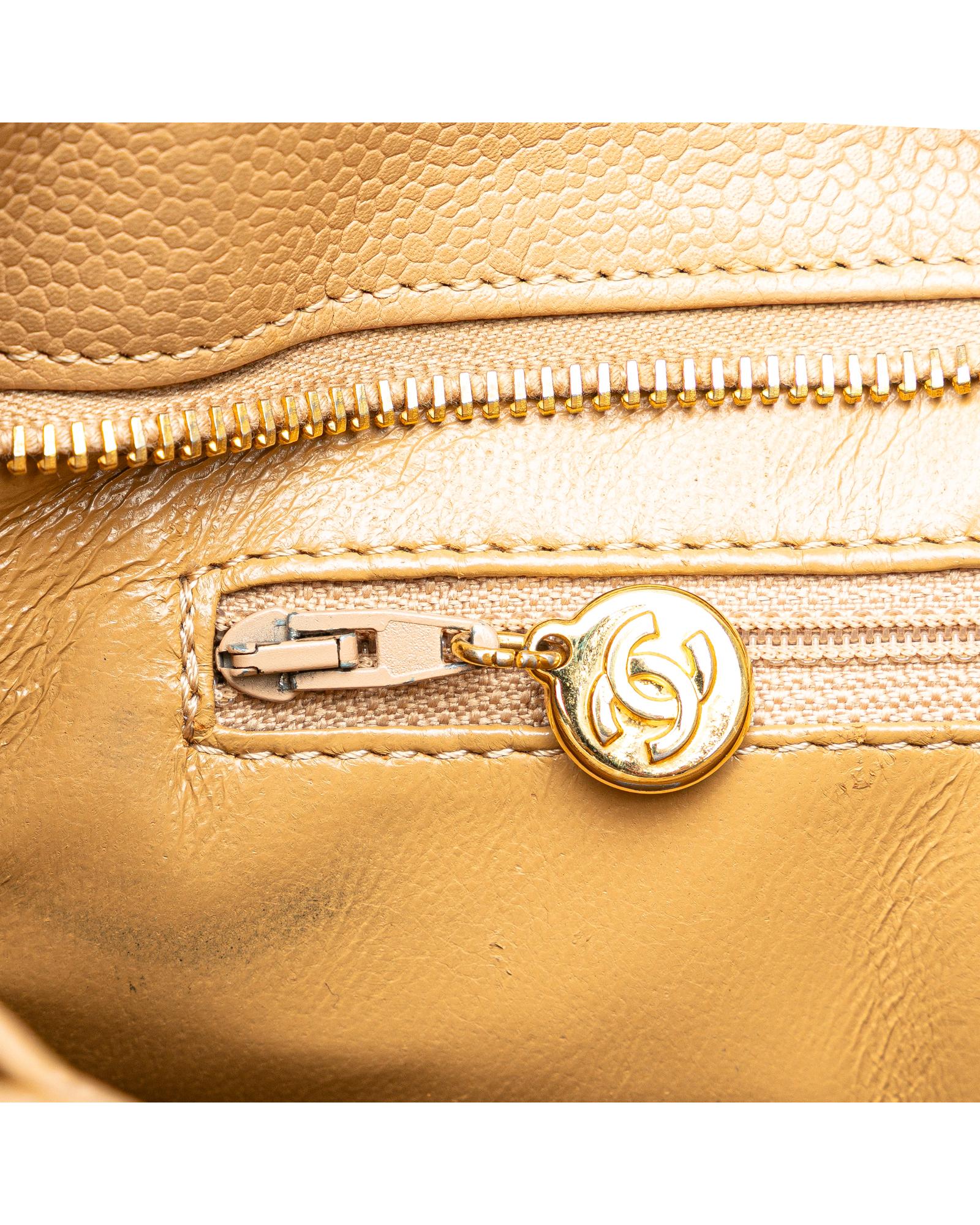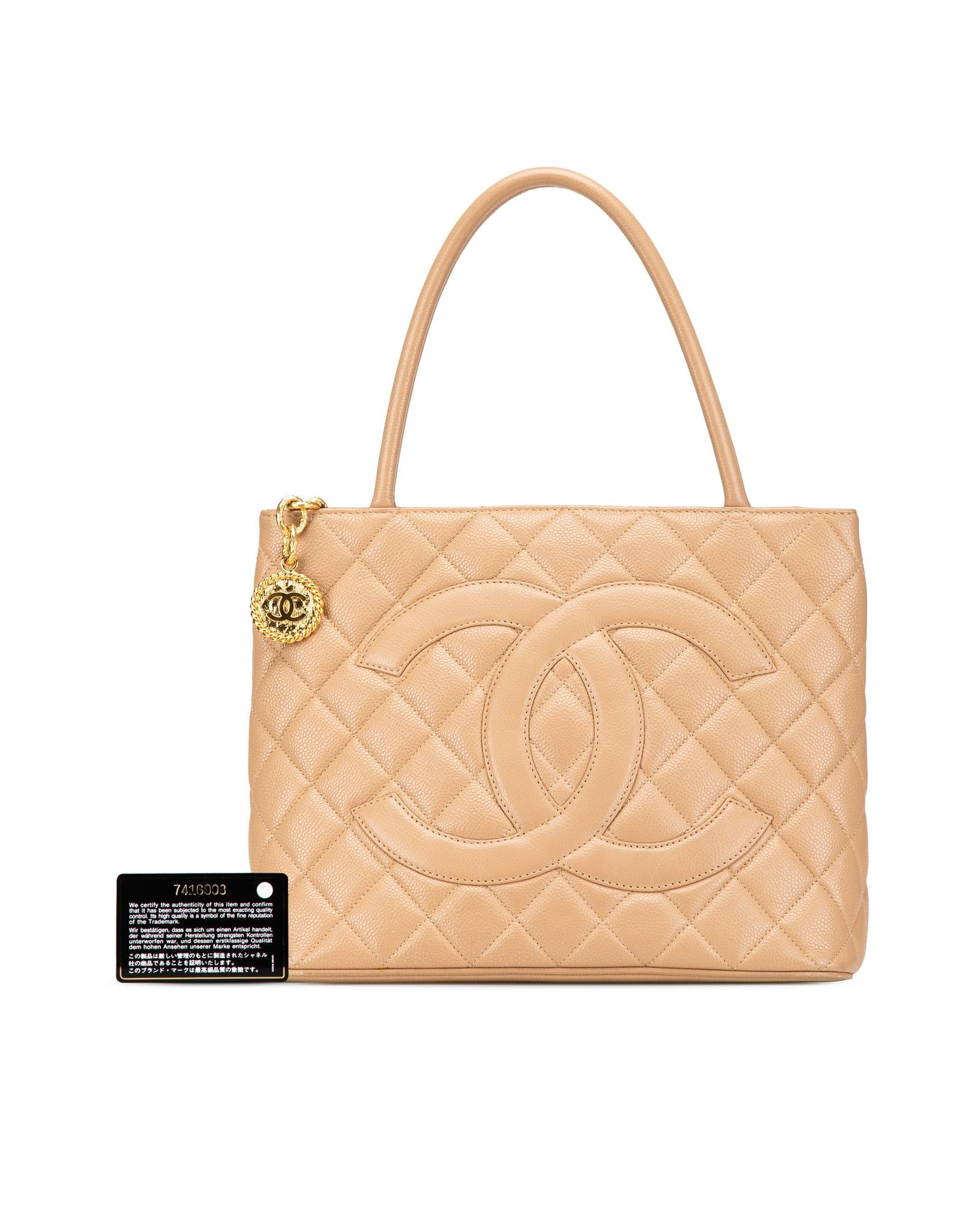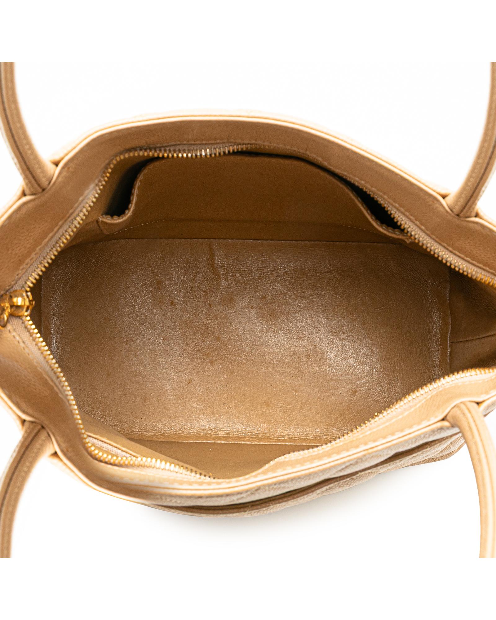 The Medallion tote bag features a quilted caviar leather body rolled leather handles a top zip closure an exterior back slip pocket and interior zip and slip pockets.