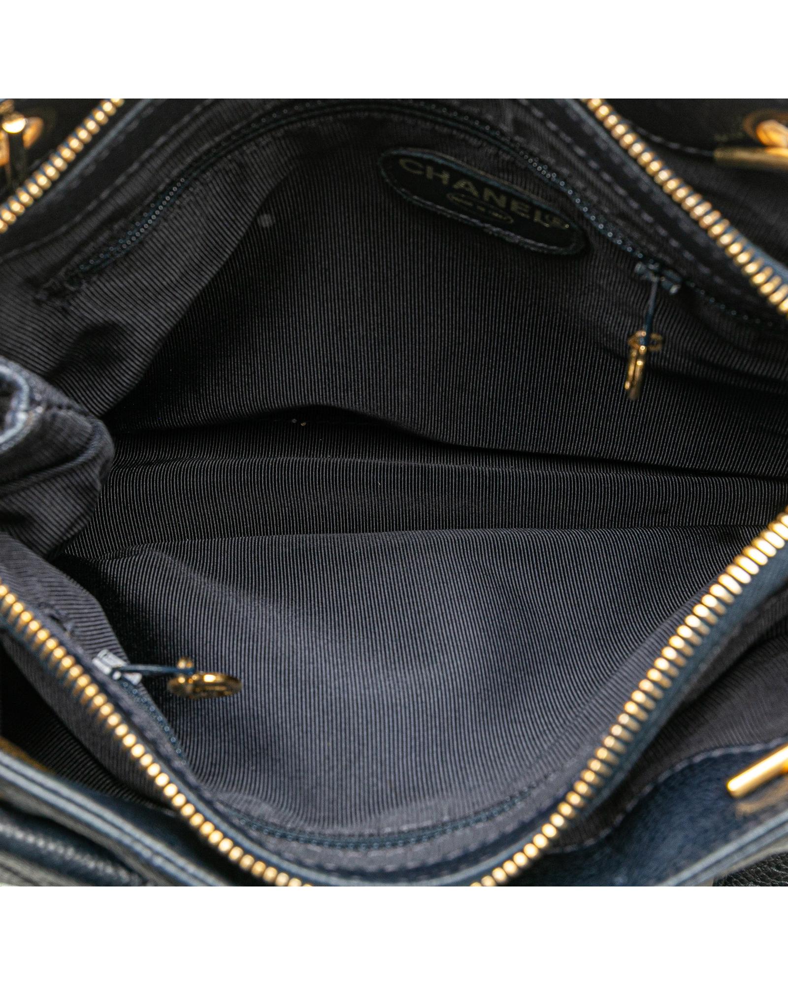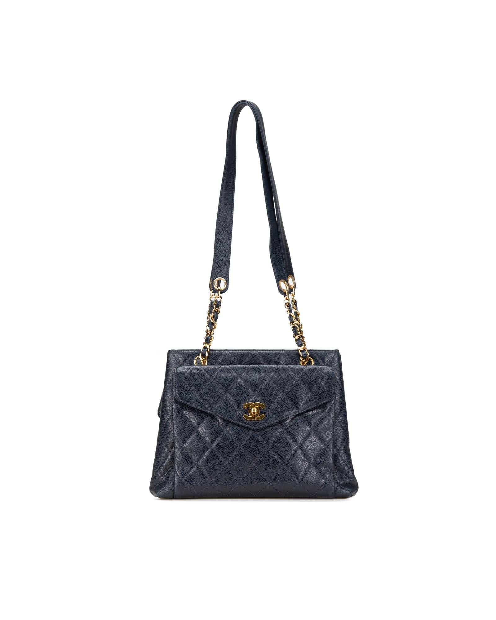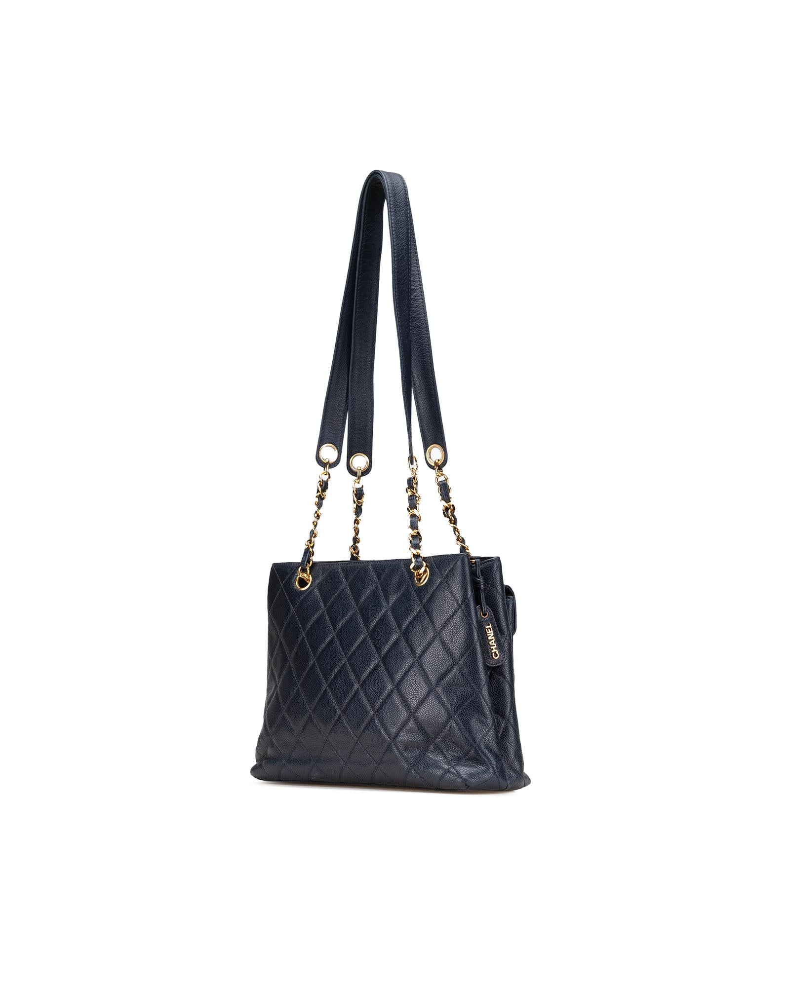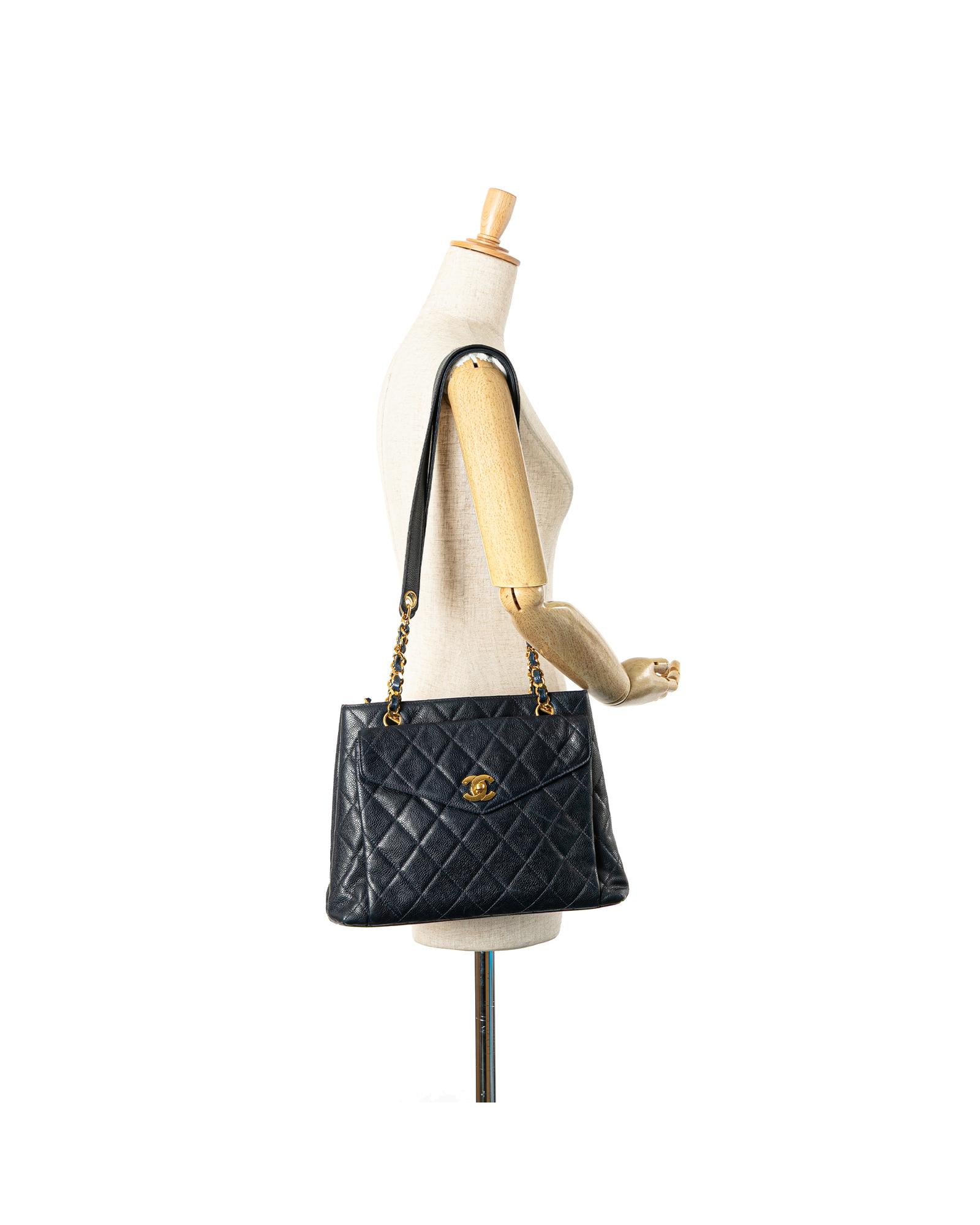 This tote bag features a quilted caviar leather body leather woven chain straps with leather guards a top zip closure exterior flap pocket at the front with twist lock closure and an interior zip pocket.