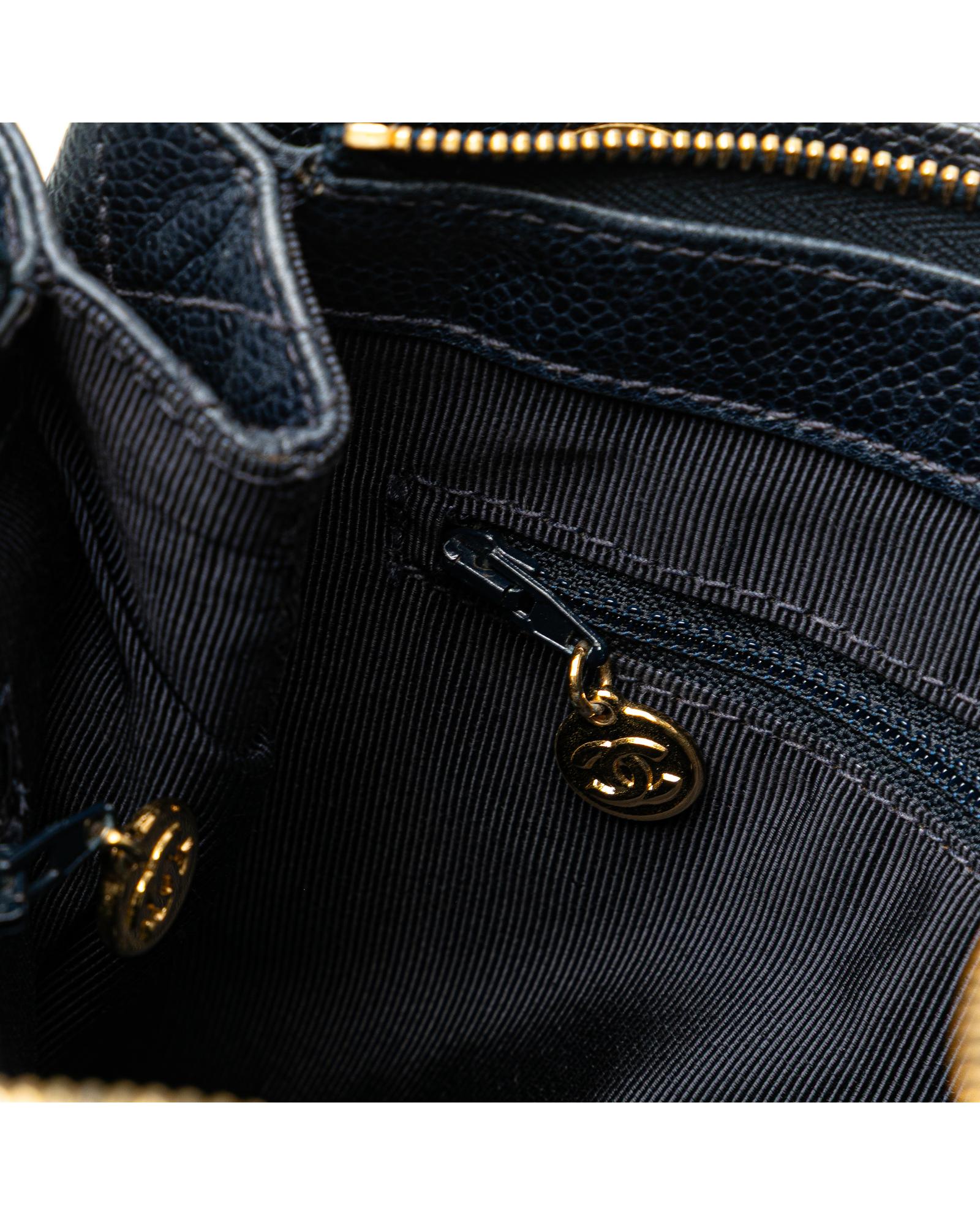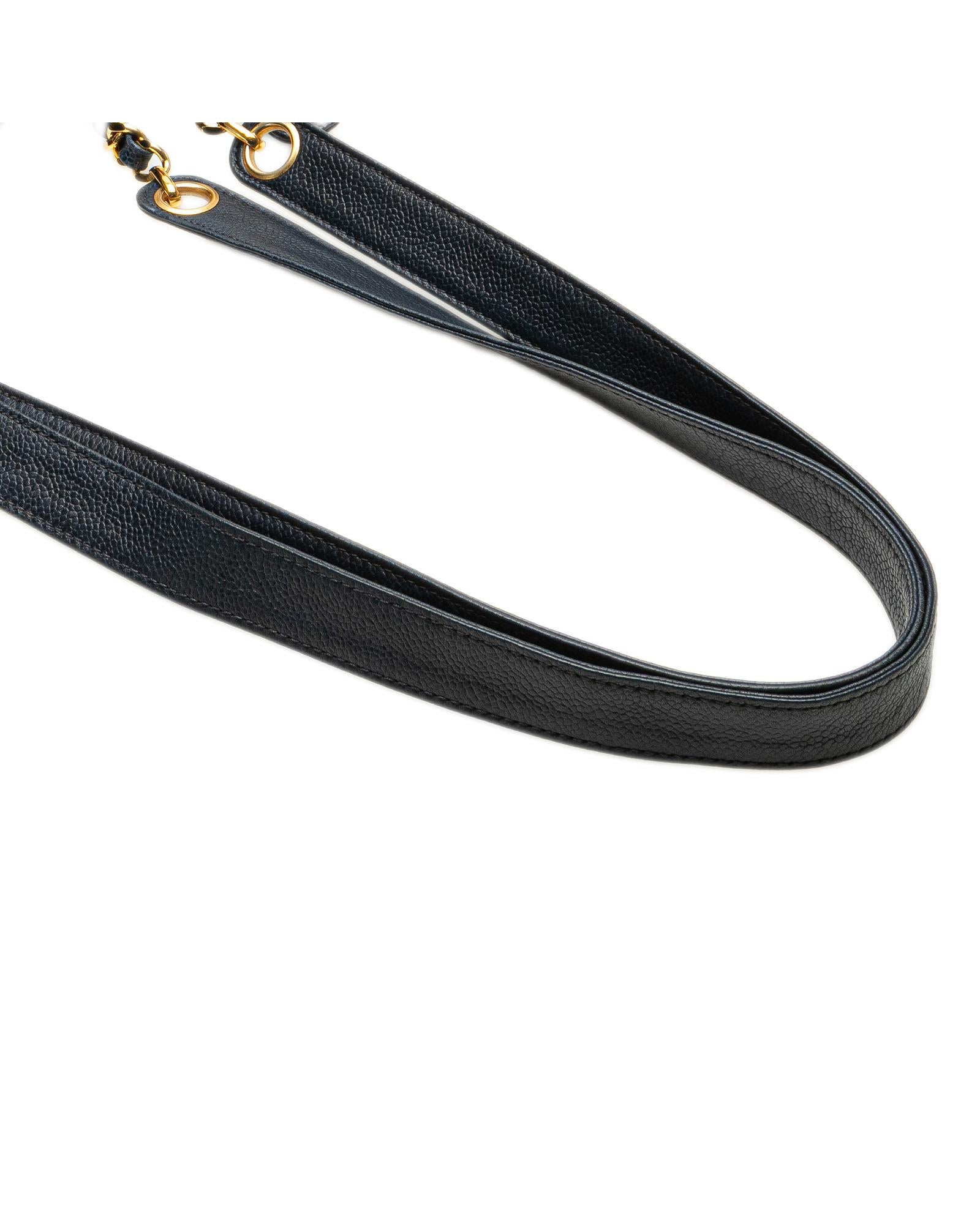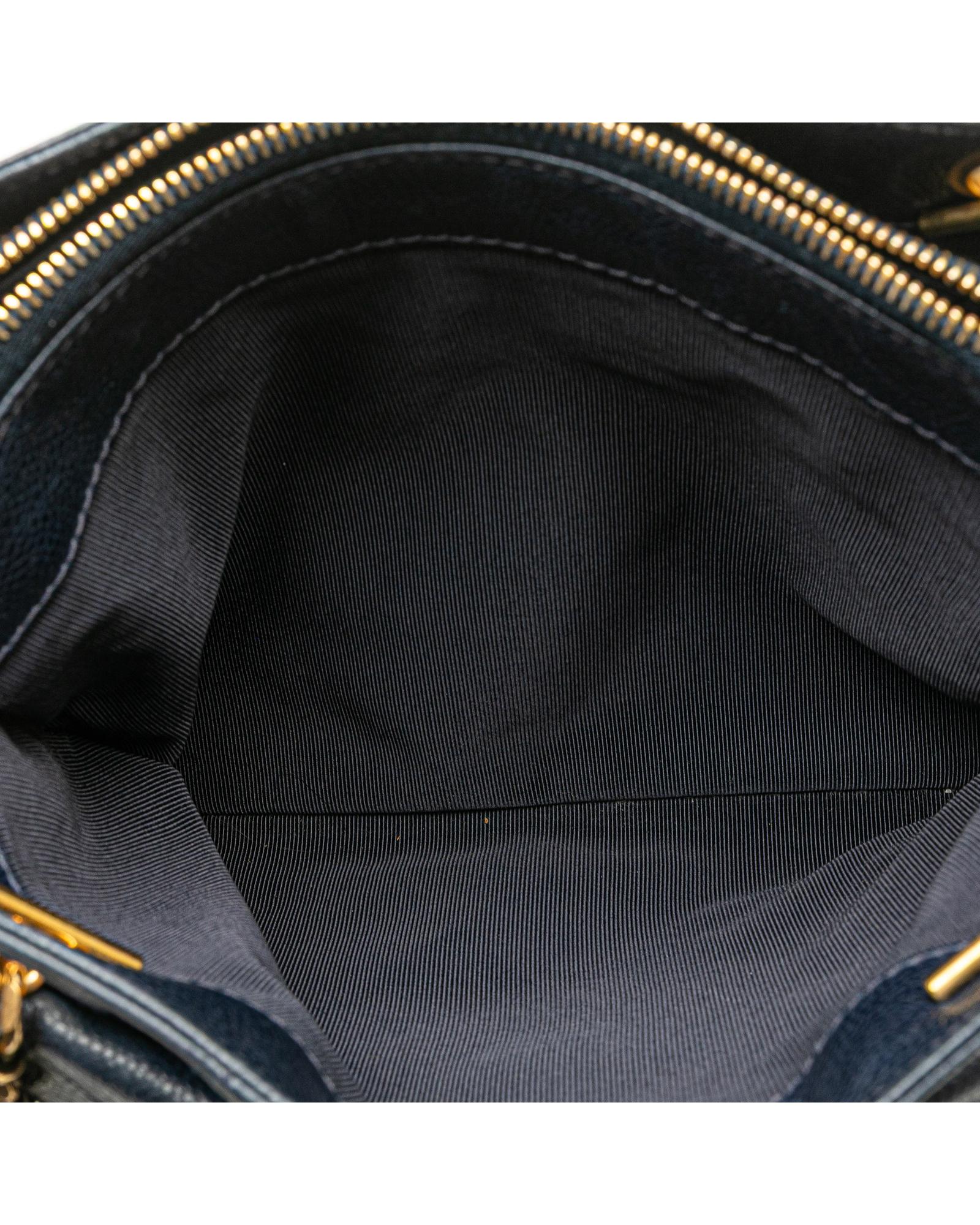 This tote bag features a quilted caviar leather body leather woven chain straps with leather guards a top zip closure exterior flap pocket at the front with twist lock closure and an interior zip pocket.