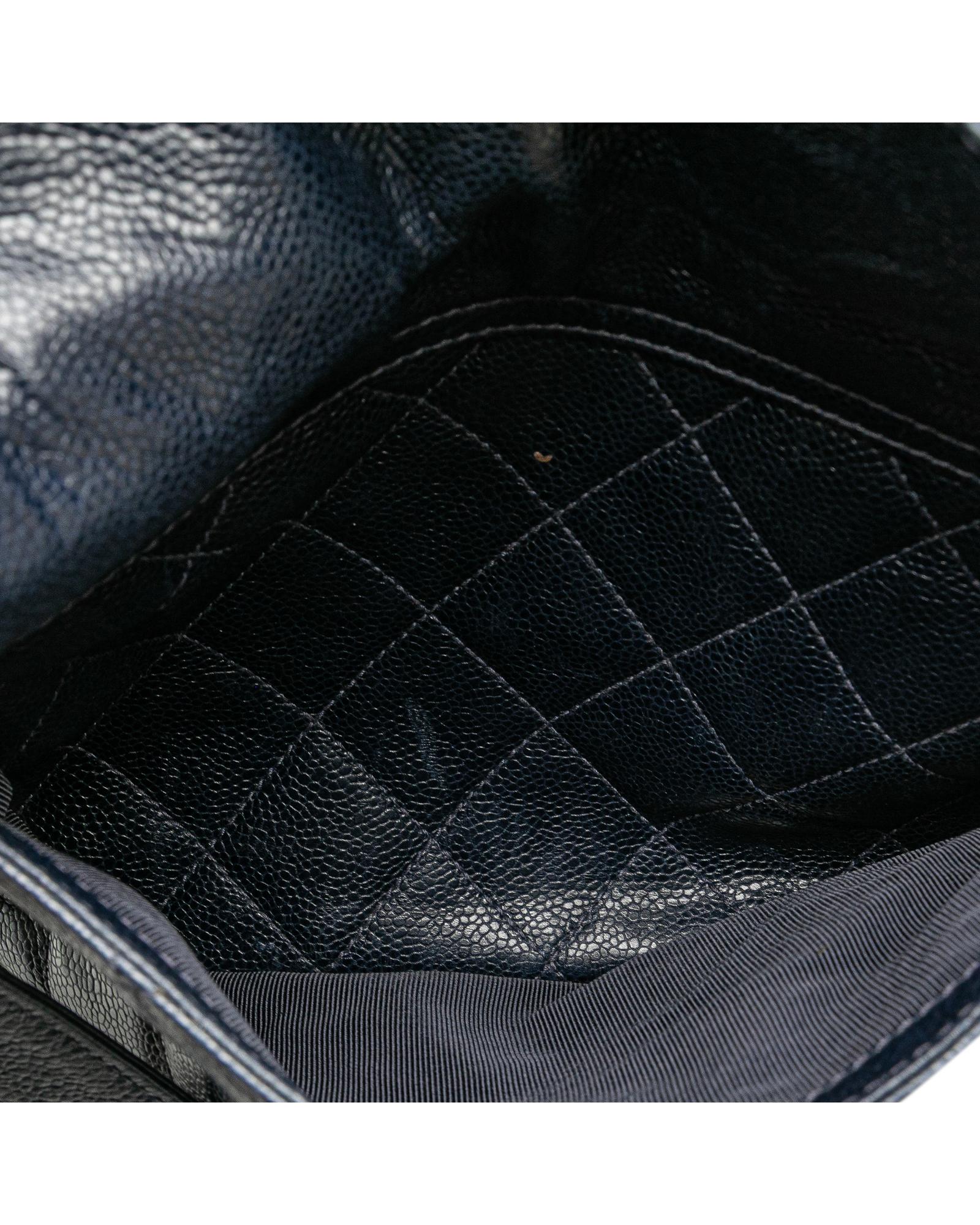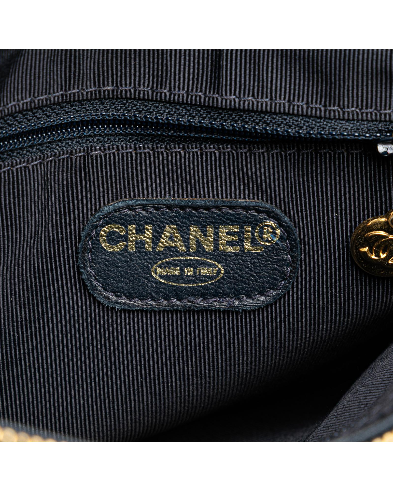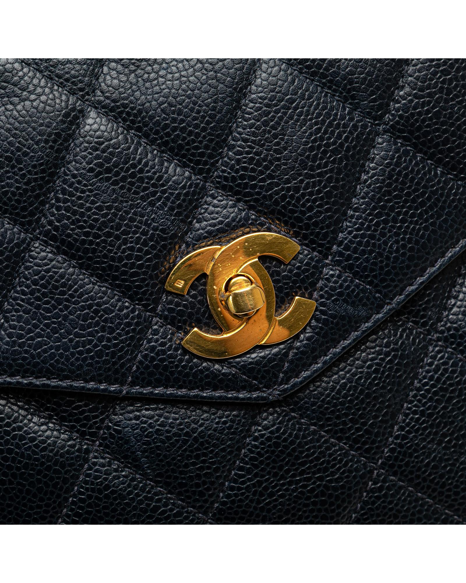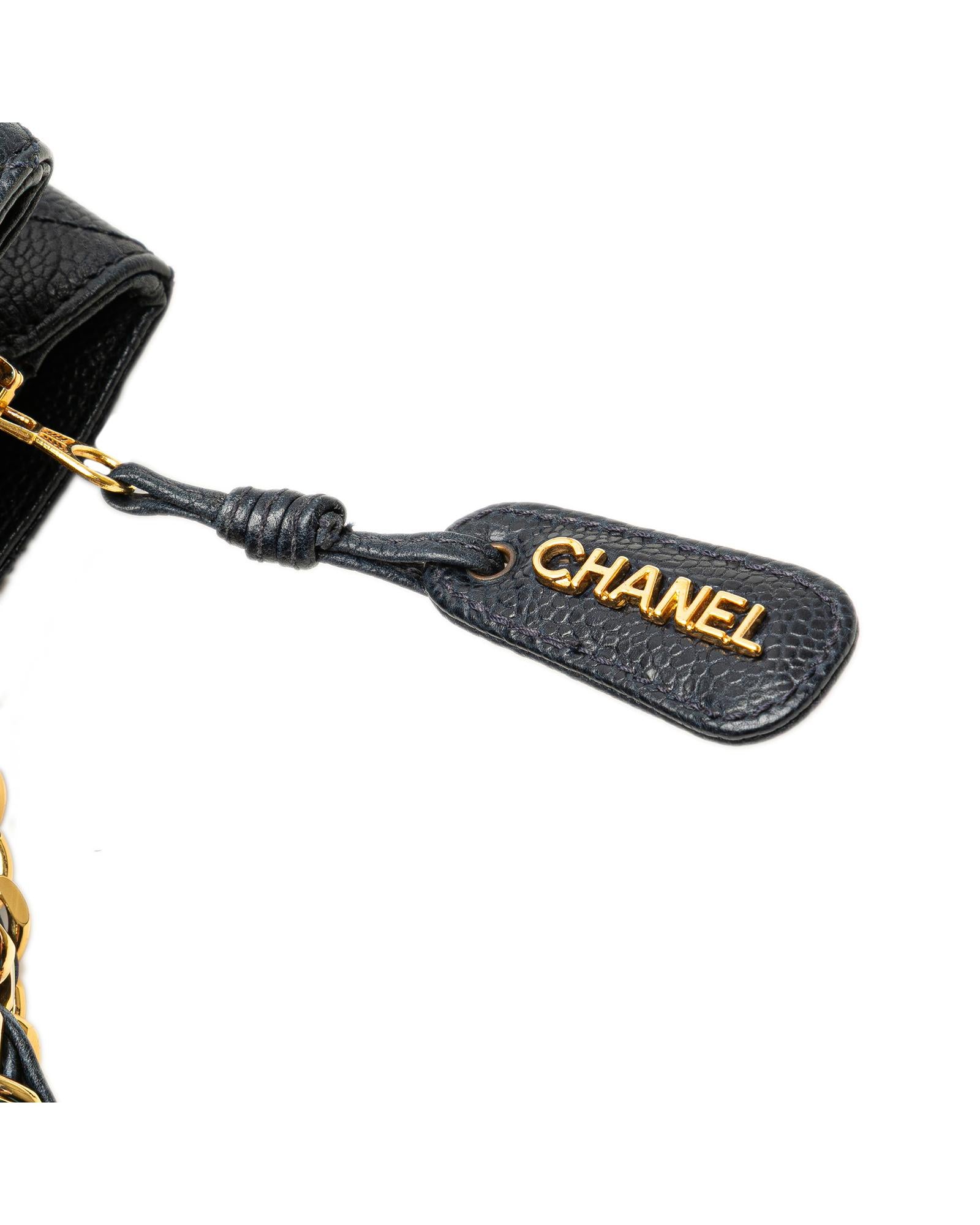 This tote bag features a quilted caviar leather body leather woven chain straps with leather guards a top zip closure exterior flap pocket at the front with twist lock closure and an interior zip pocket.