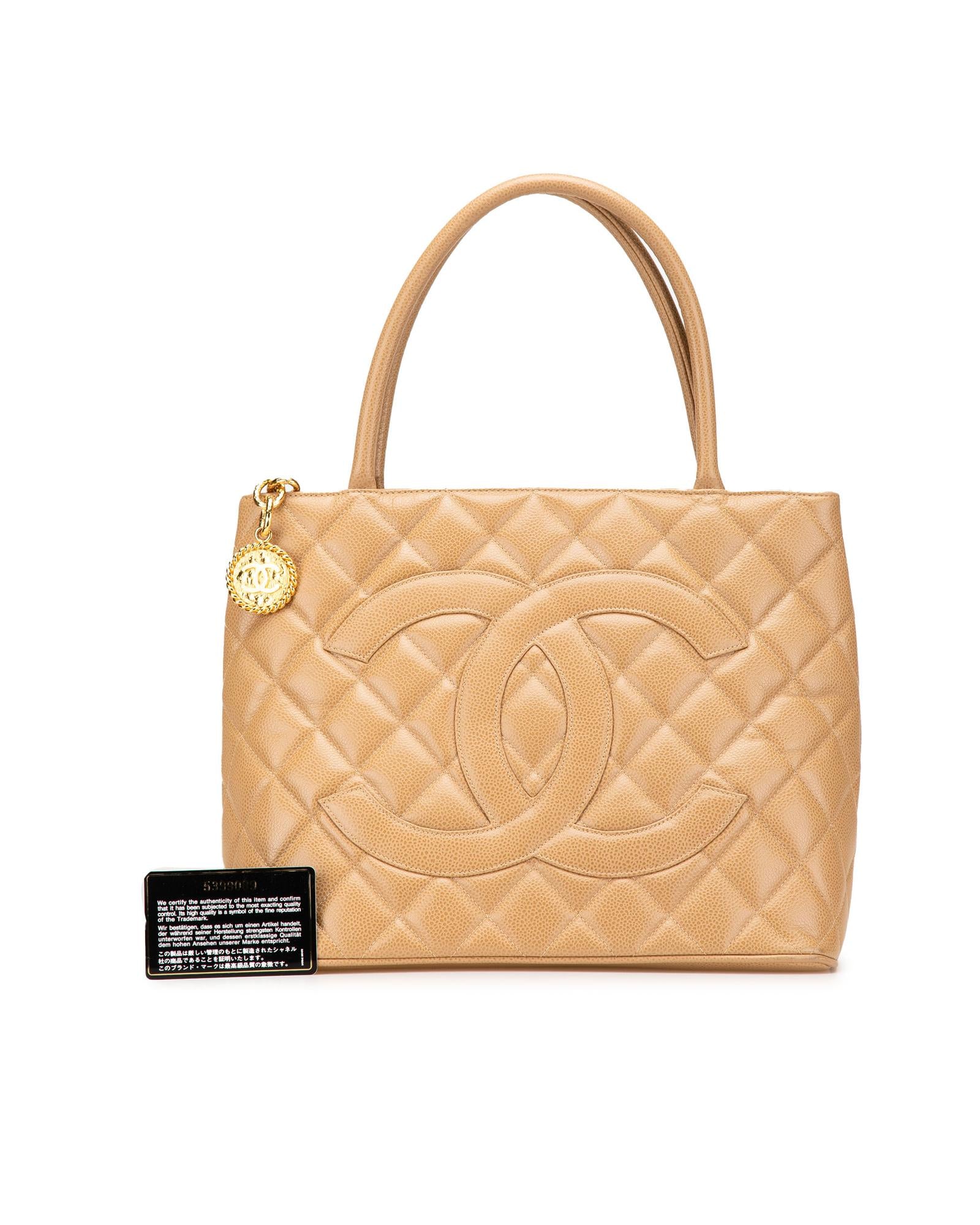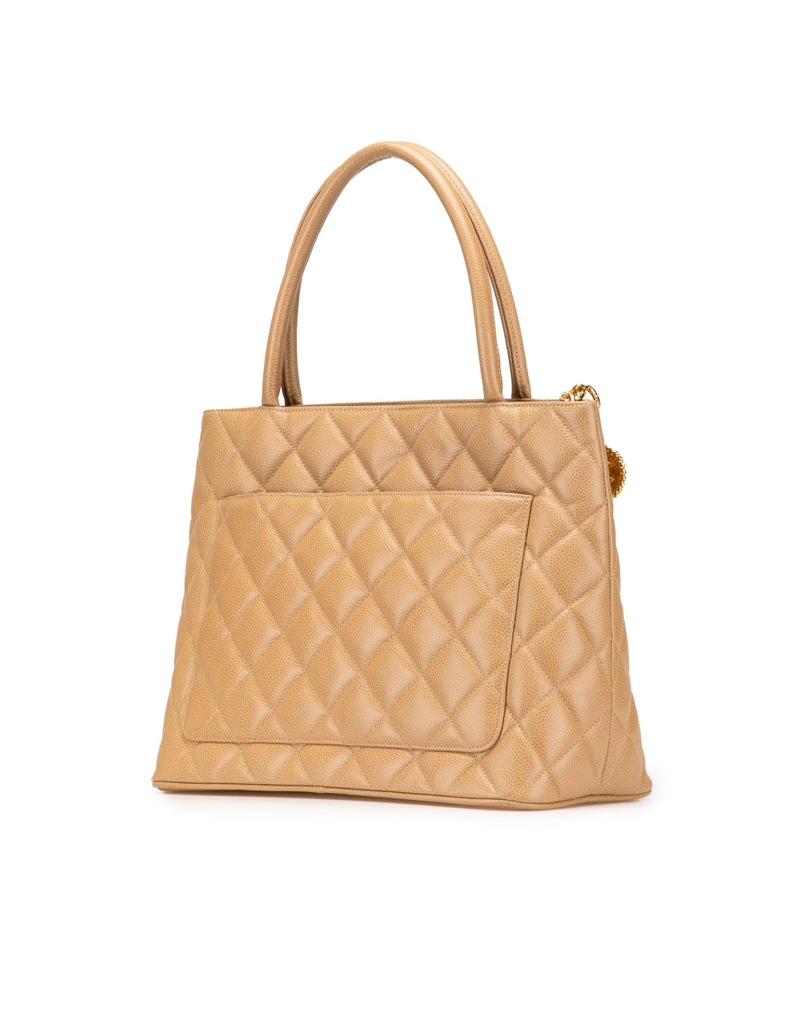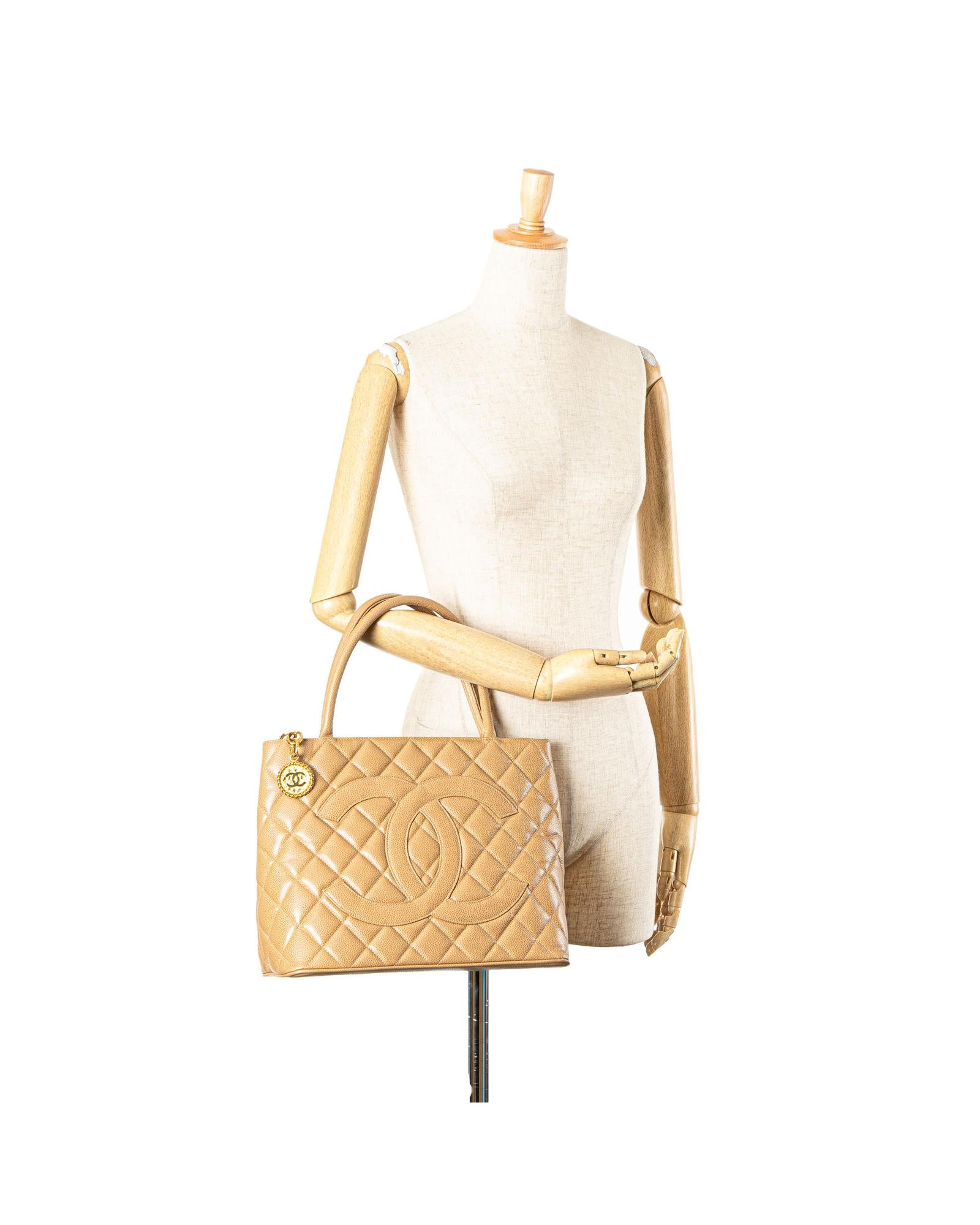 The Medallion tote bag features a quilted caviar leather body rolled leather handles a top zip closure exterior back slip pocket and interior zip and slip pockets.Brand: Chanel