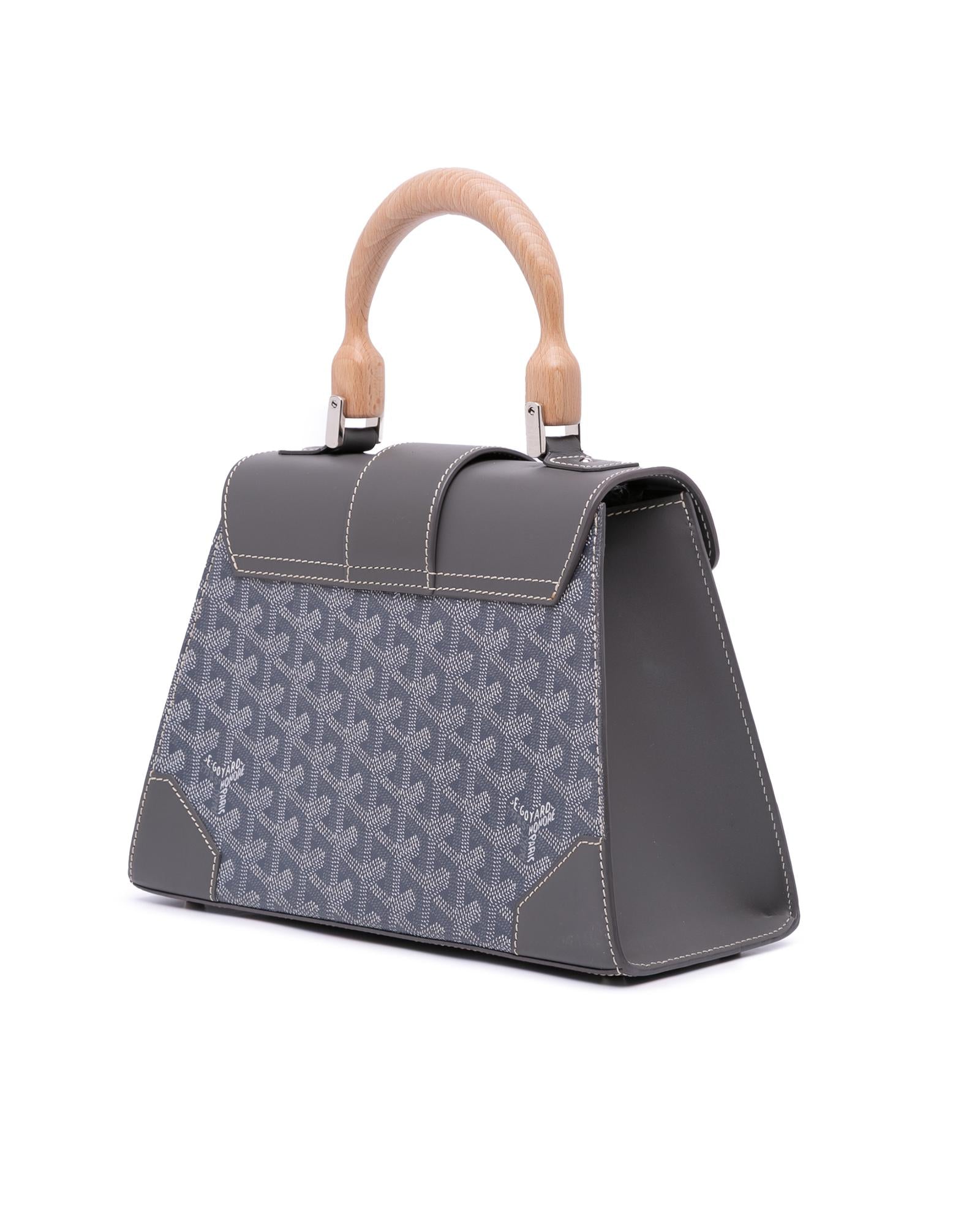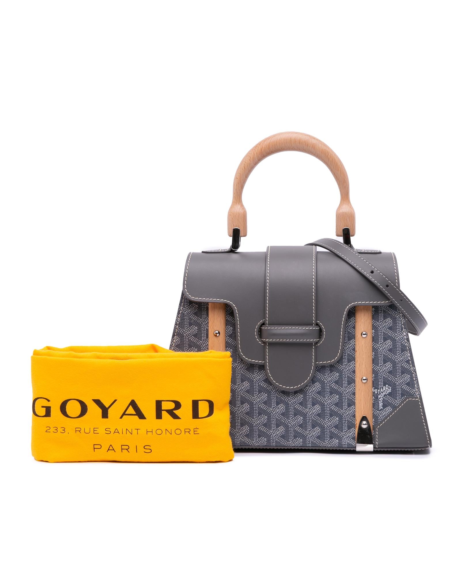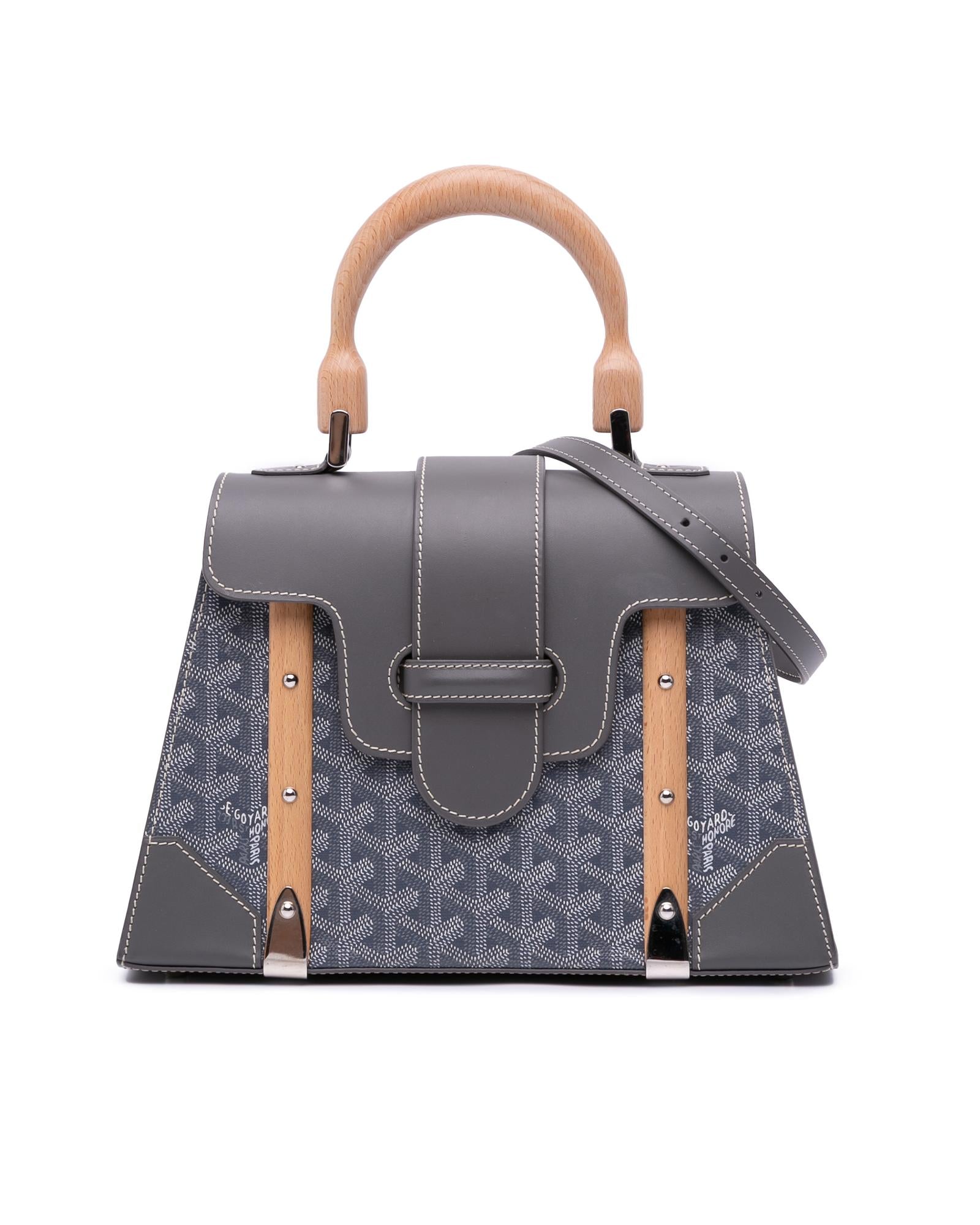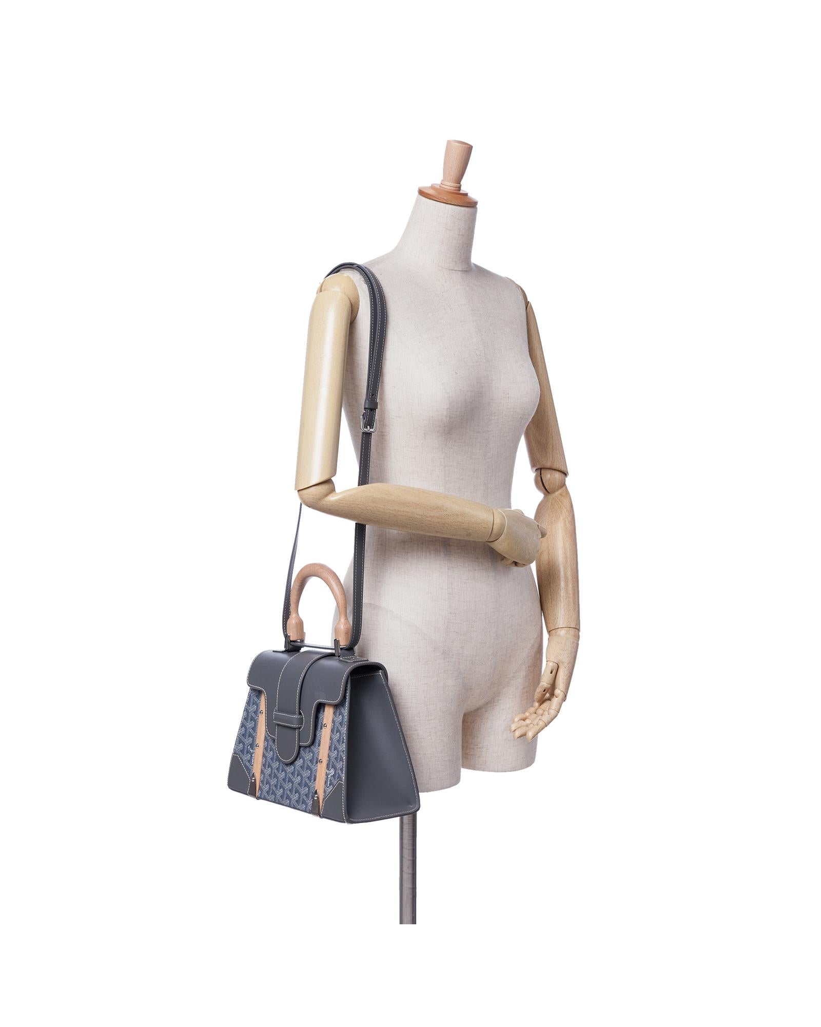 The Goyardine Saigon PM features a coated canvas body with leather trim a wooden top handle a detachable flat leather strap a front flap with slip-through closure and an interior slip pocket.Brand: Goyard