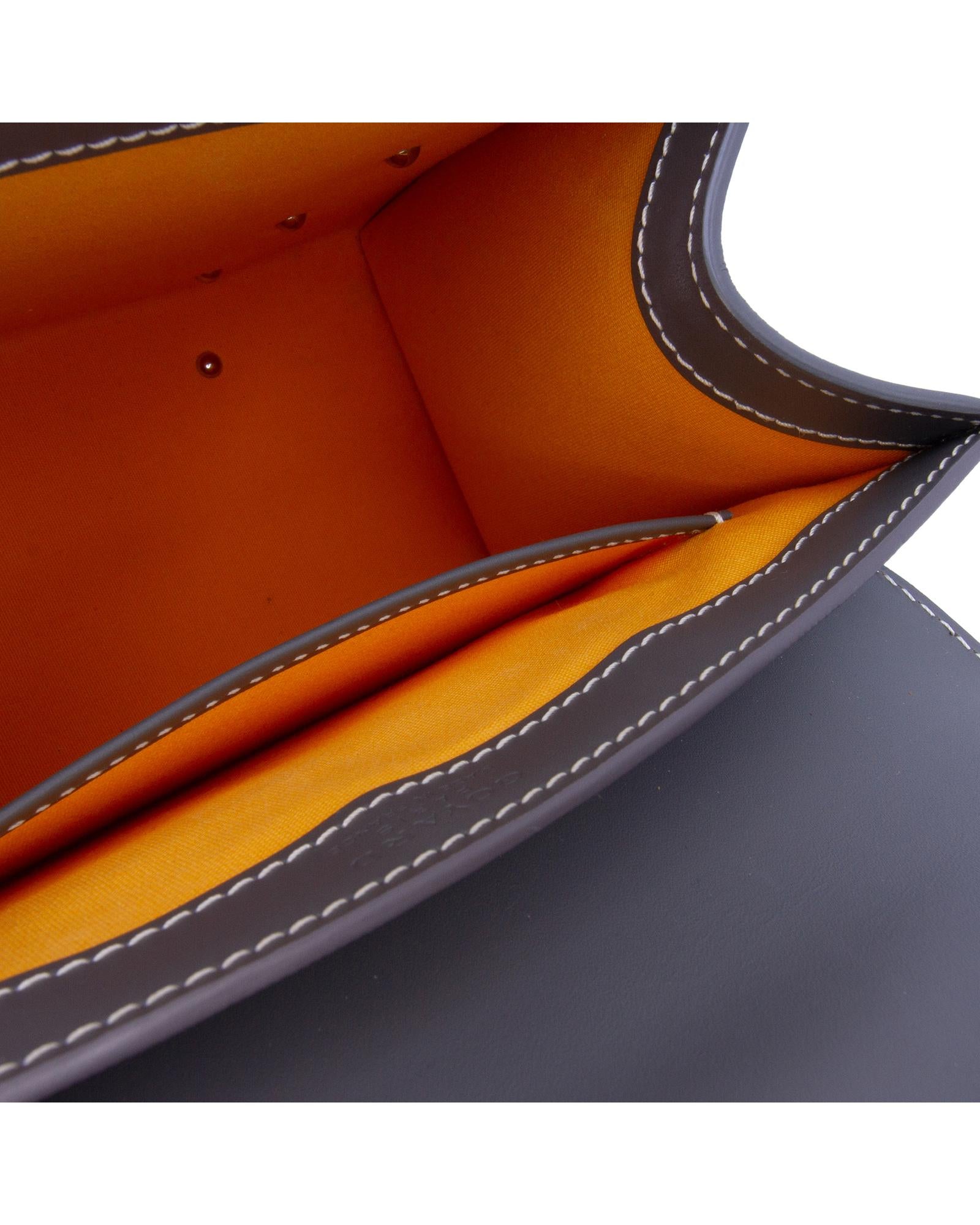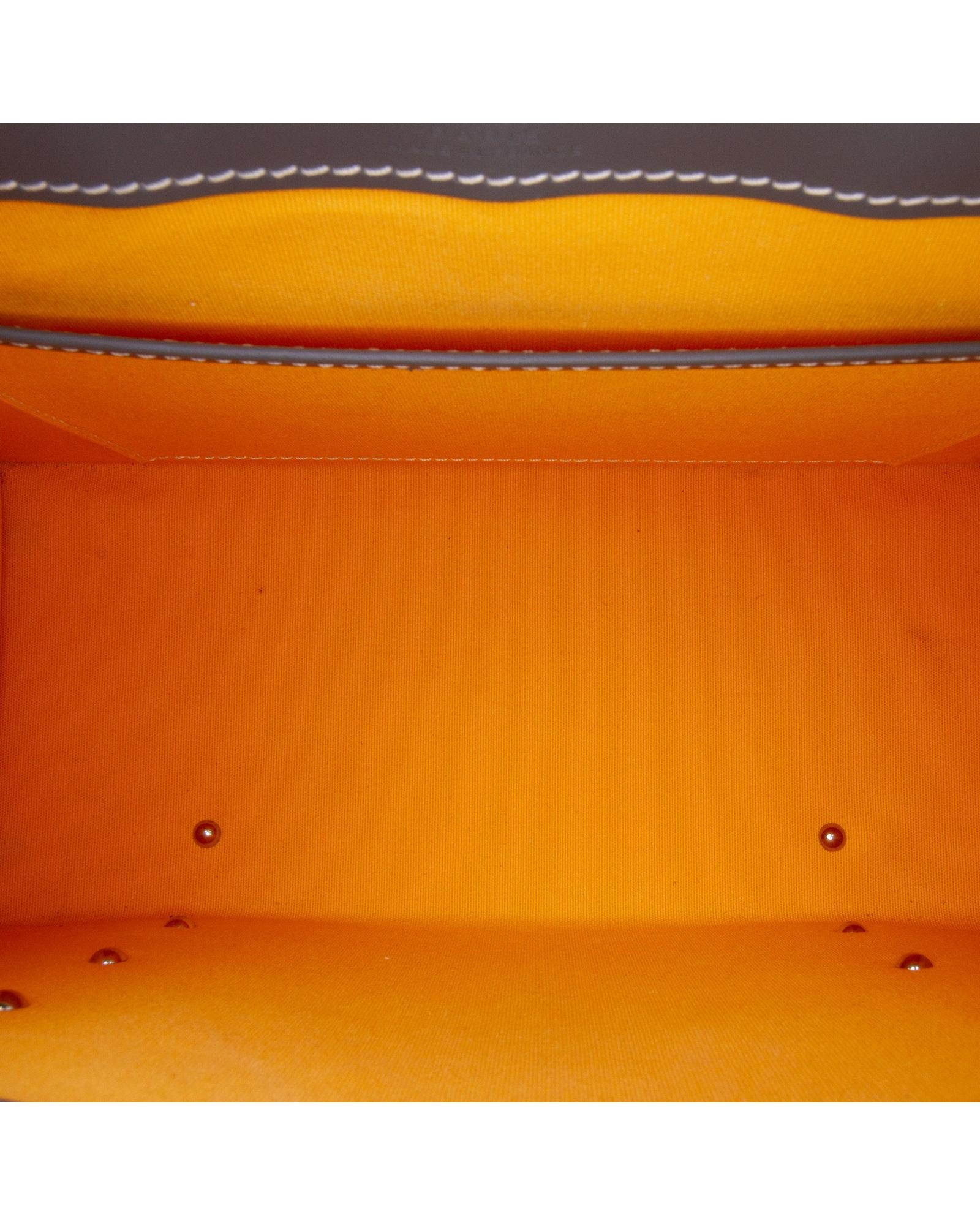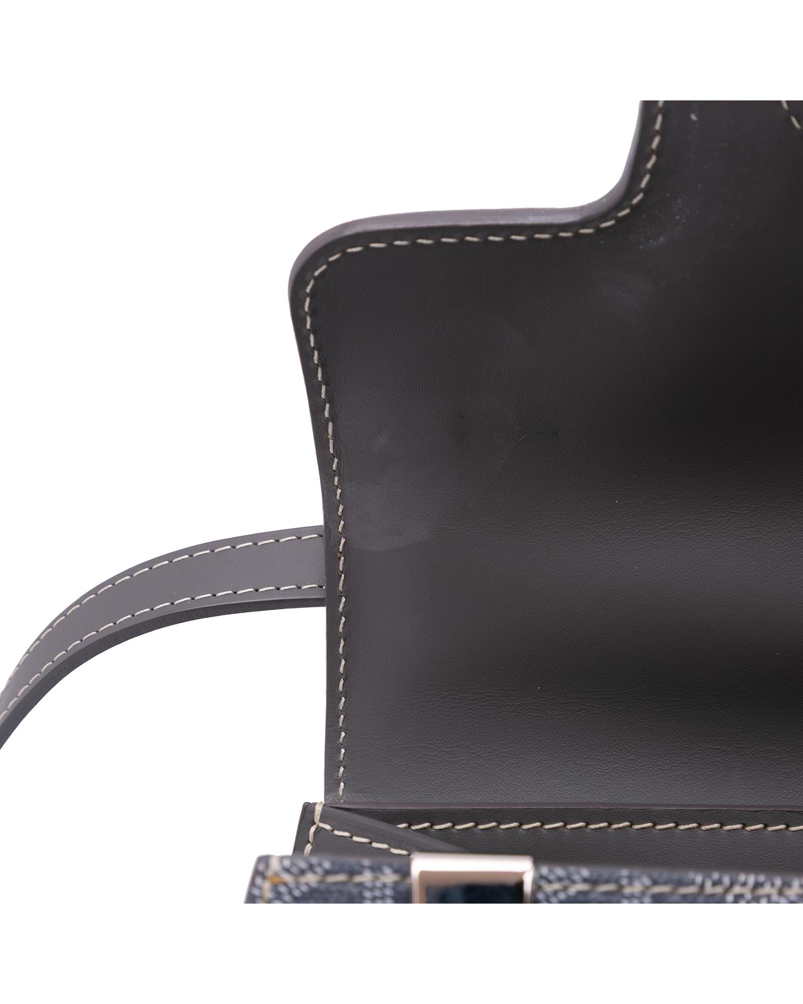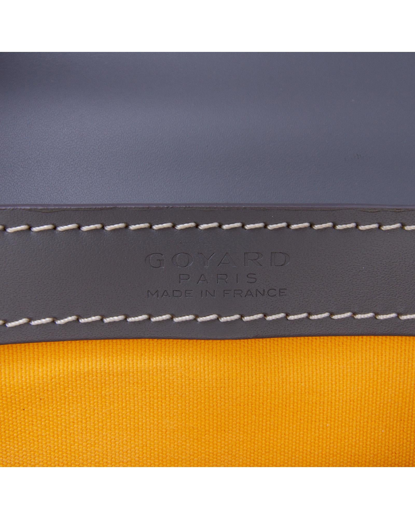 The Goyardine Saigon PM features a coated canvas body with leather trim a wooden top handle a detachable flat leather strap a front flap with slip-through closure and an interior slip pocket.Brand: Goyard