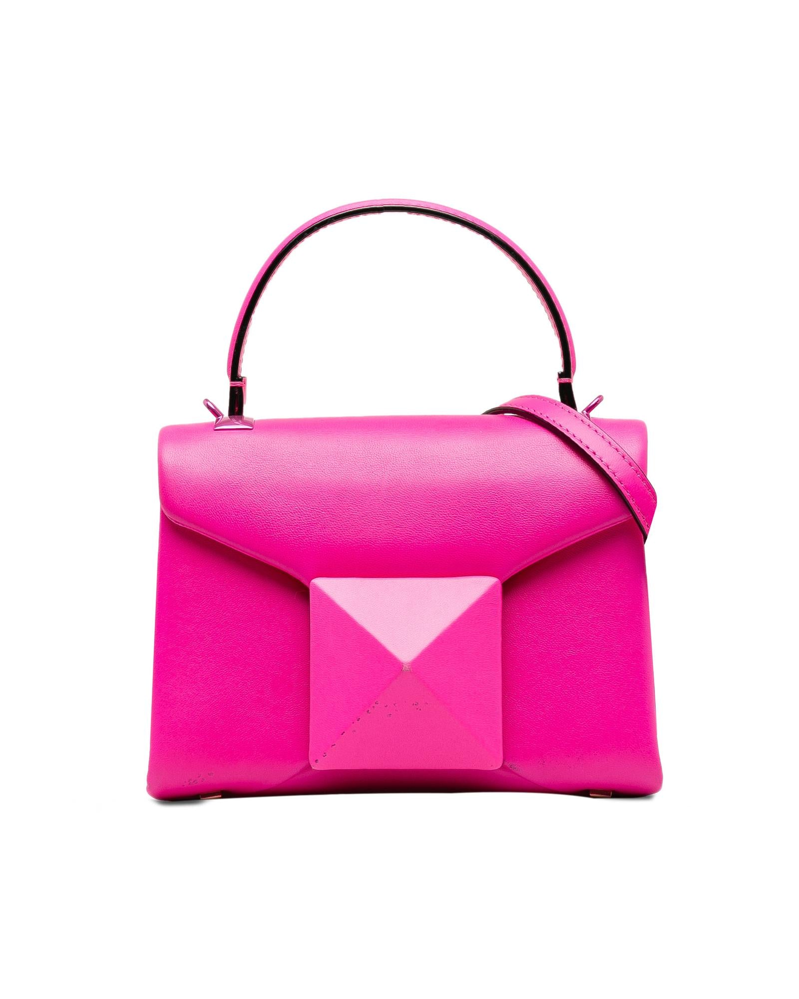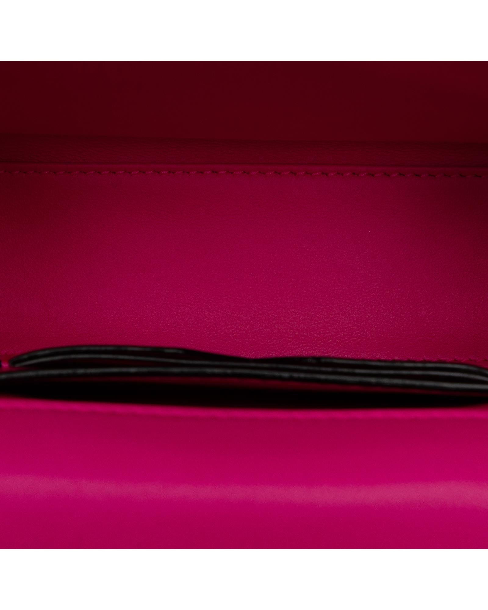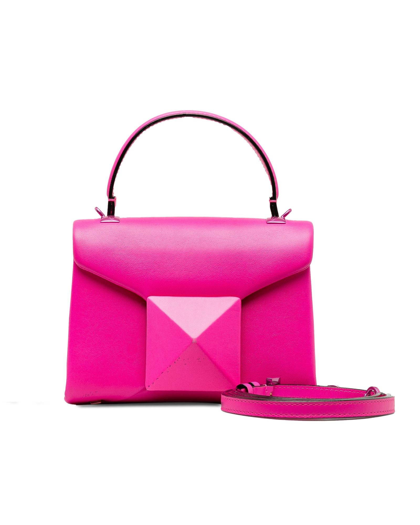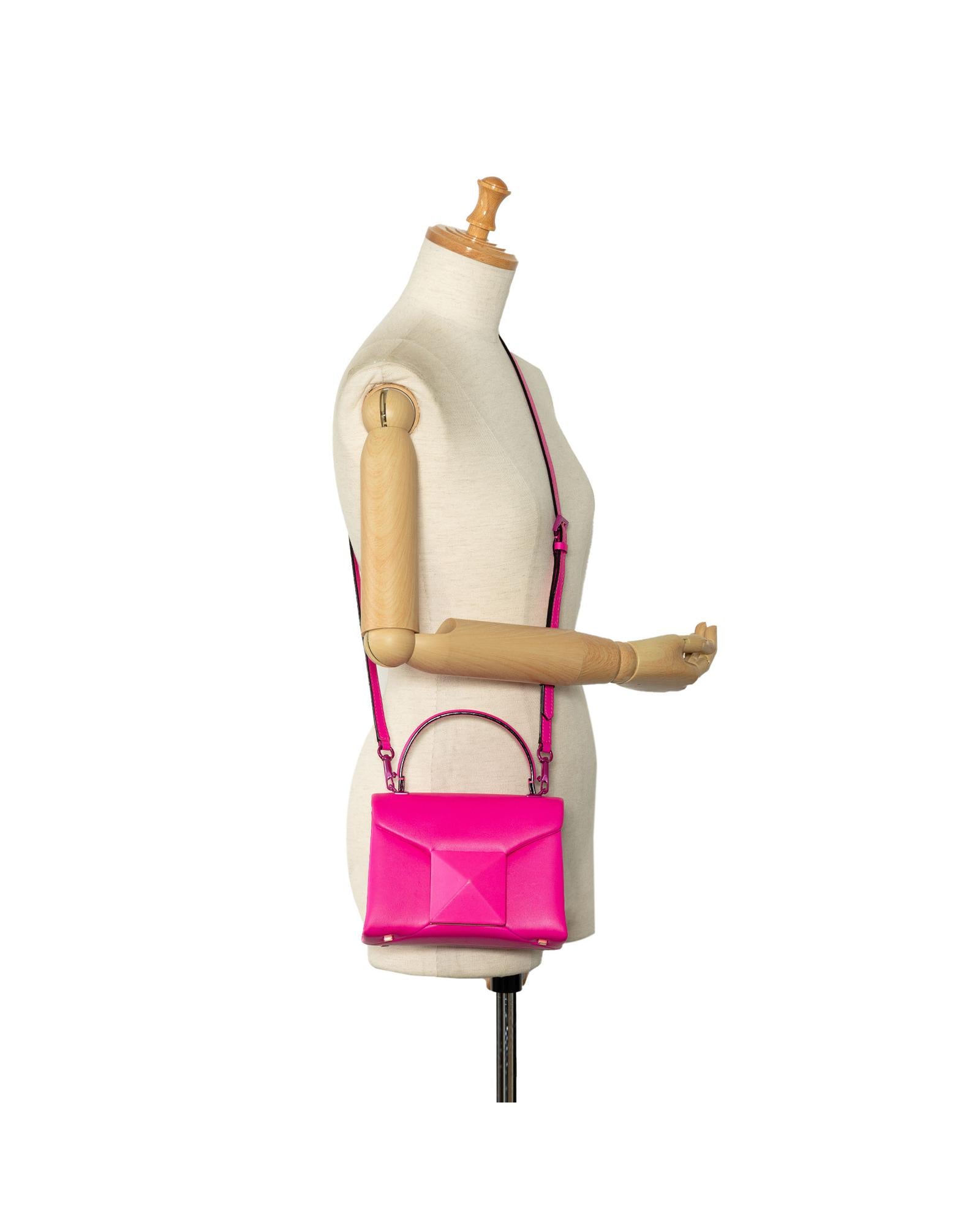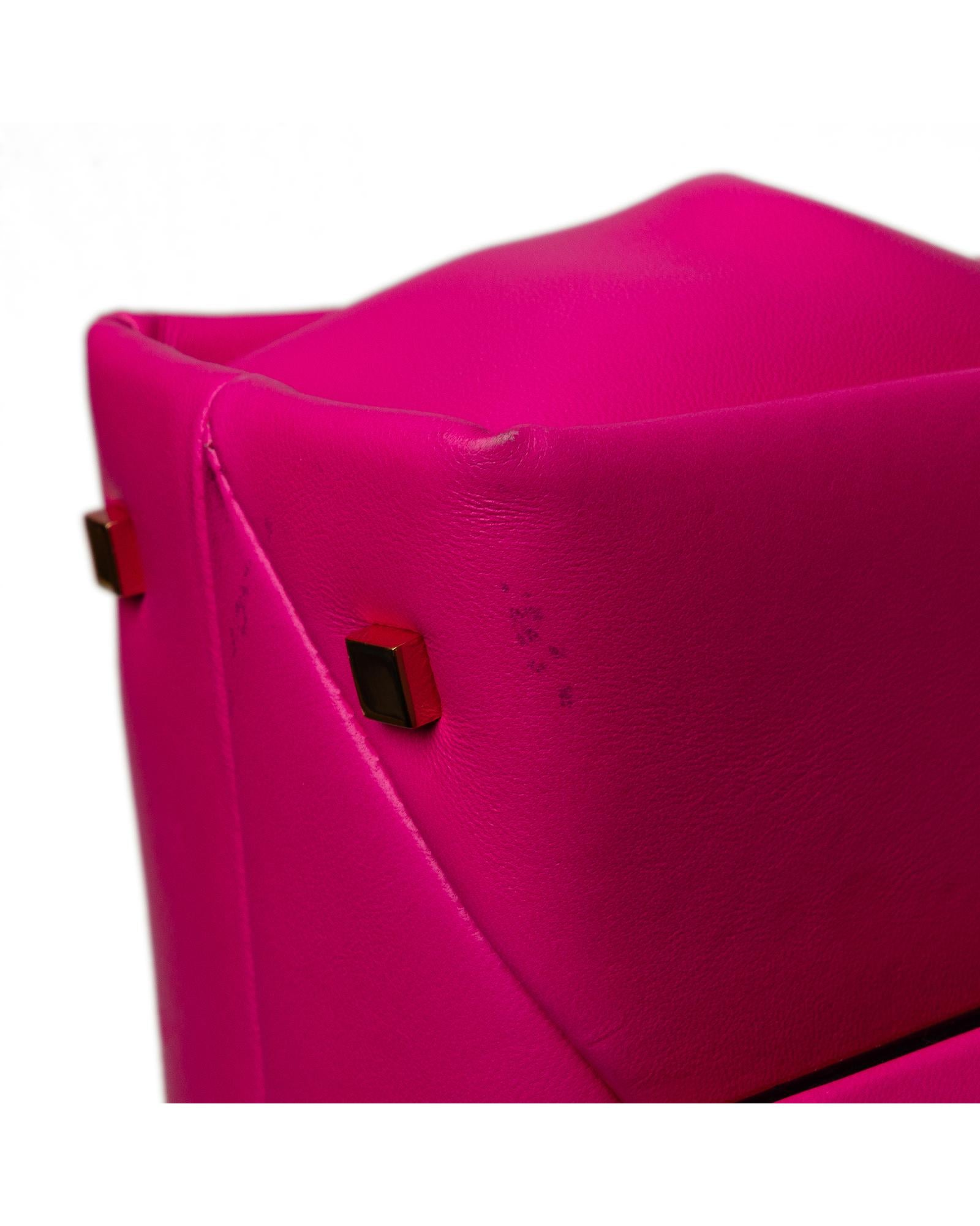 This satchel features a leather body a flat leather top handle a detachable flat leather strap a flap with magnetic snap closure and an interior slip pocket.