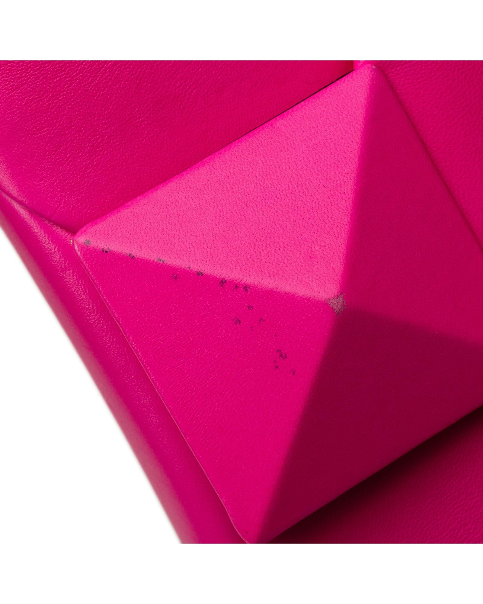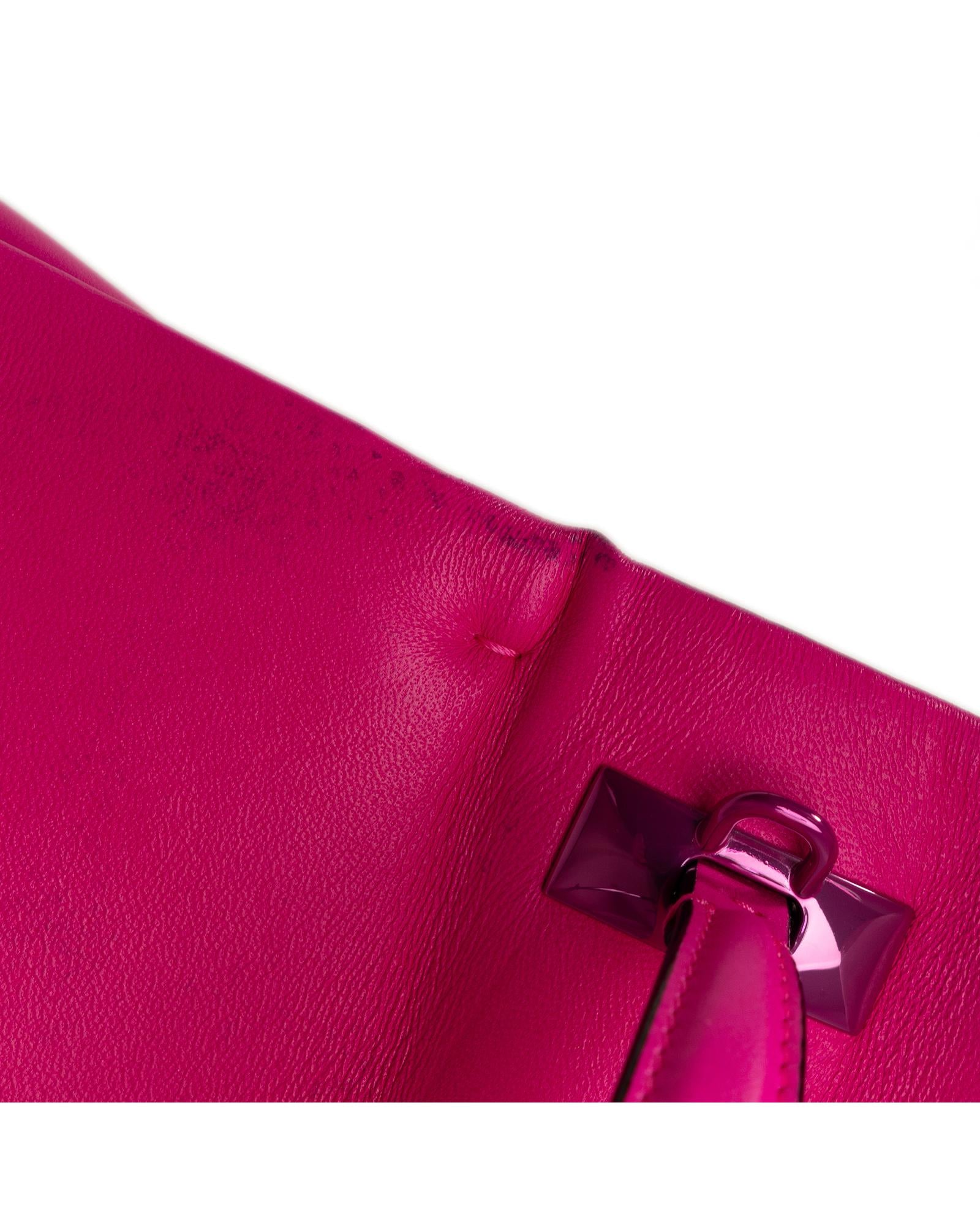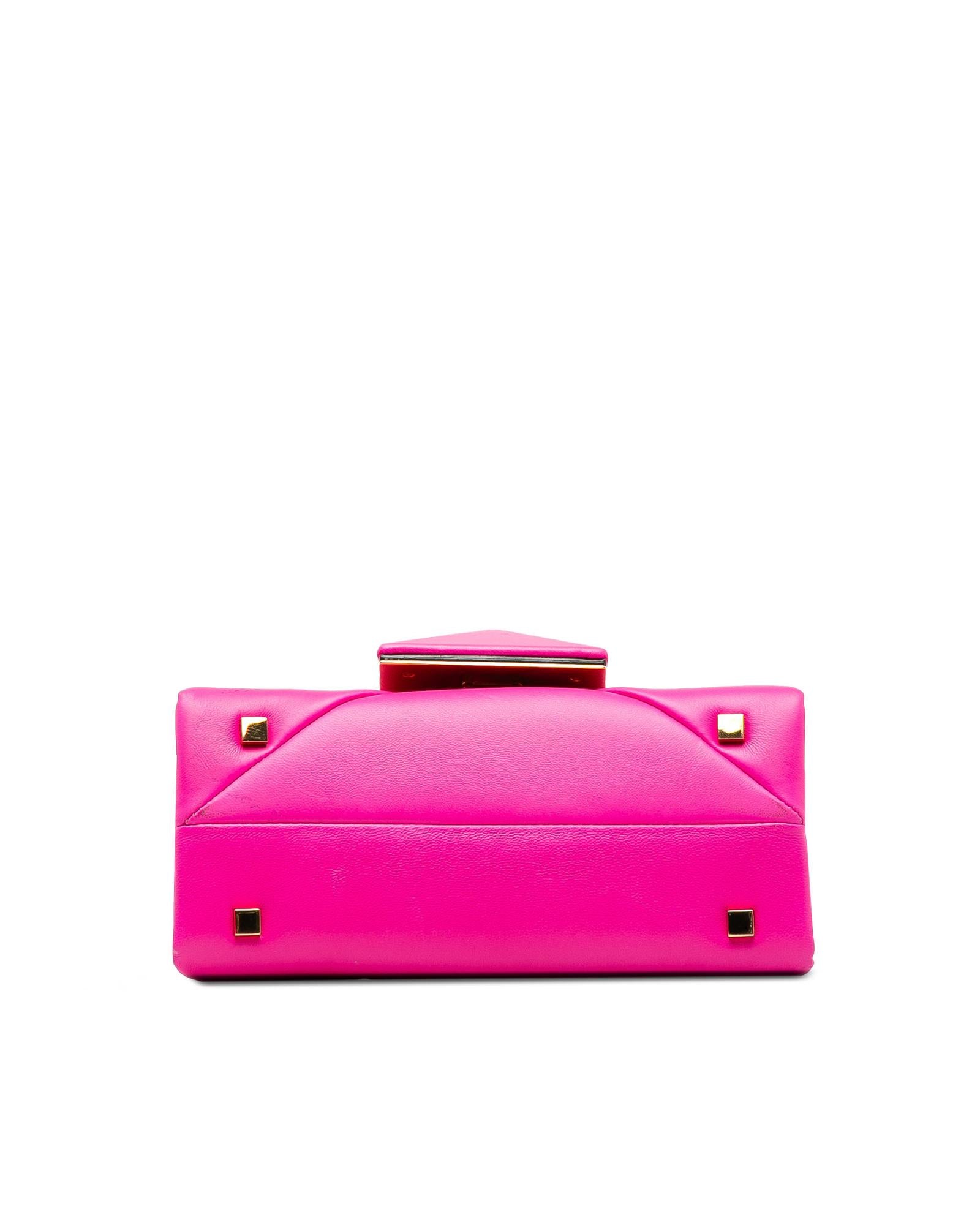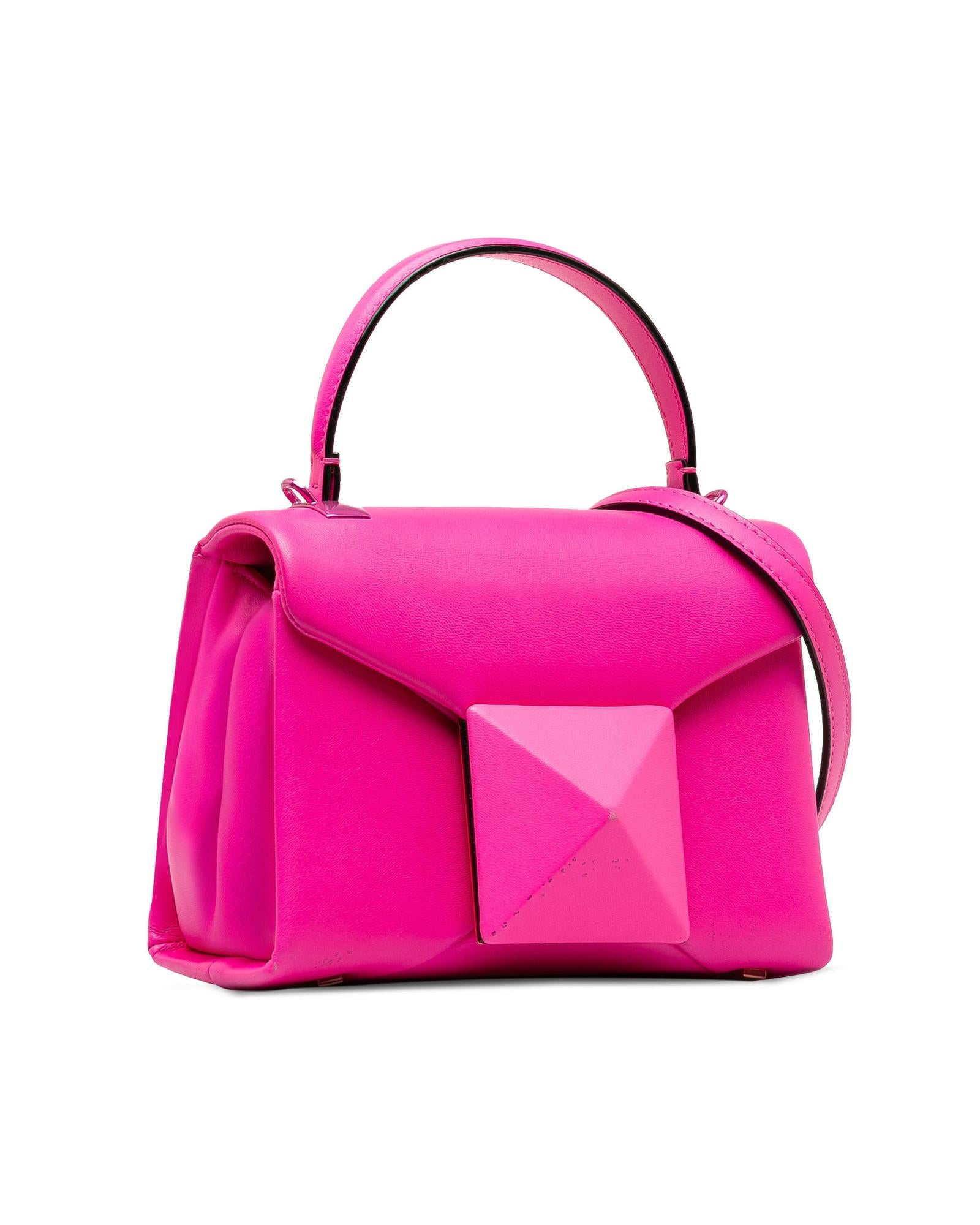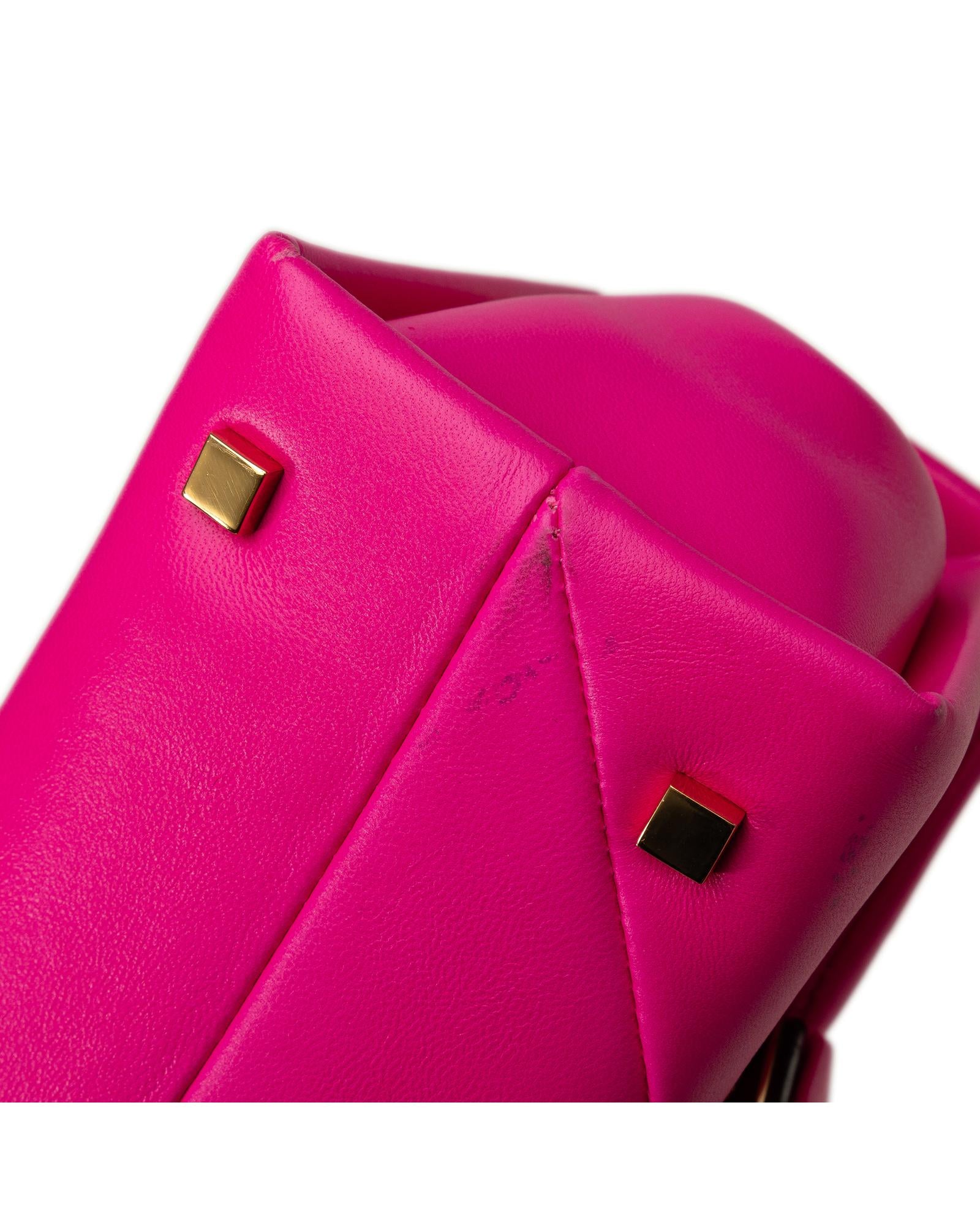 This satchel features a leather body a flat leather top handle a detachable flat leather strap a flap with magnetic snap closure and an interior slip pocket.