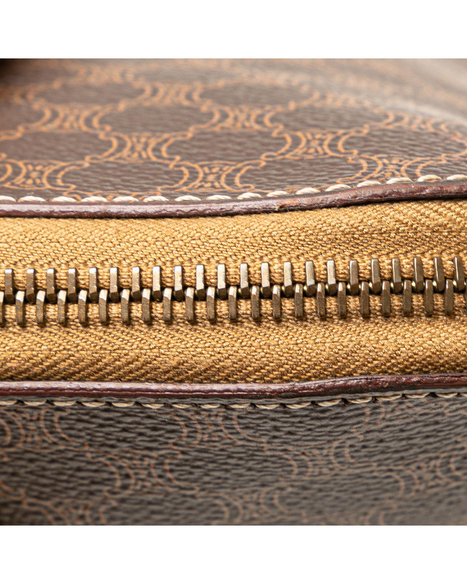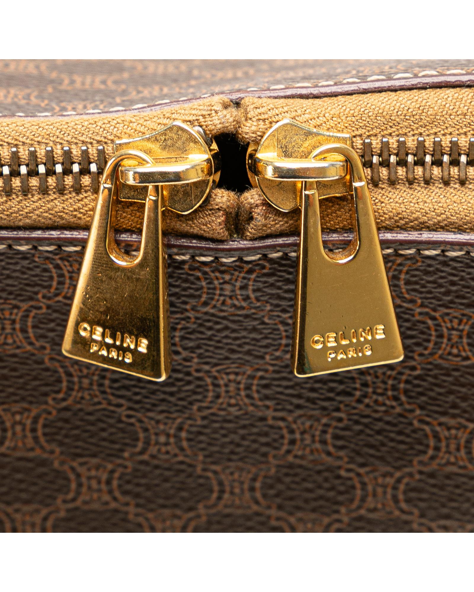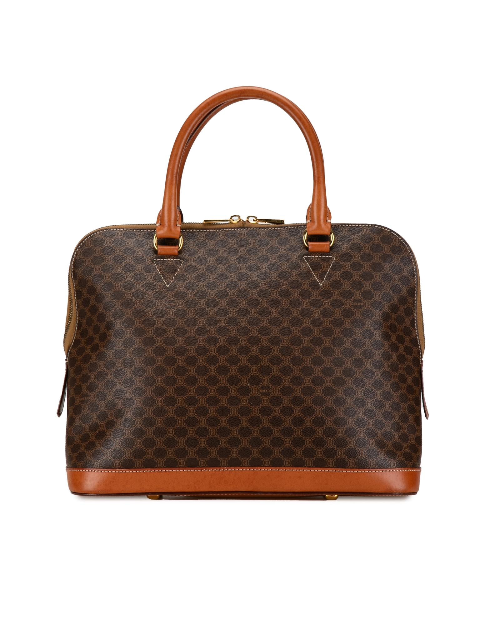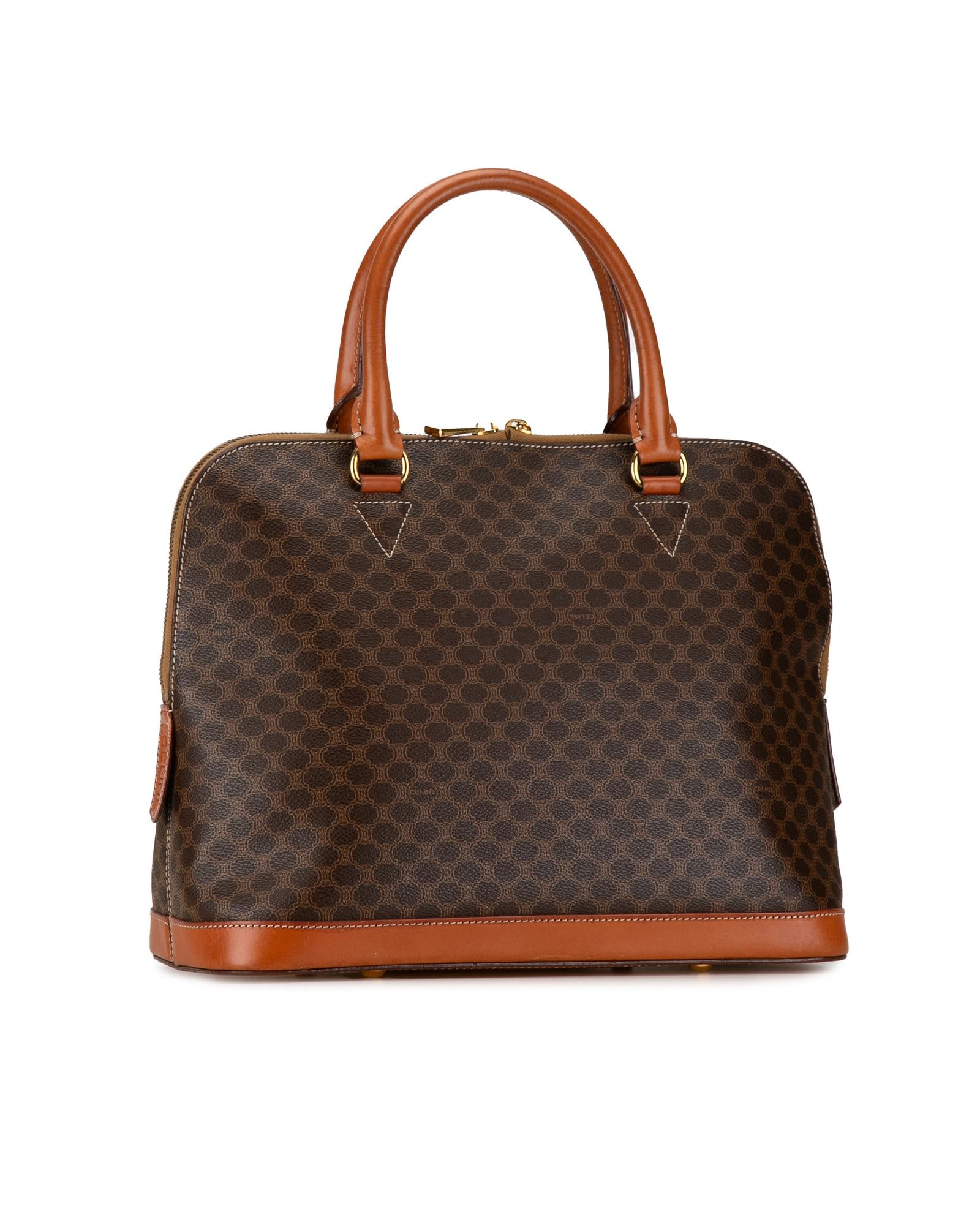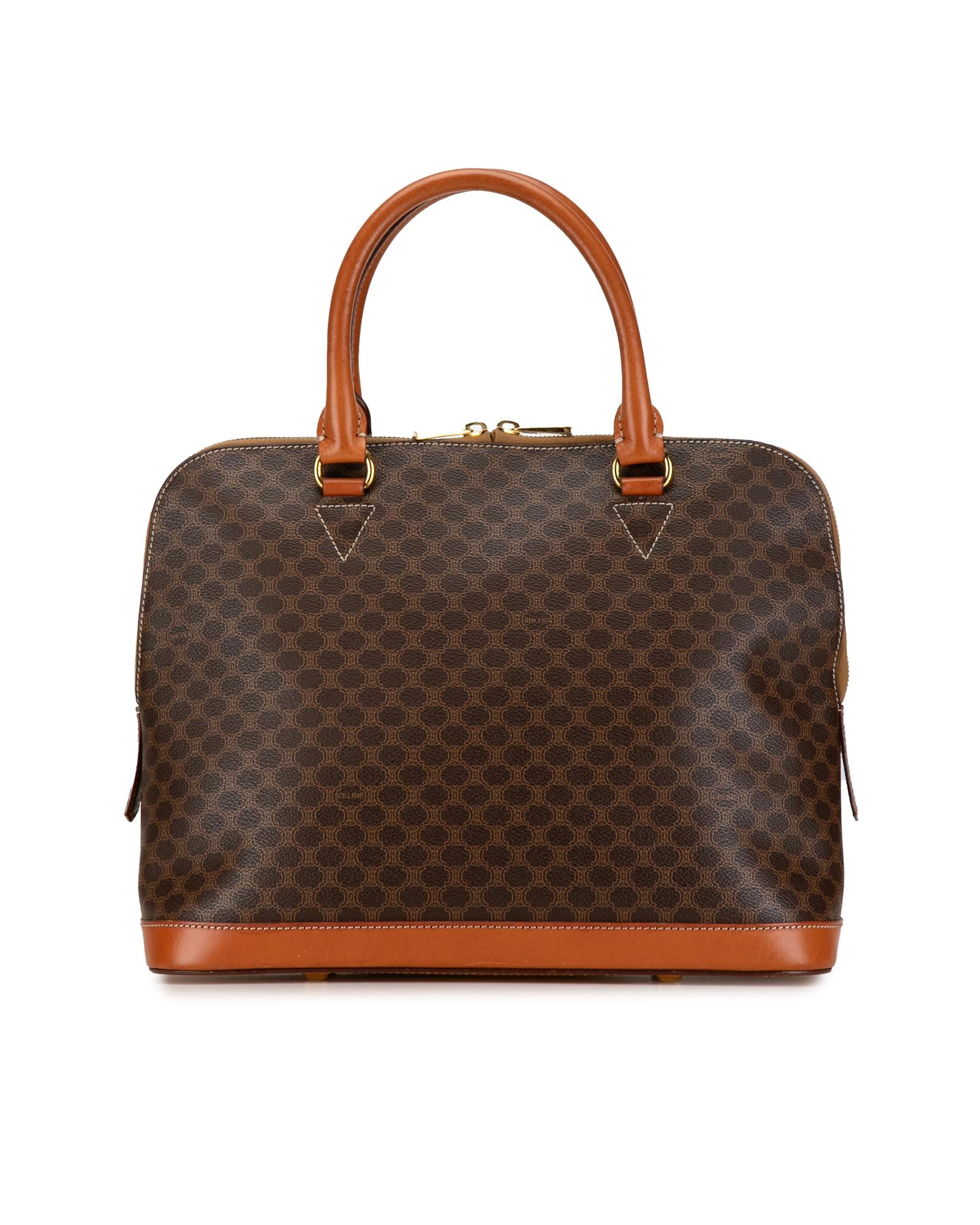 This handbag features a coated canvas body with leather trim rolled leather handles a top zip closure and interior zip and slip pockets.Brand: Celine
