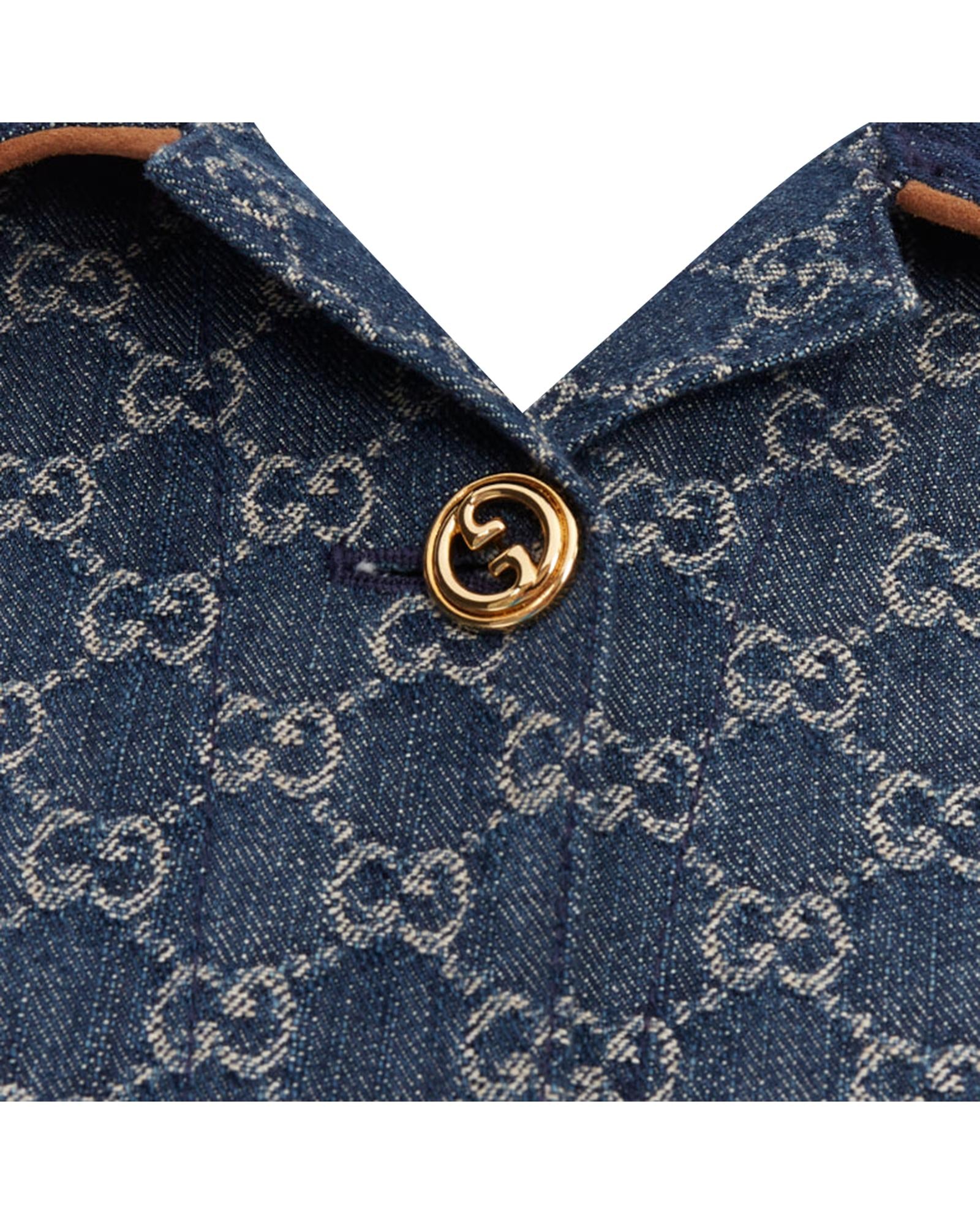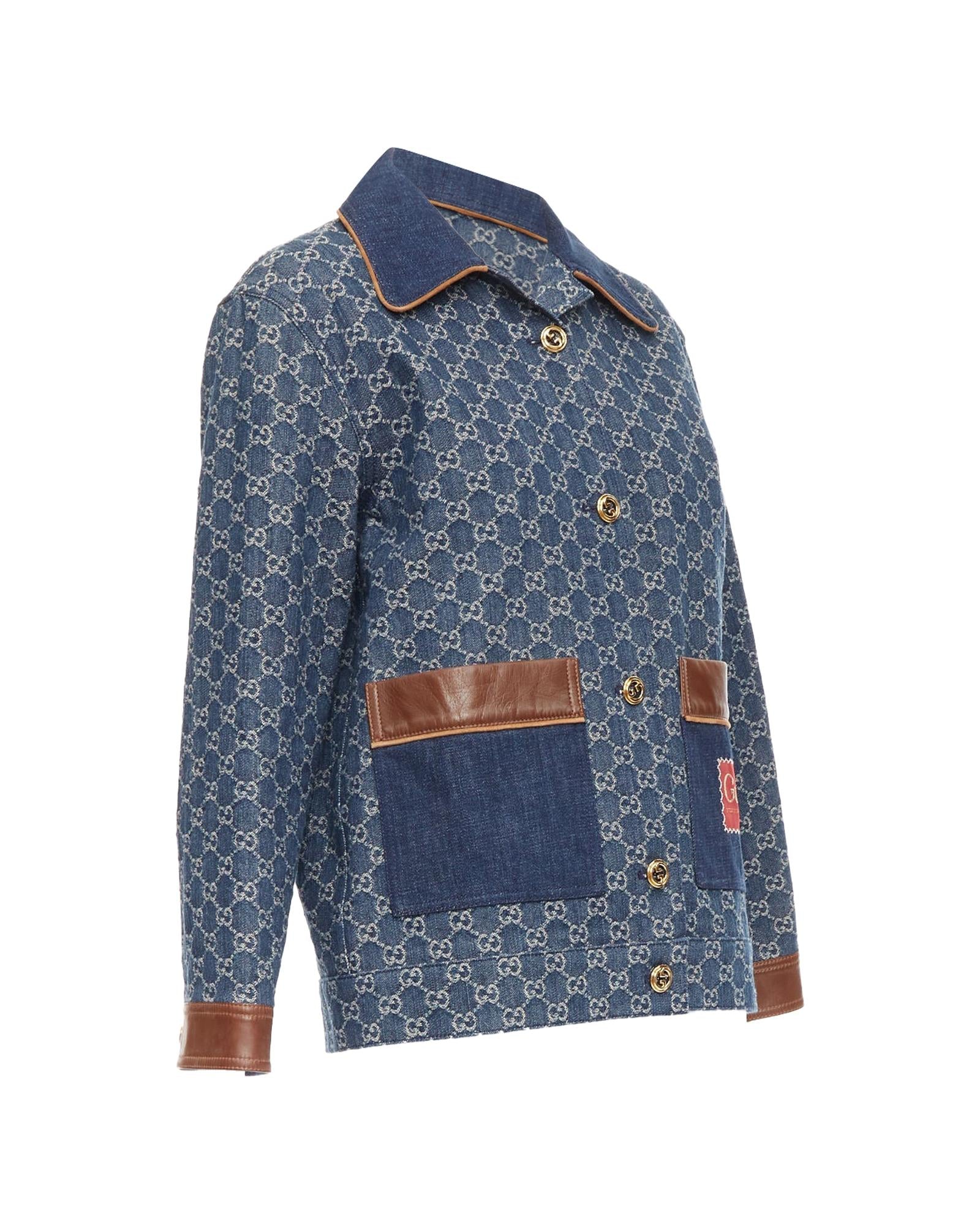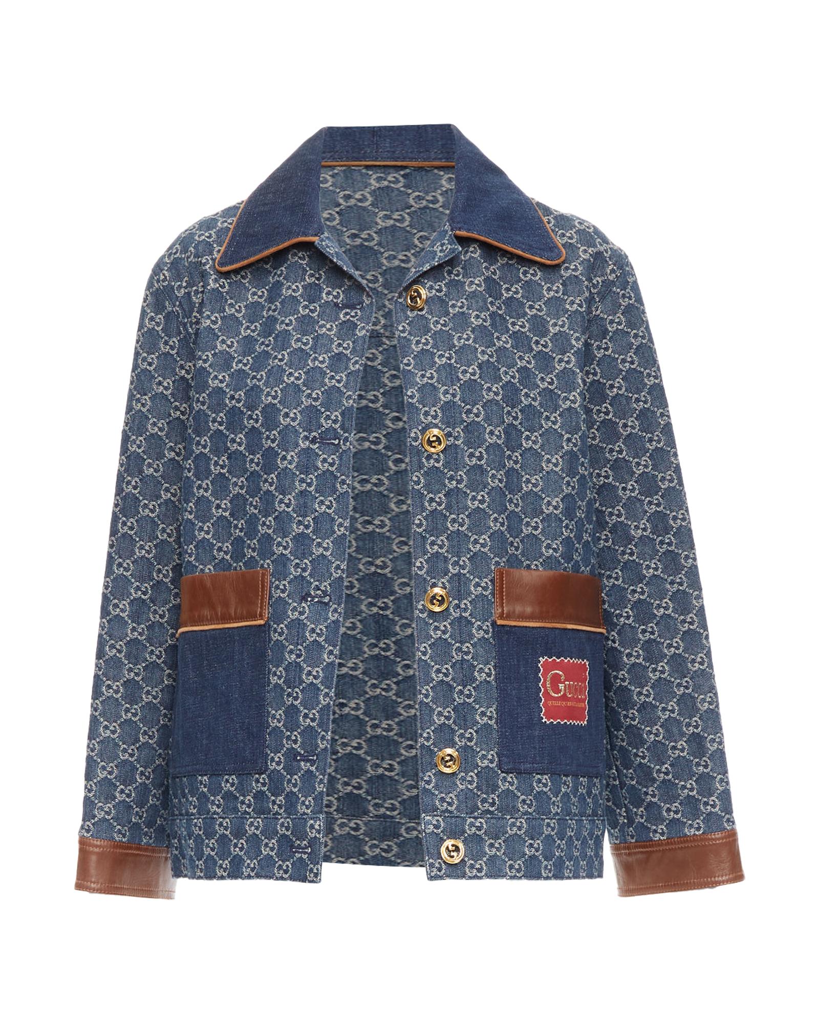 Pre-owned Patterned Denim Jacket with Button Closure and Accented Trim
