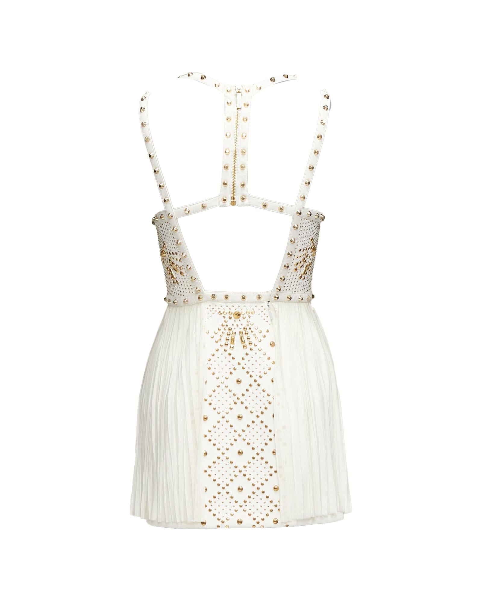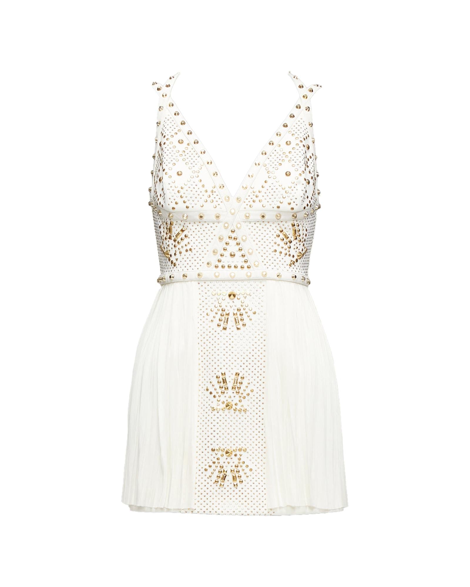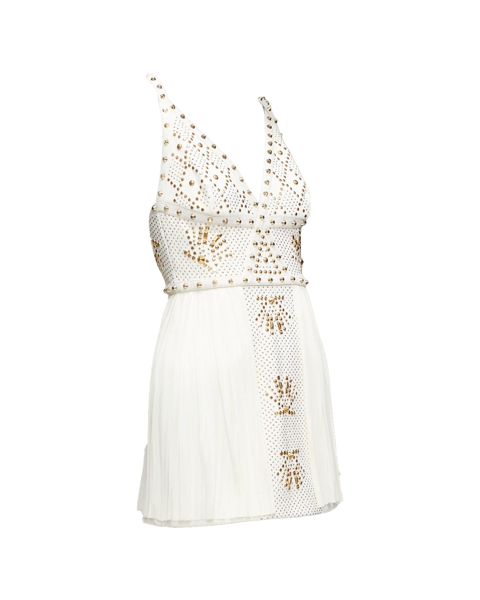 Pre-owned Embellished V-Neck Sleeveless Dress with Pleated Skirt