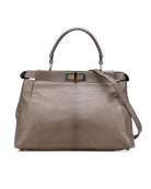 The Peekaboo Iconic features a leather body a flat leather handle a detachable flat leather strap an open top with twist closure and an interior zip pocket.Brand: Fendi Vintage