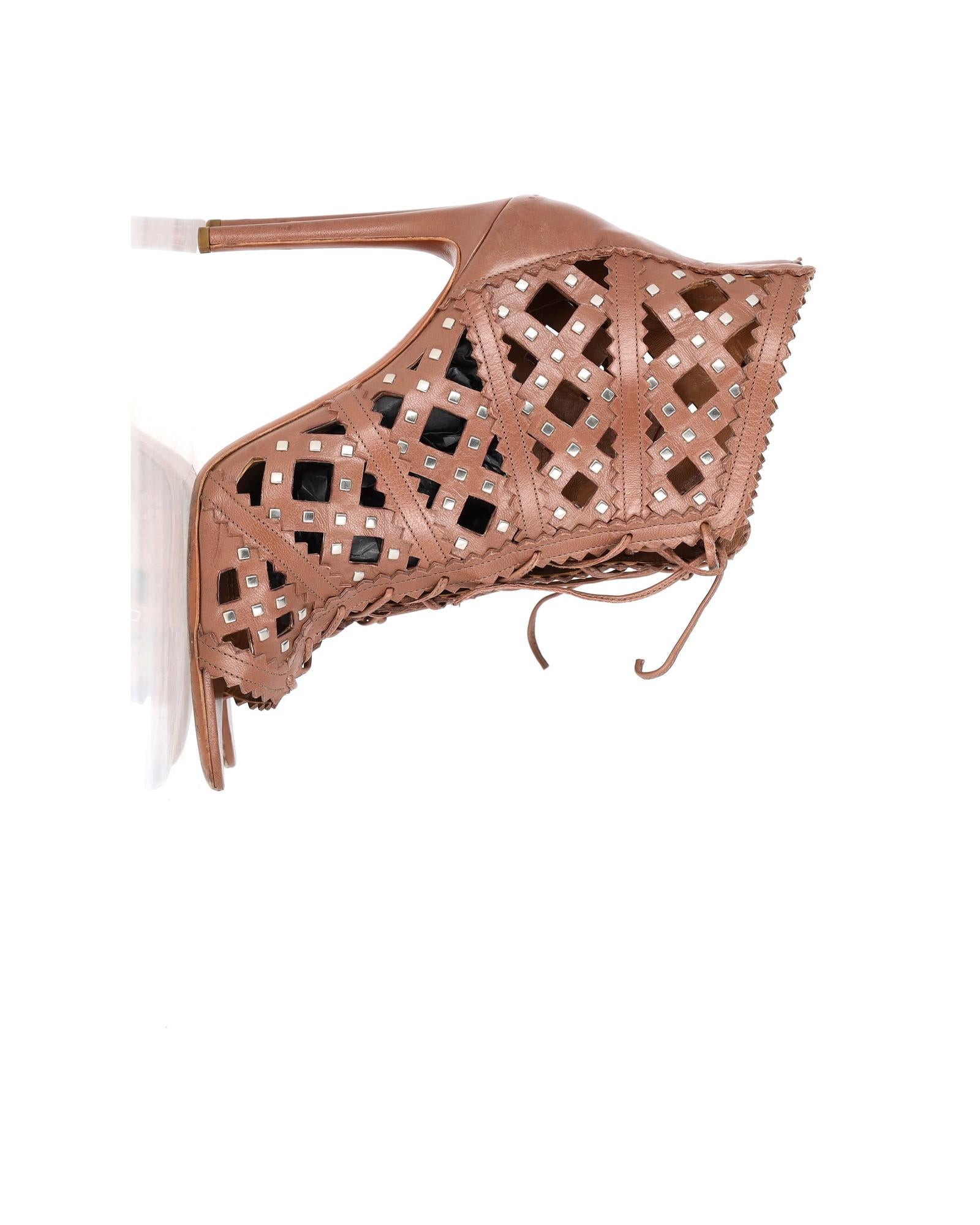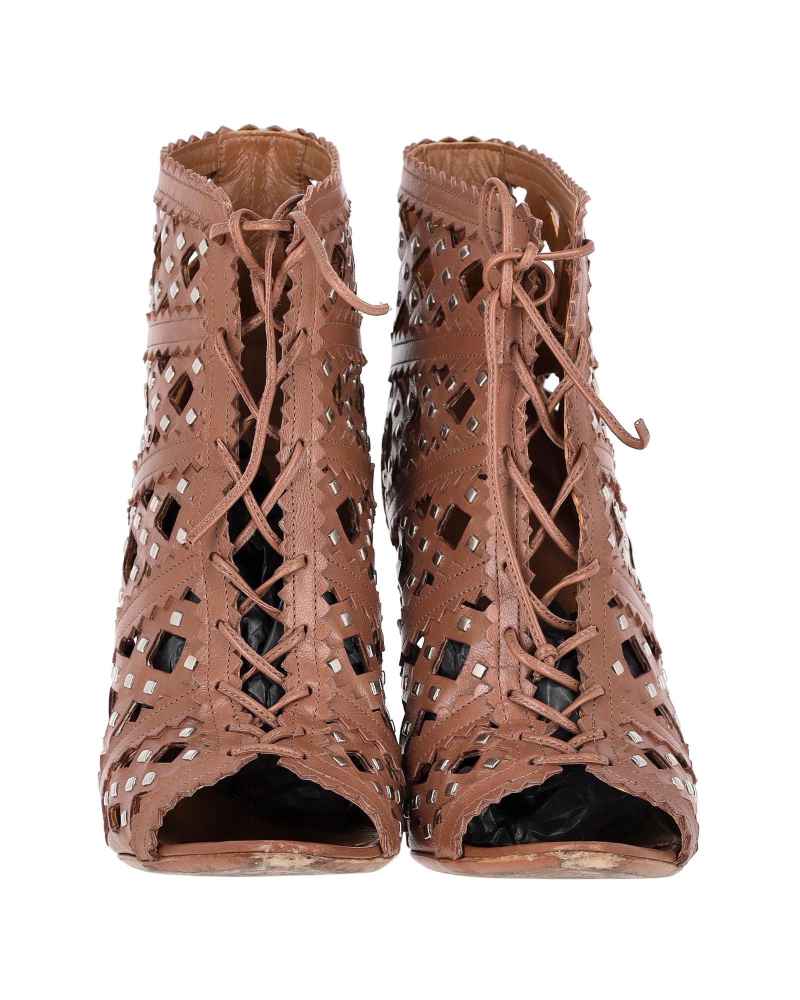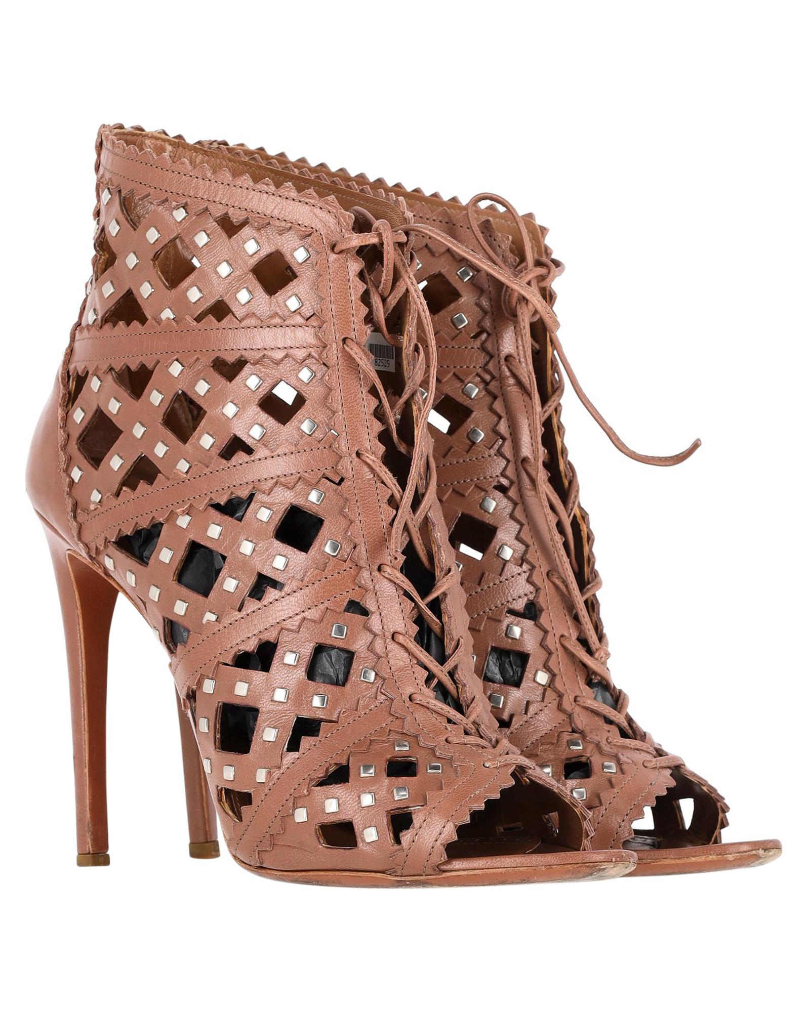 Laser Cut Lace-Up Peep Toe Heeled Boots in Leather