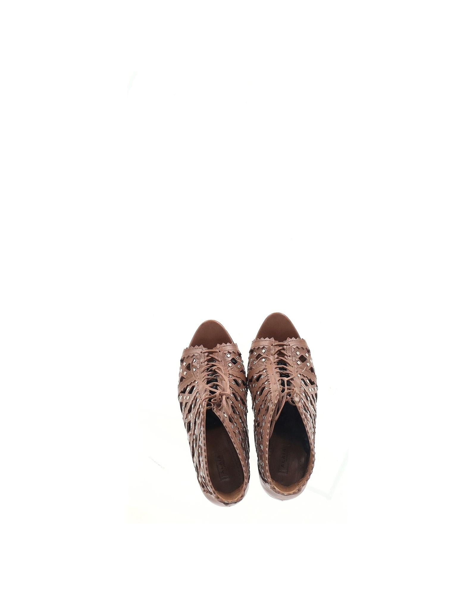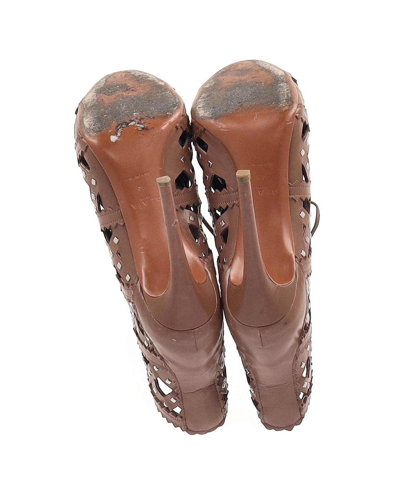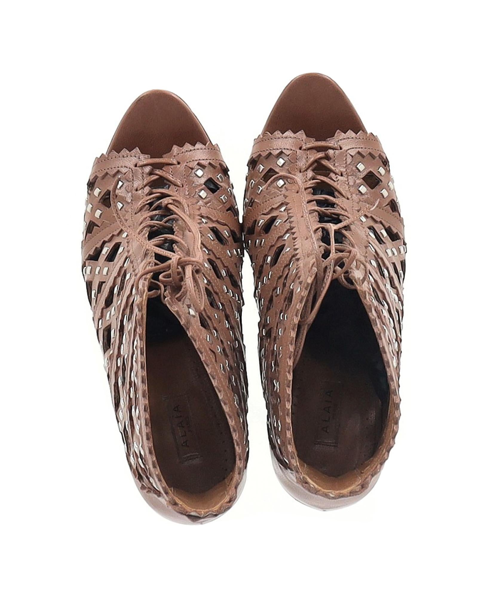 Laser Cut Lace-Up Peep Toe Heeled Boots in Leather