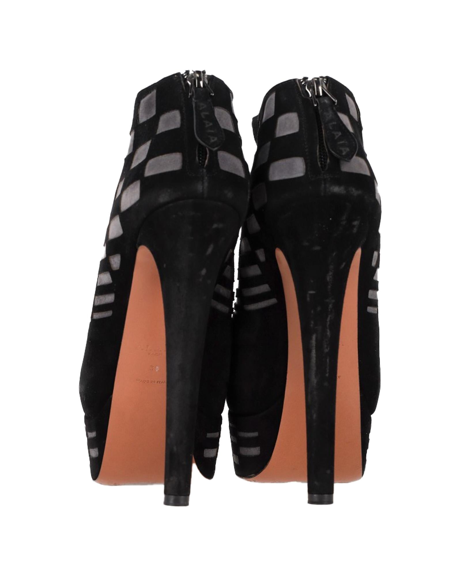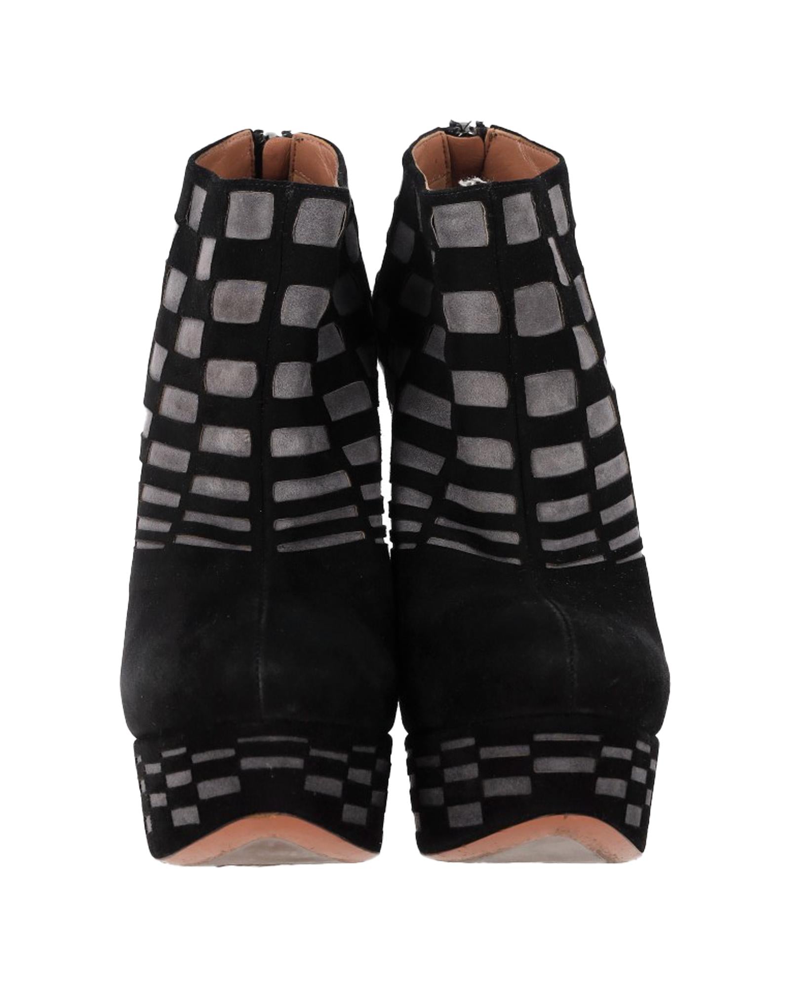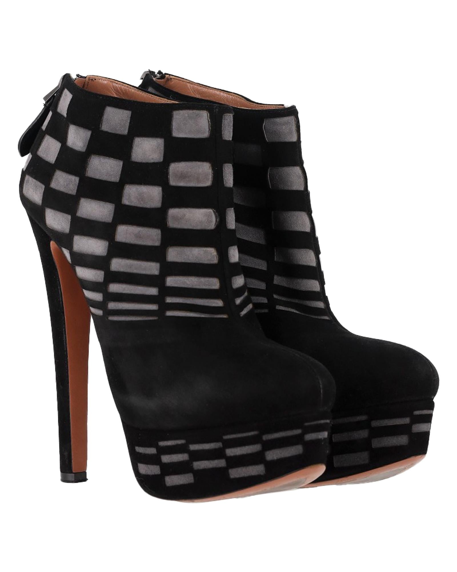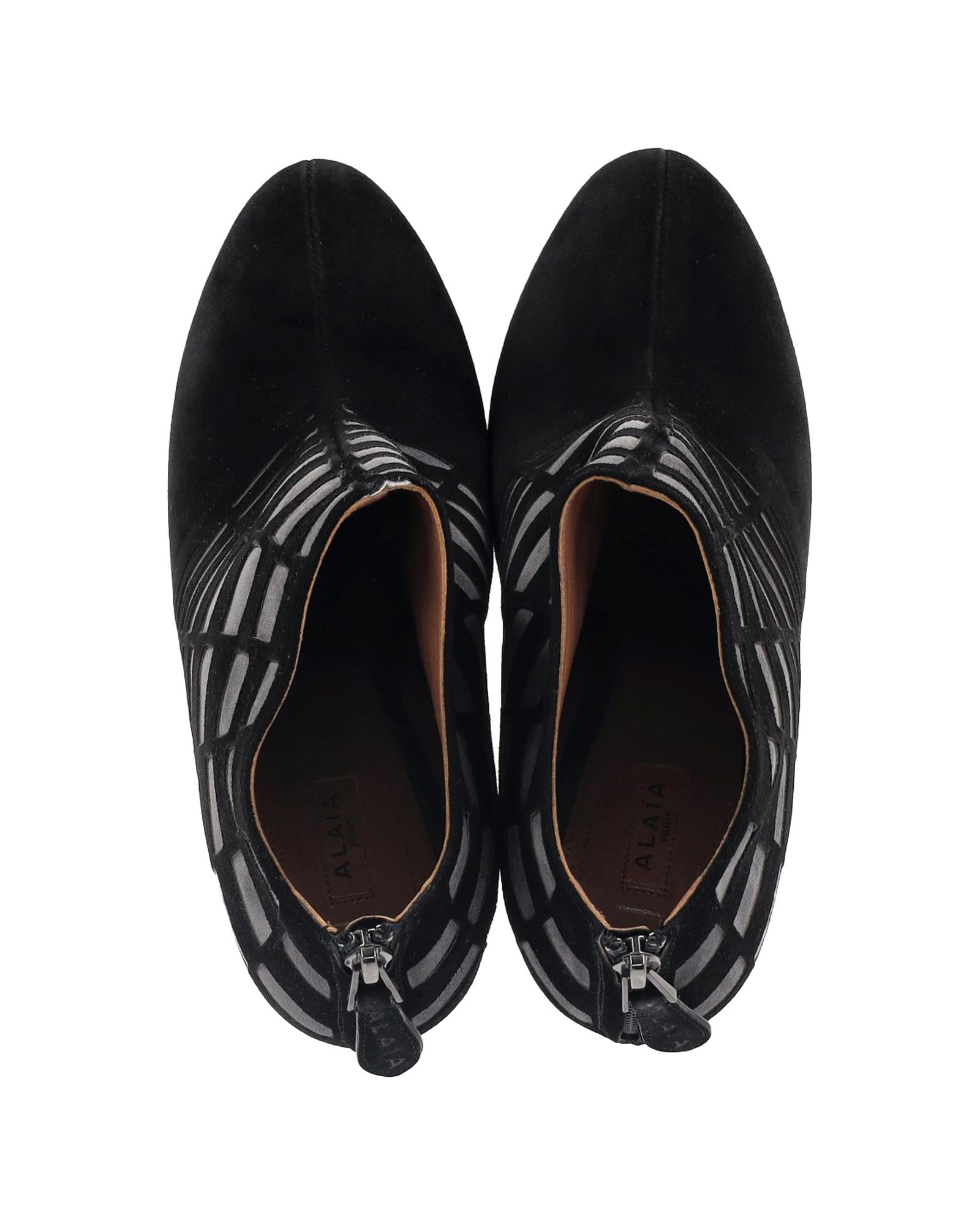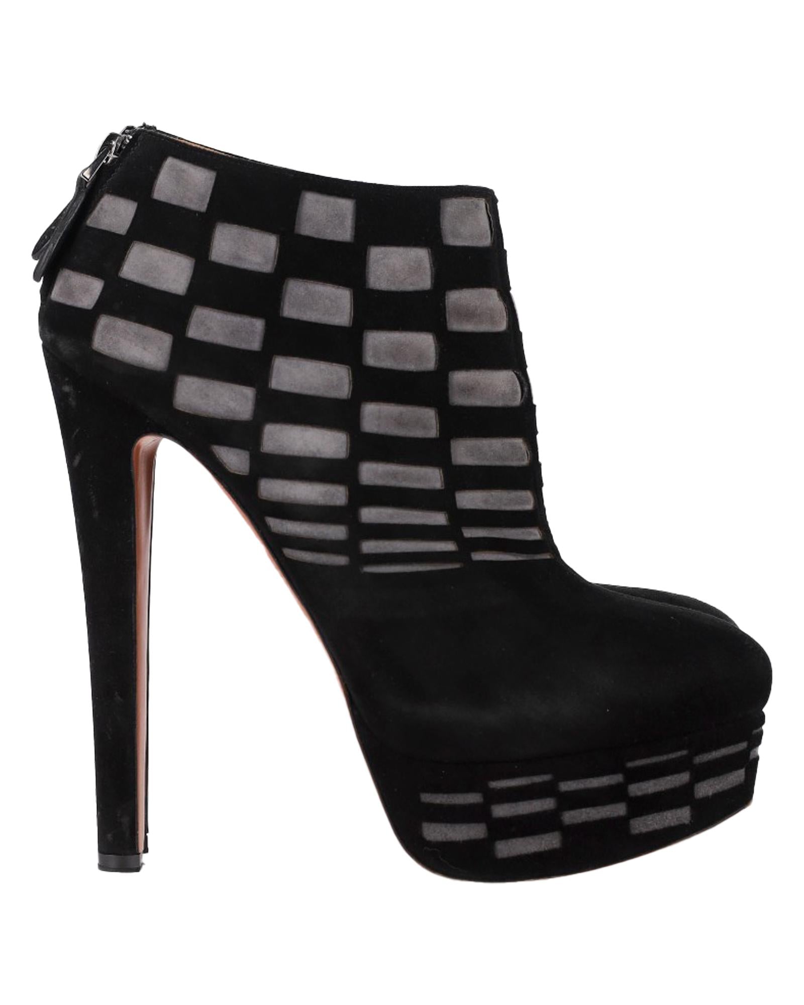 - Alaia Laser Cut Platform Ankle Boots in Black Suede