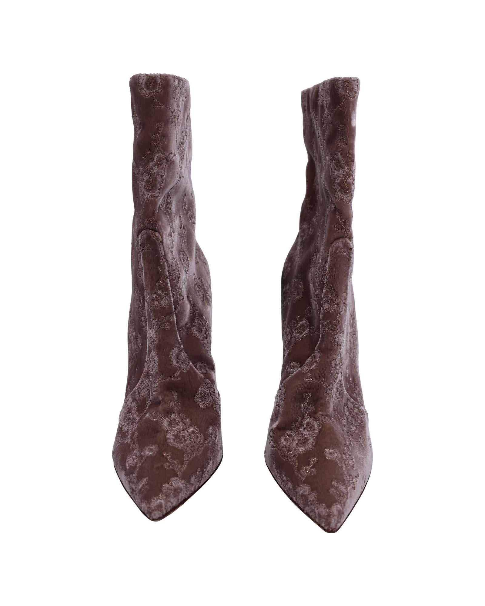 Embroidered Velvet Ankle Boots with High Heels and Pointed Toes