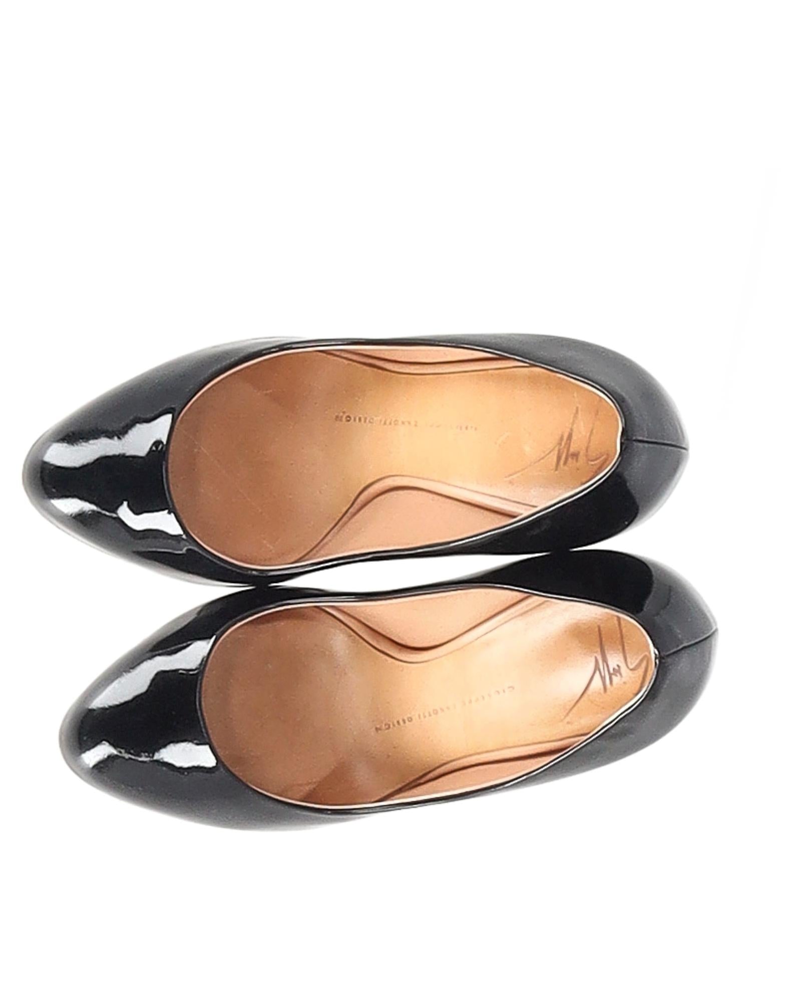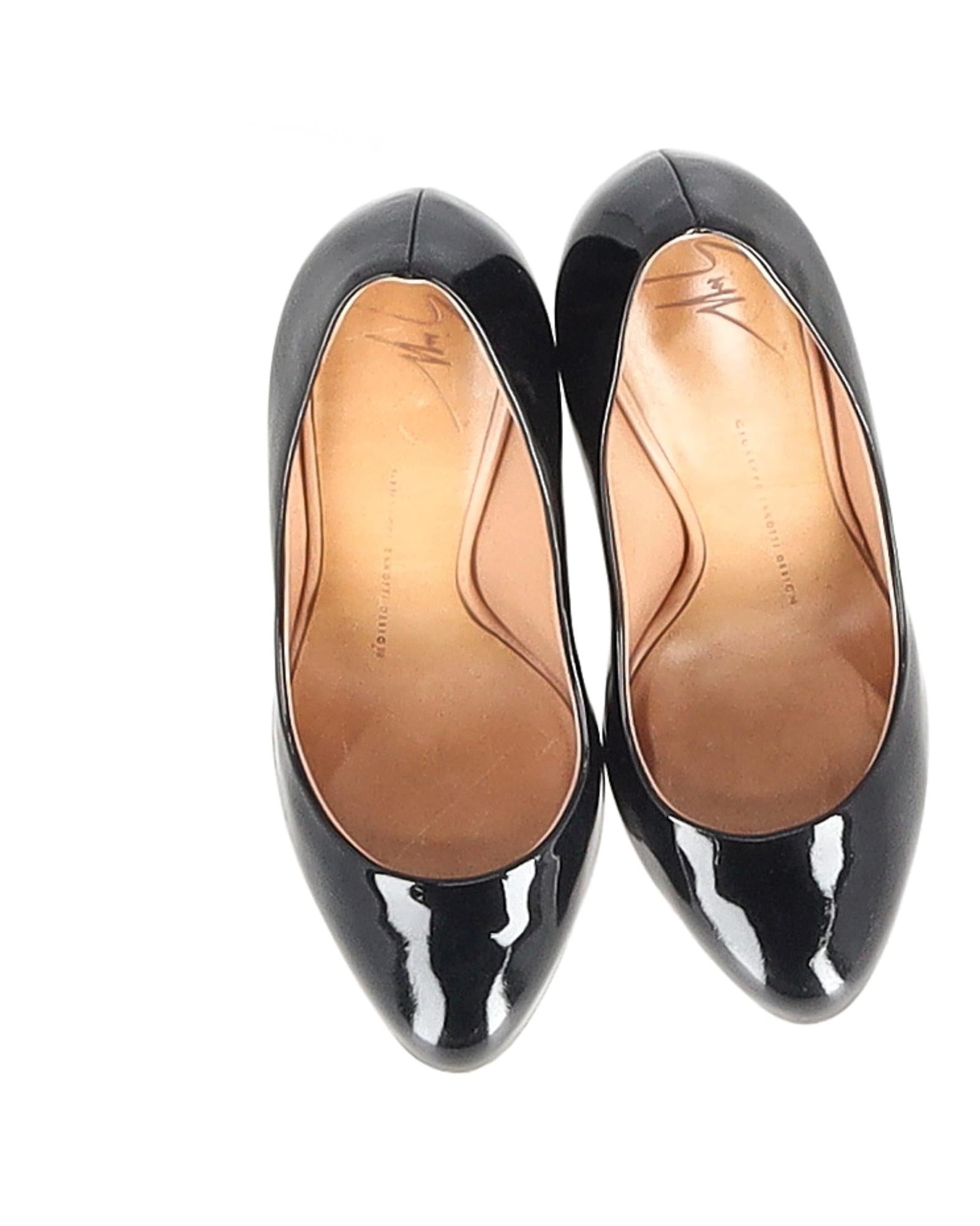 • Sleek black patent leather