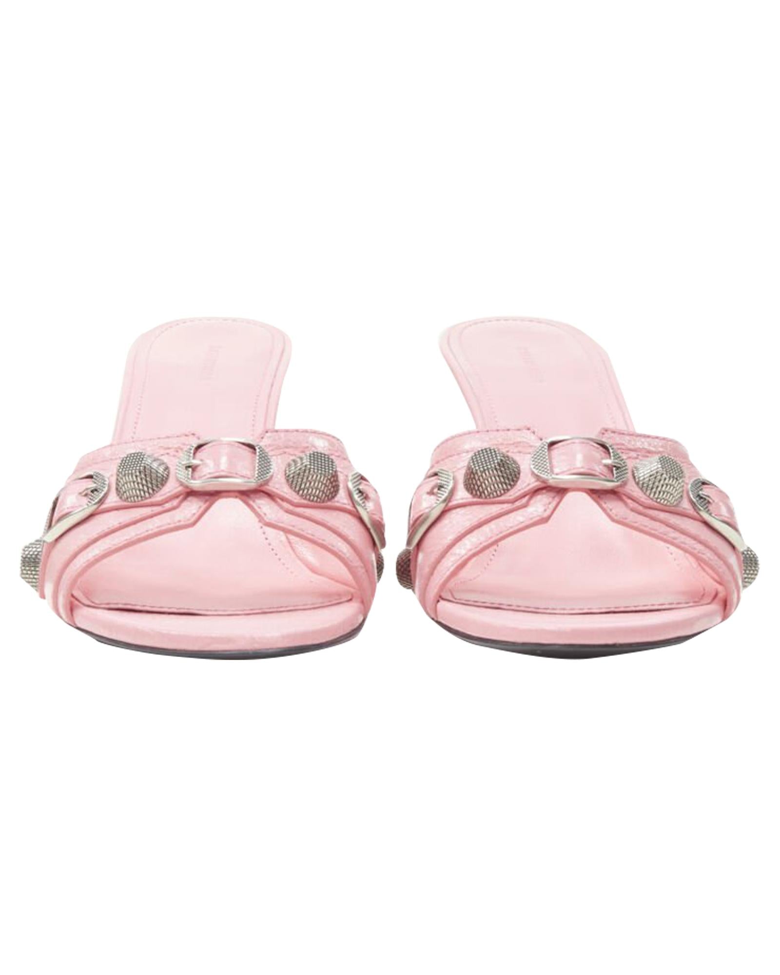 Pre-owned Elegant Heeled Mules with Buckle and Stud Details