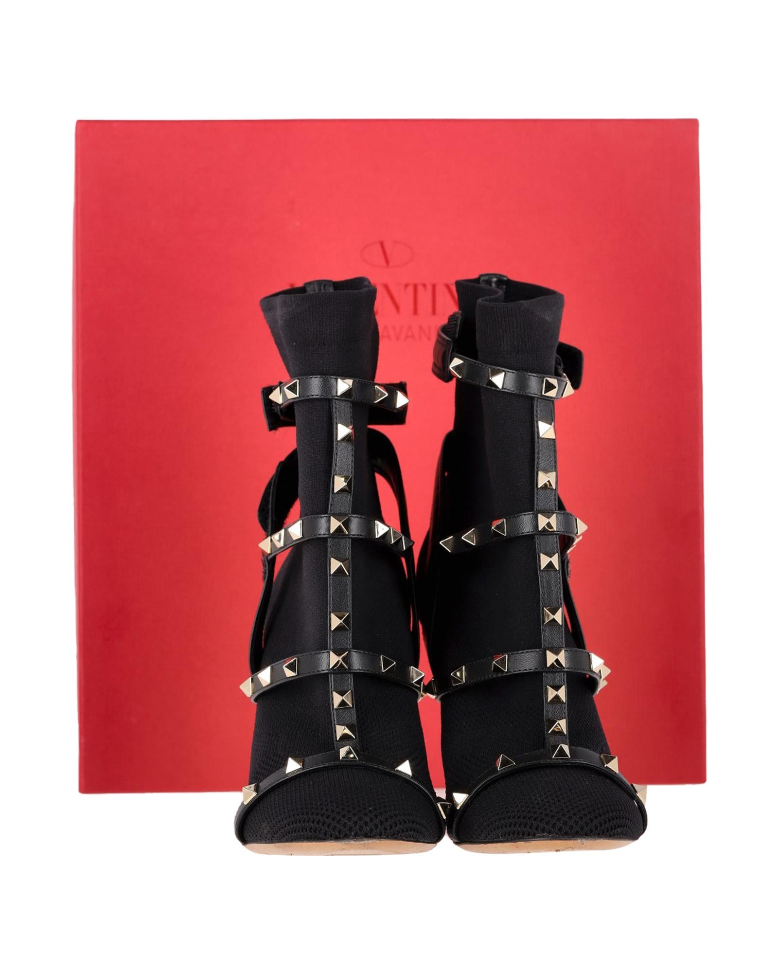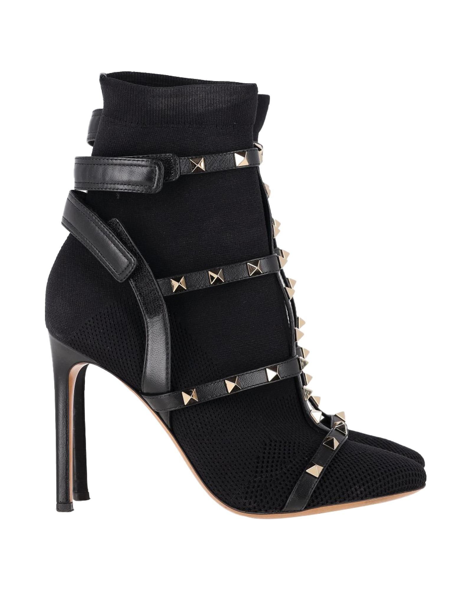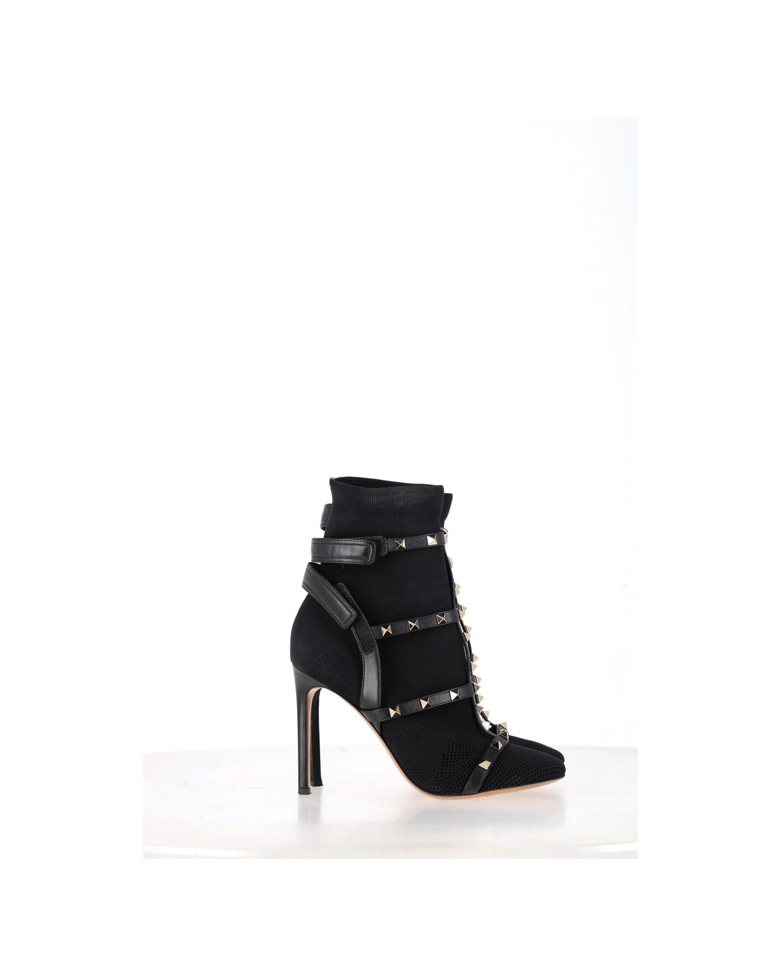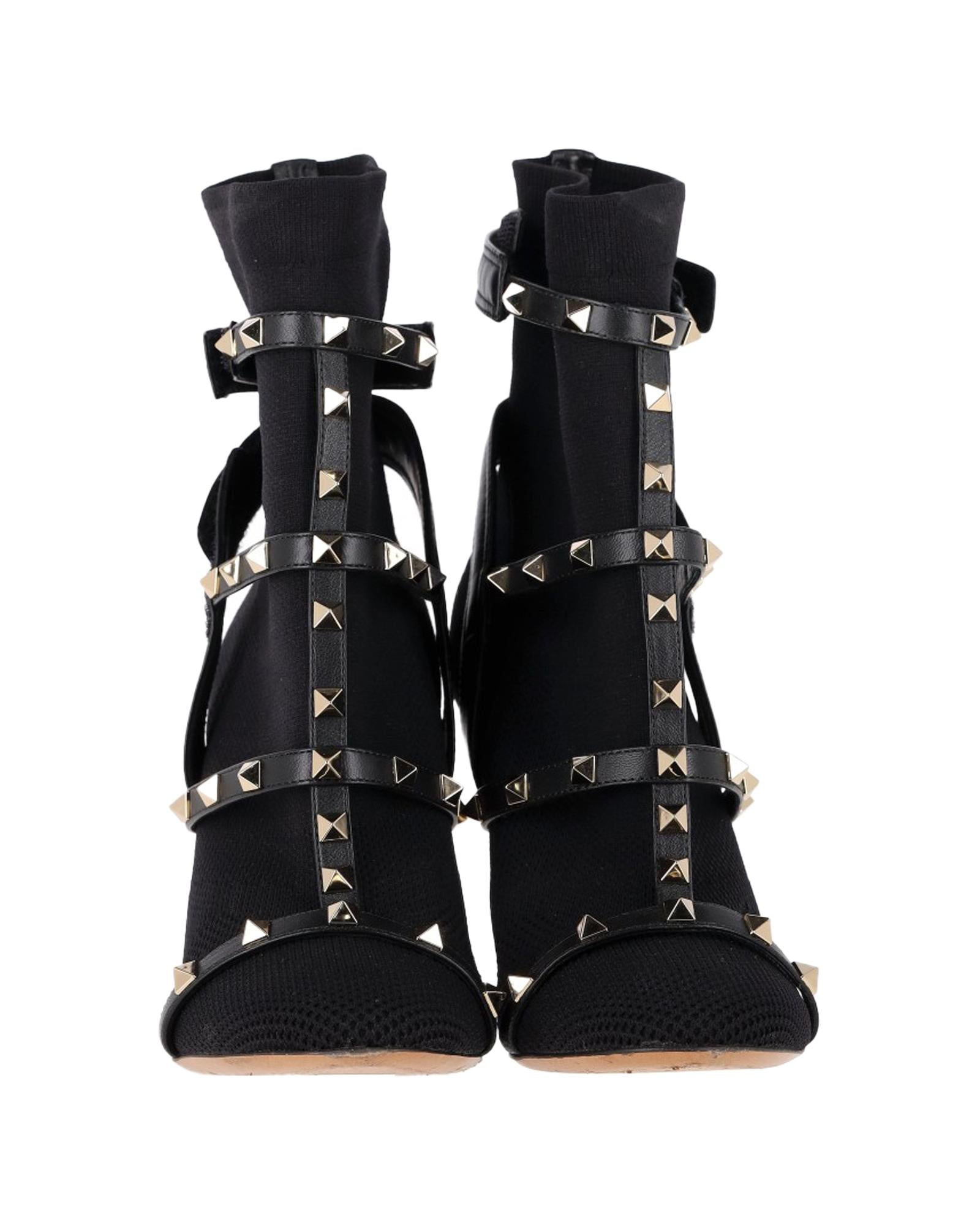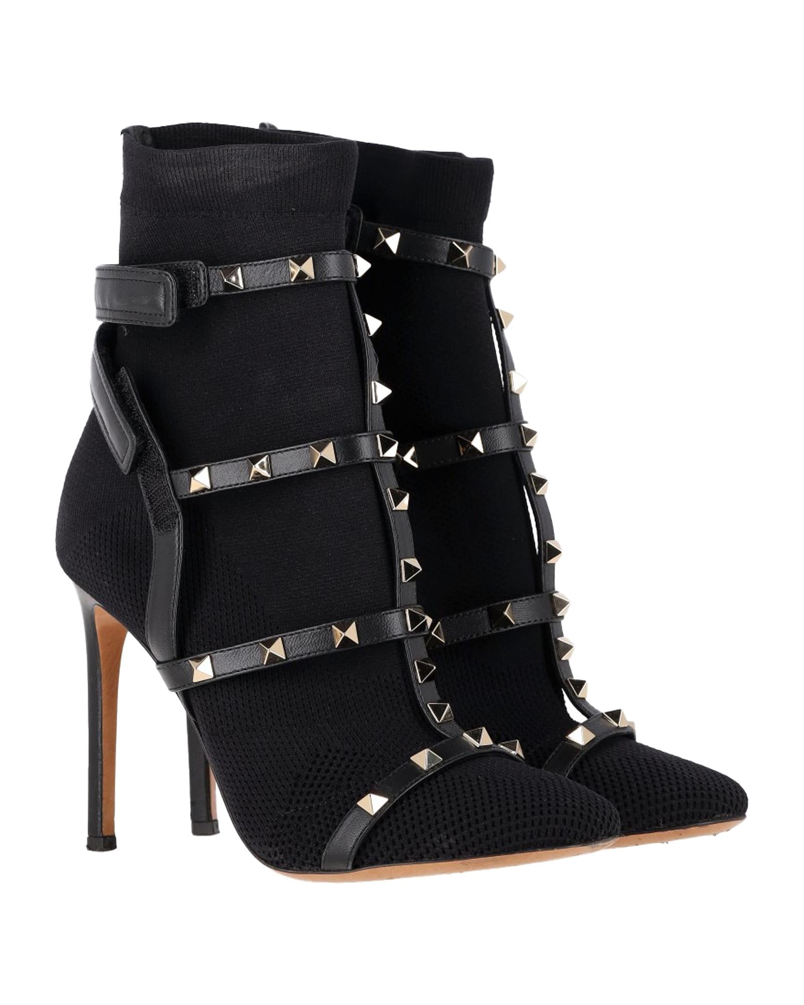 - Valentino Knit Rockstud Caged Boots in Black Leather
