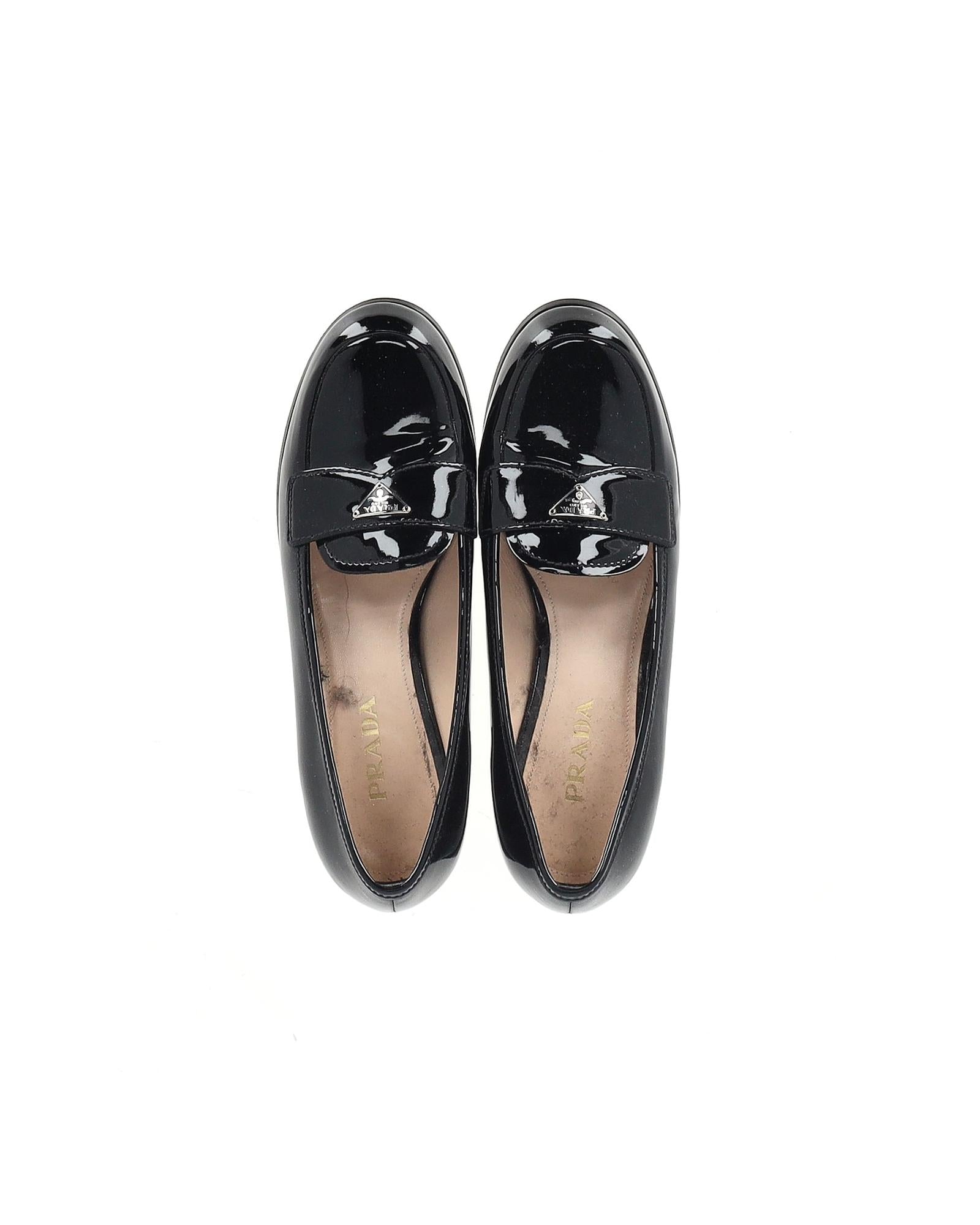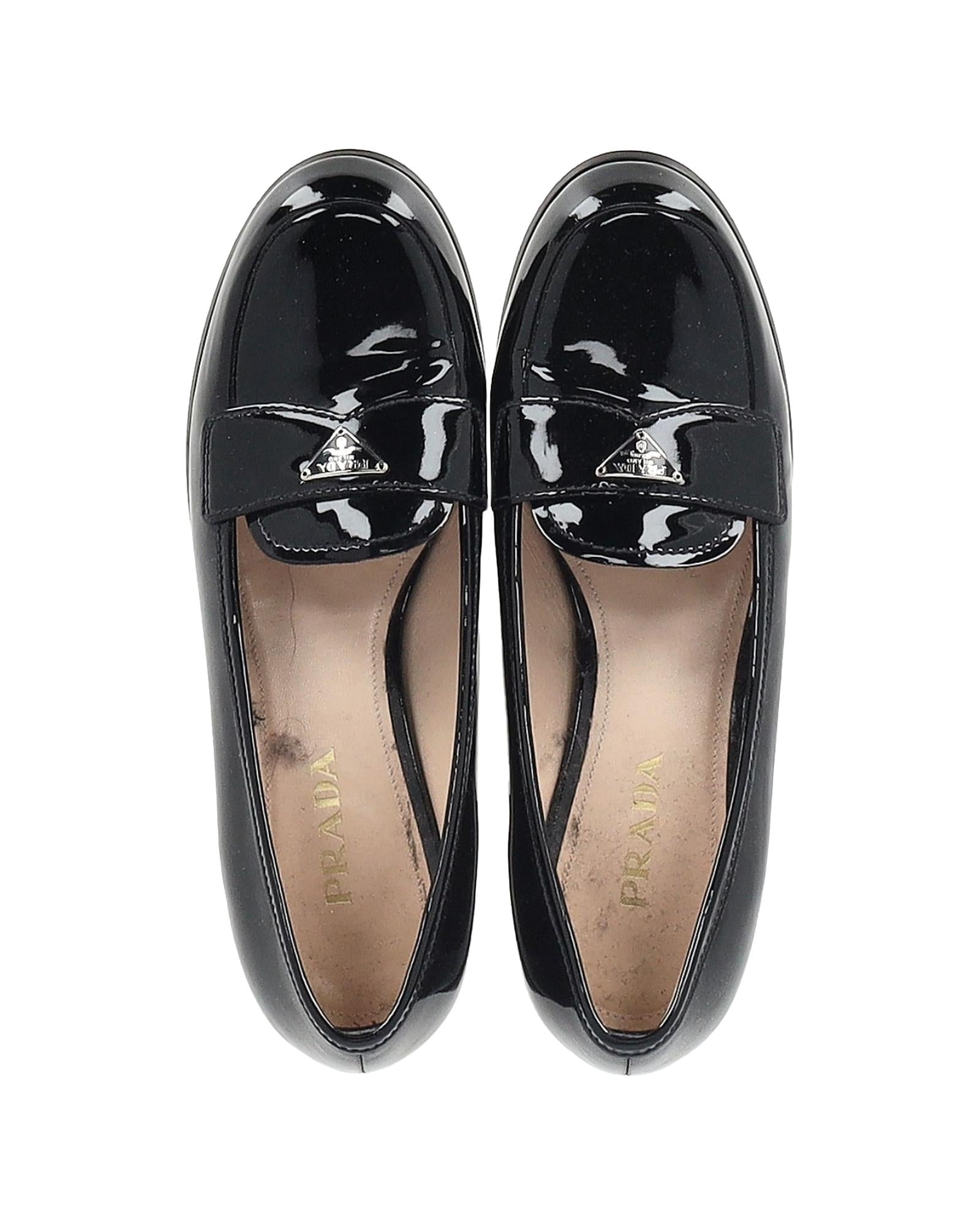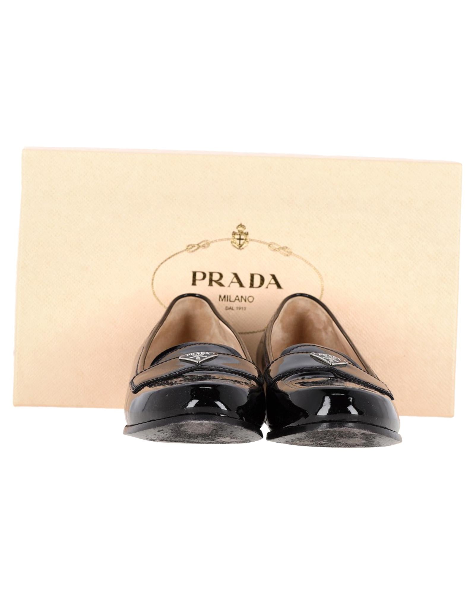 - Prada Logo Plaque Loafers in Black Patent Leather