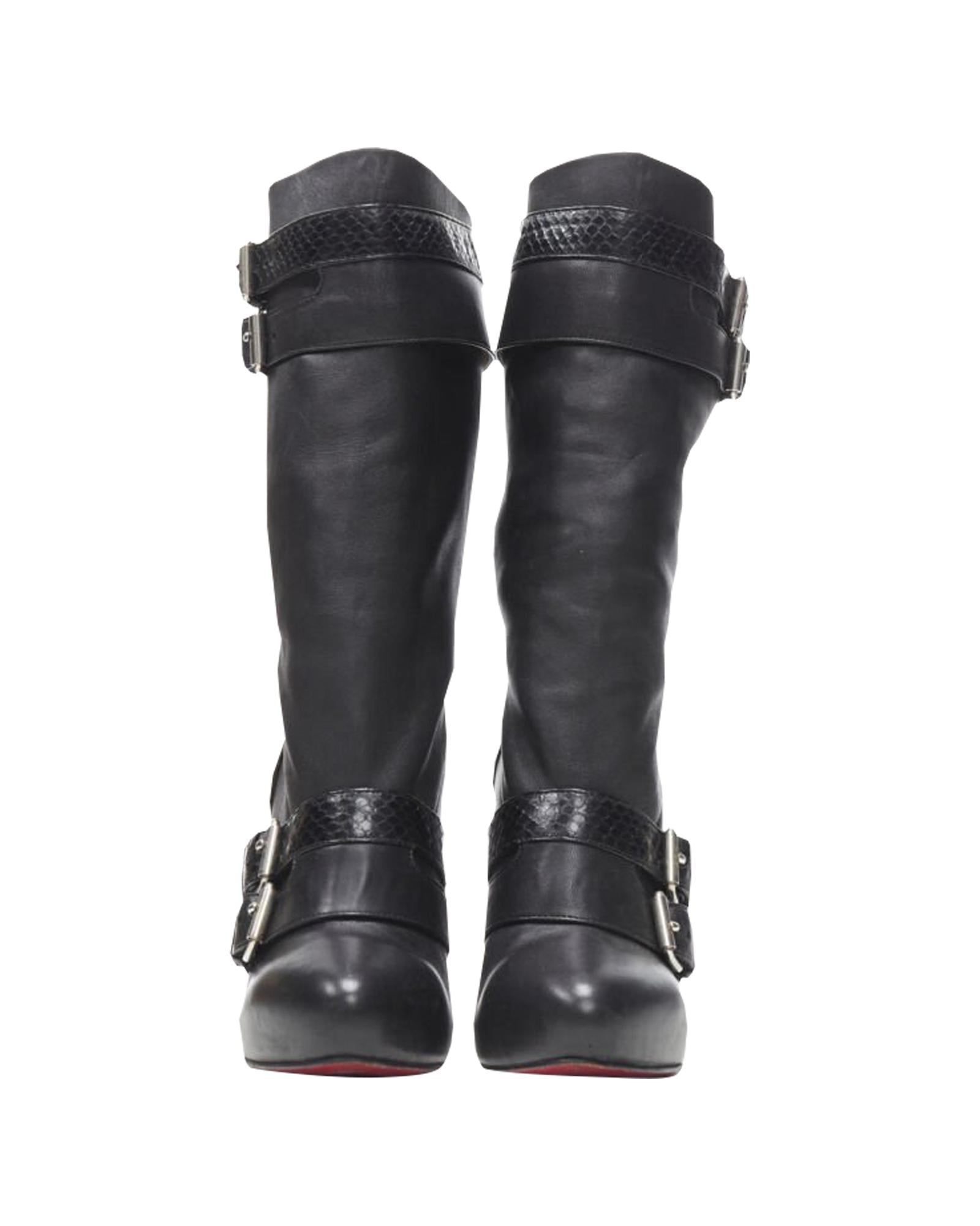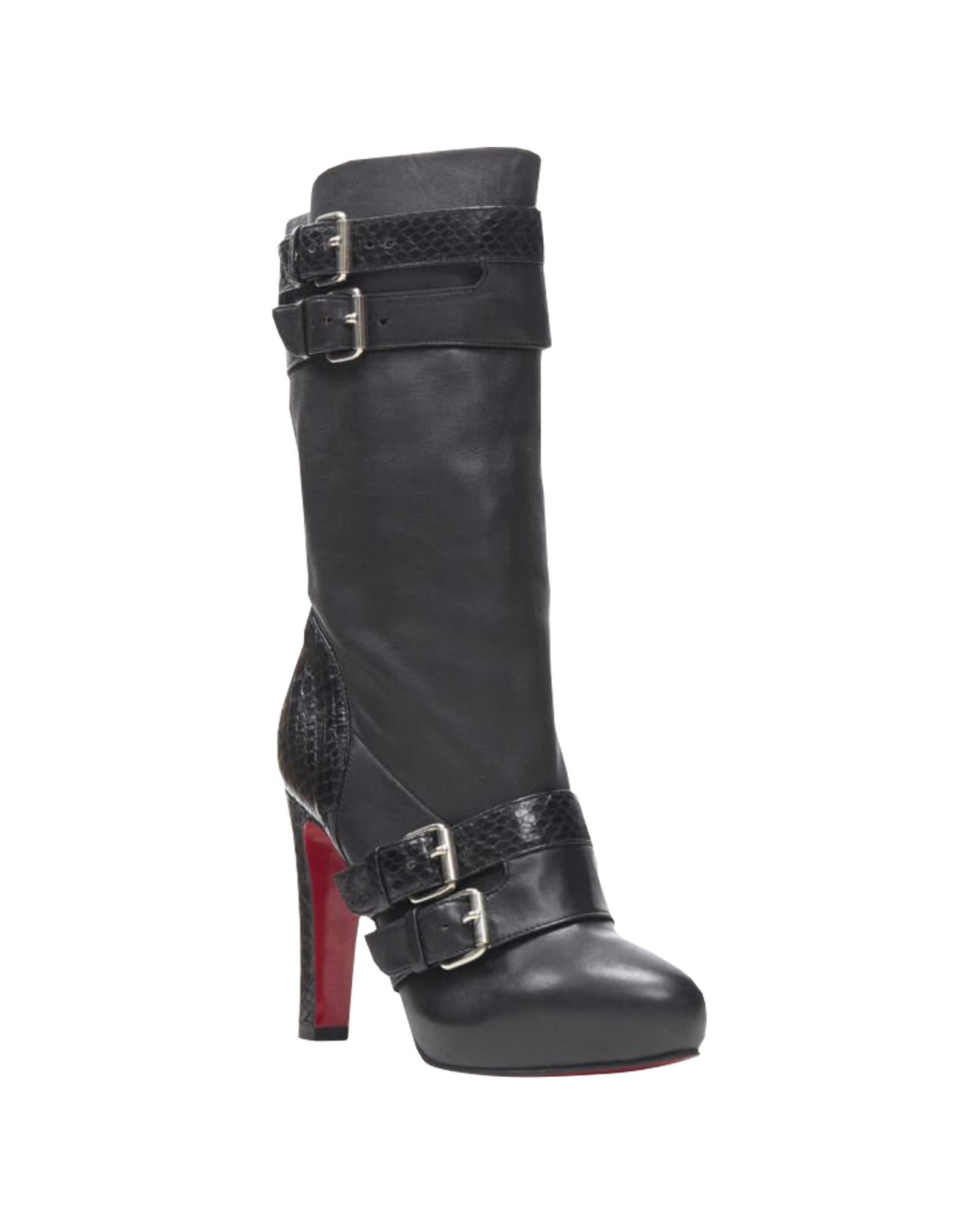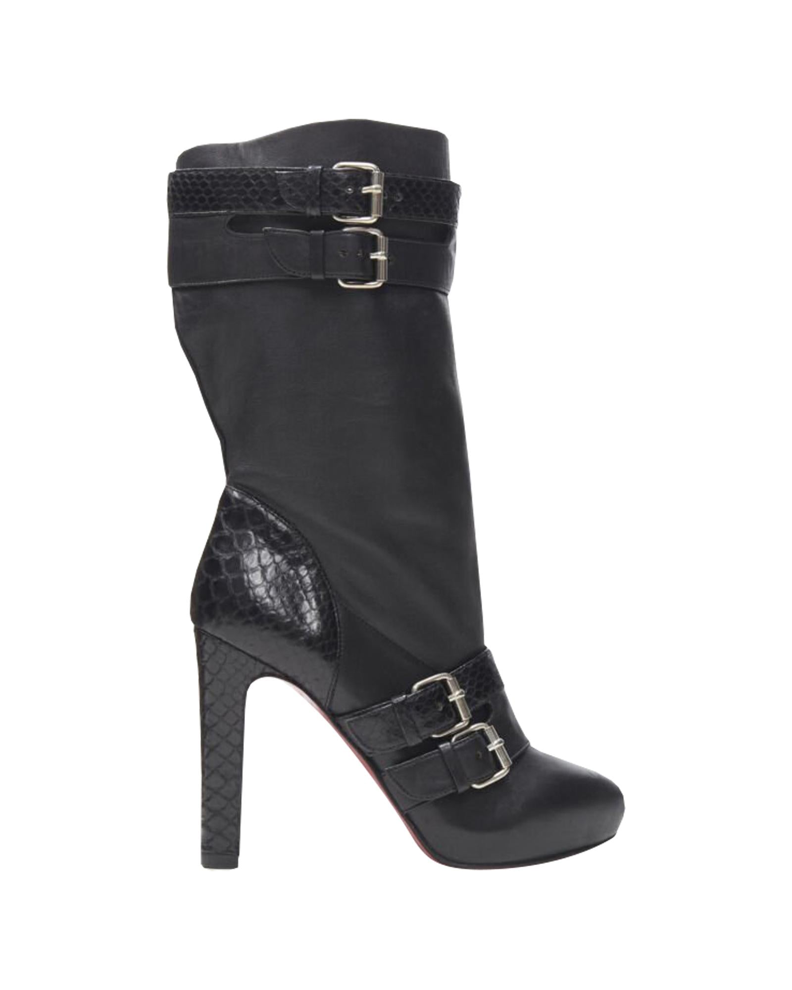 Pre-owned High Heel Boots with Buckle Detail and Textured Accents
