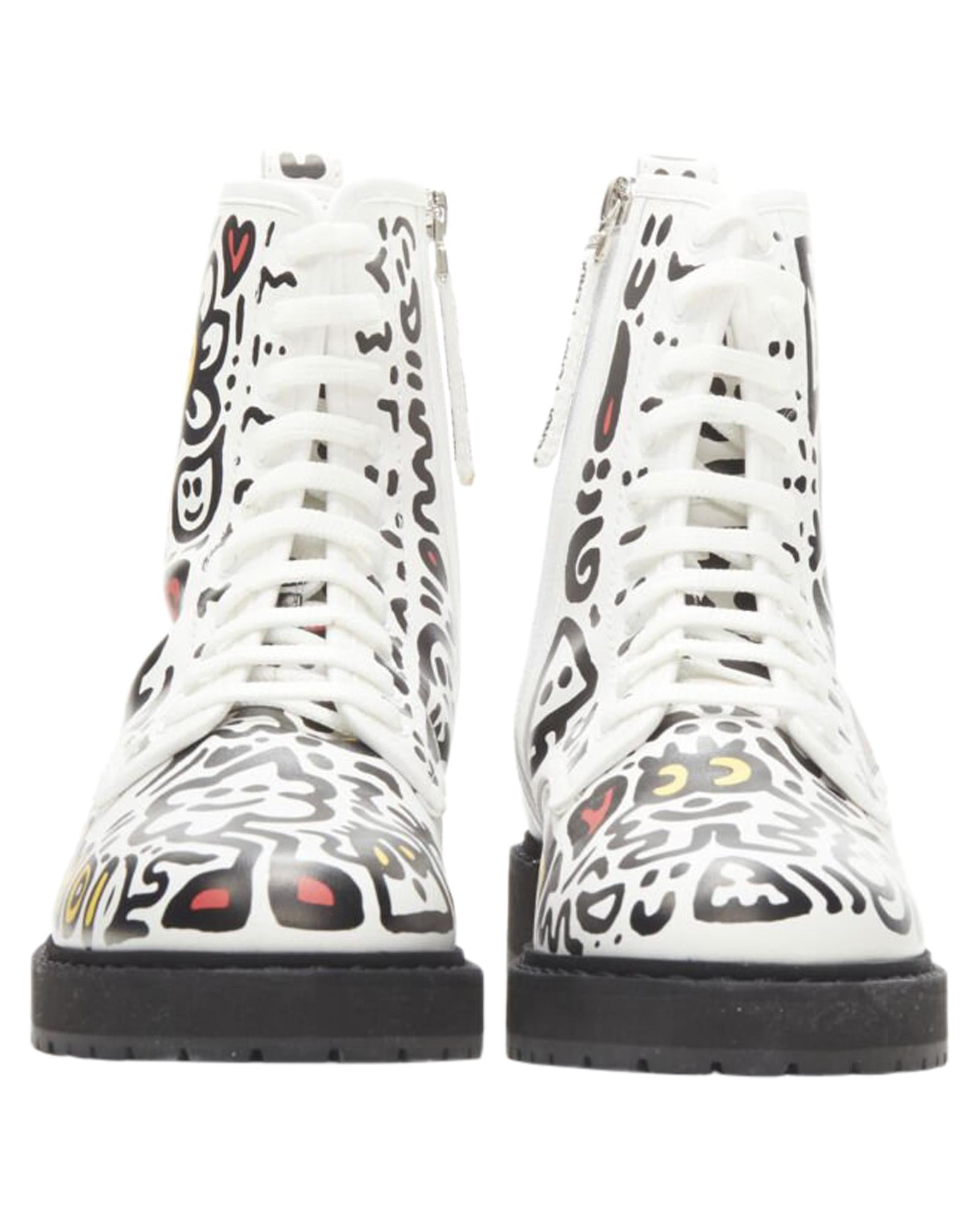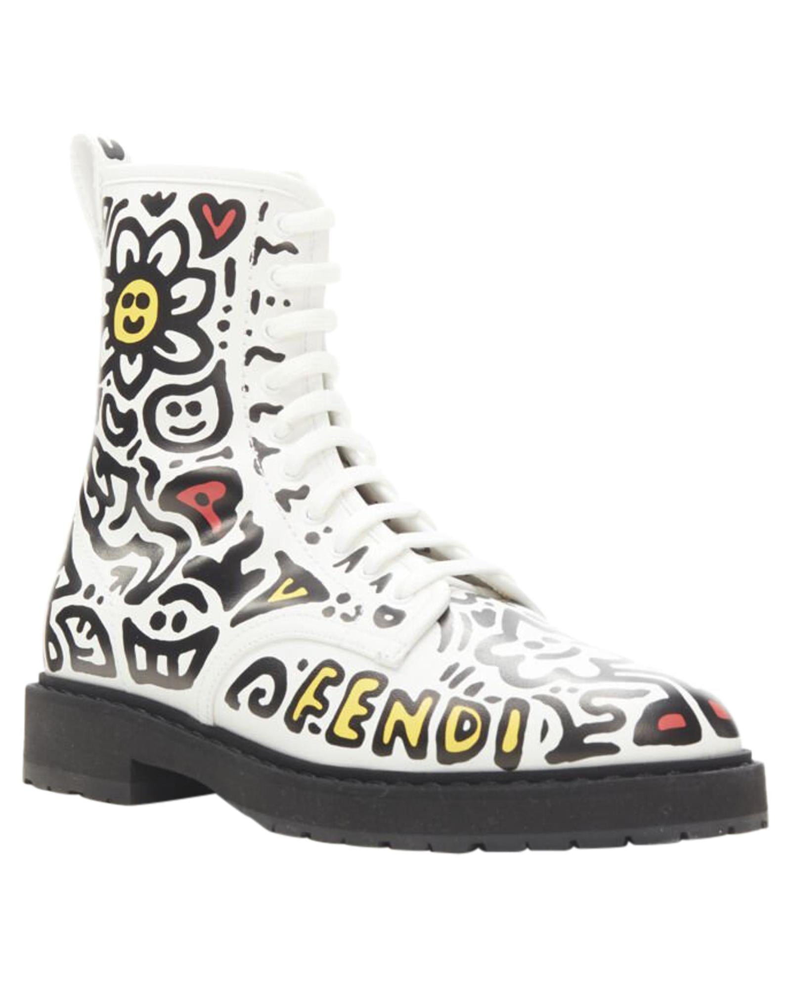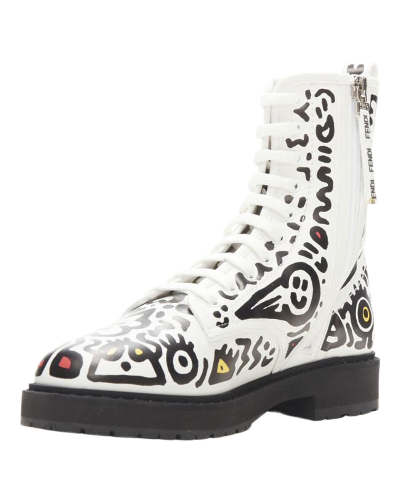 Pre-owned Lace-Up Leather Ankle Boots with Graphic Design