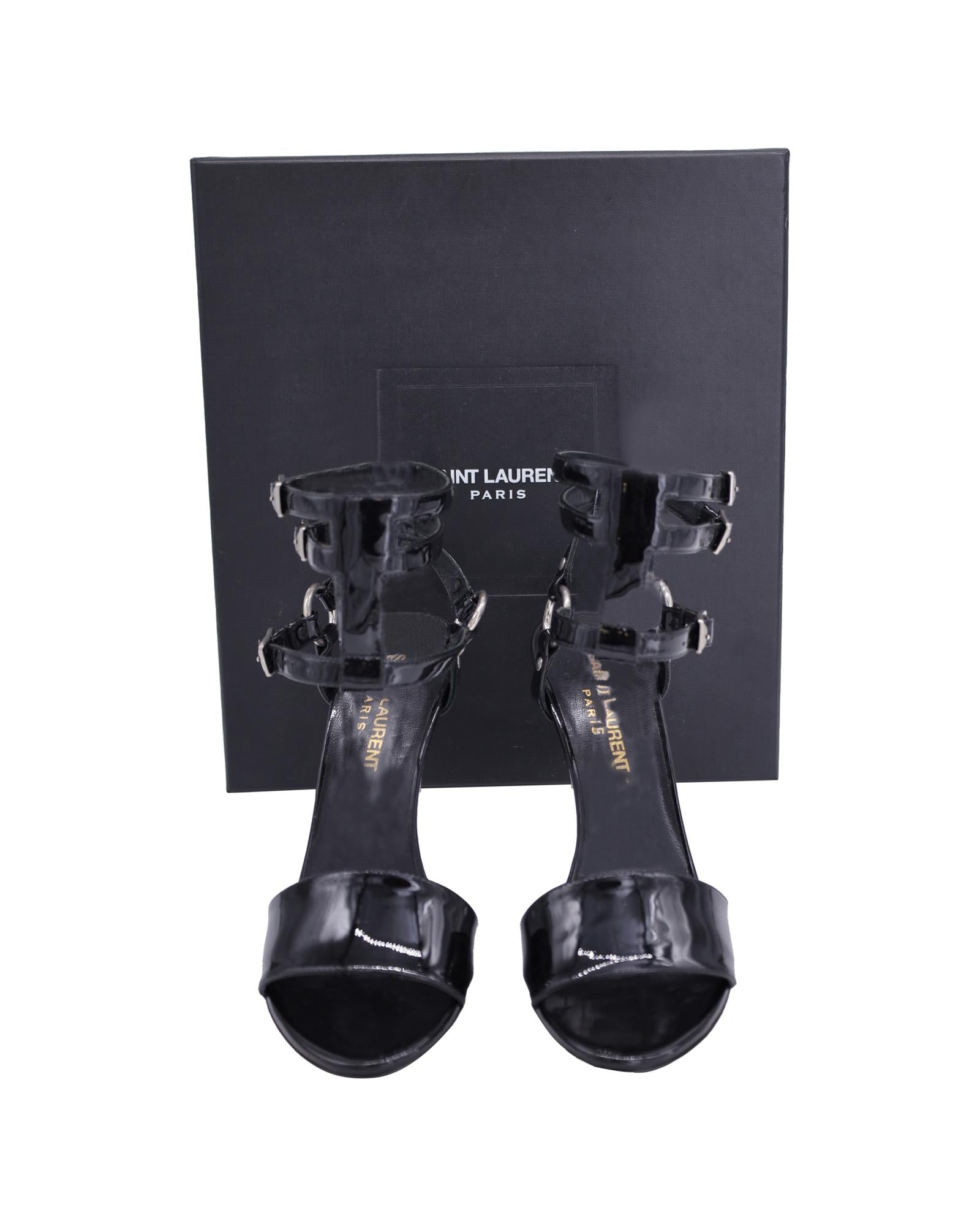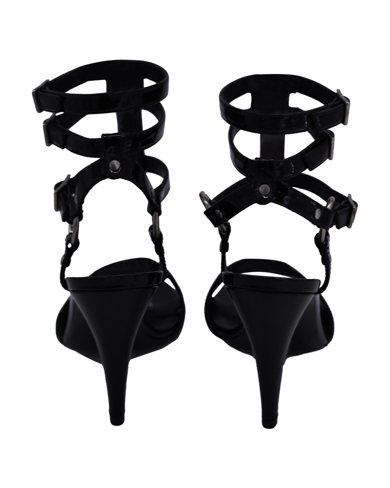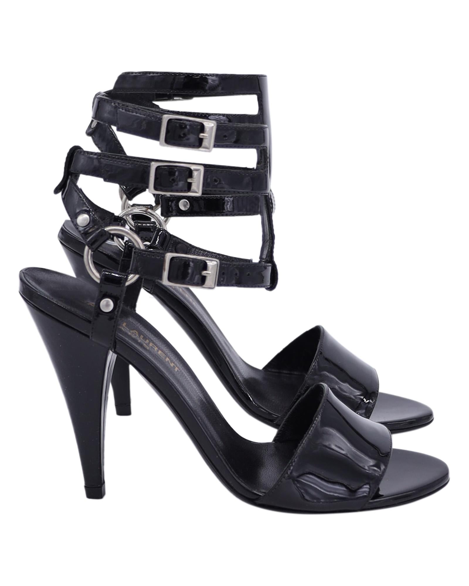 • Saint Laurent Ankle Cage Strap Heels in Black Patent Leather