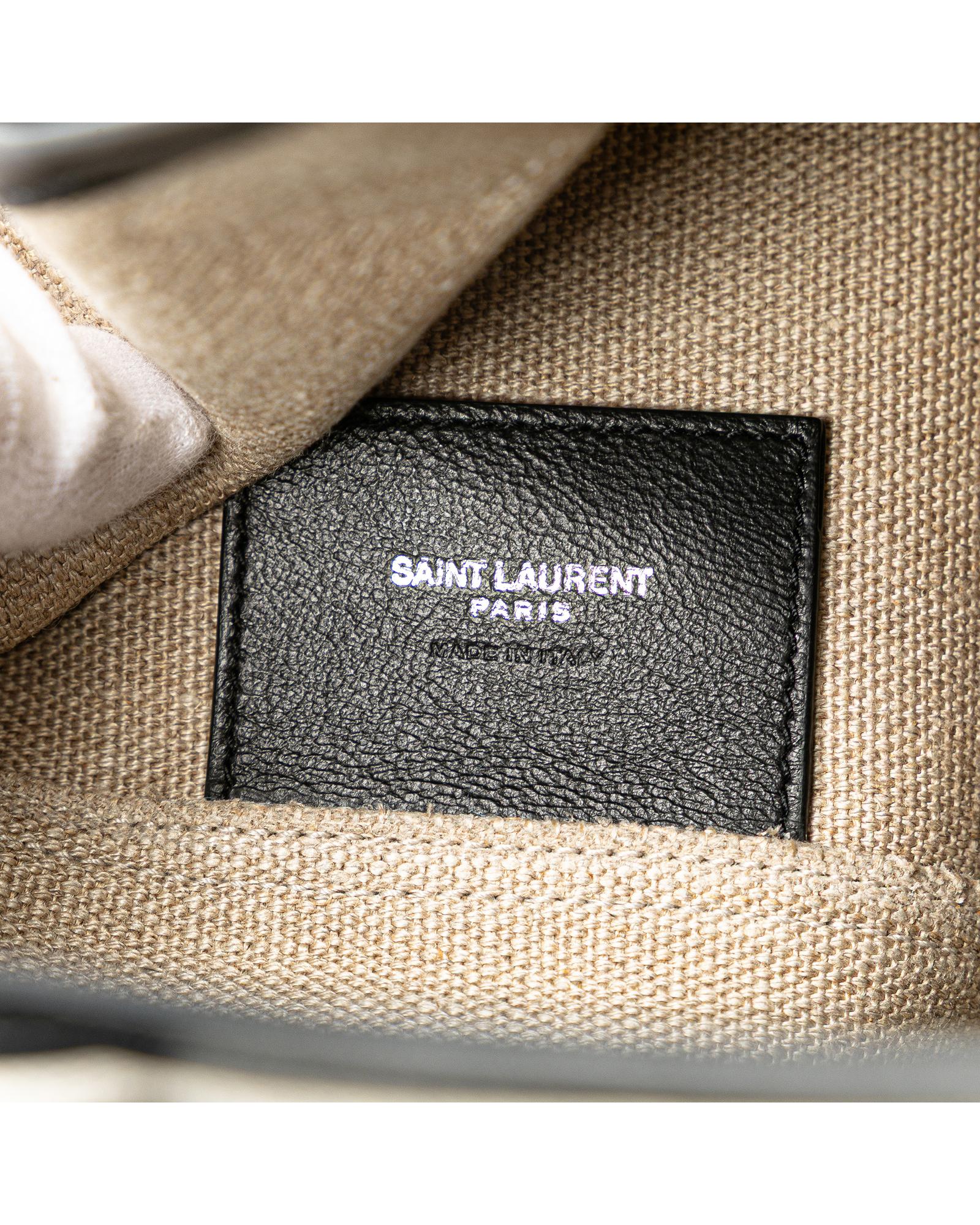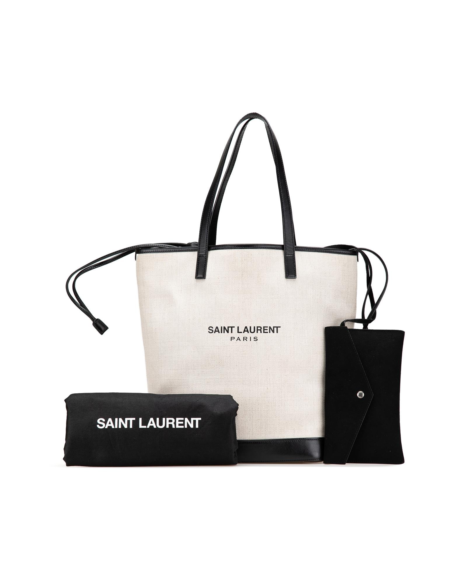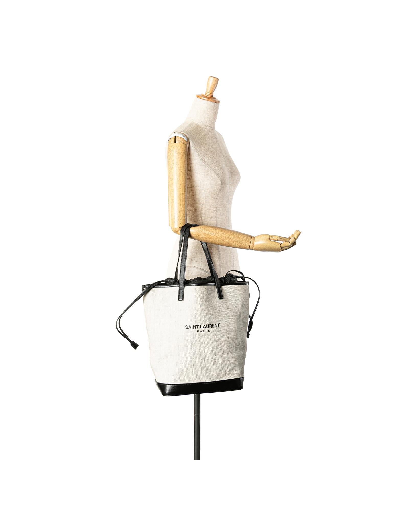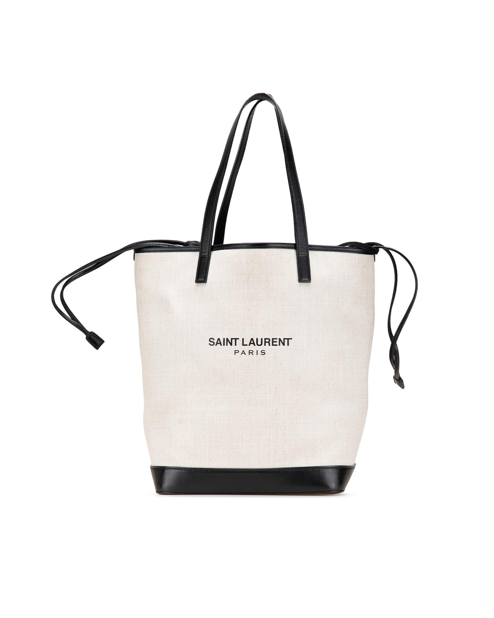 The Teddy Shopping Tote features a canvas body with leather trim flat leather straps a top drawstring closure and a detachable interior flap pouch.Brand: Saint Laurent