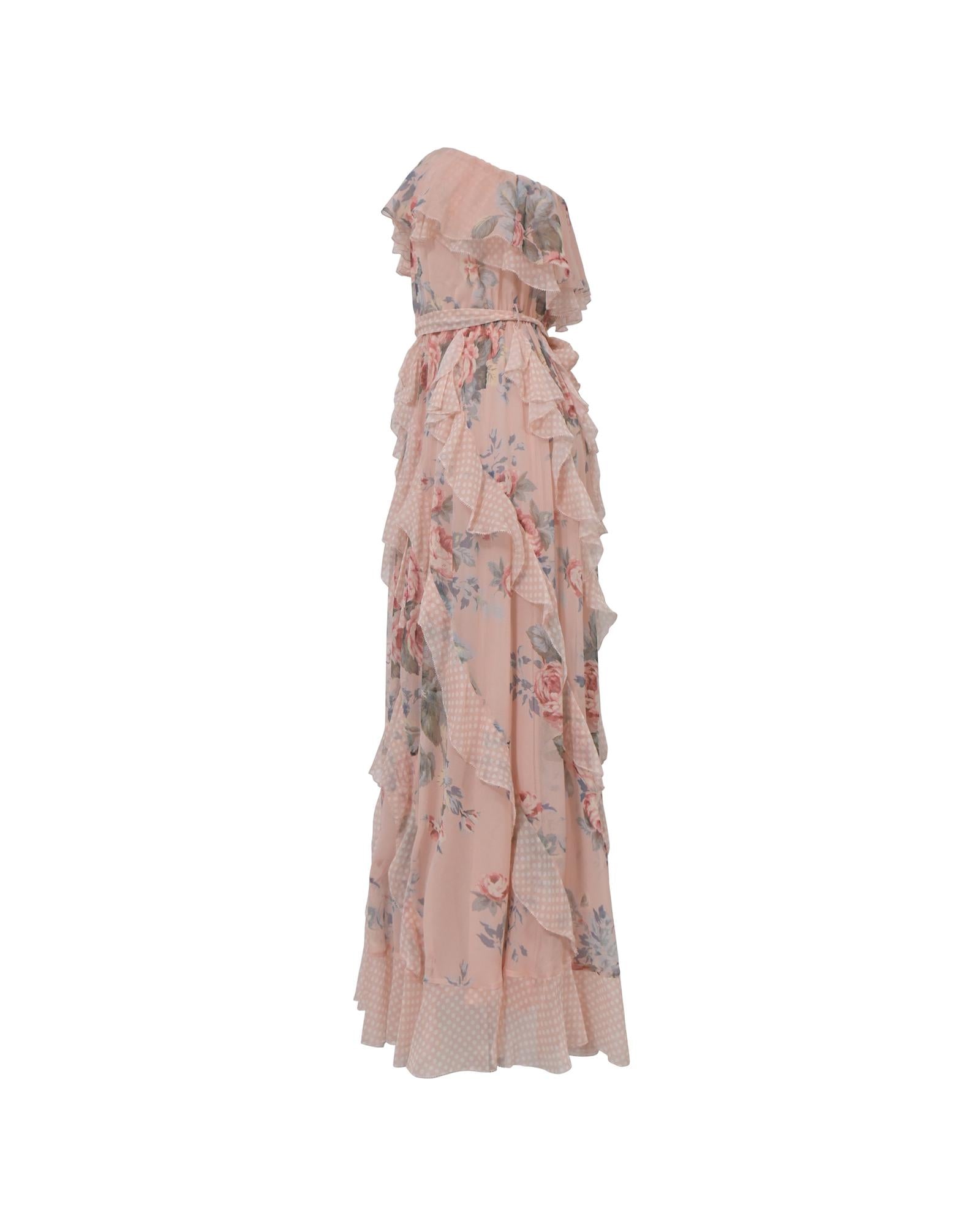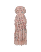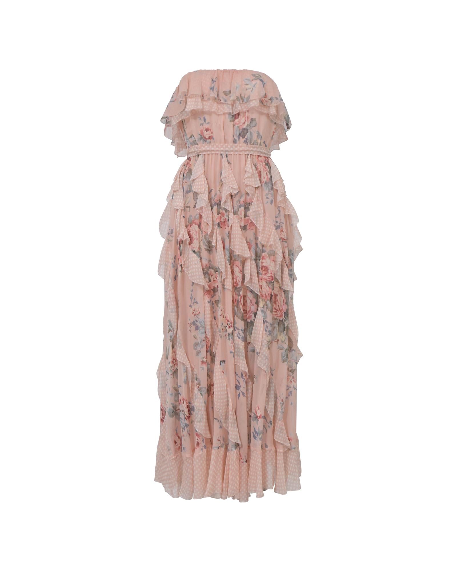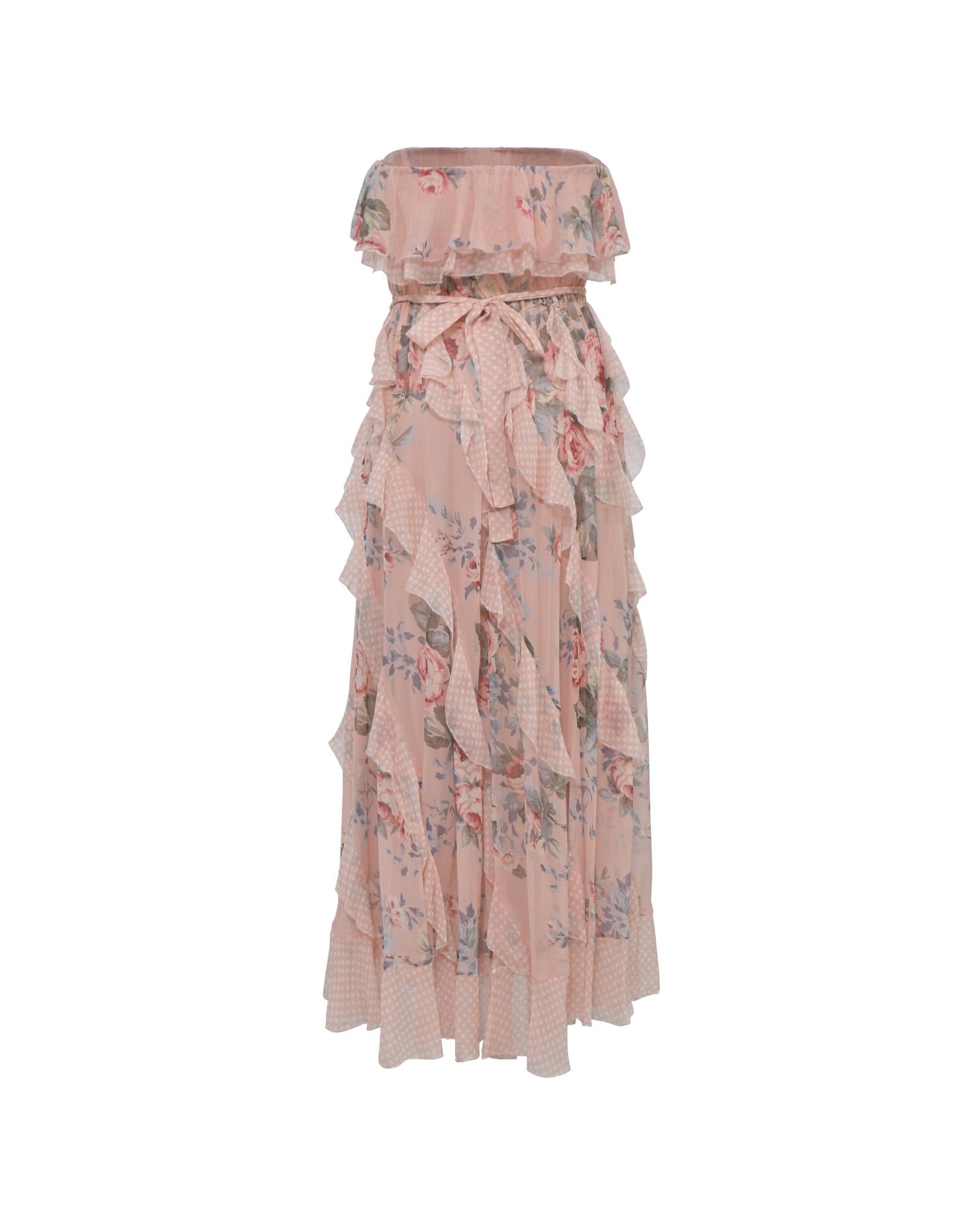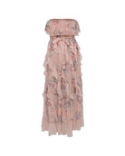 Floral Print Silk Strapless Ruffle Midi Dress with Cinched Waist