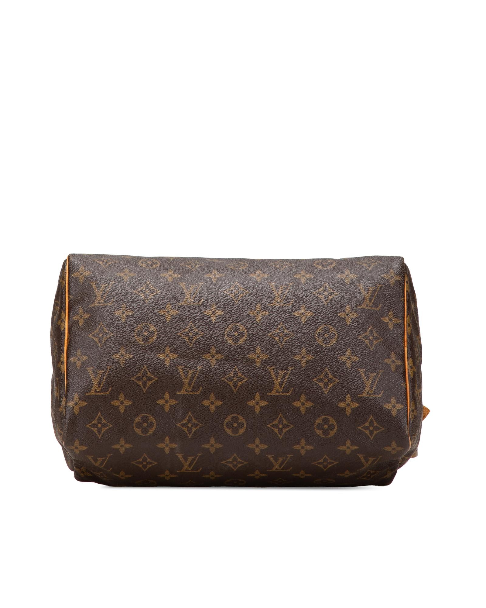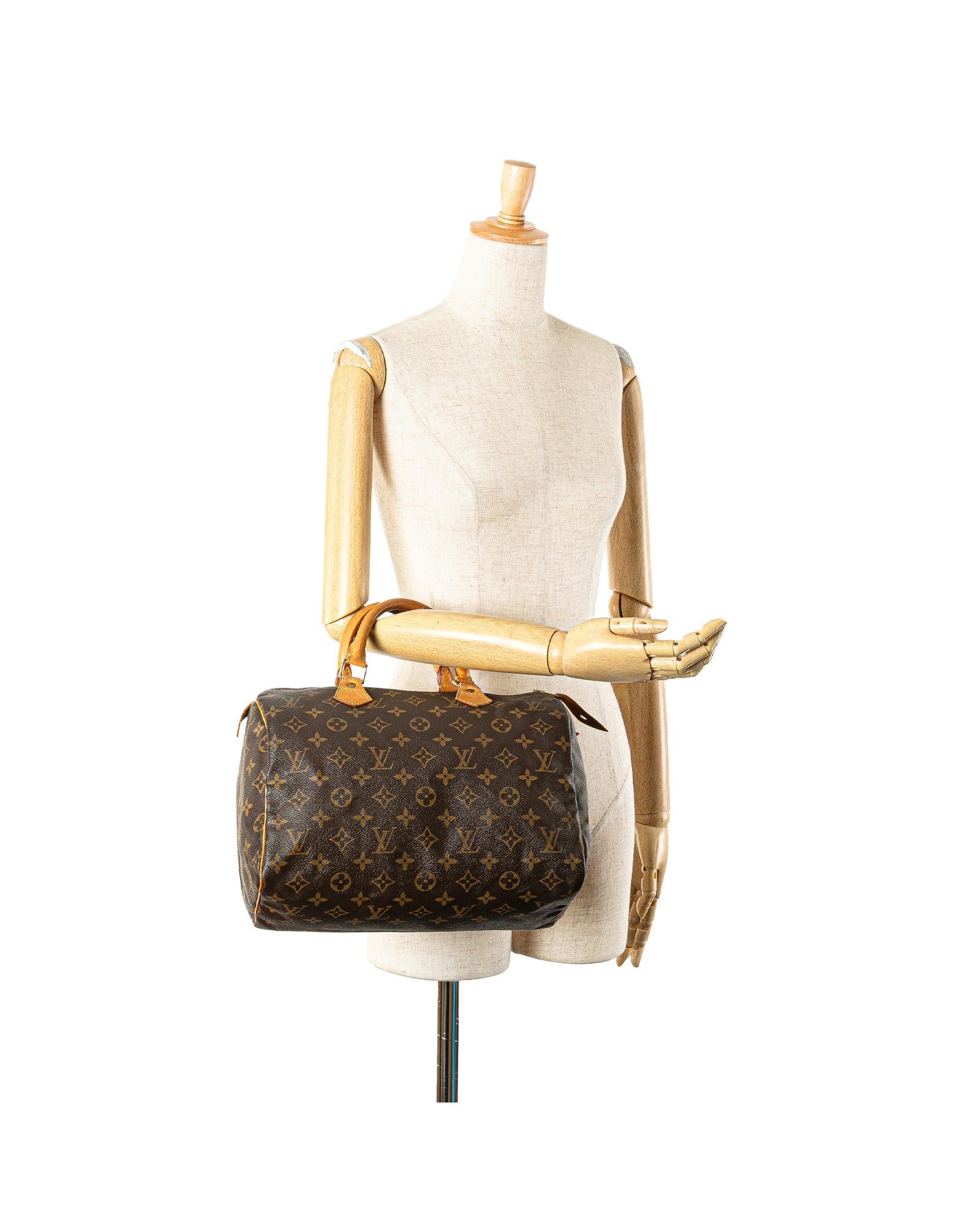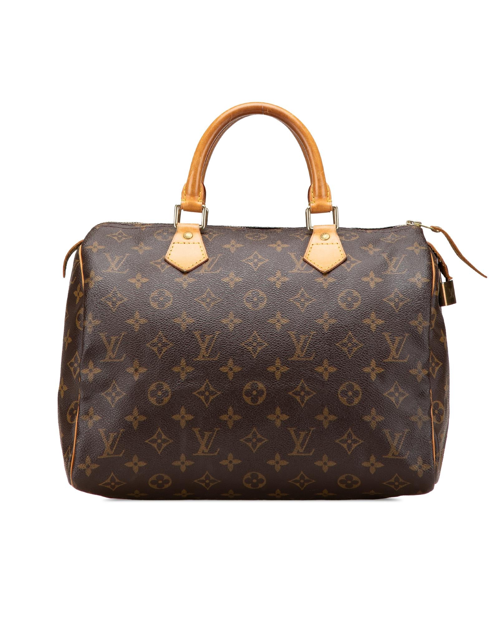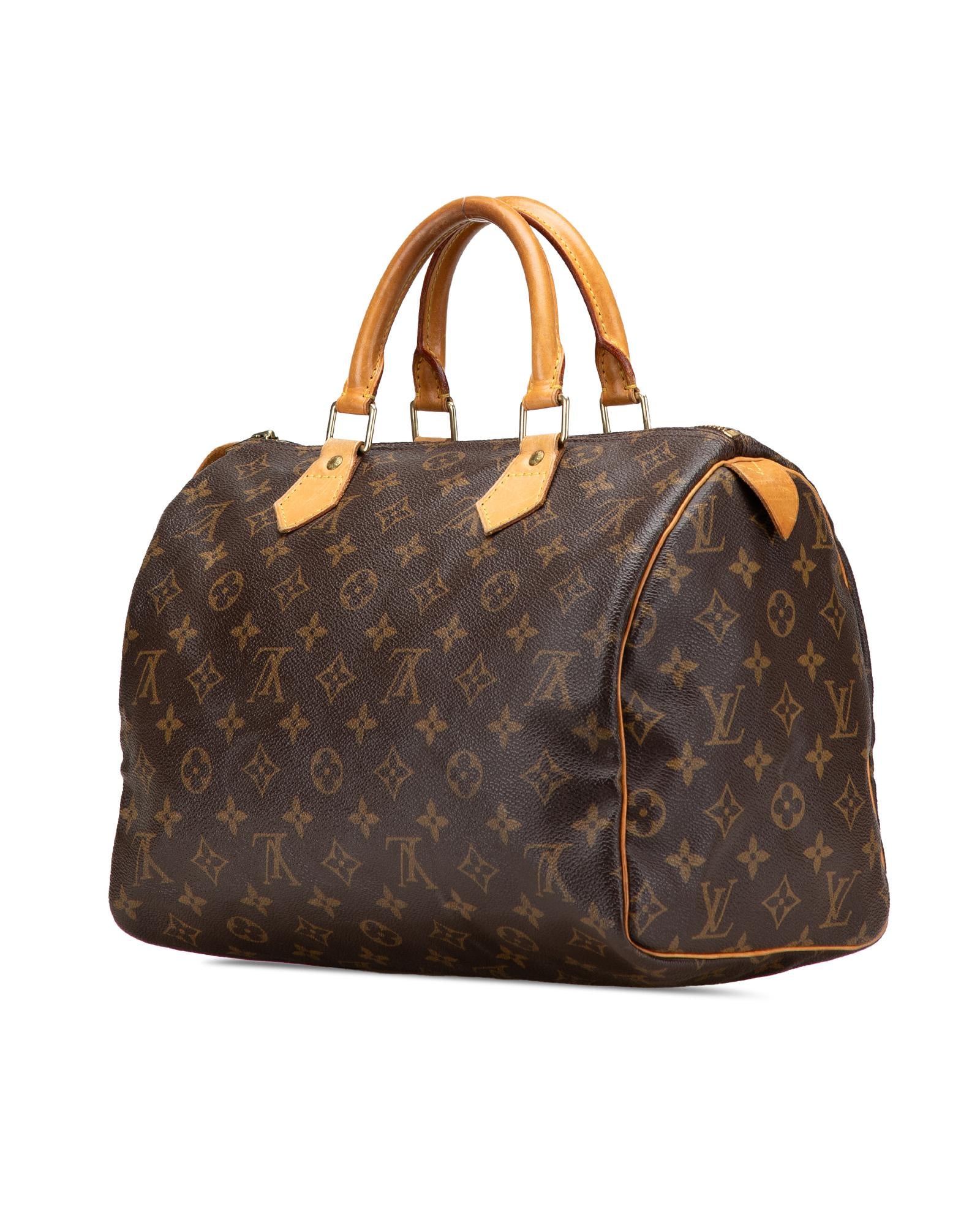 The Speedy 30 features a monogram canvas body rolled vachetta leather handles a top zip closure and an interior pocket.