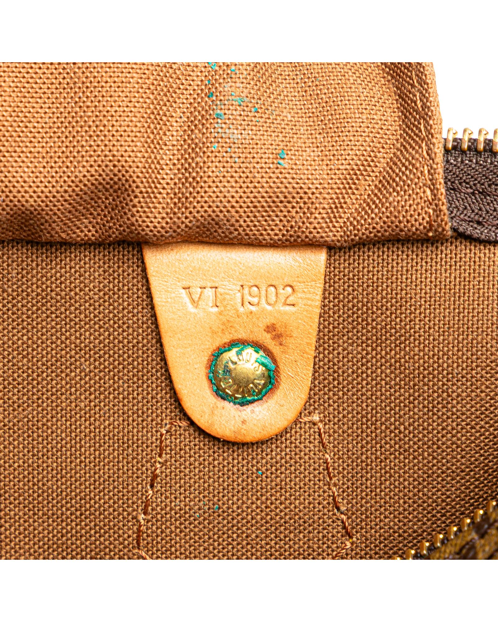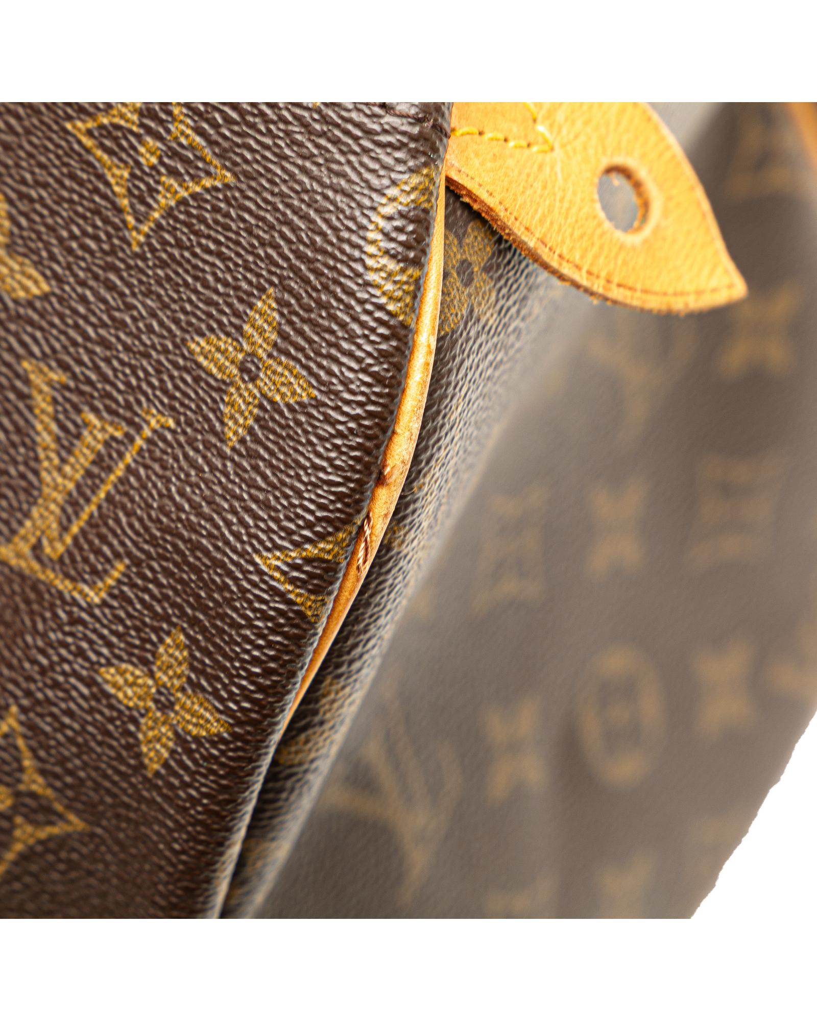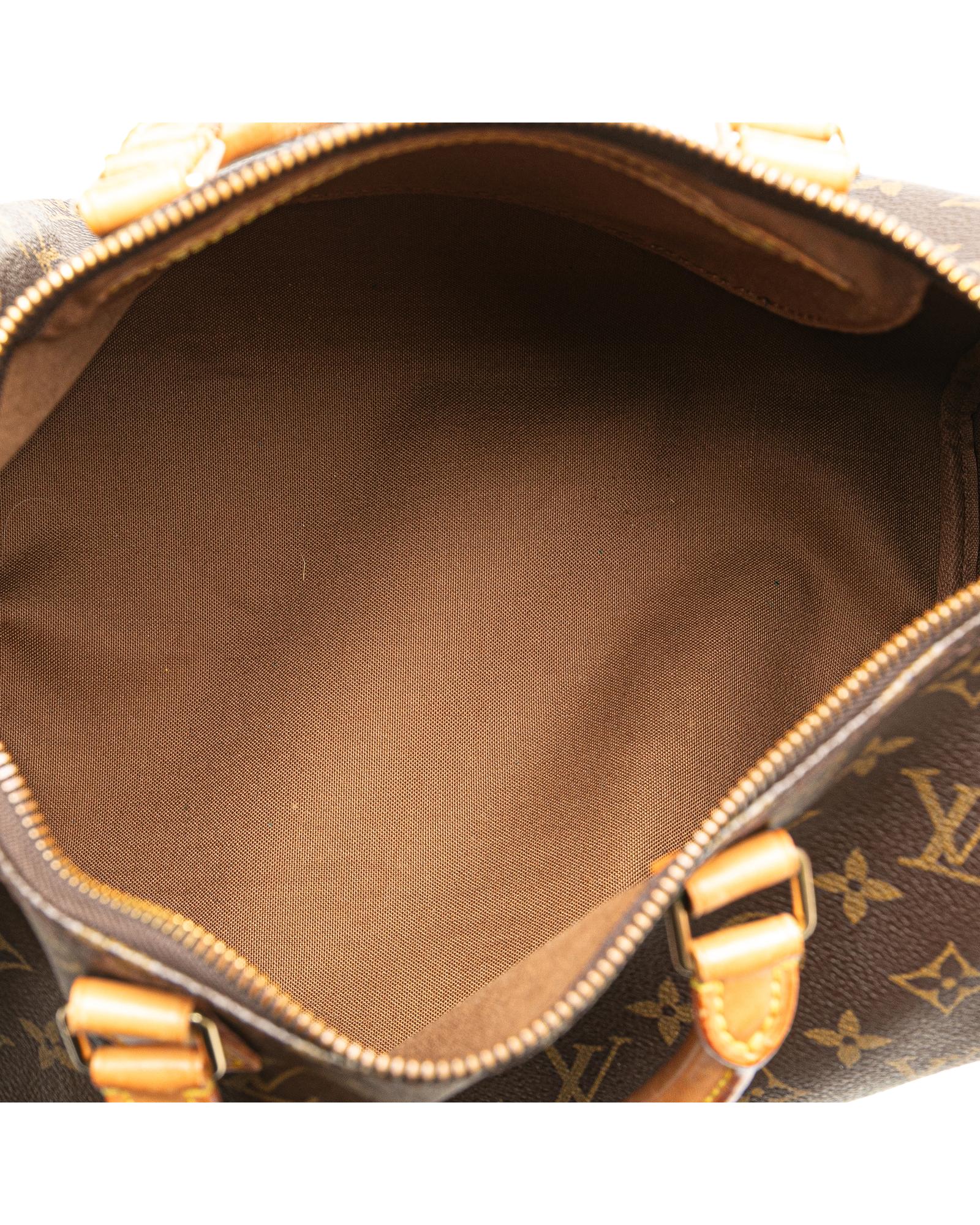 The Speedy 30 features a monogram canvas body rolled vachetta leather handles a top zip closure and an interior pocket.