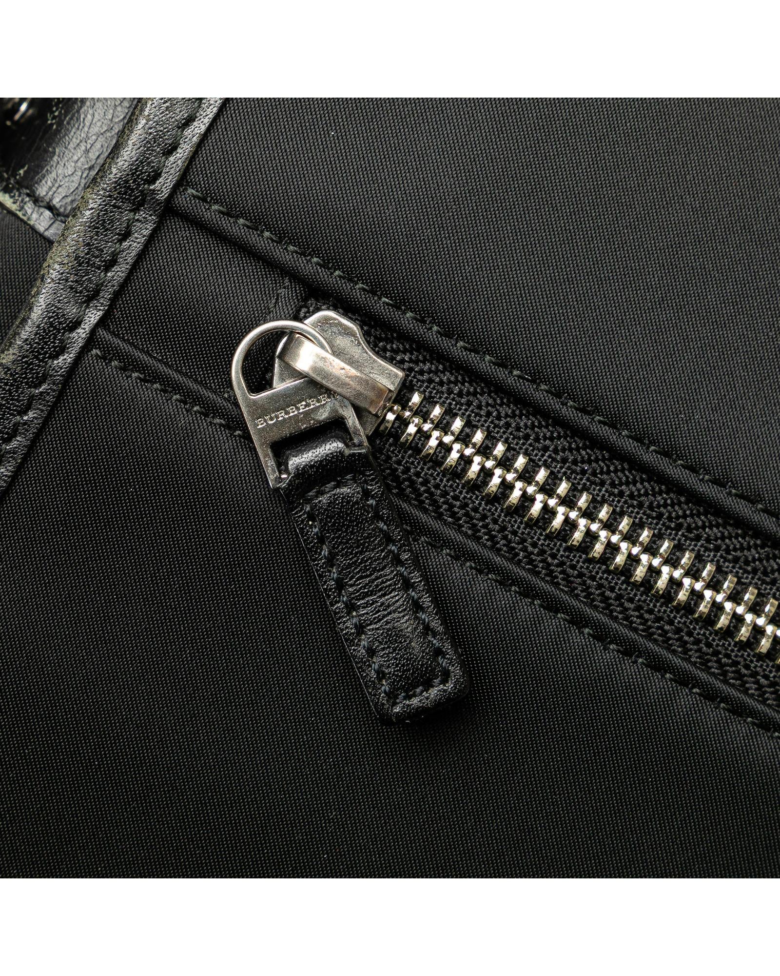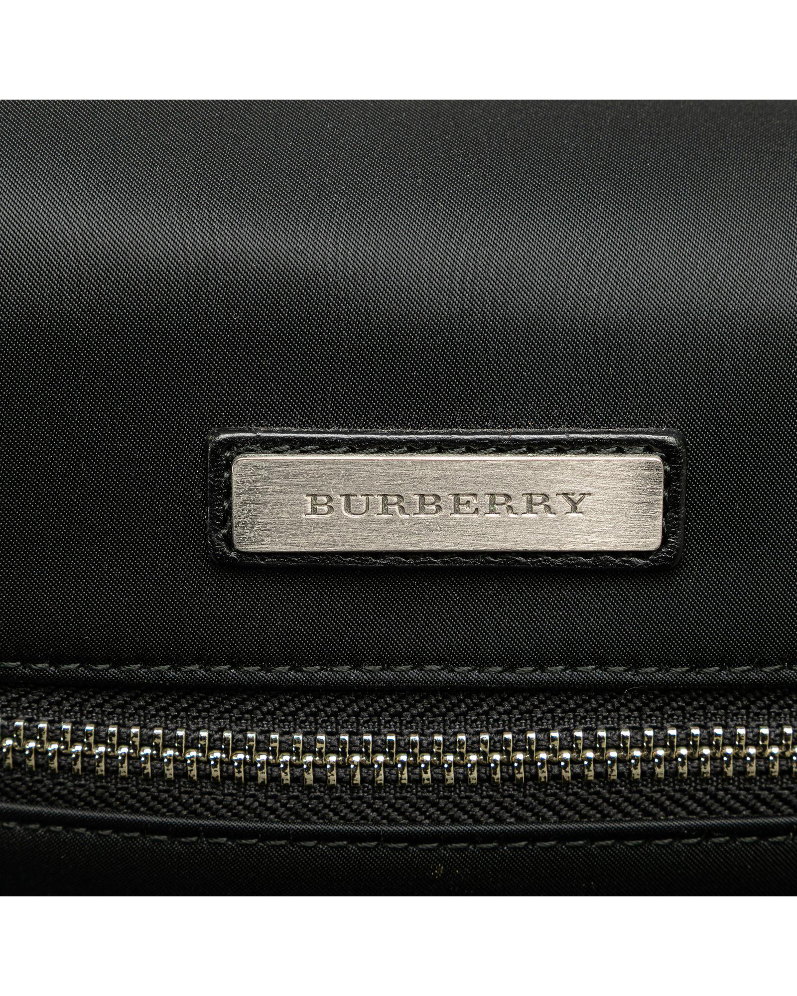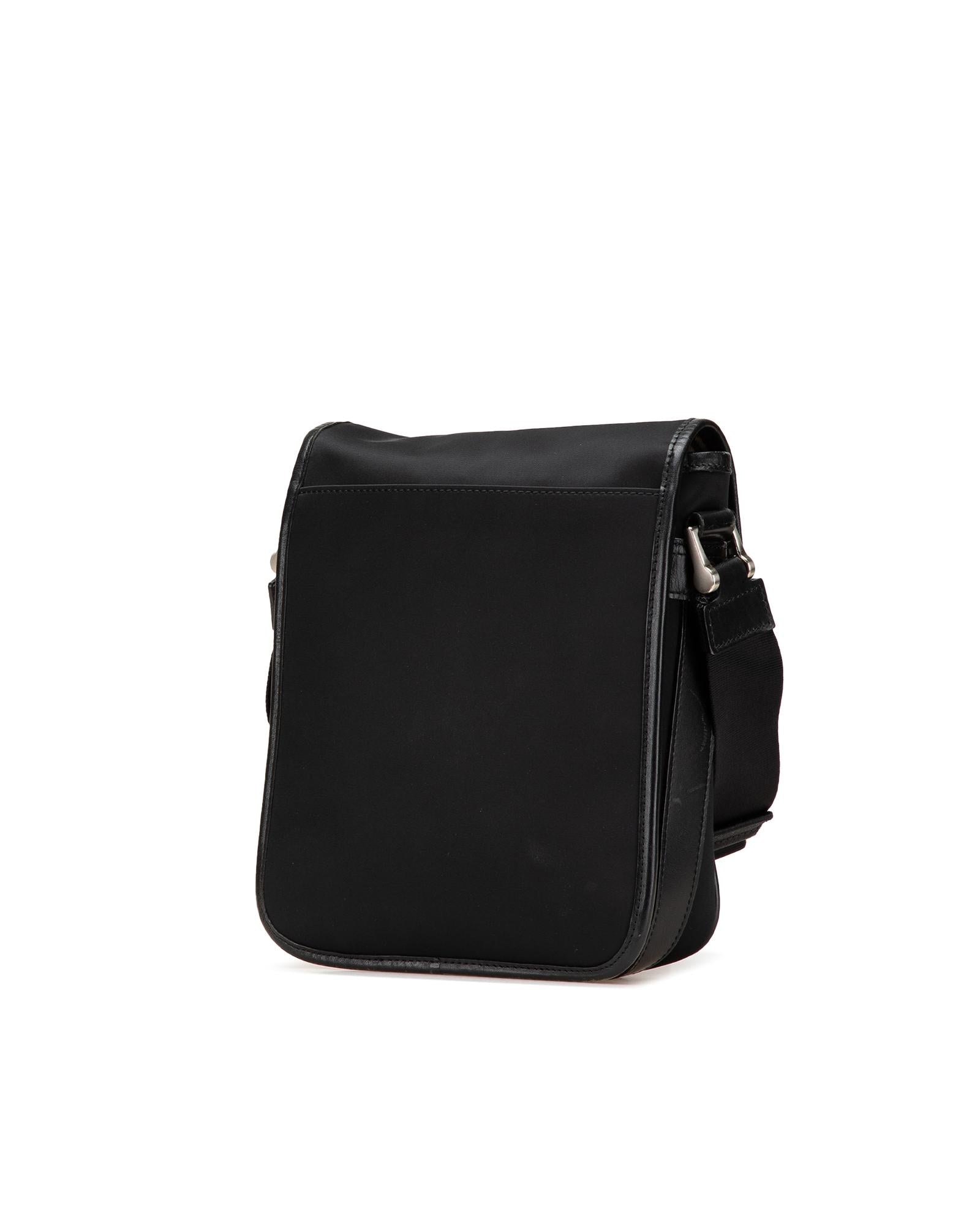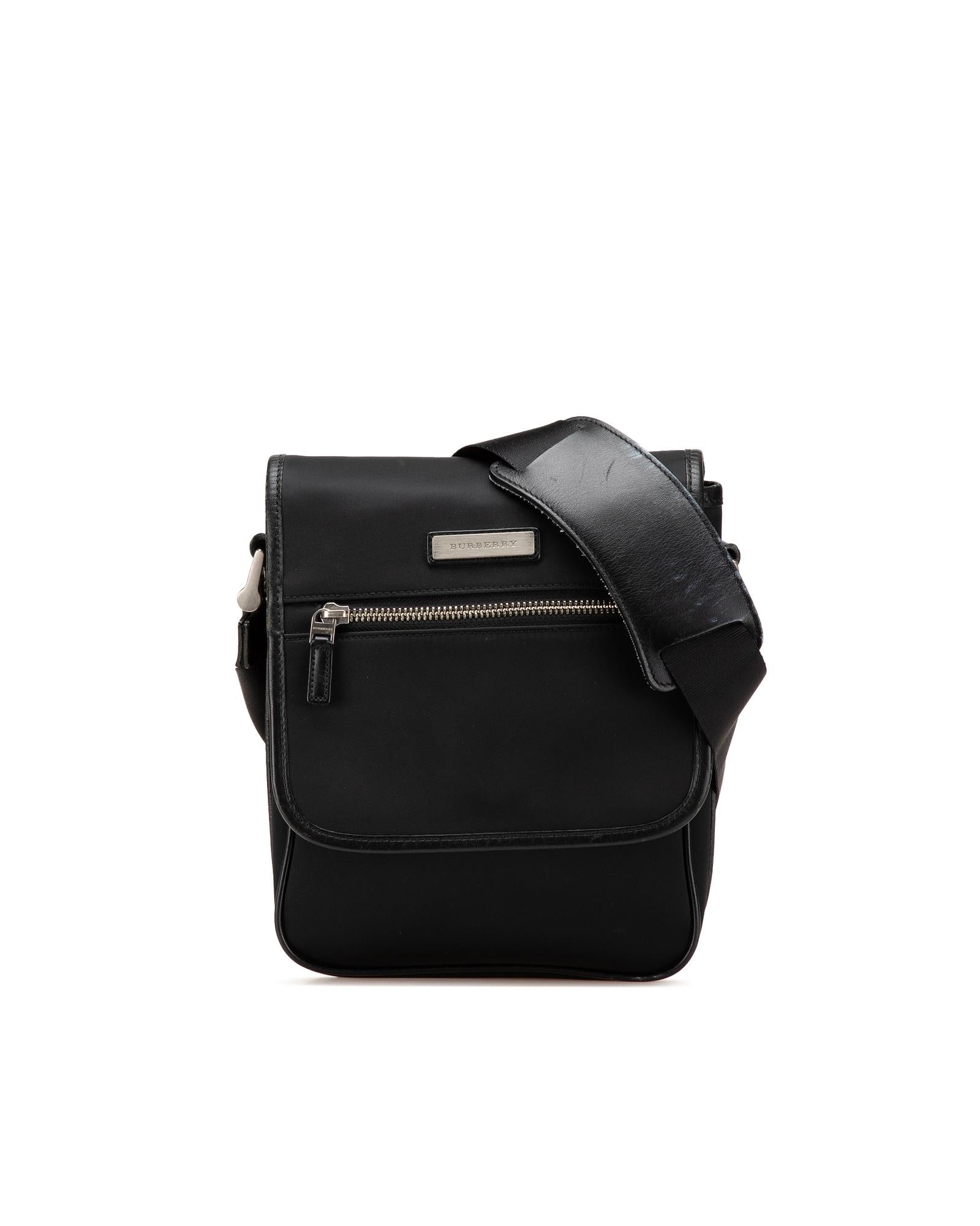 This crossbody bag features a nylon body with leather trim an adjustable flat canvas strap a front flap with magnetic snap closure exterior zip and slip pockets and an interior zip pocket.
