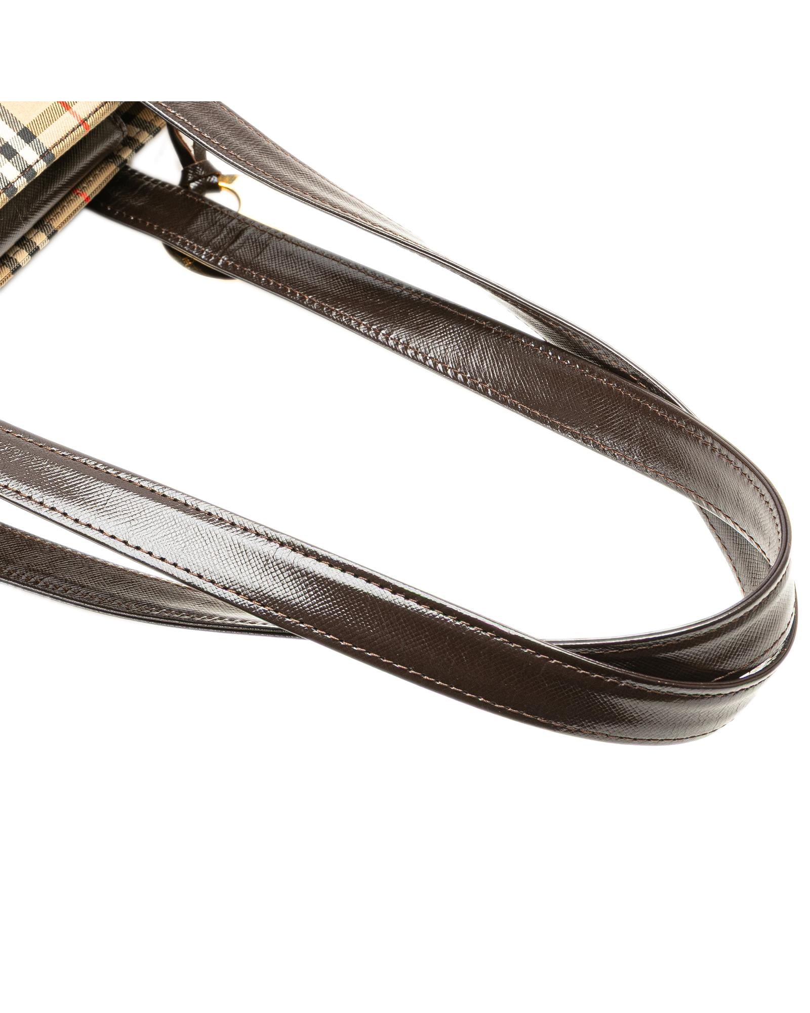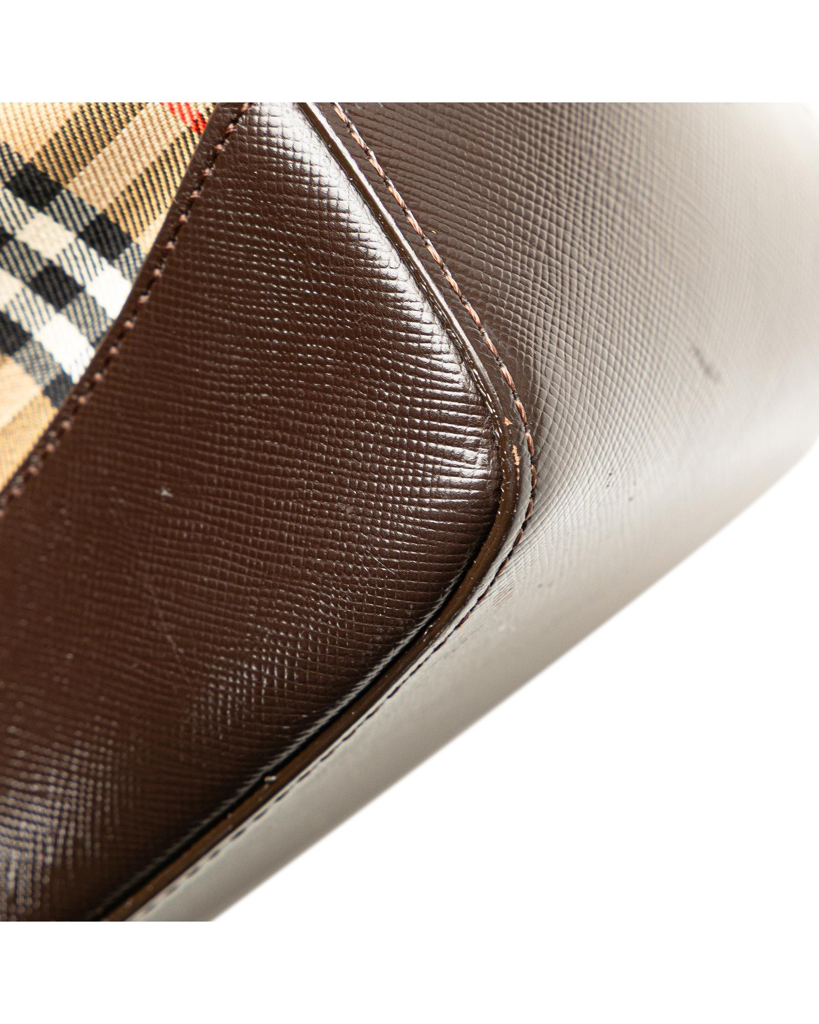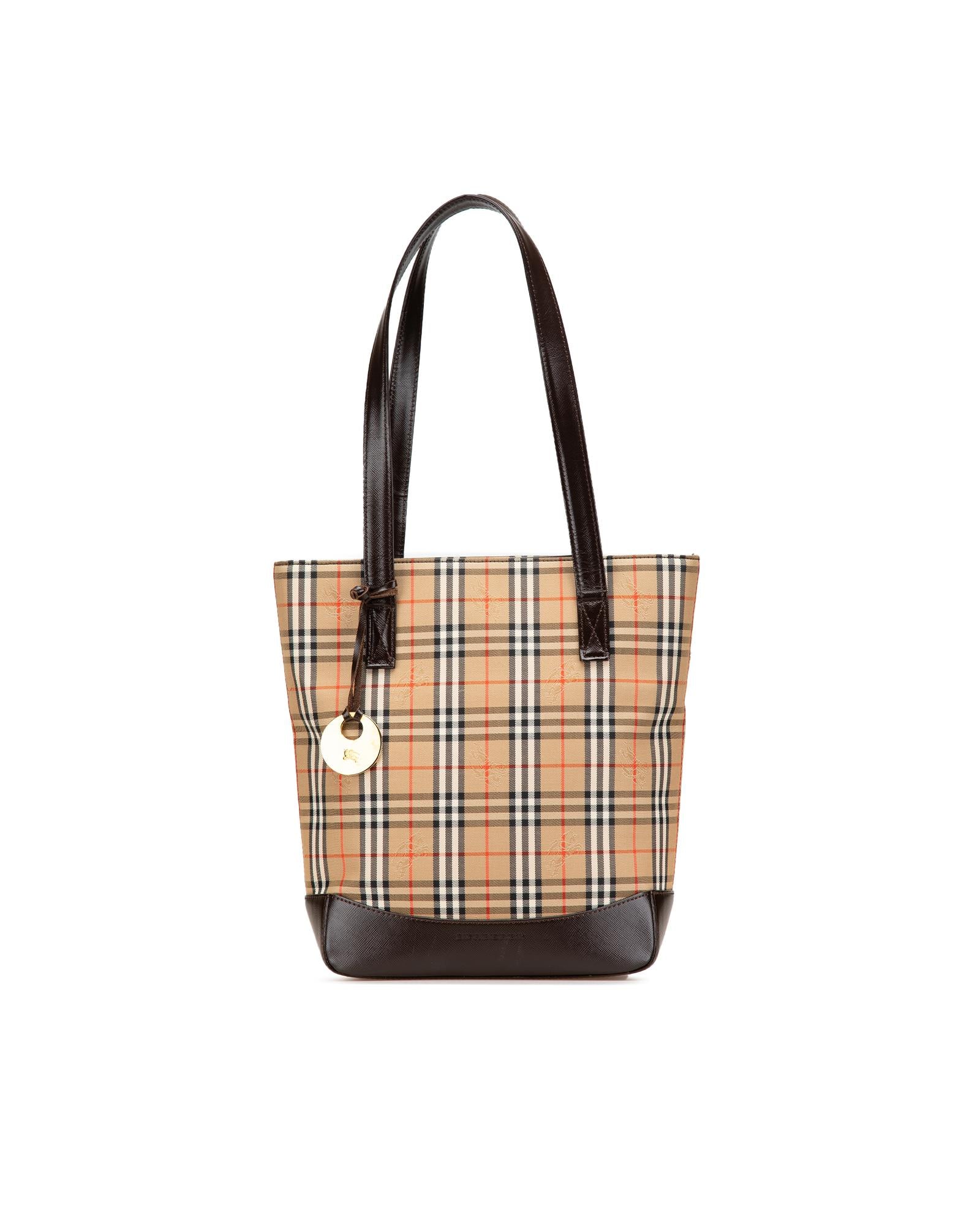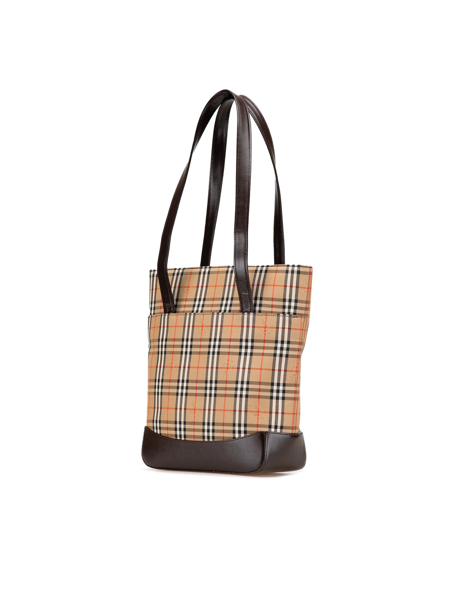 This tote bag features a haymarket check canvas body with leather bottom panel flat leather straps an open top an exterior slip compartment and interior zip and slip pockets.Brand: Burberry