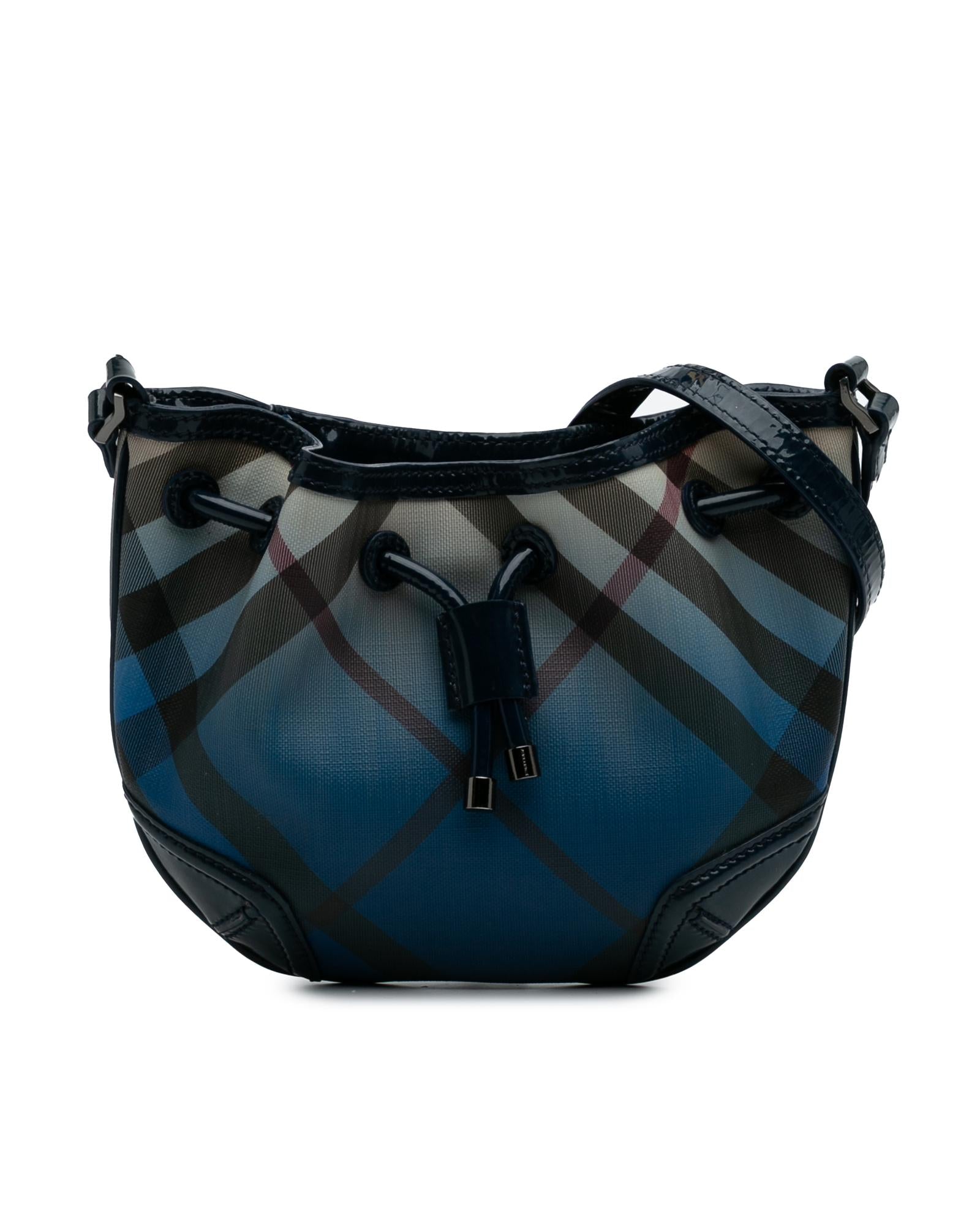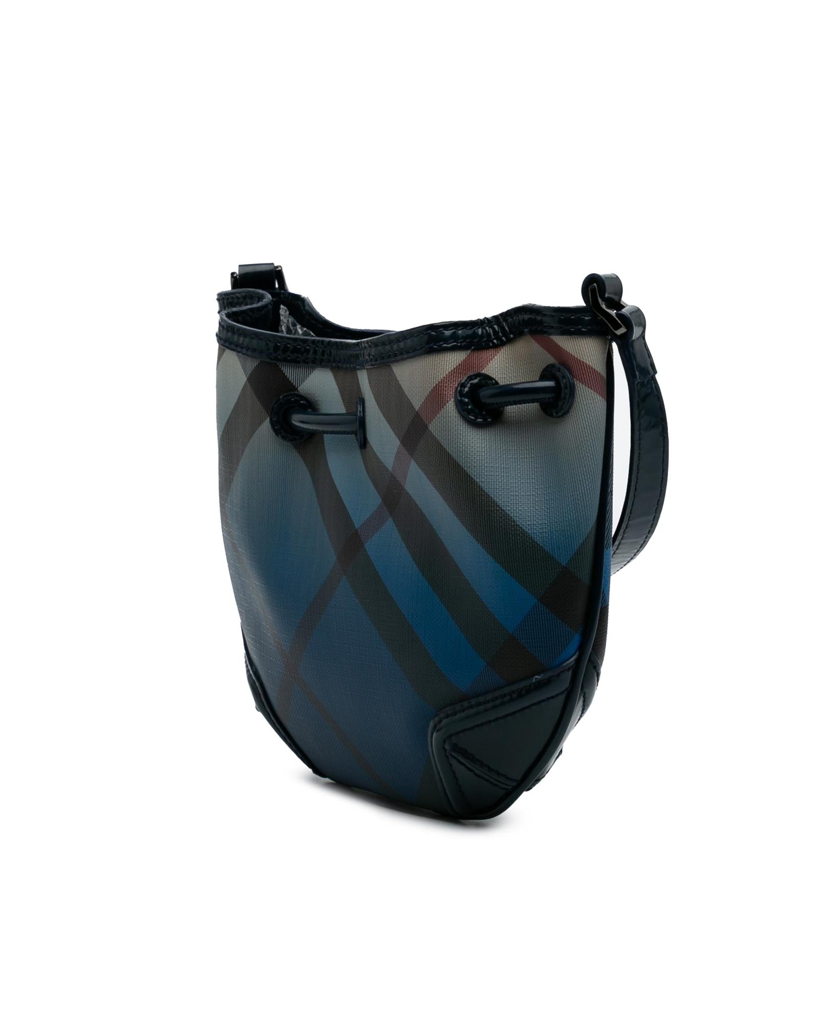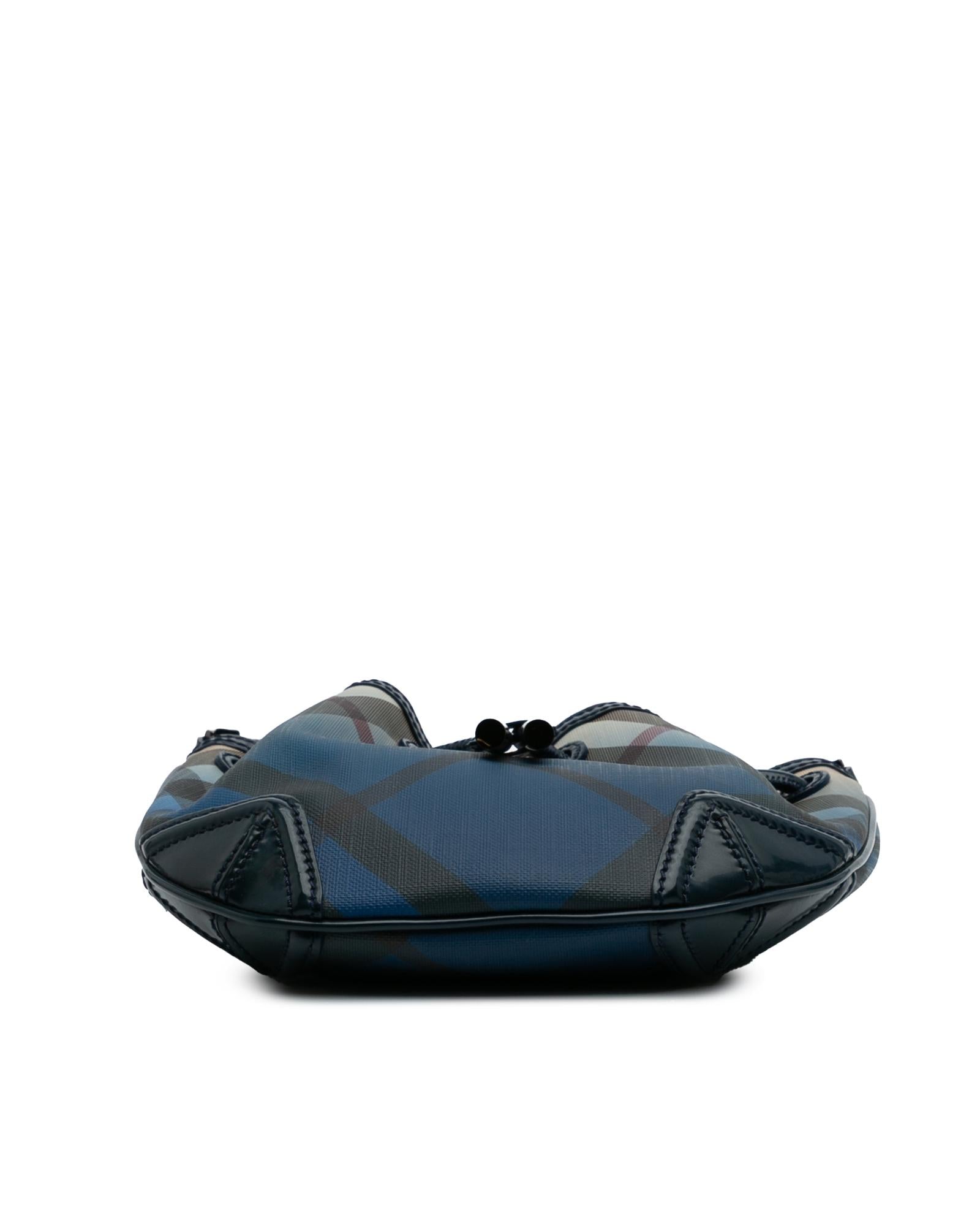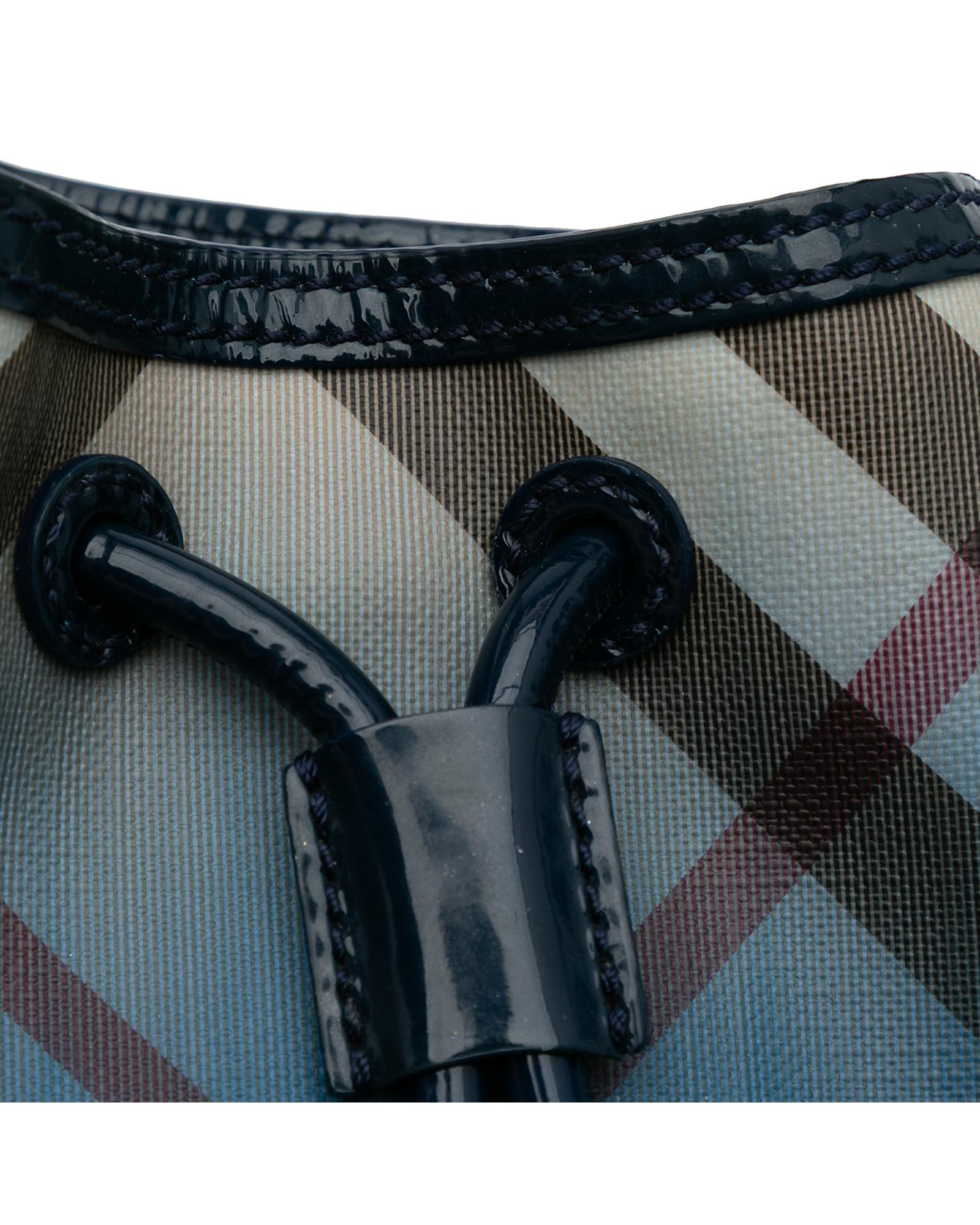 This crossbody bag features a coated canvas body with gradient color and patent leather trim an adjustable flat strap and an open top with a drawstring and magnetic snap closure.Brand: Burberry