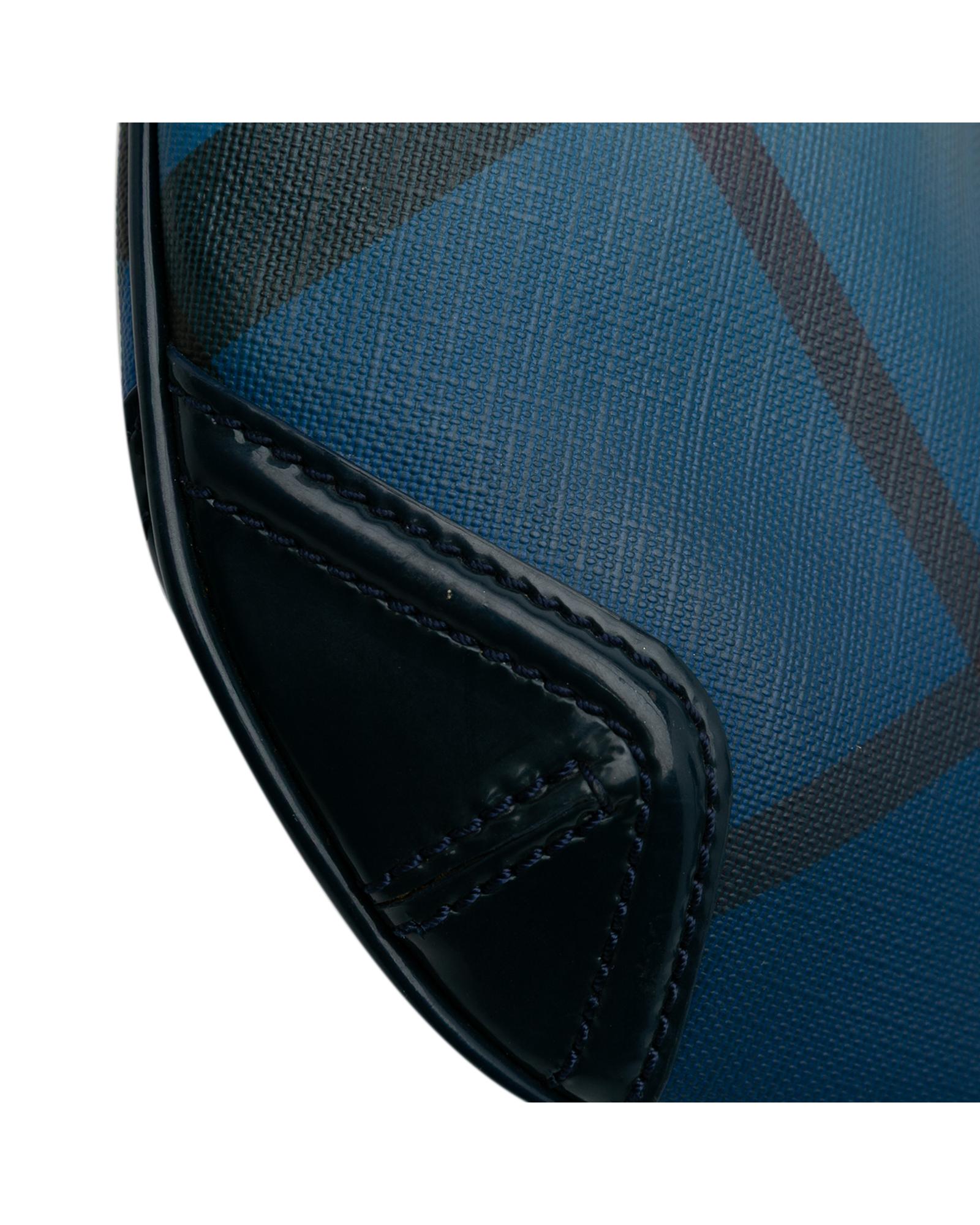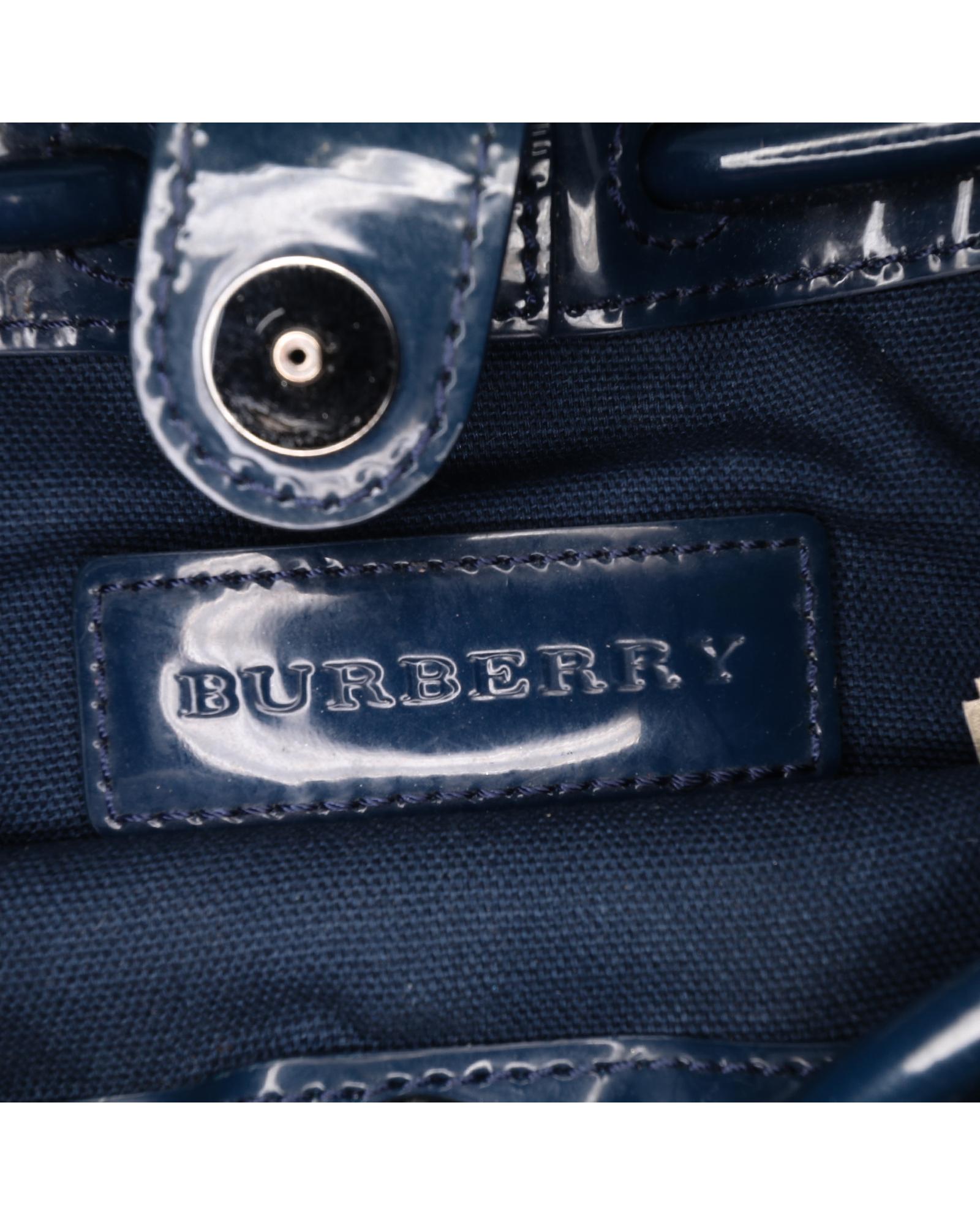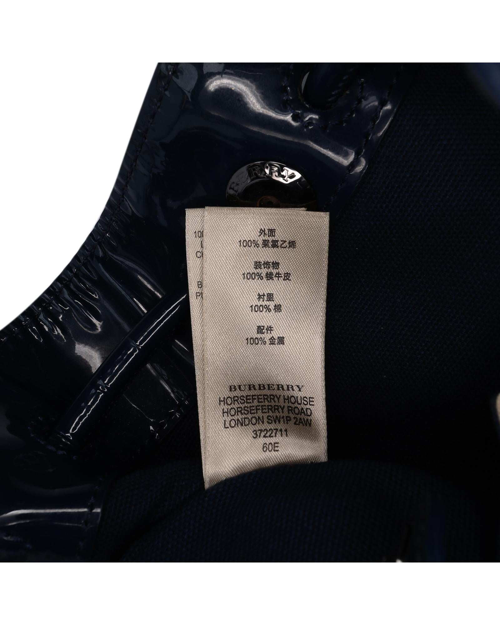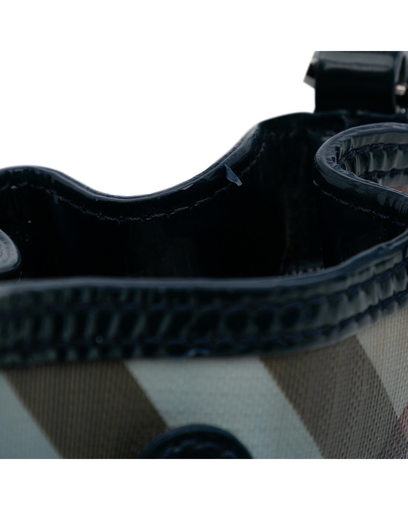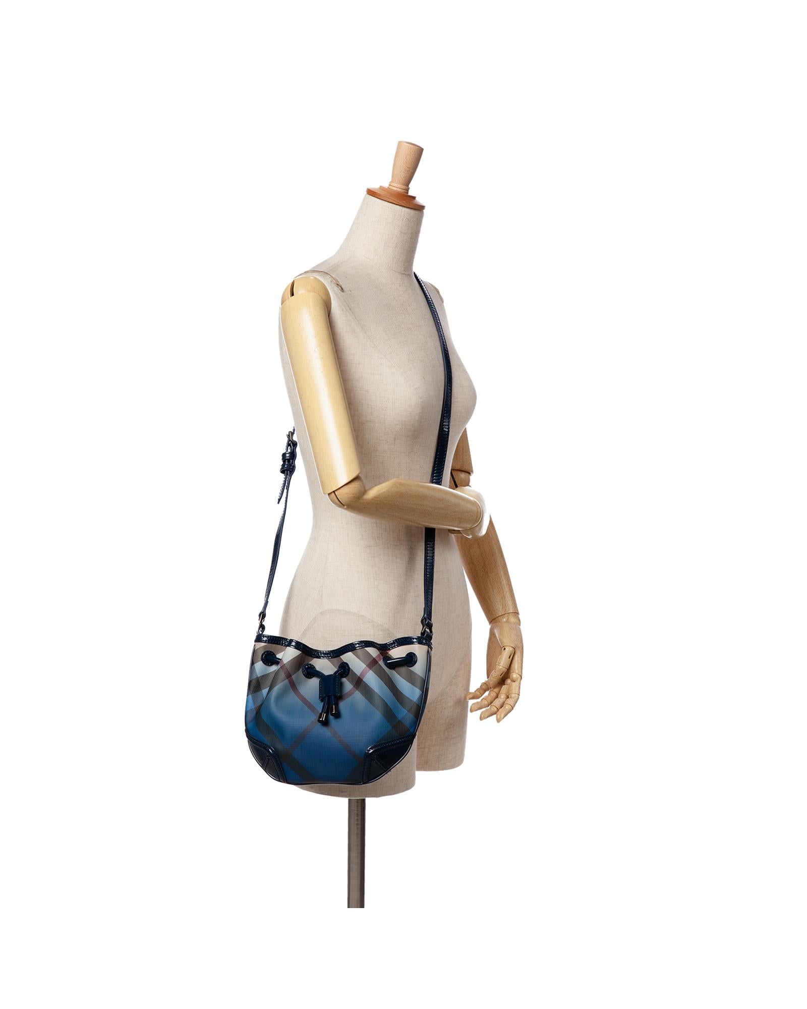 This crossbody bag features a coated canvas body with gradient color and patent leather trim an adjustable flat strap and an open top with a drawstring and magnetic snap closure.Brand: Burberry