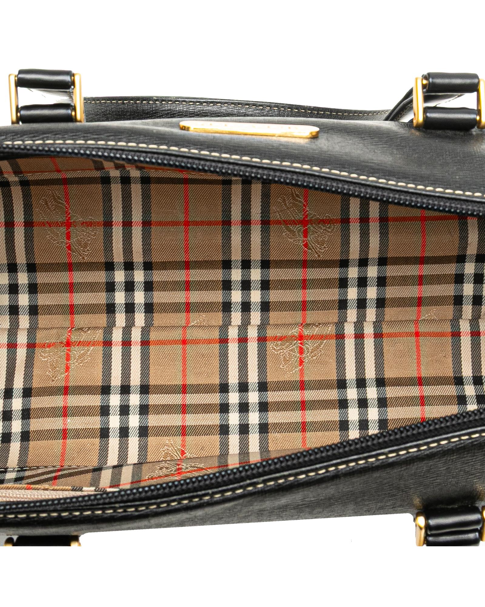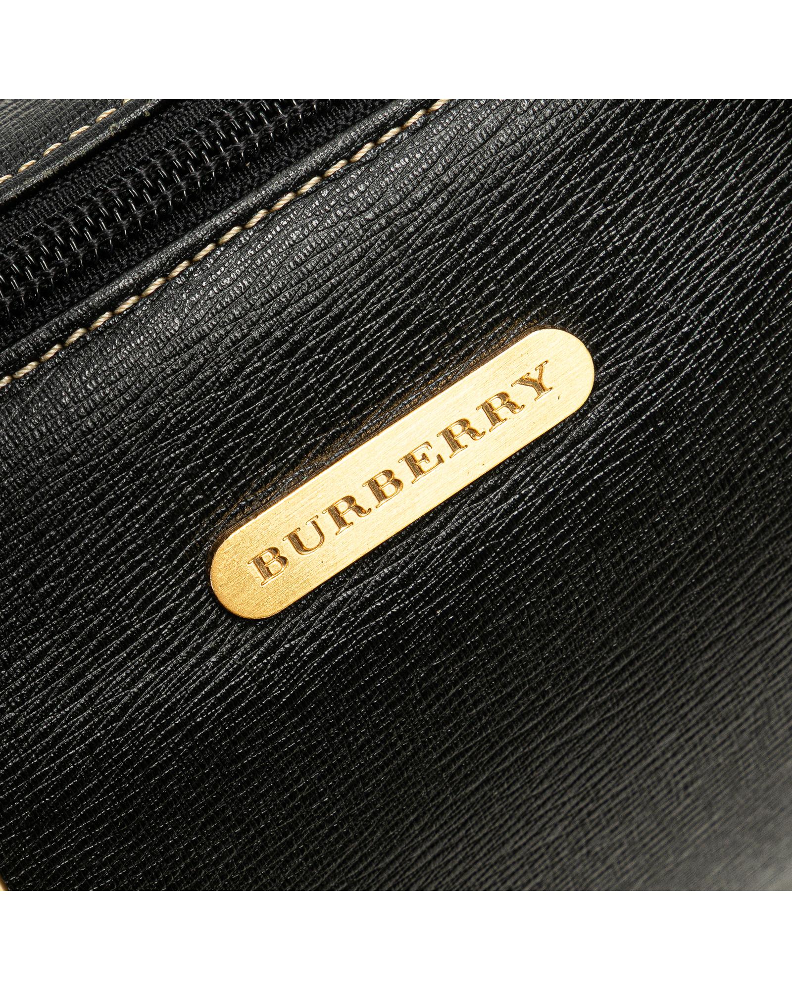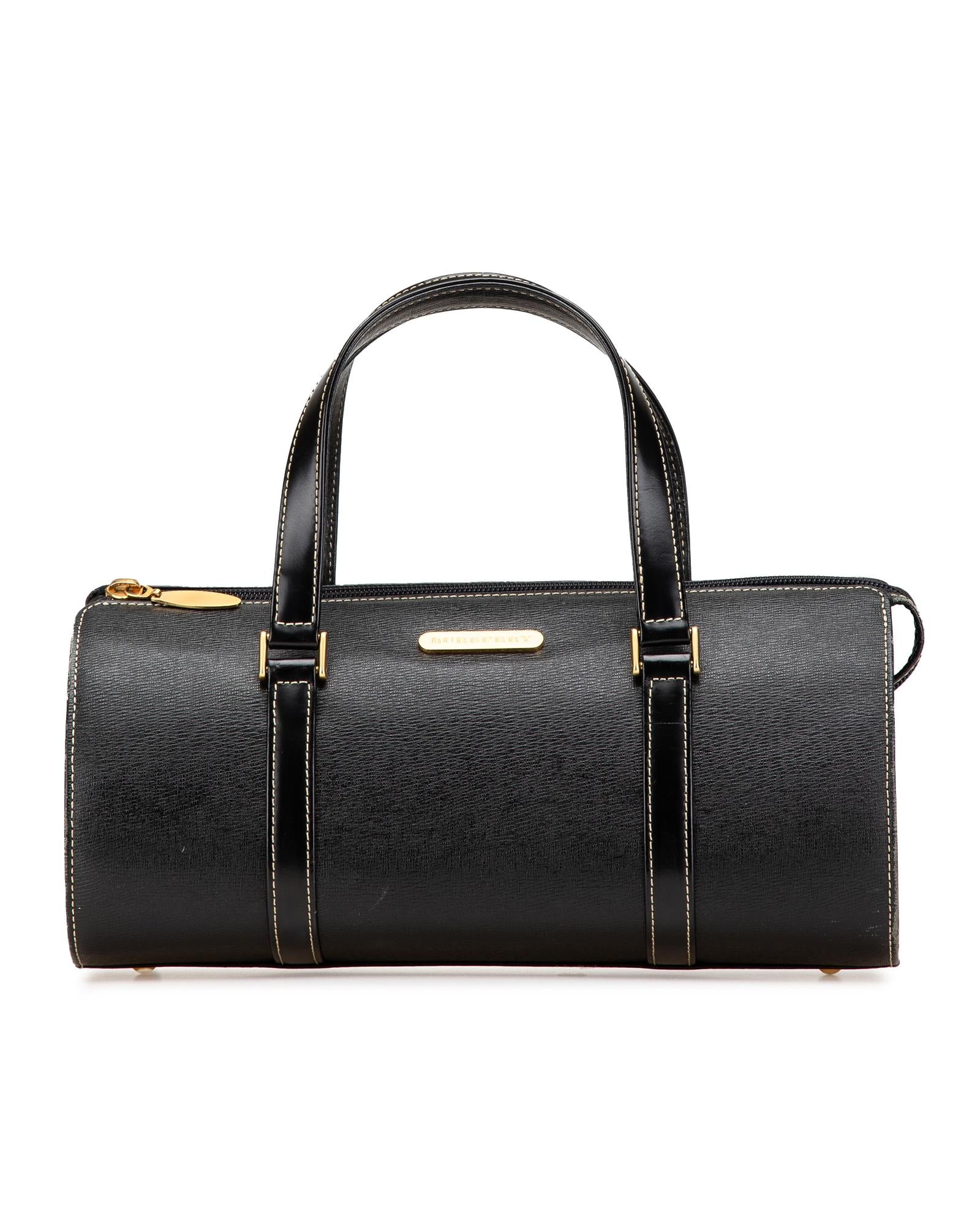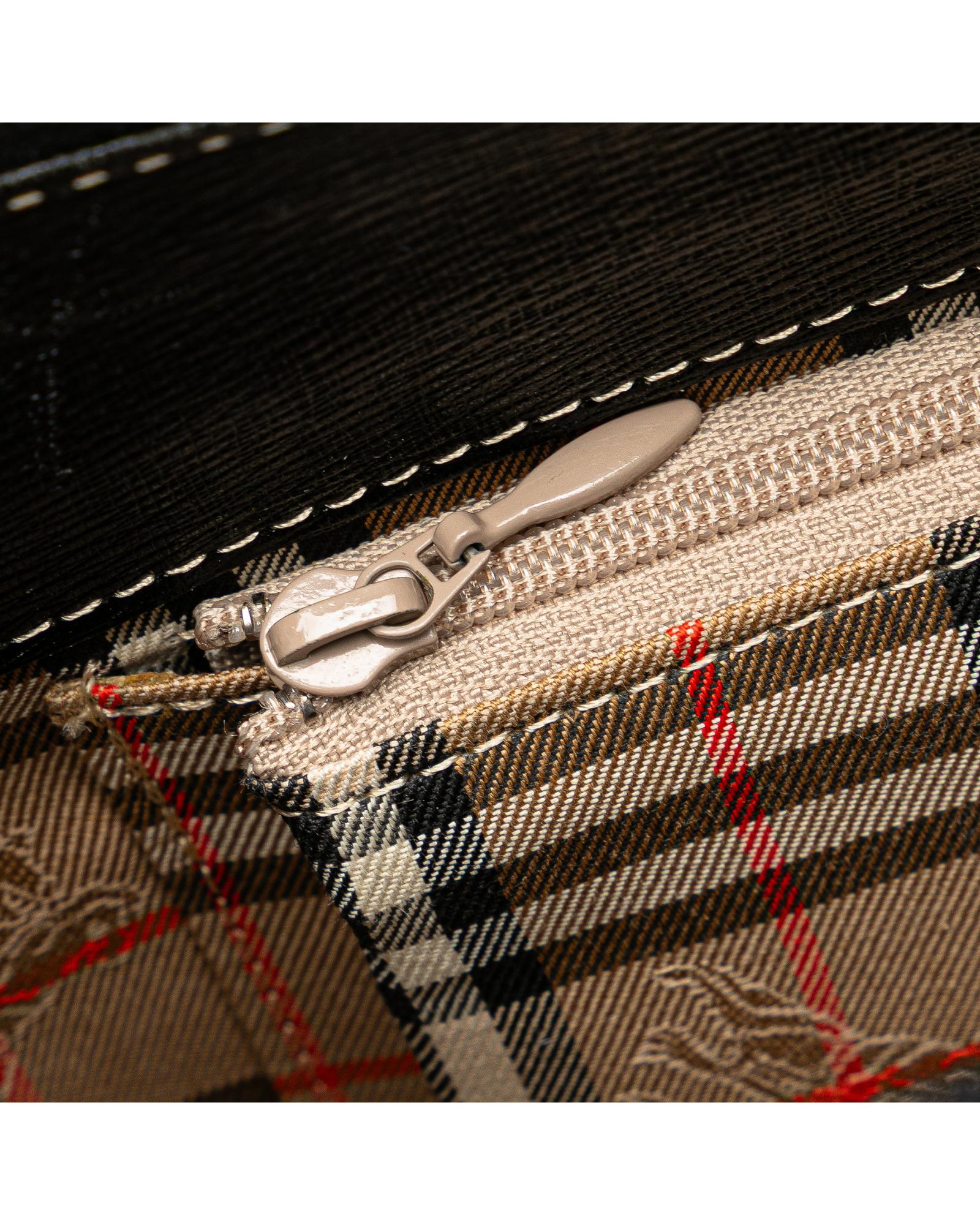This handbag features a leather body flat leather handles a top zip closure and an interior zip pocket.Brand: Burberry