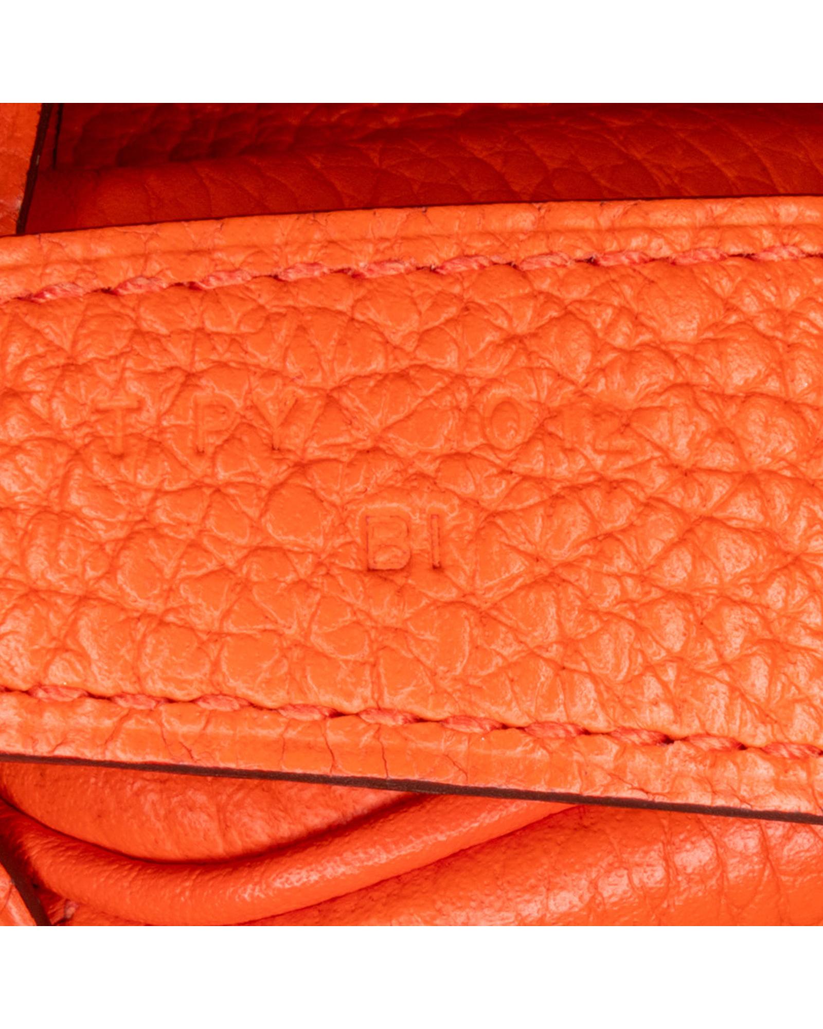 The Lindy features a Clemence leather body in Capucine color rolled leather handles a flat leather strap and double top zip closures with a top flap and metal turnlock closure.