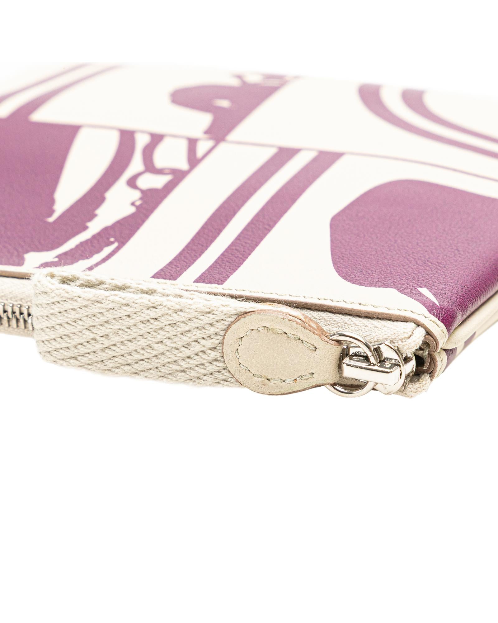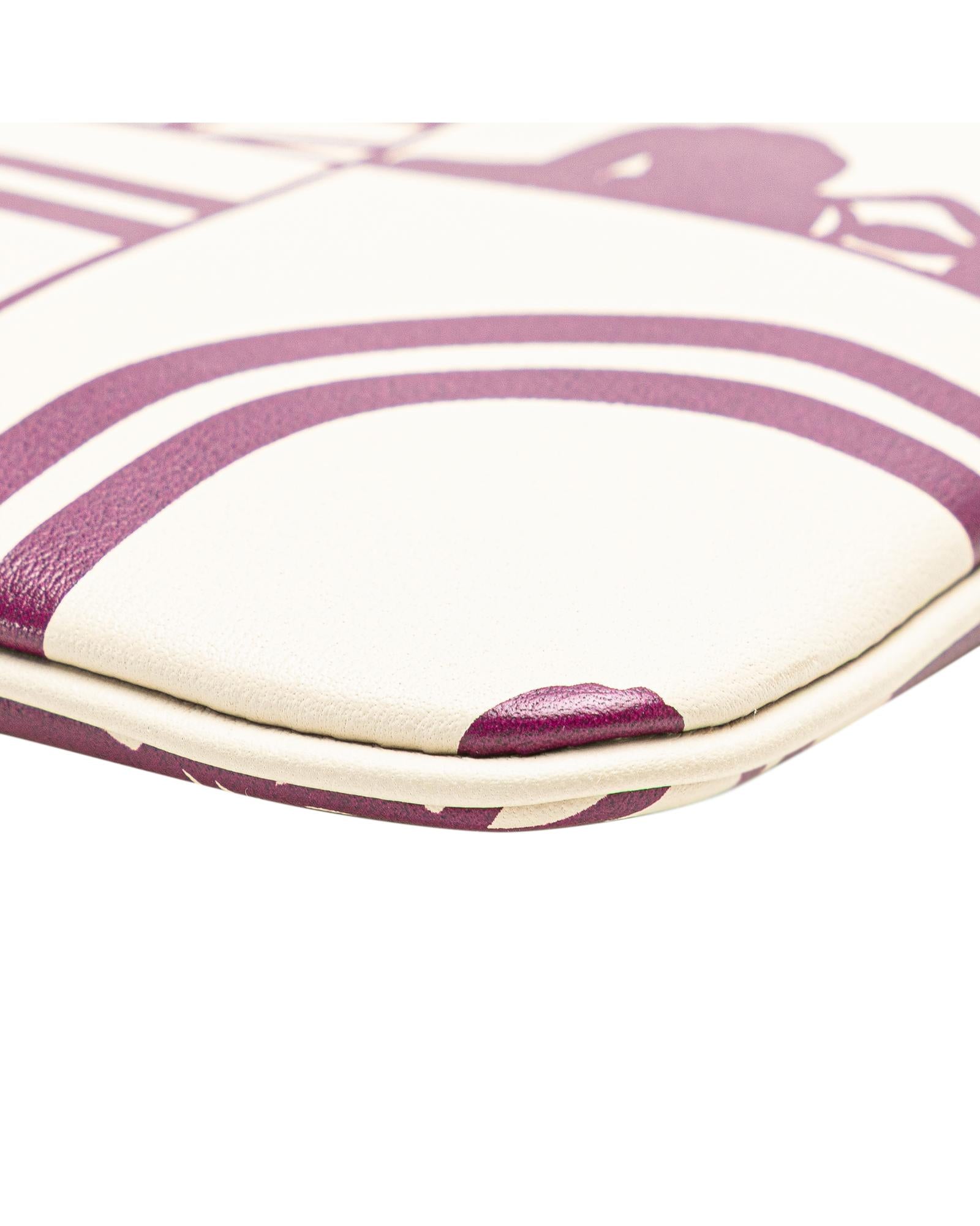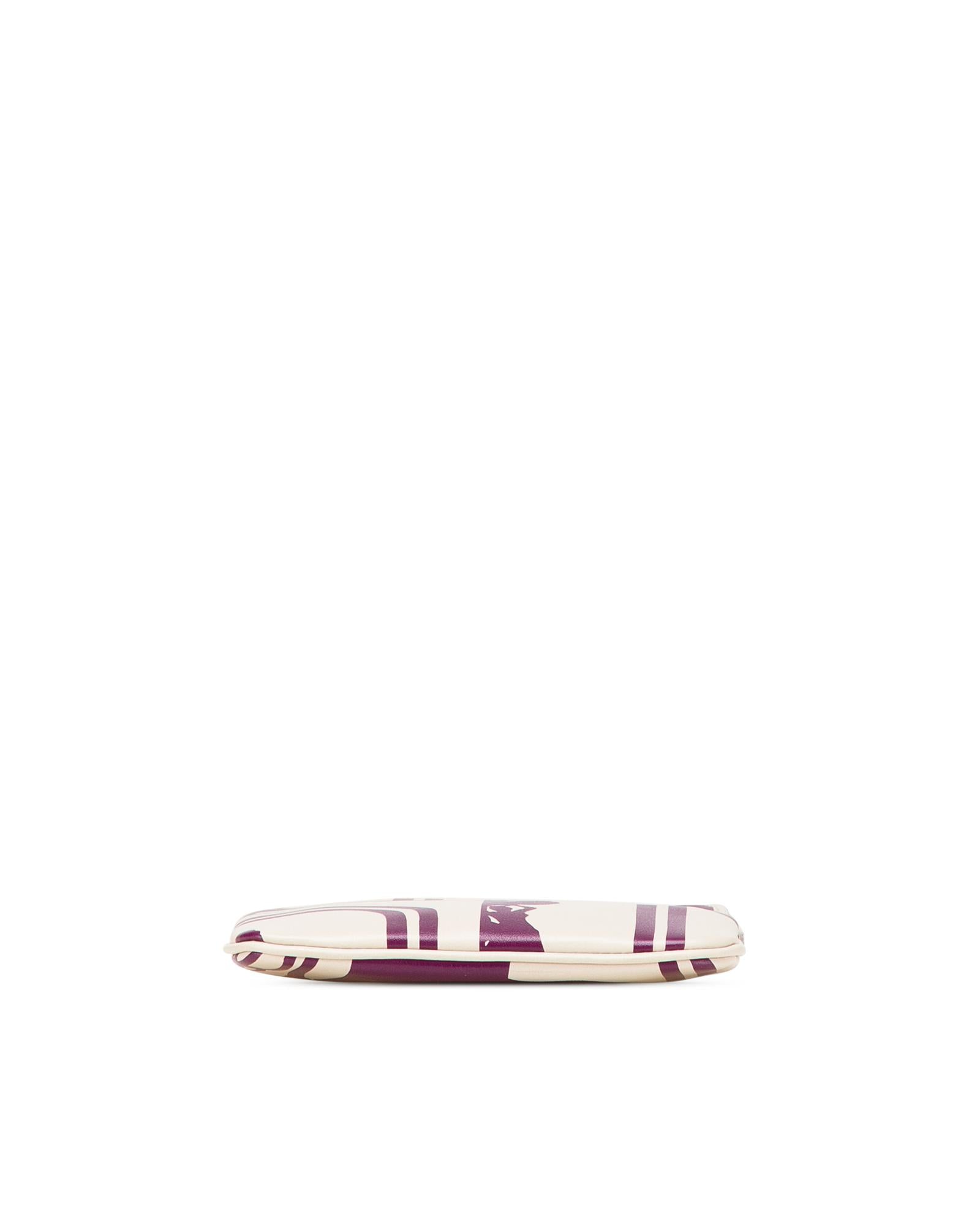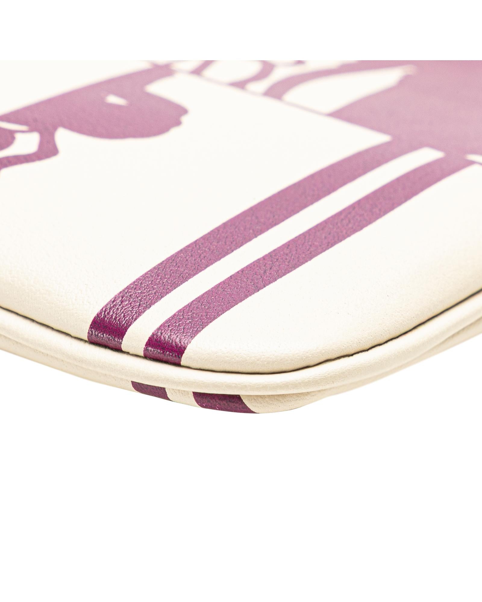 This Pouch features a printed leather body a top zip closure and an interior slip pocket.