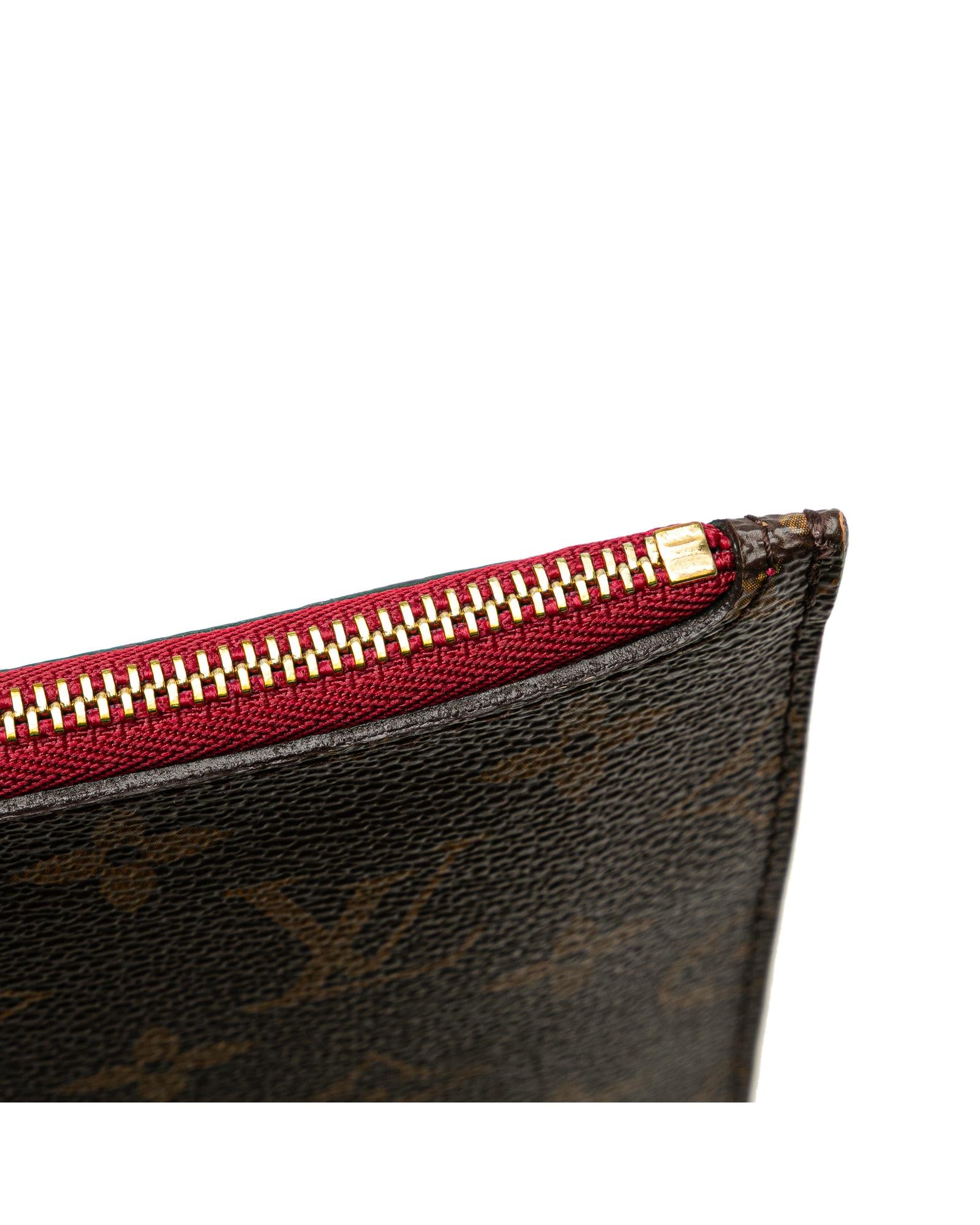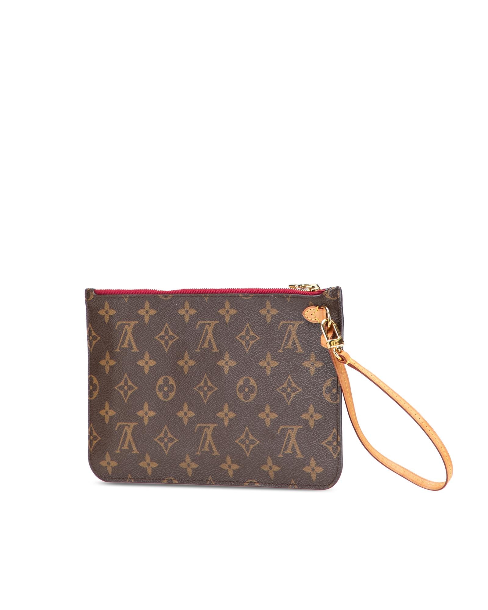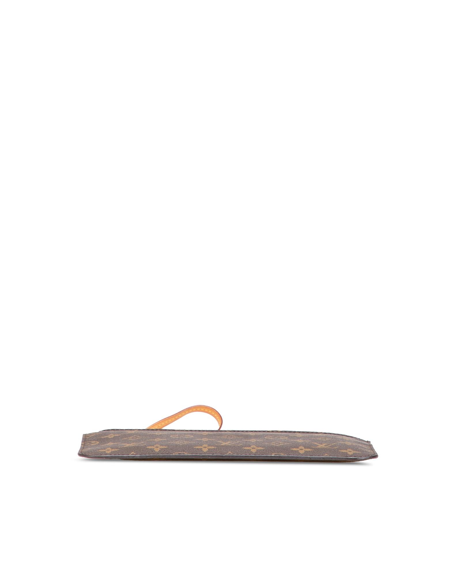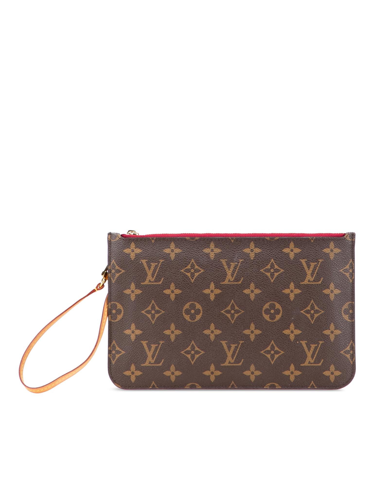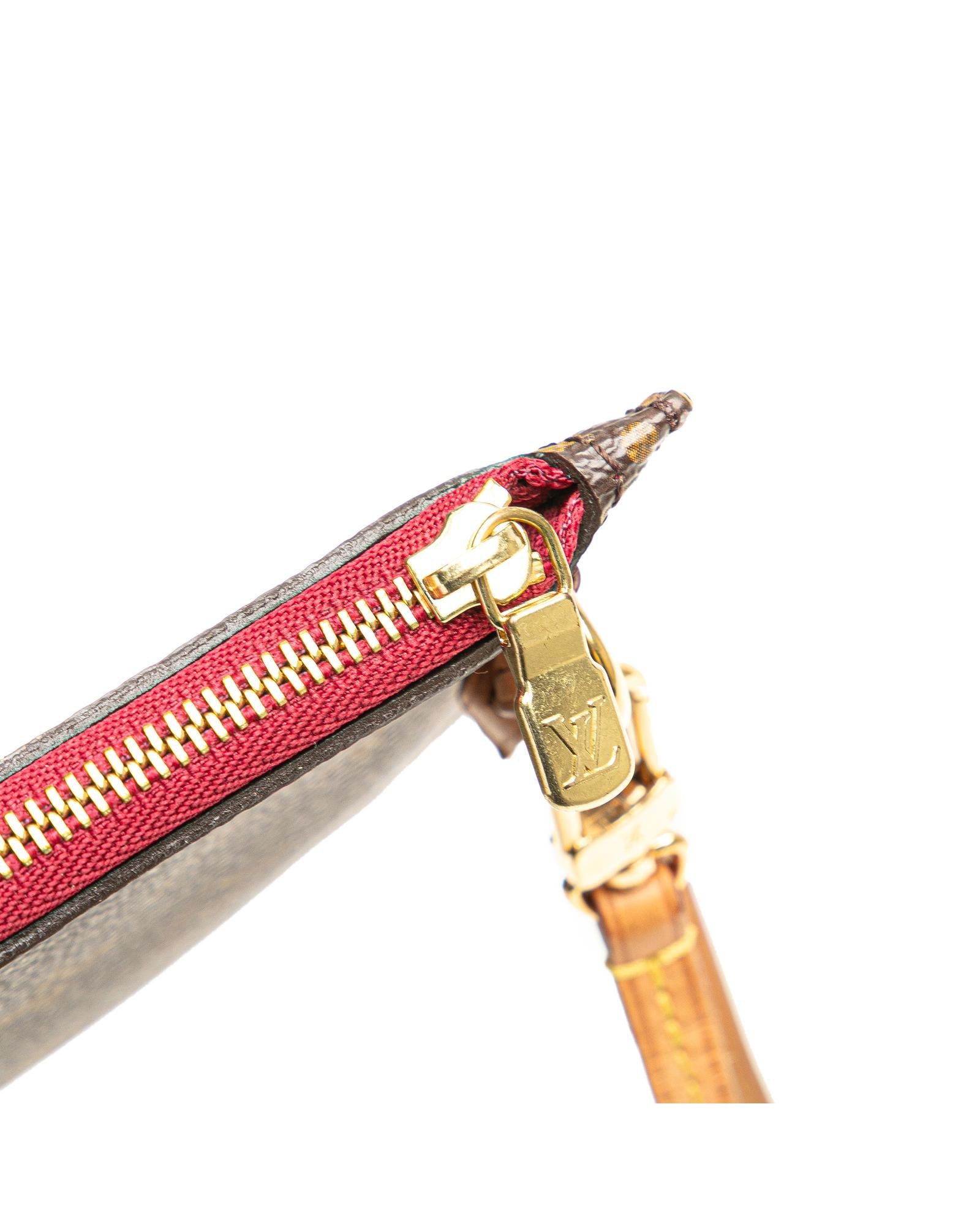 This pouch features a monogram canvas body a flat vachetta leather wrist strap a top zip closure and an interior slip pocket.Brand: Louis Vuitton Vintage