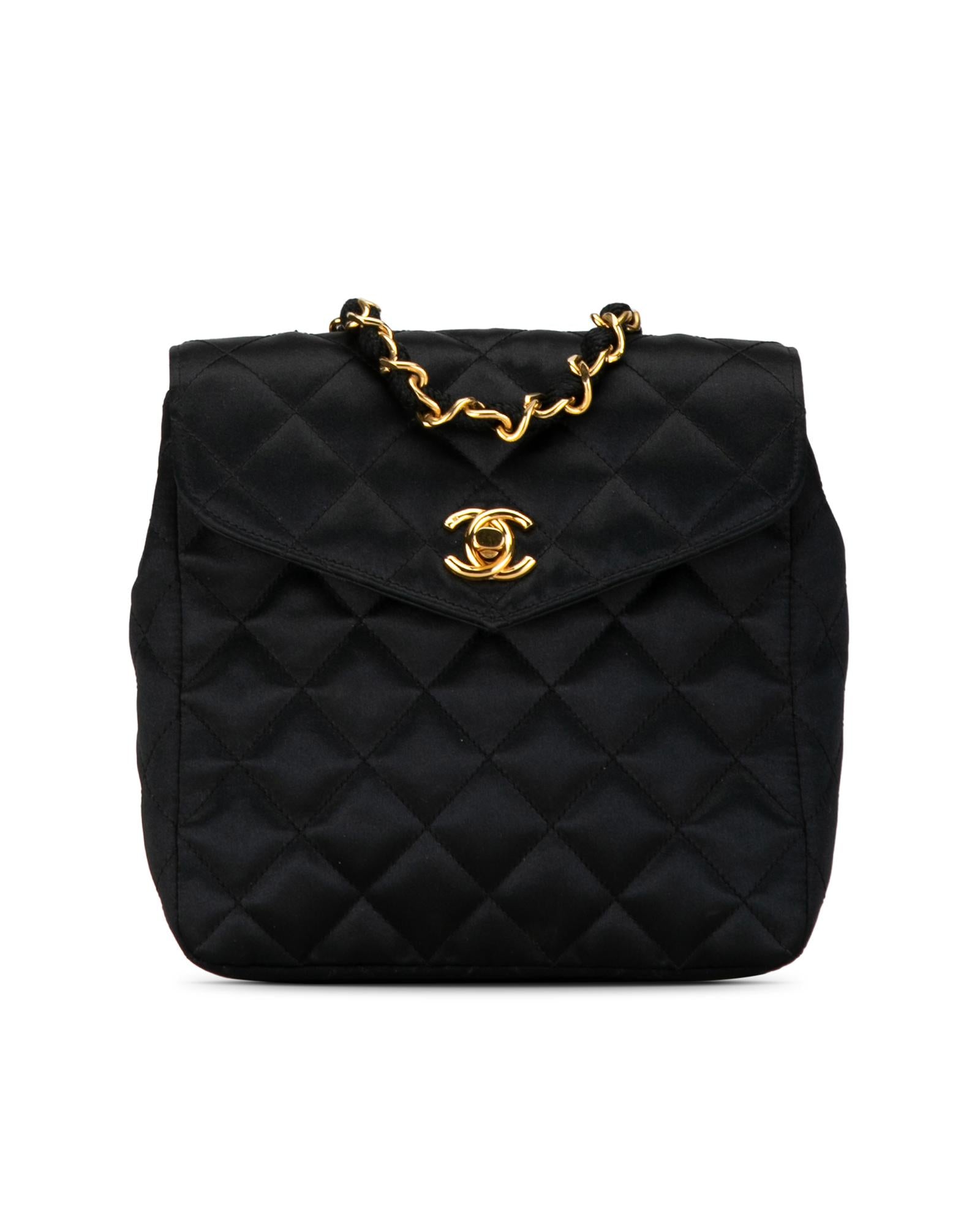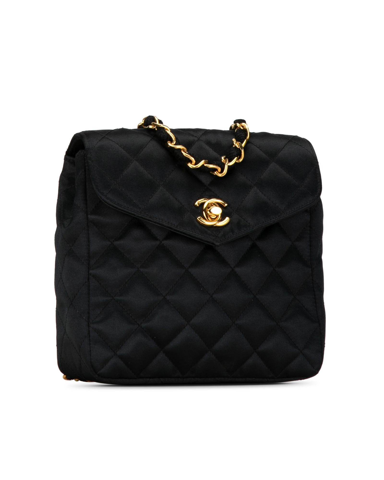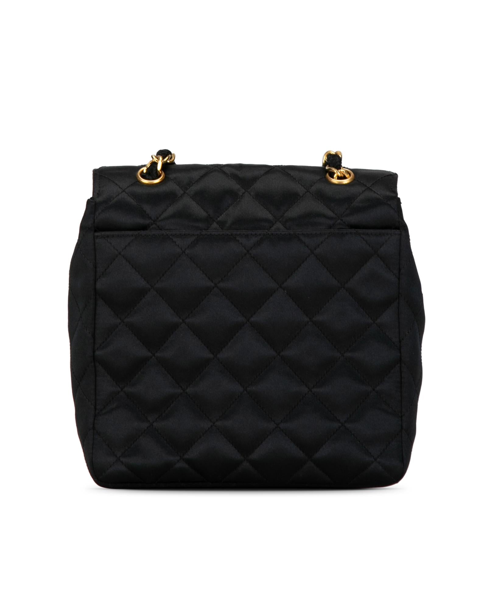 This crossbody bag features a quilted satin body satin woven shoulder strap a front flap with twist lock closure and an interior slip pocket.