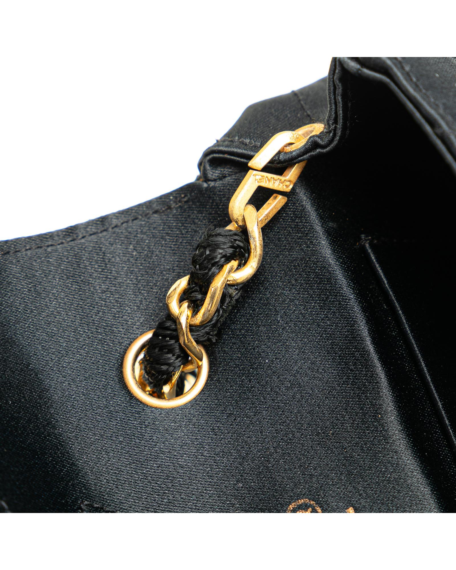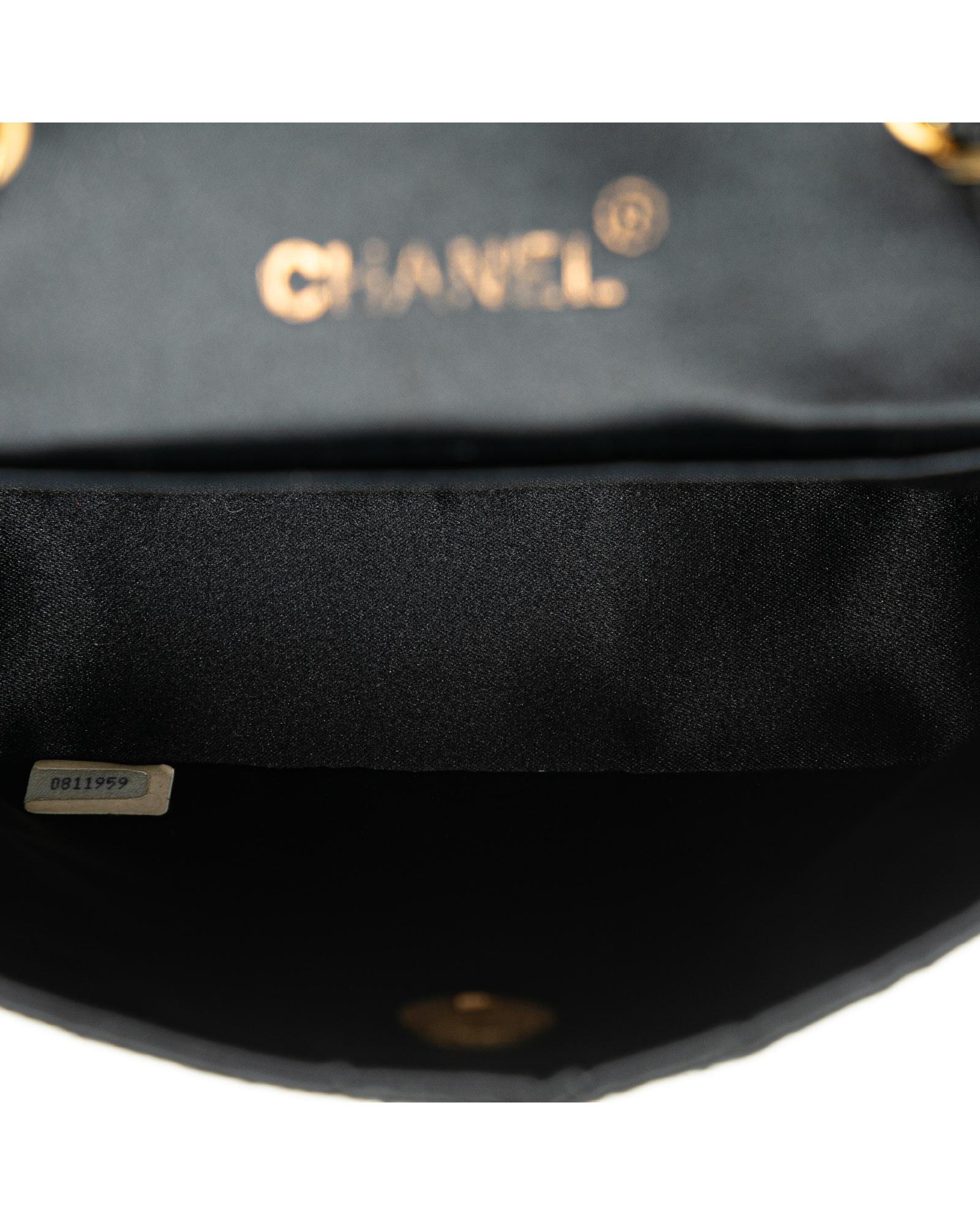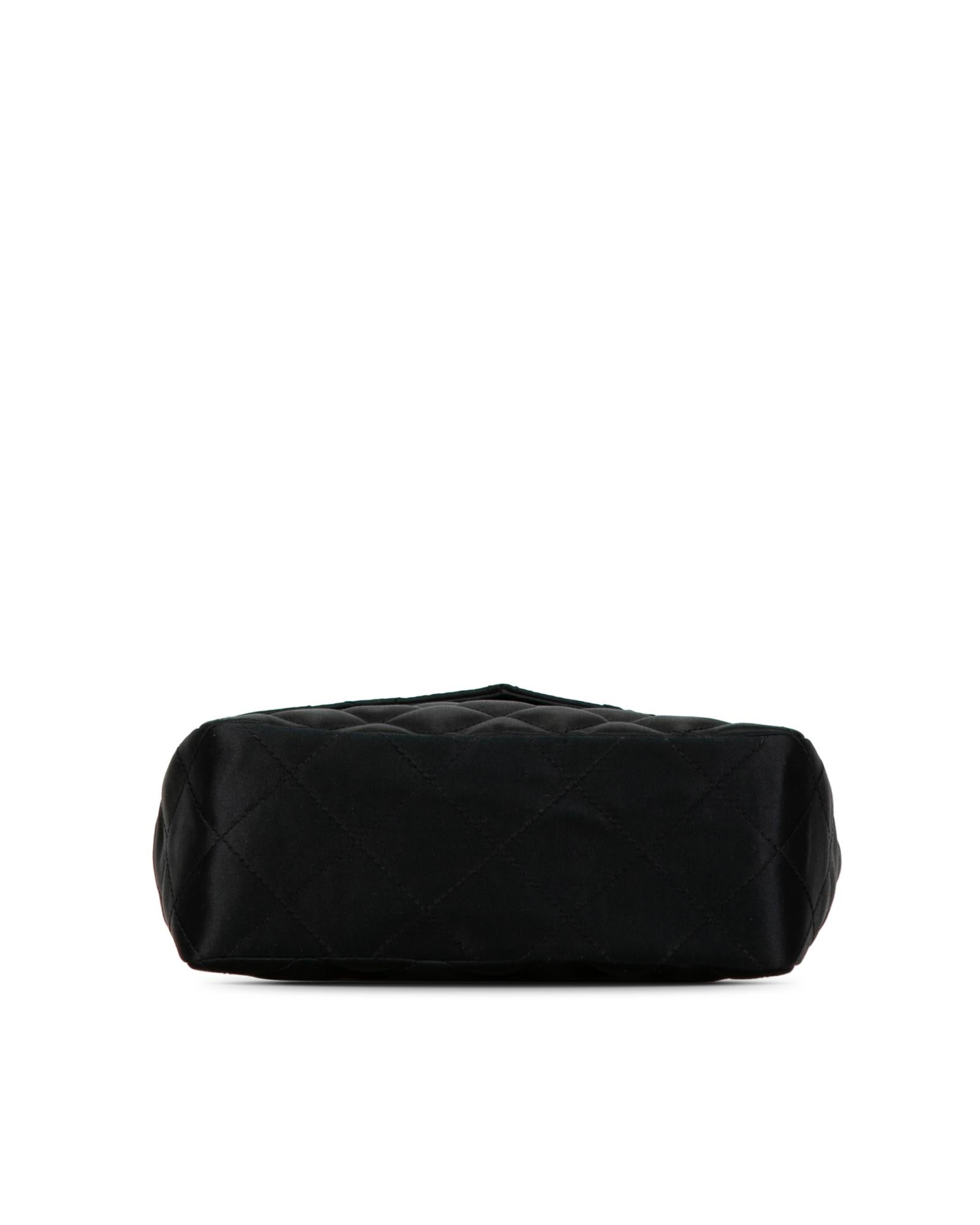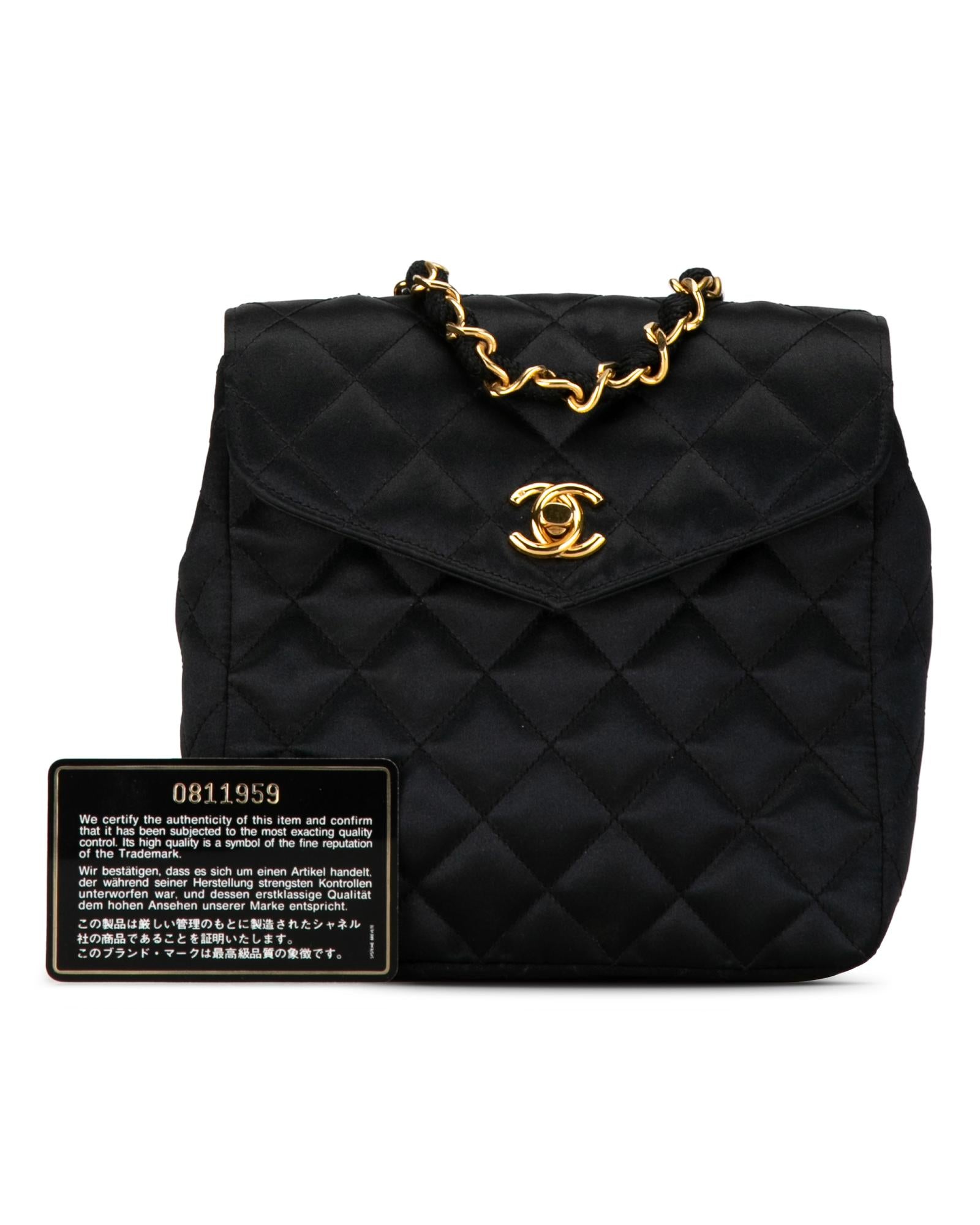 This crossbody bag features a quilted satin body satin woven shoulder strap a front flap with twist lock closure and an interior slip pocket.