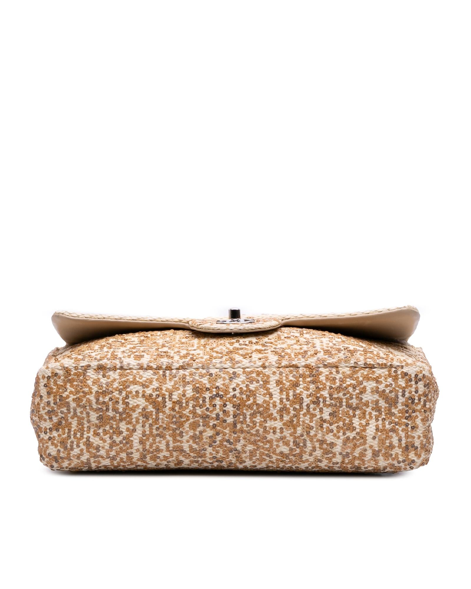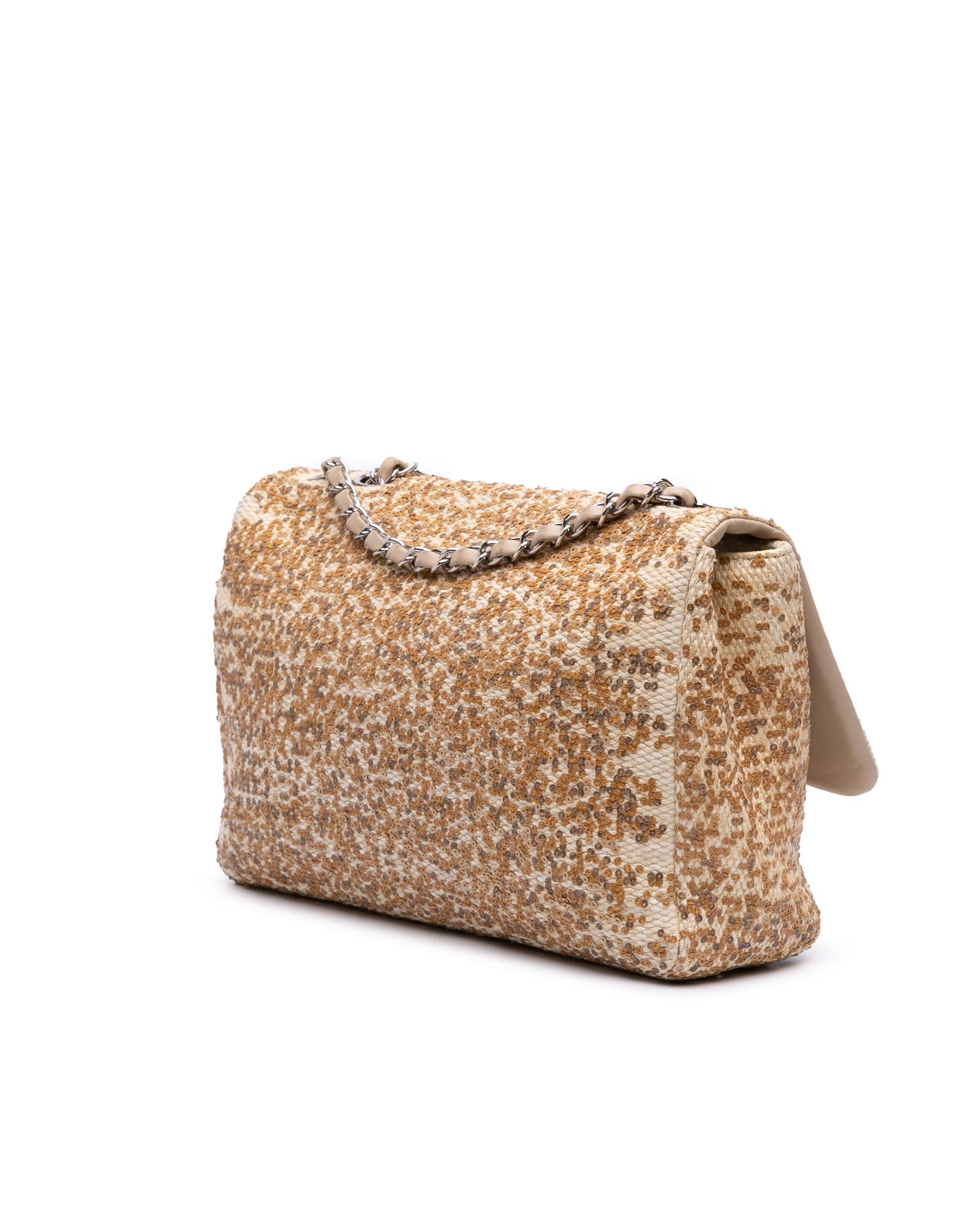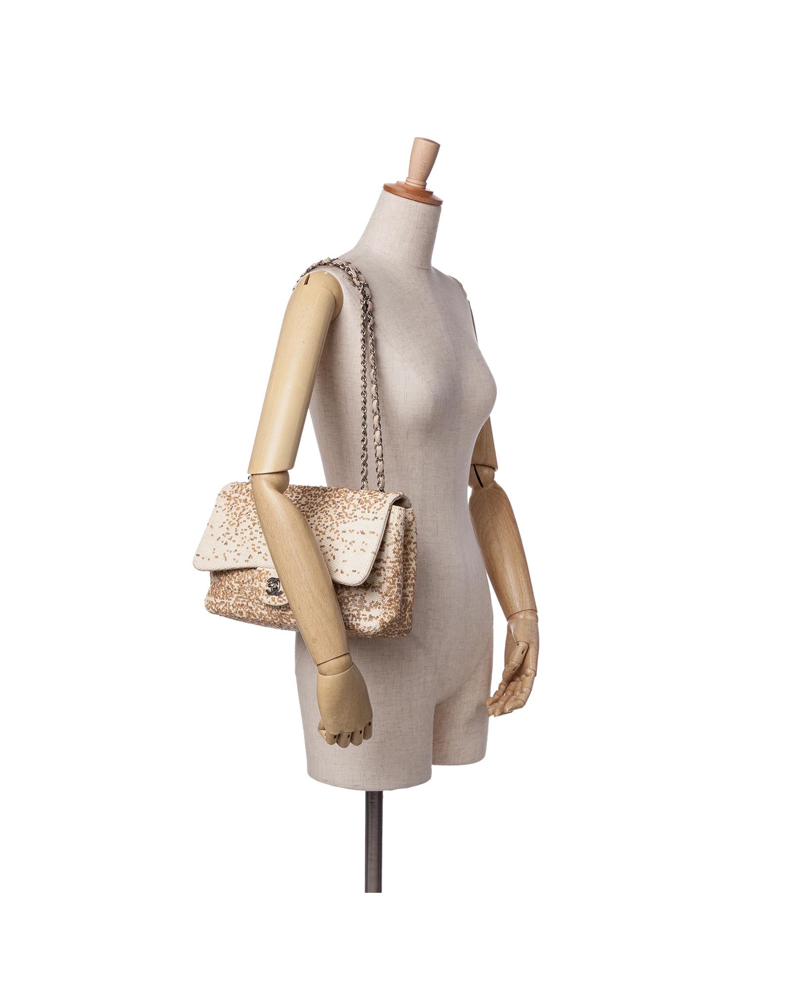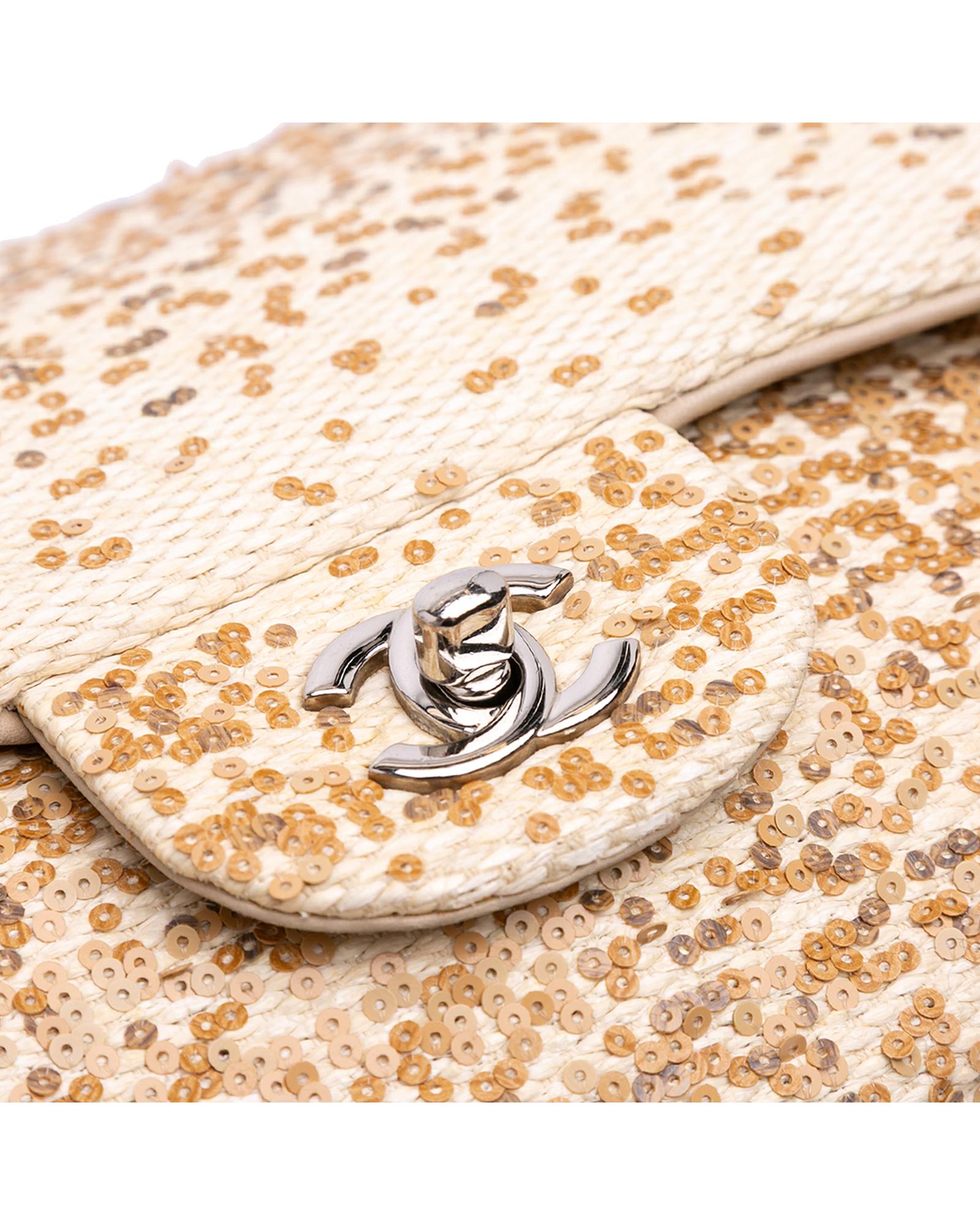 This shoulder bag features a raffia body with sequins embellishments leather woven chain link straps a front flap with twist lock closure and interior zip and slip pockets.