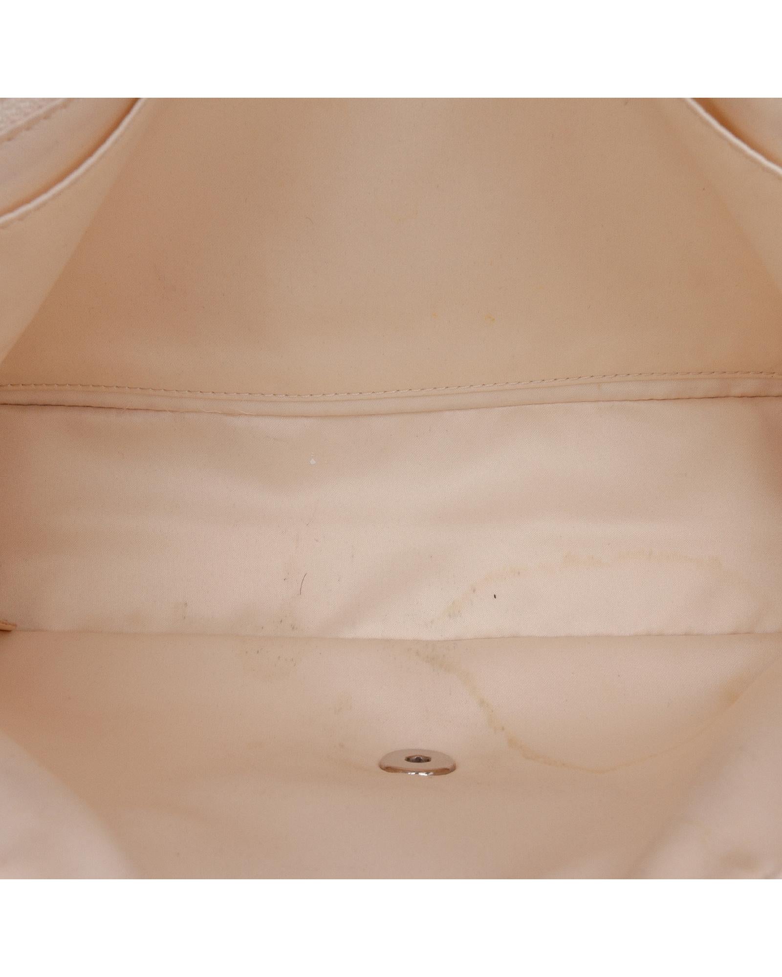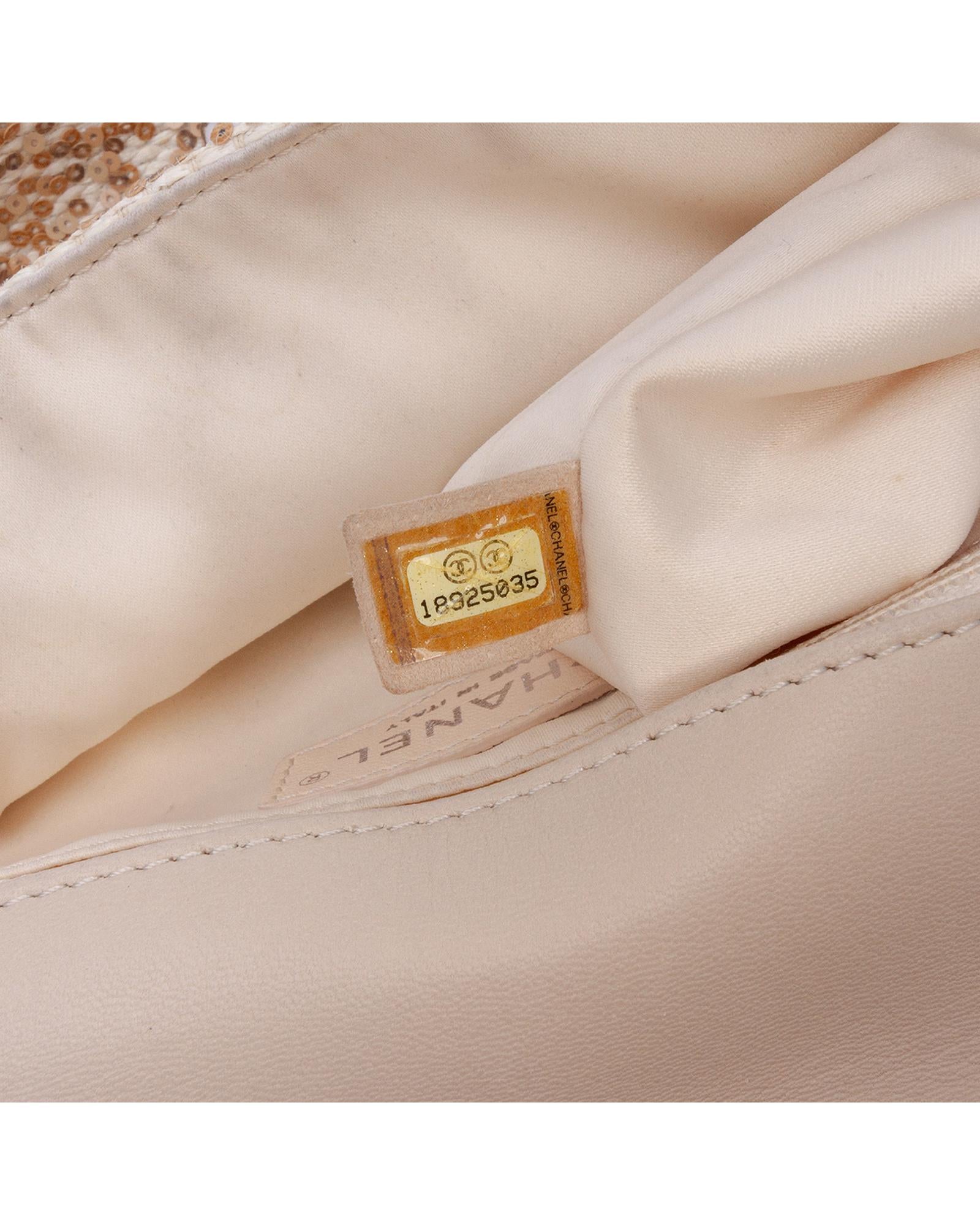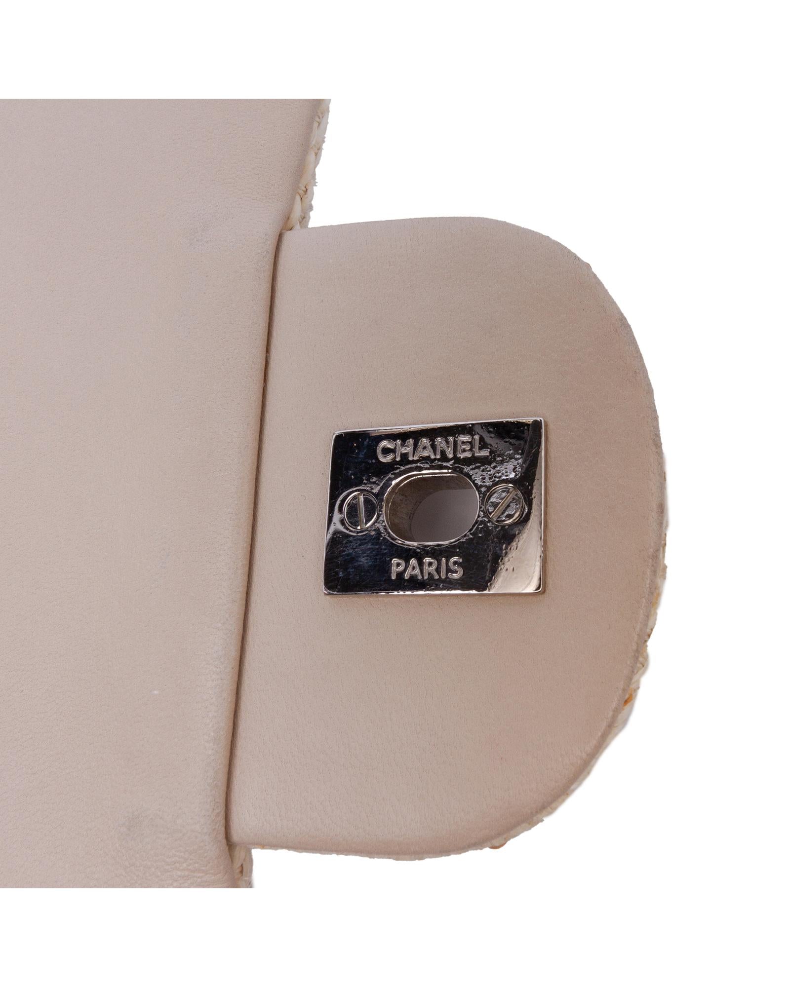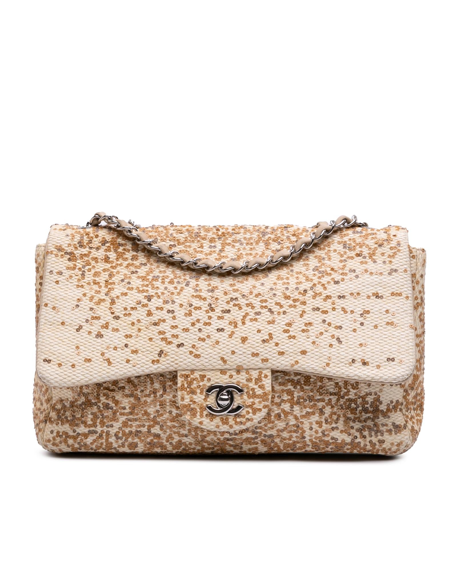 This shoulder bag features a raffia body with sequins embellishments leather woven chain link straps a front flap with twist lock closure and interior zip and slip pockets.