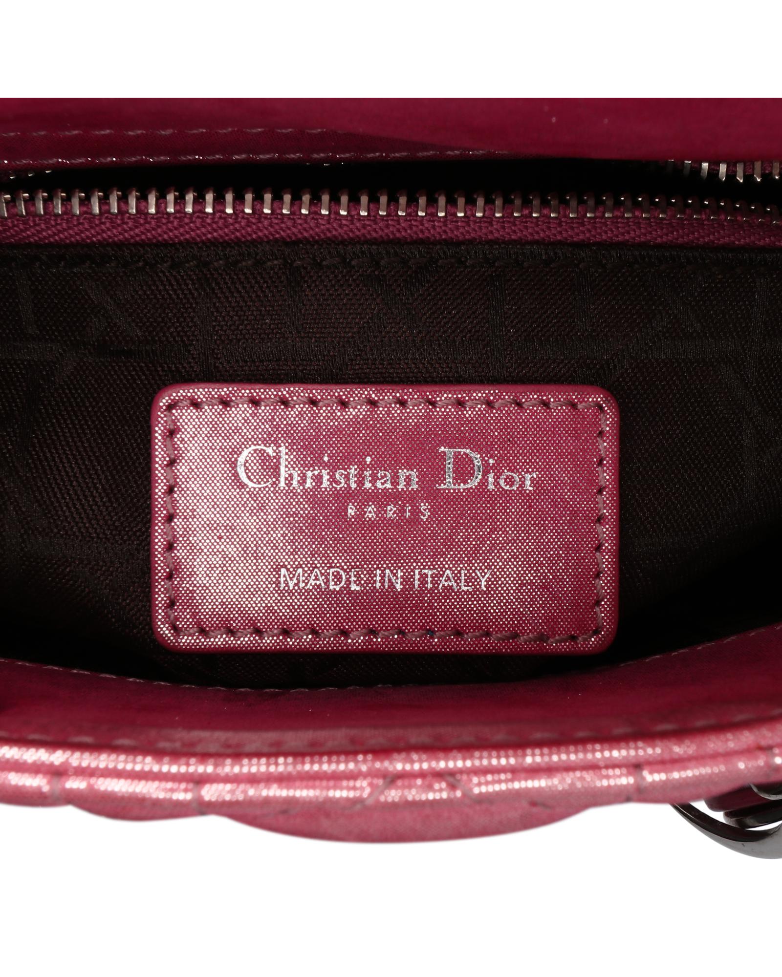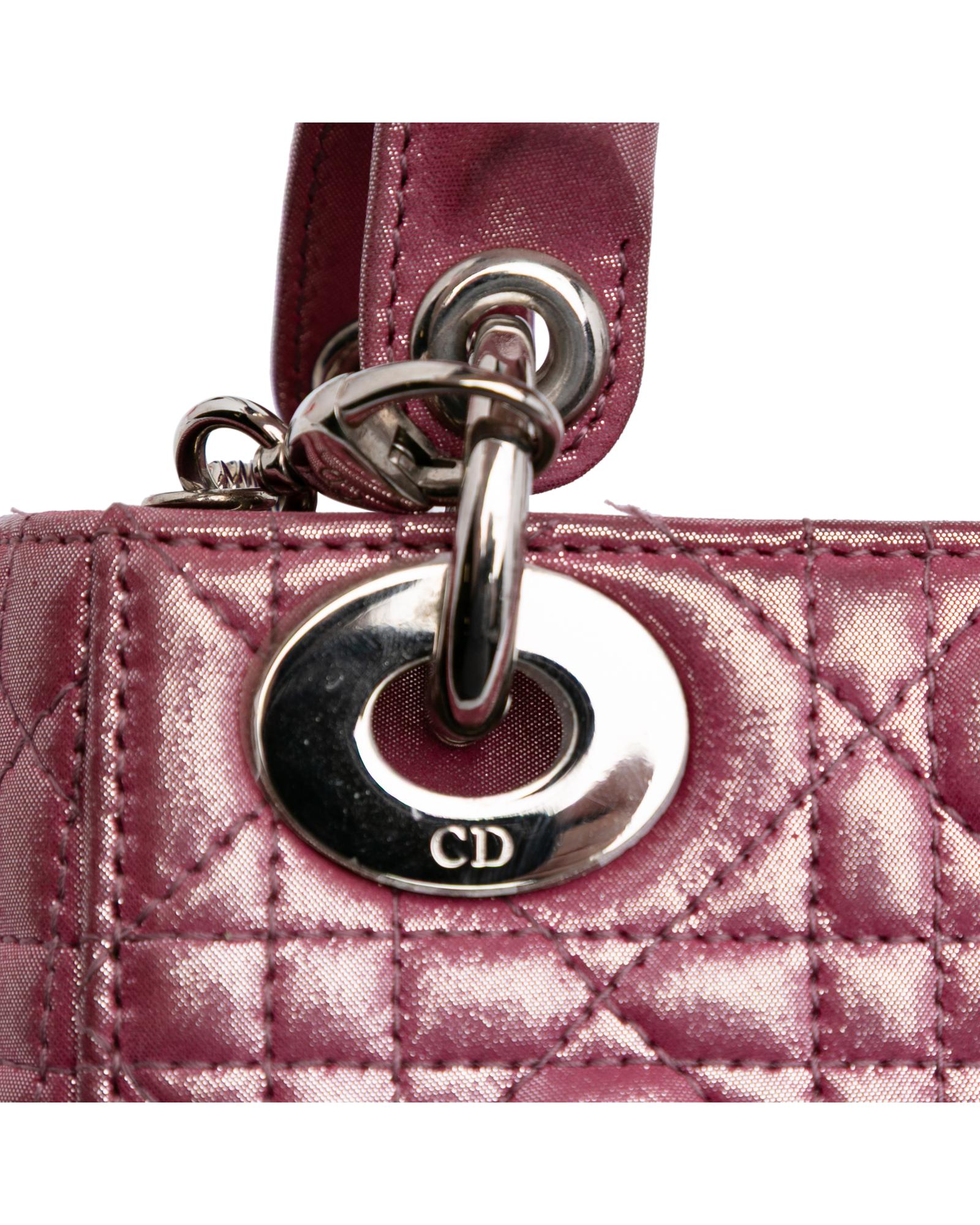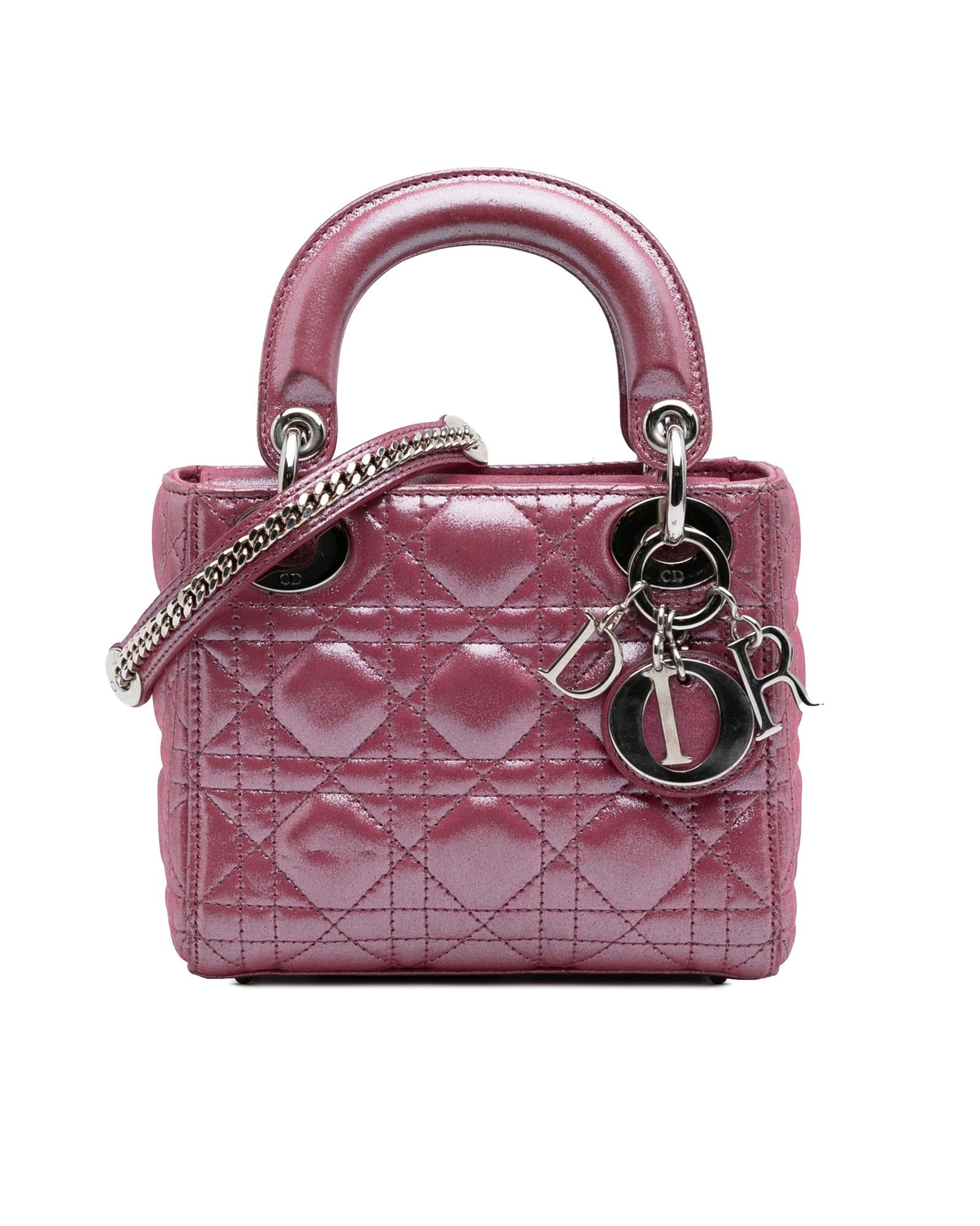 The Mini Lady Dior features a quilted iridescent lambskin leather body flat leather top handles a detachable curb chain shoulder strap with leather guard a fold-in flap closure and an interior zip pocket.Brand: Dior