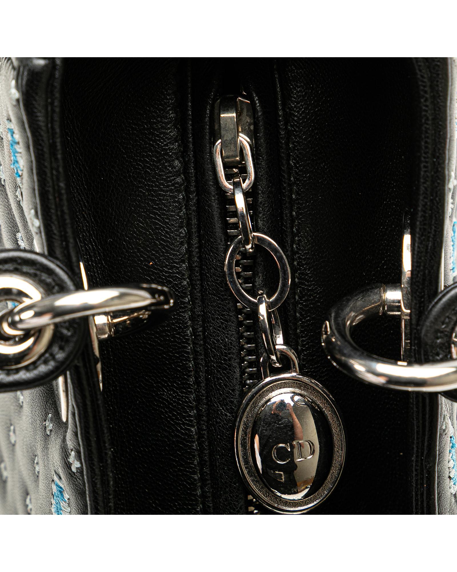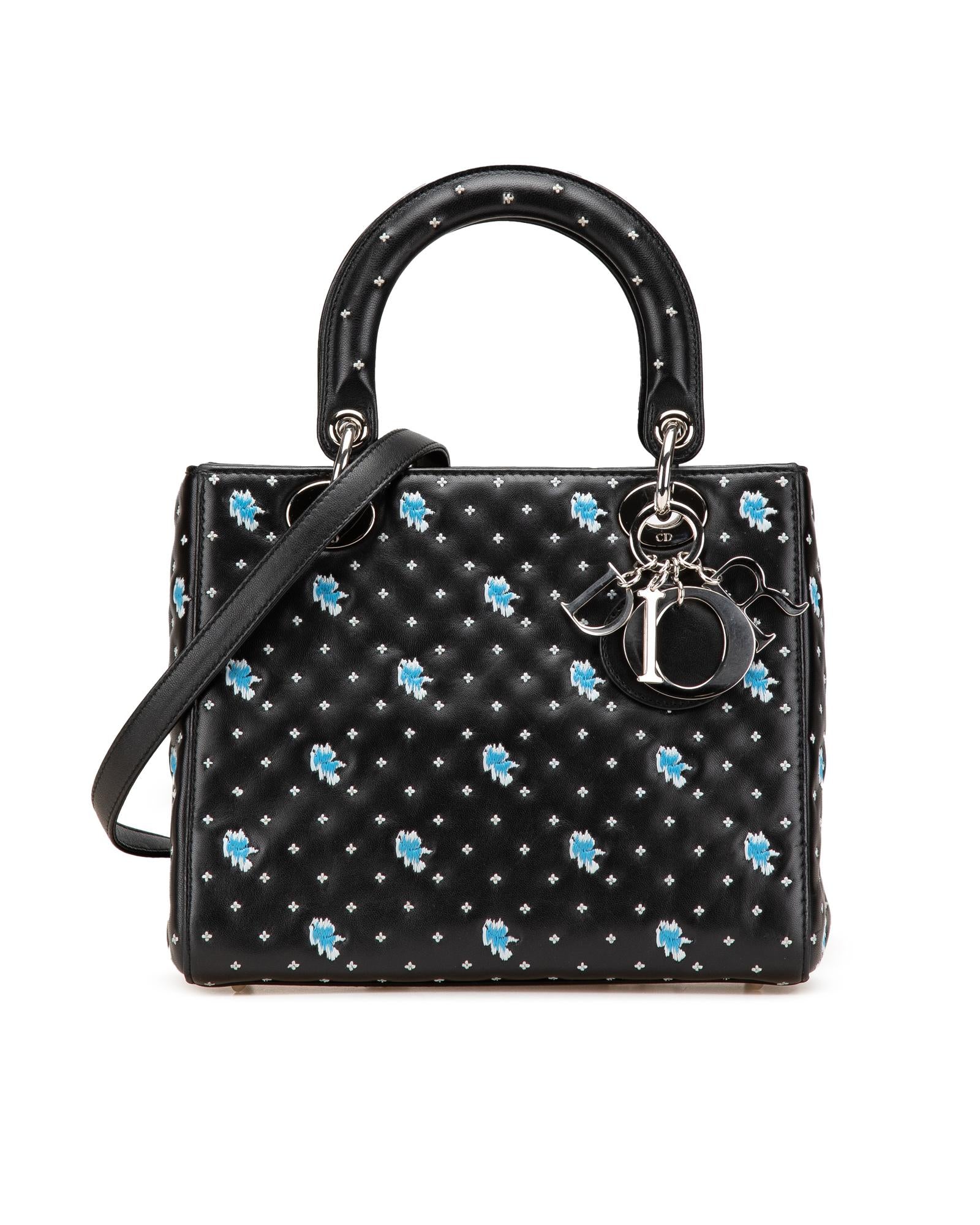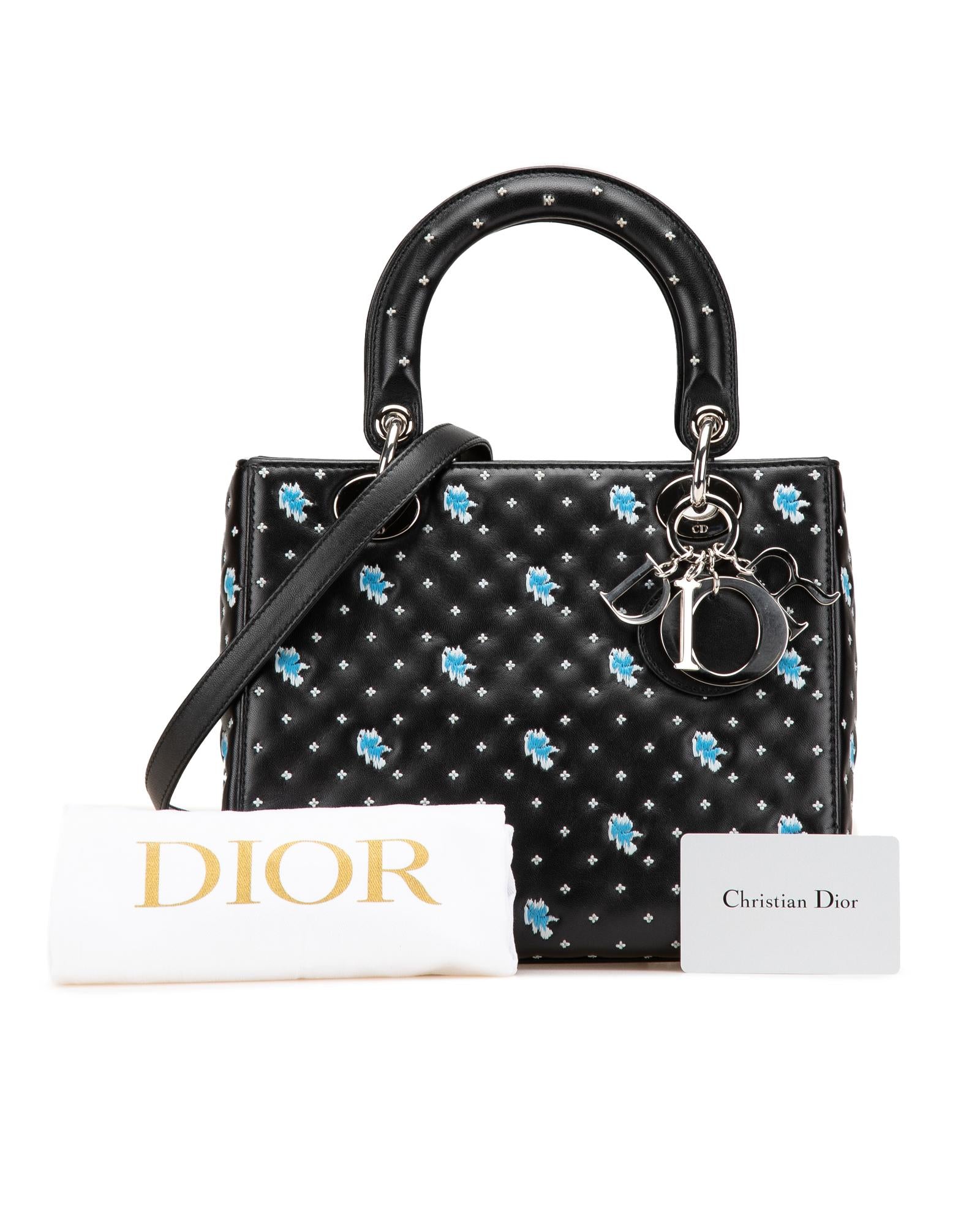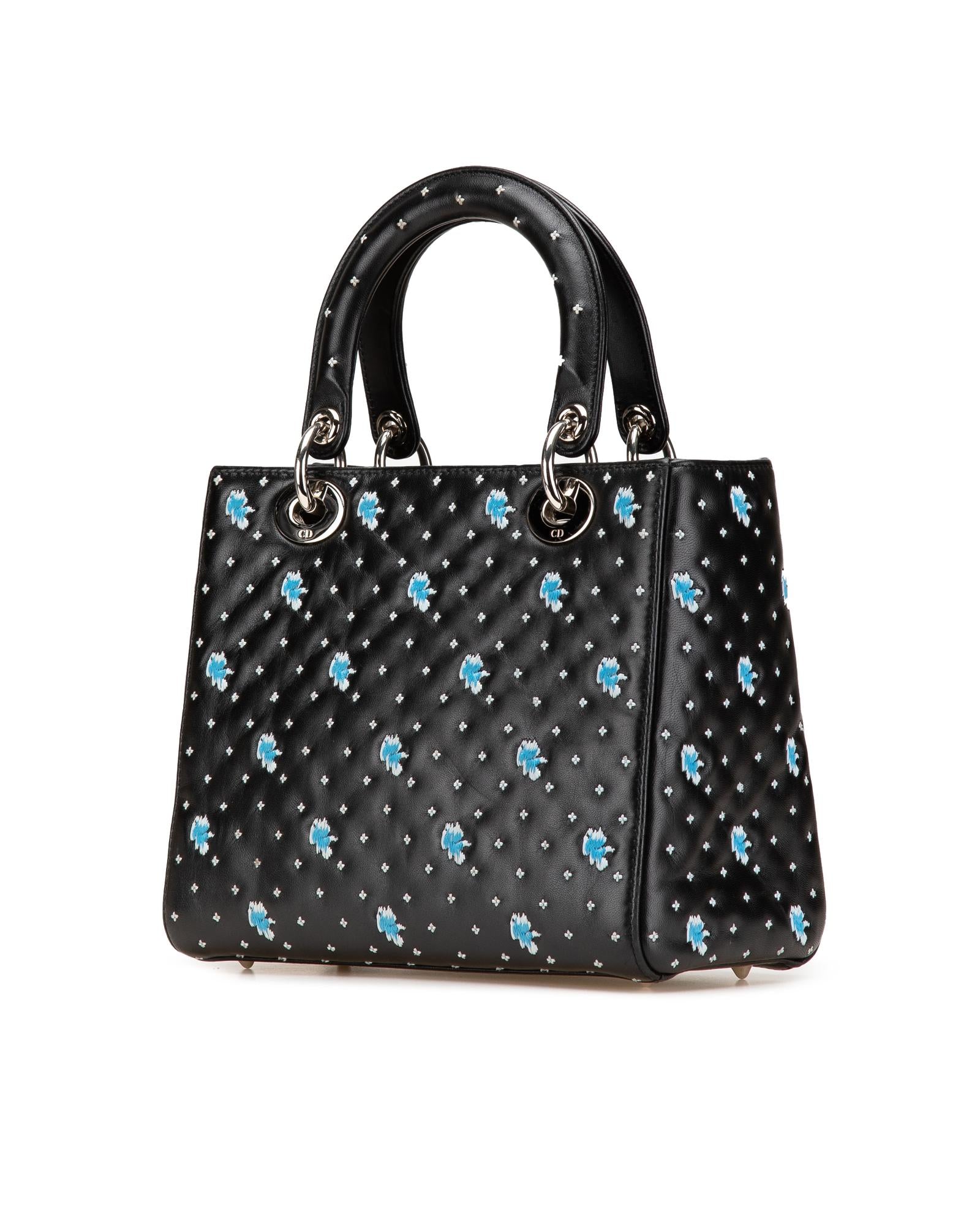 The Lady Dior satchel features an embroidered leather body flat leather handles a detachable flat leather strap a top zip closure and an interior zip pocket.Brand: Dior