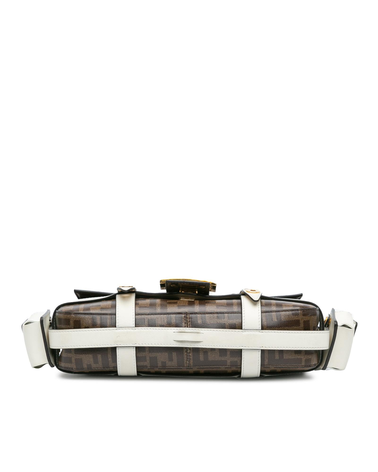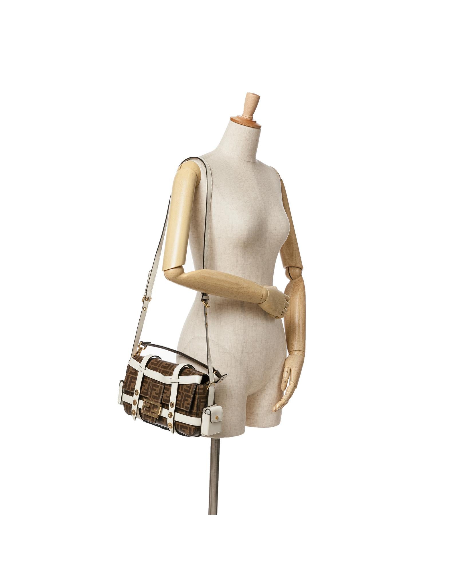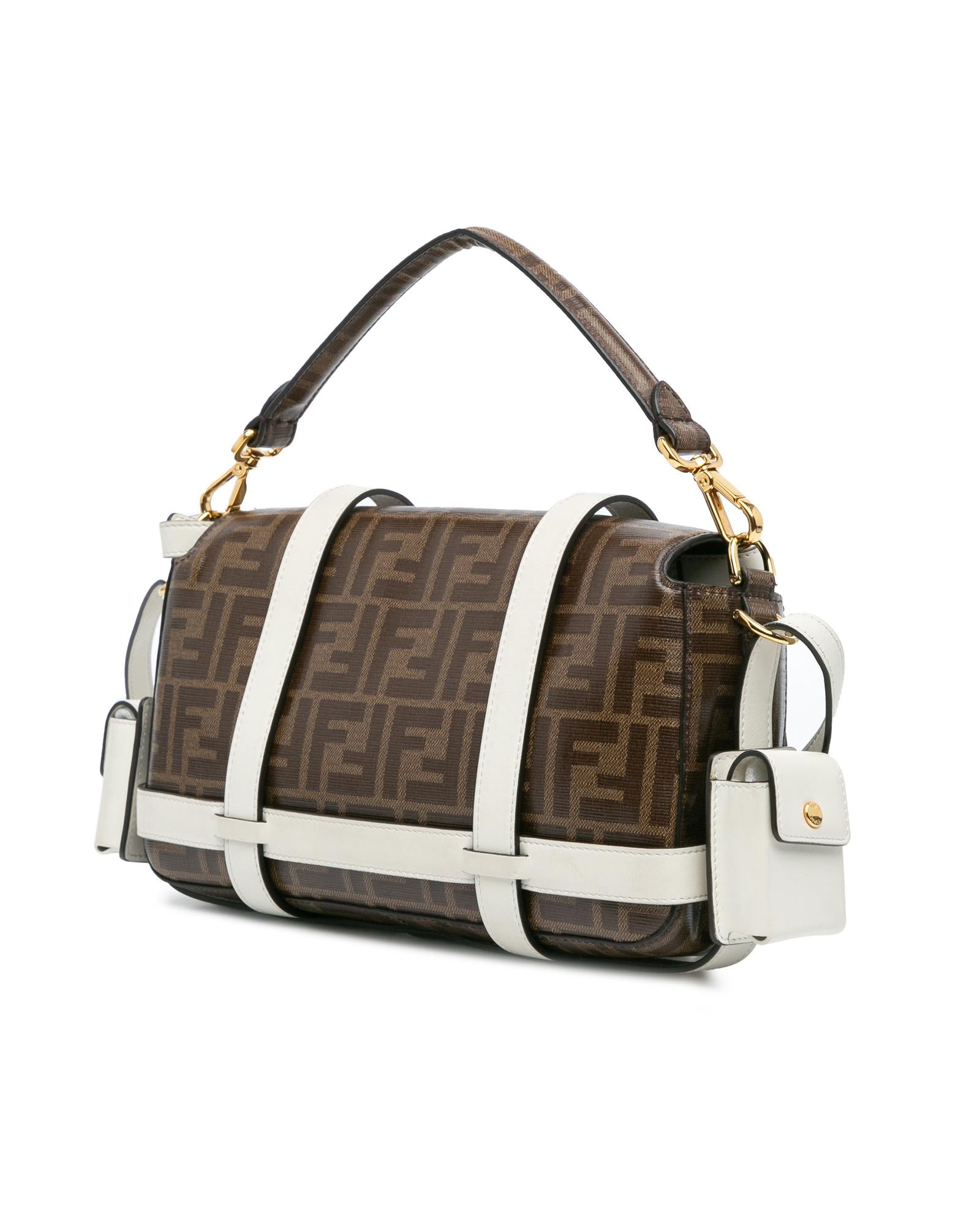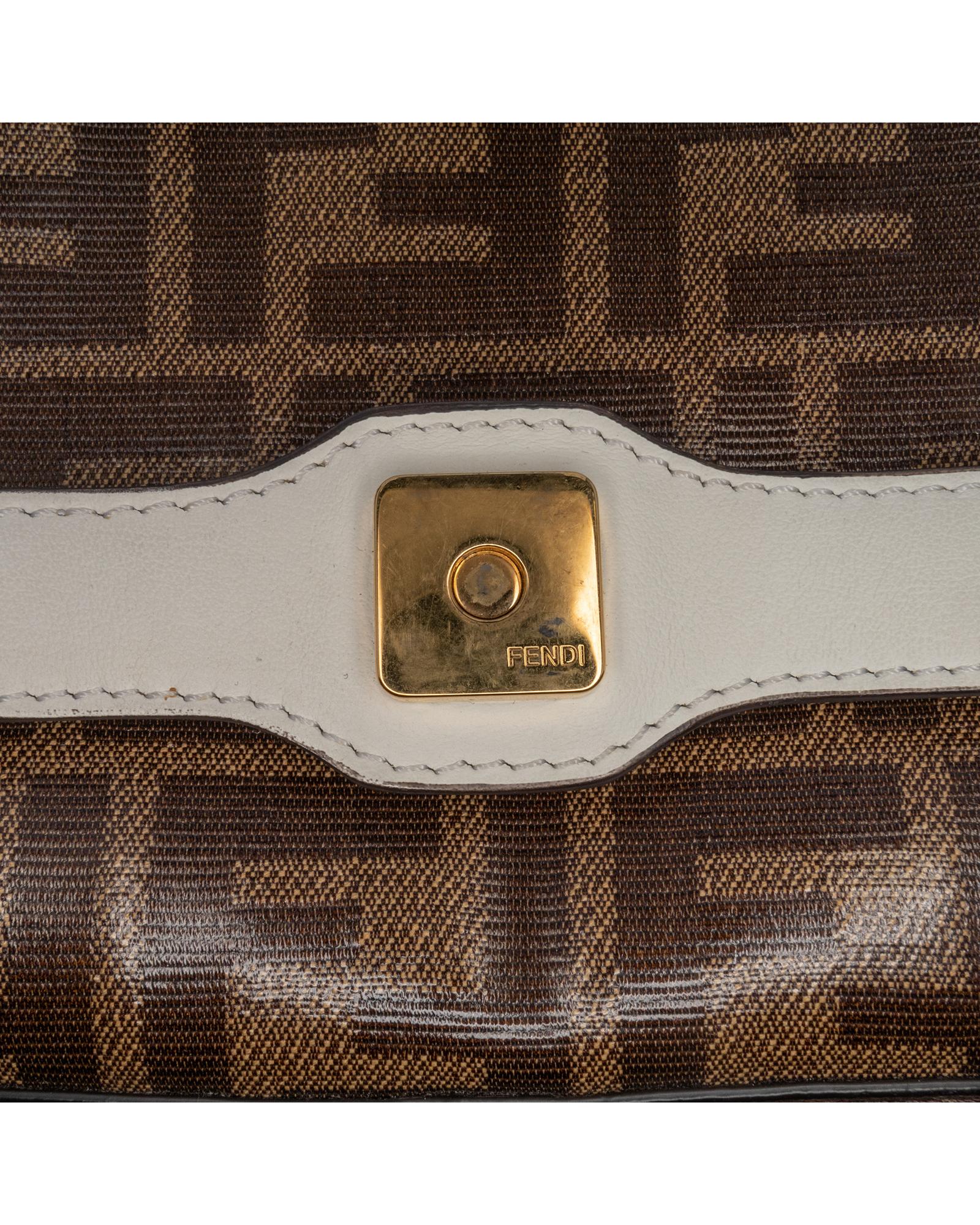 This satchel features an coated canvas body with leather trim a removable flat coated canvas handle a flat leather shoulder strap a front flap with magnetic snap closure exterior flap pockets and an interior zip pocket.