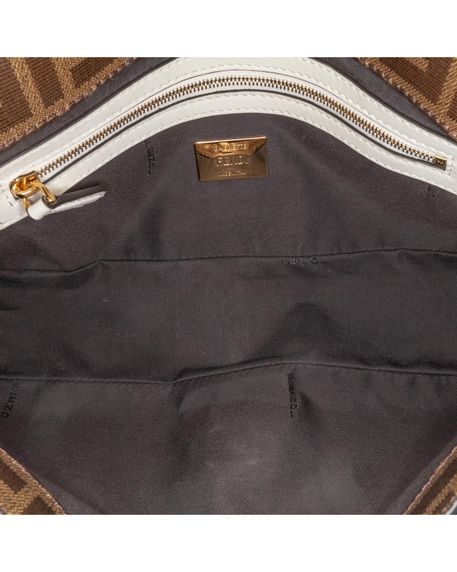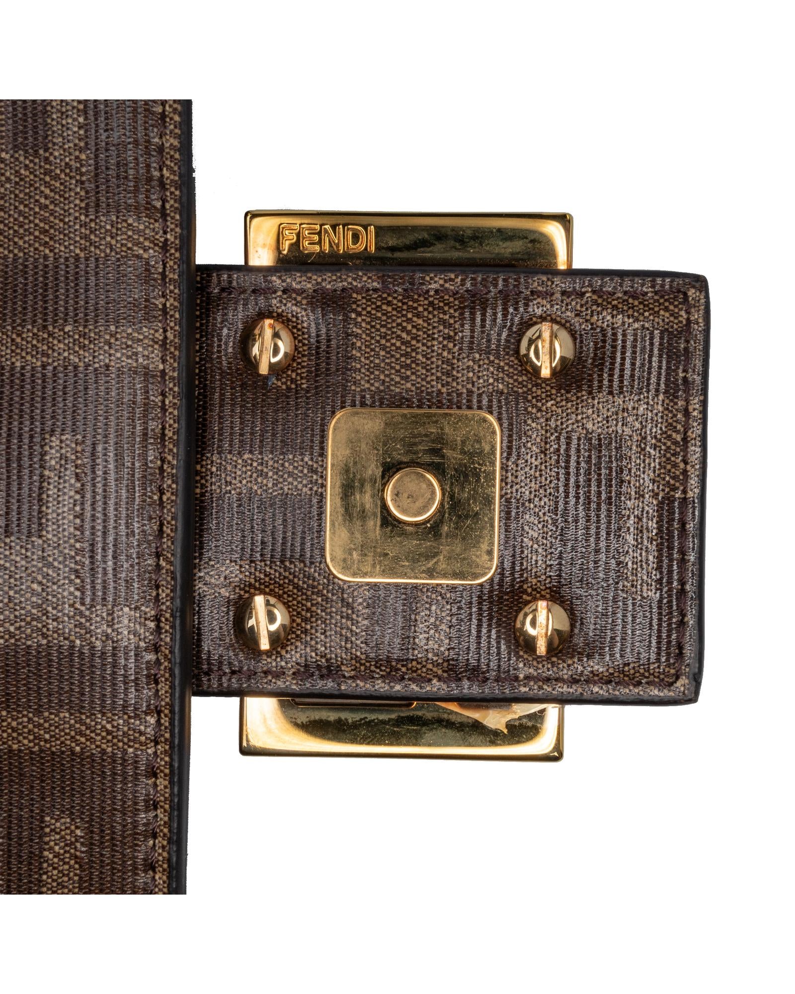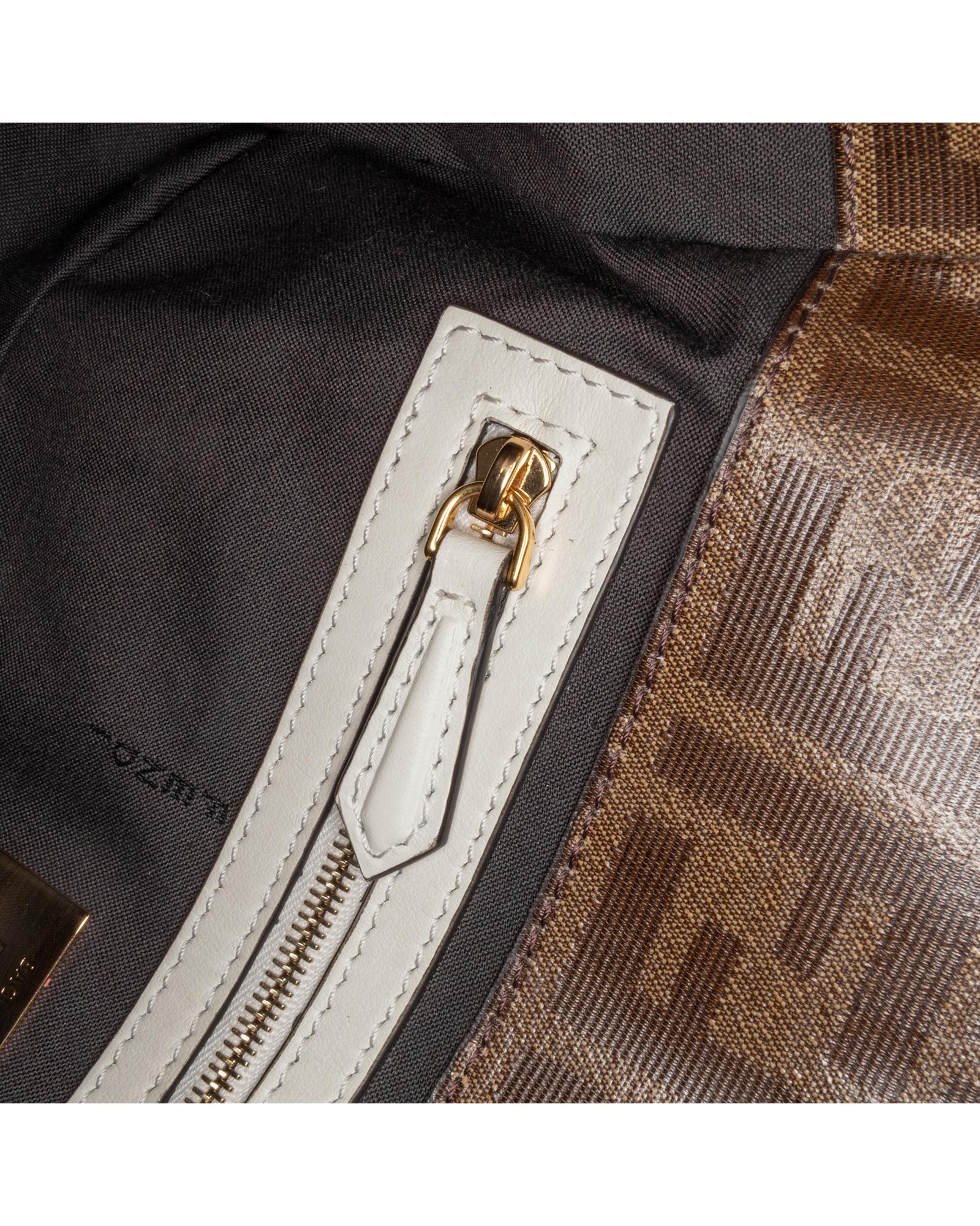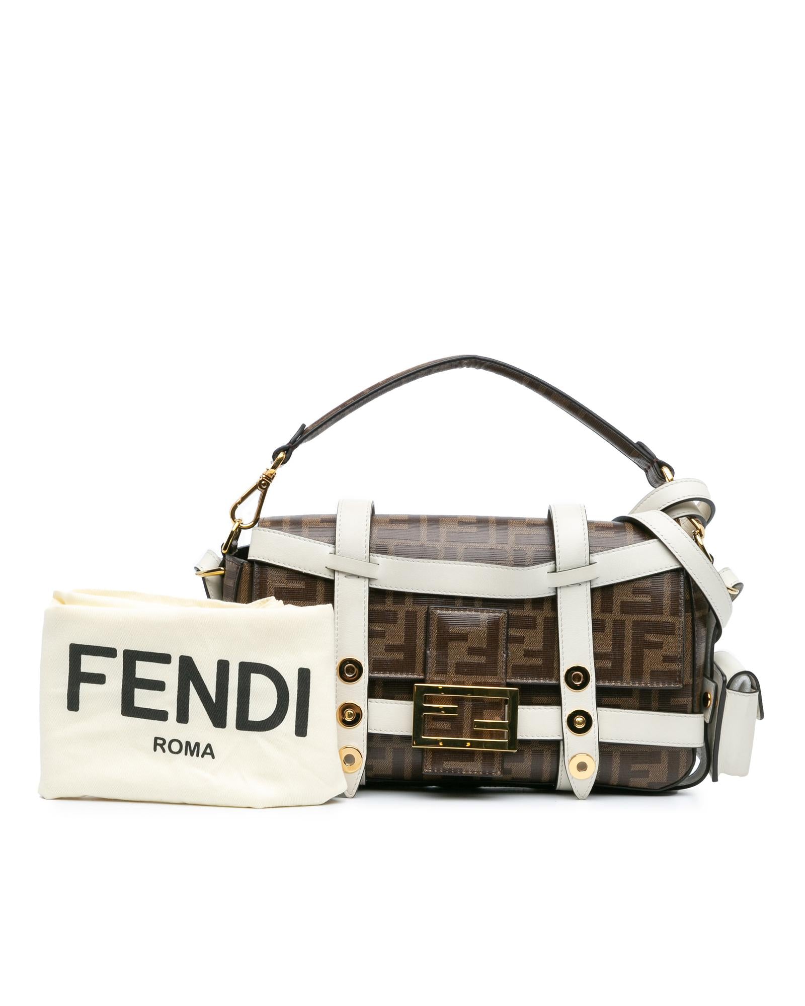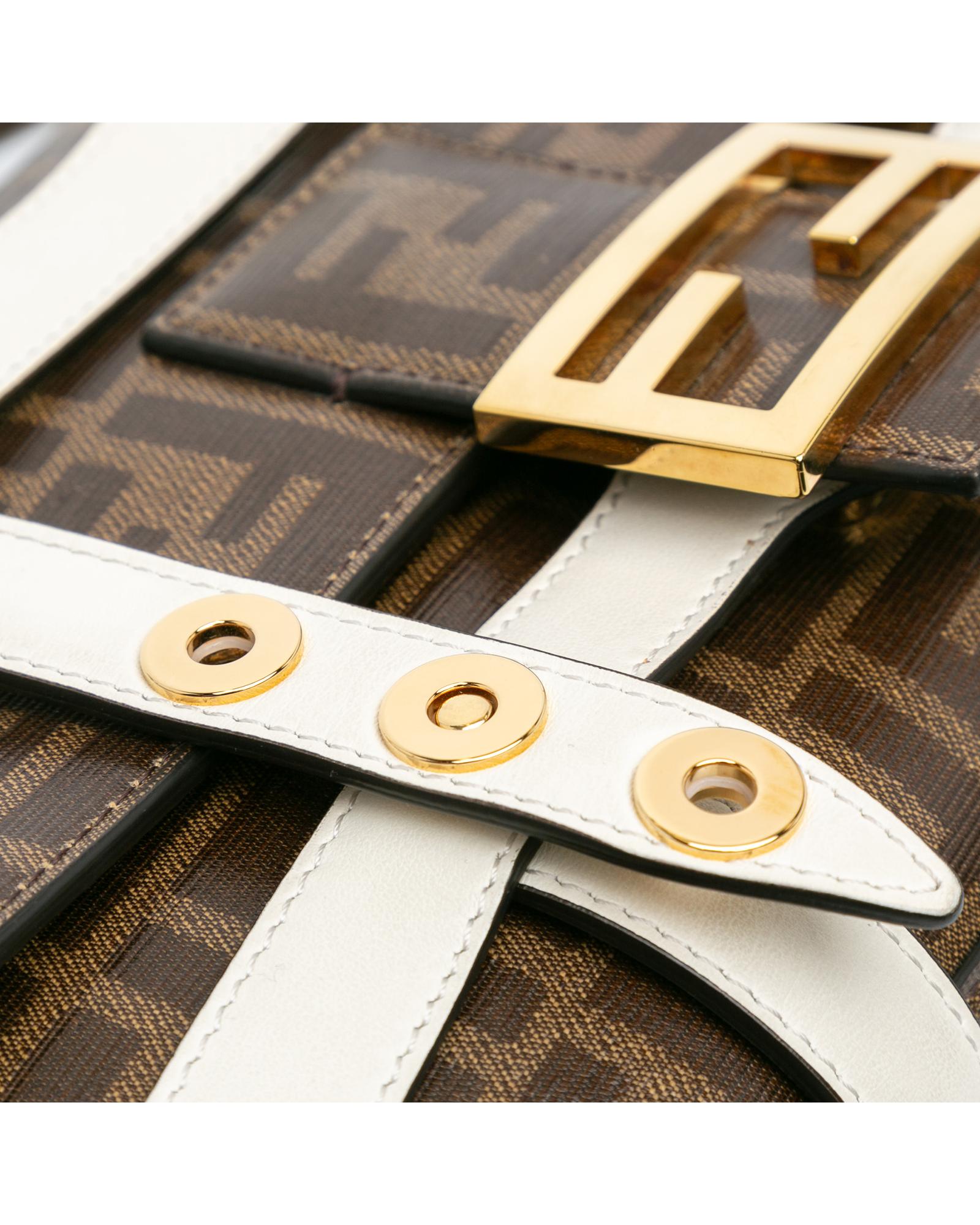 This satchel features an coated canvas body with leather trim a removable flat coated canvas handle a flat leather shoulder strap a front flap with magnetic snap closure exterior flap pockets and an interior zip pocket.