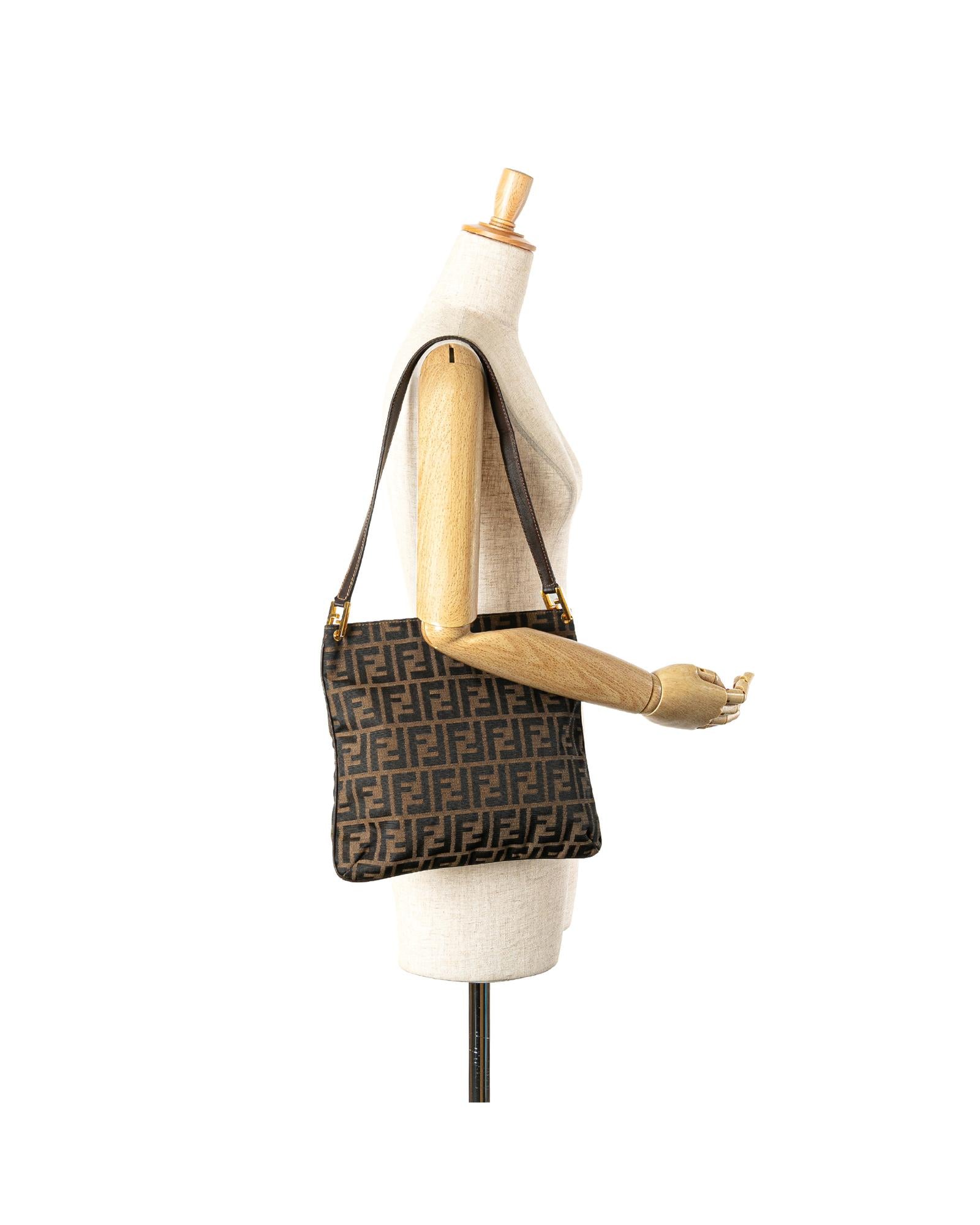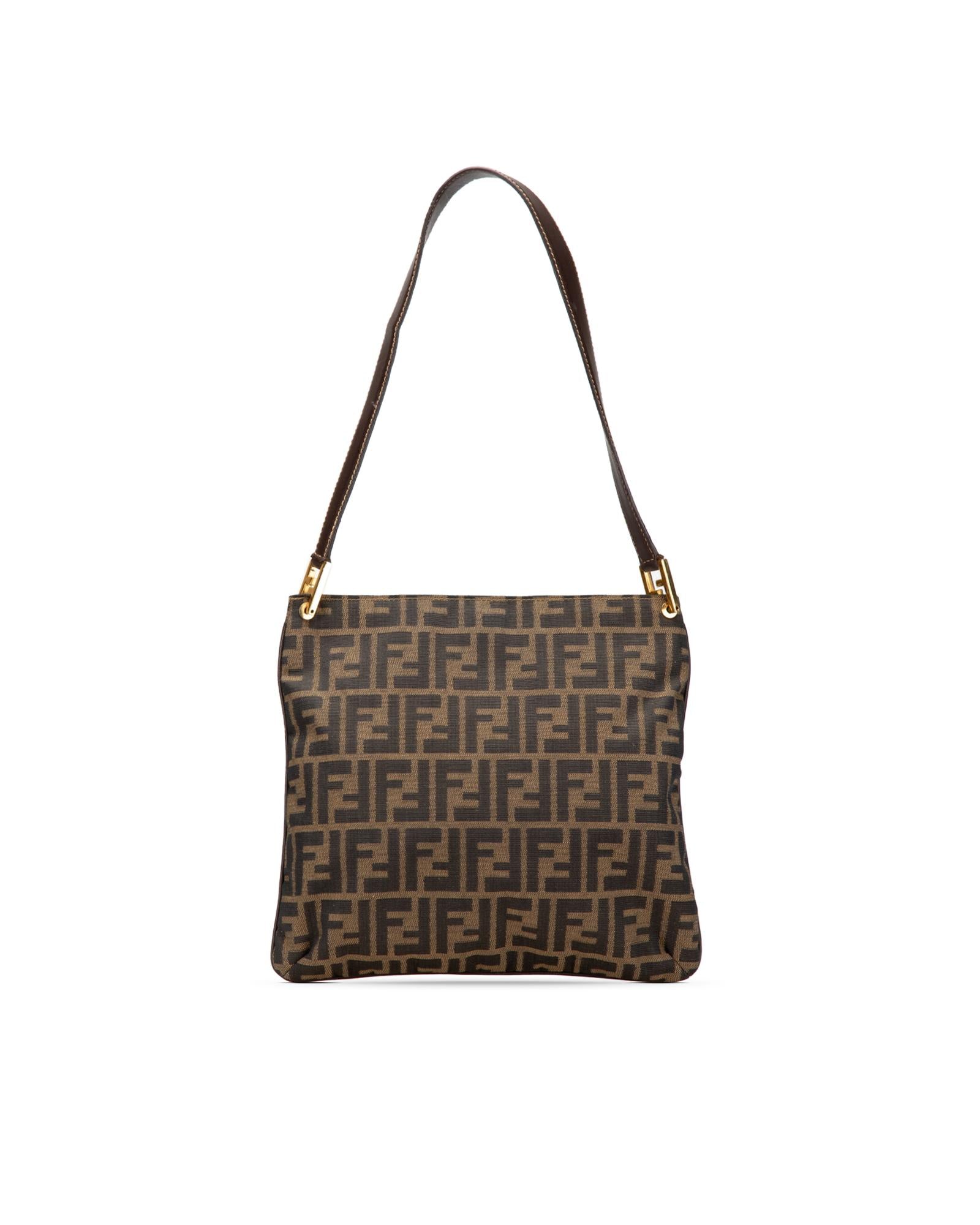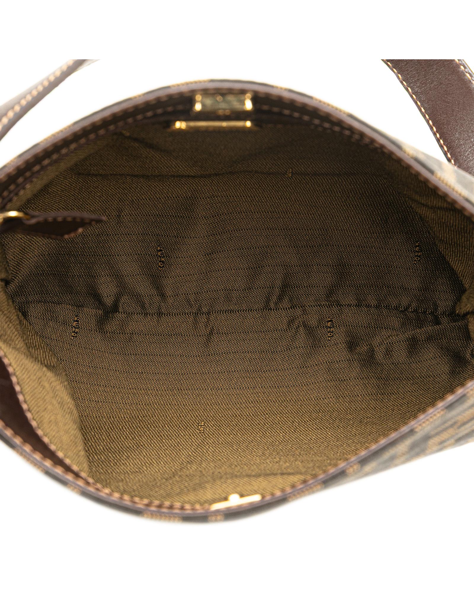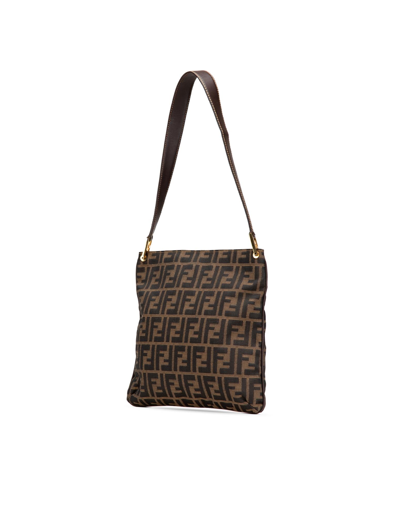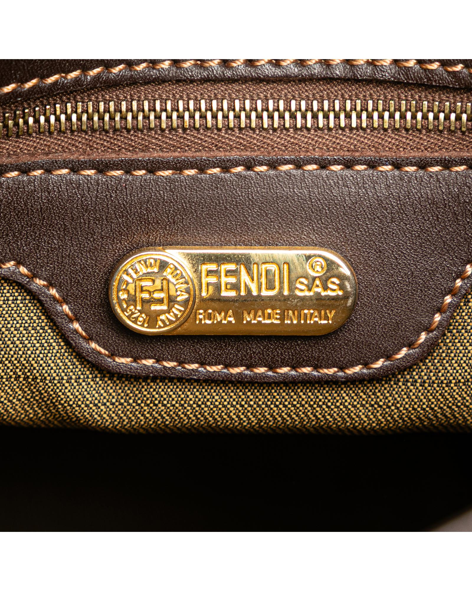 This shoulder bag features a canvas body with leather trim a flat leather strap an open top with magnetic snap closure and an interior zip pocket.Brand: Fendi