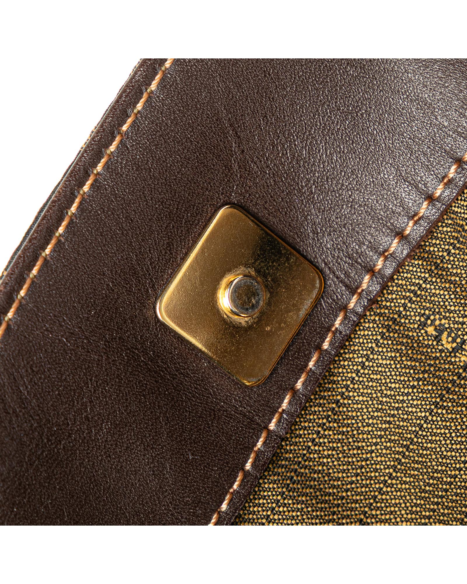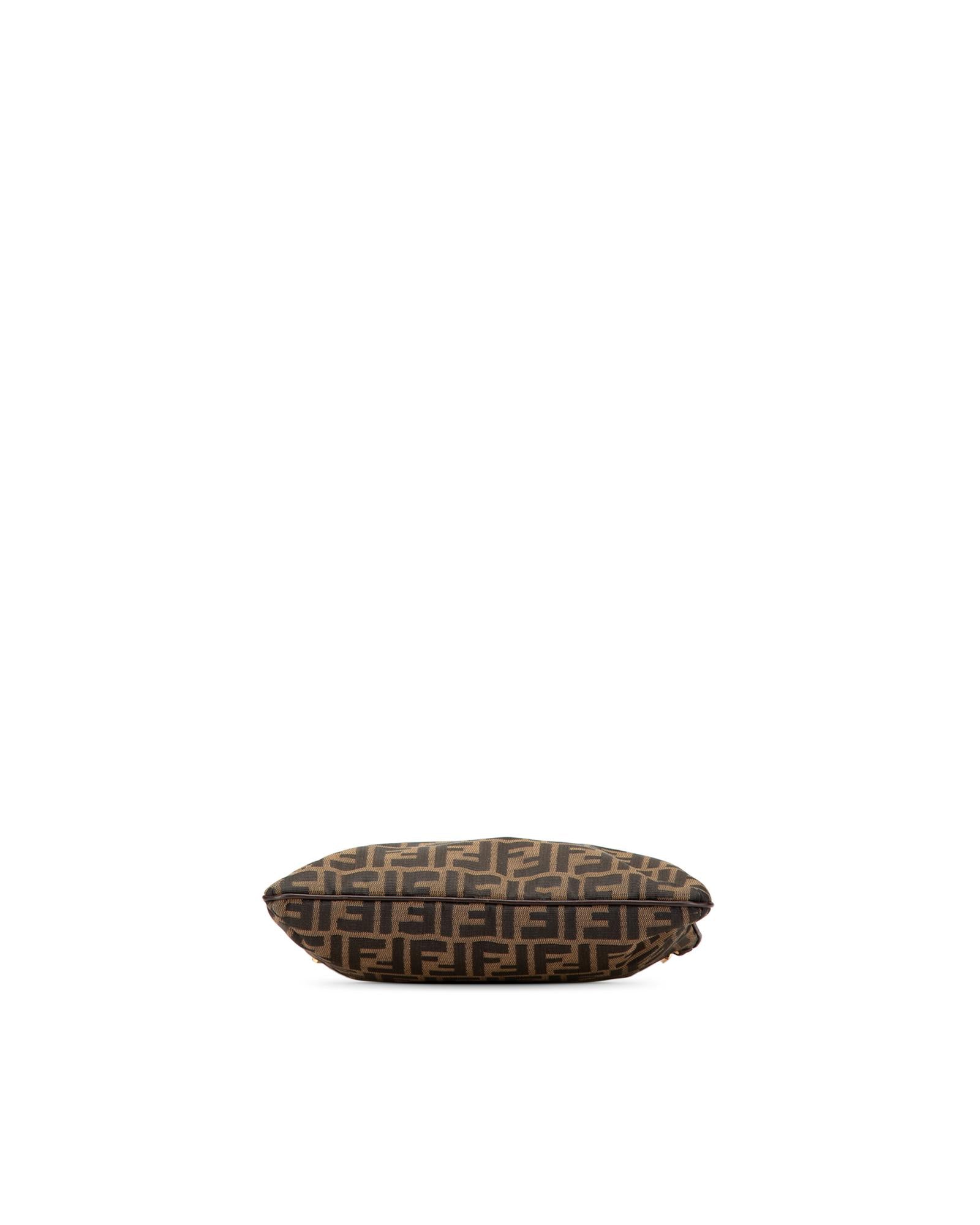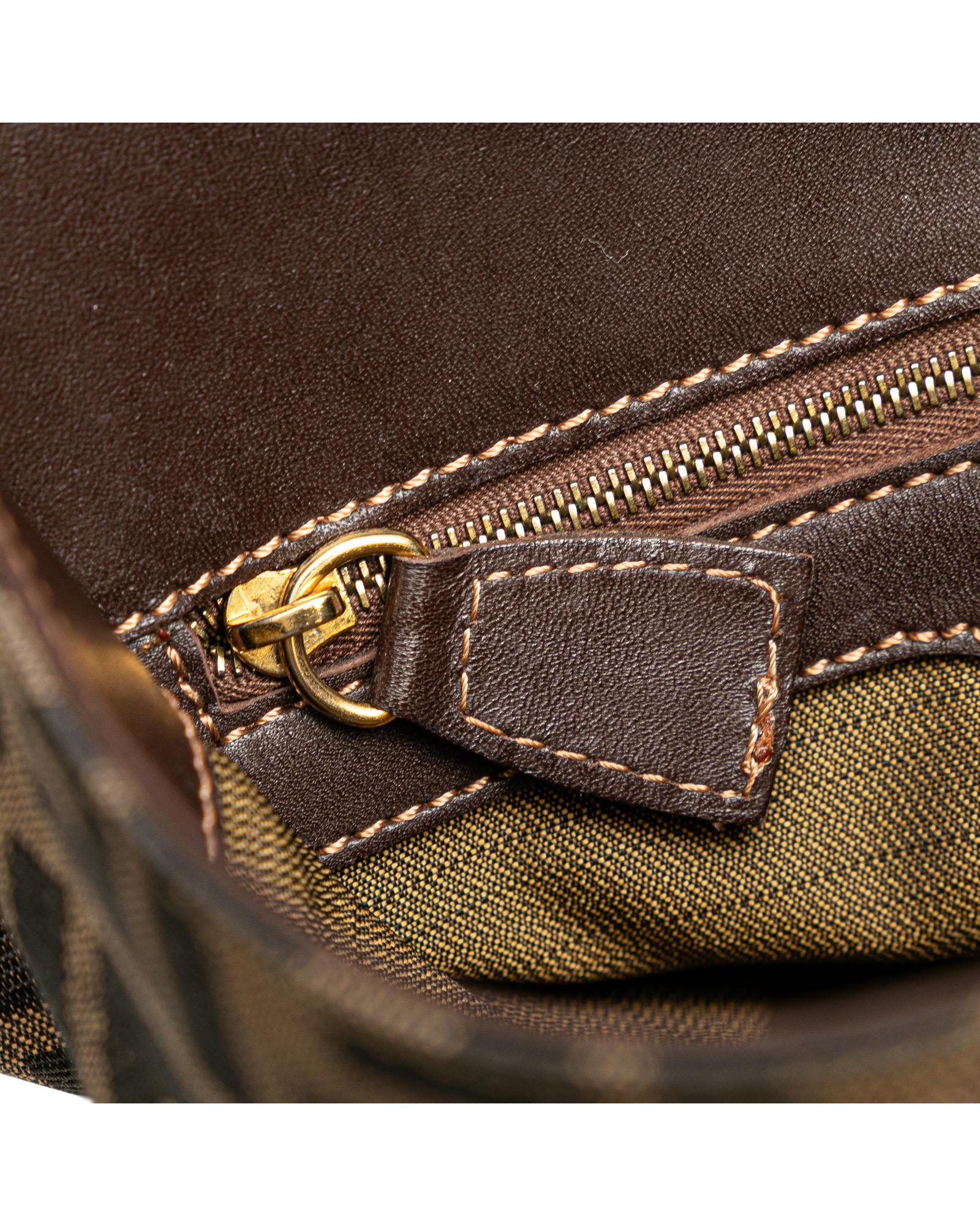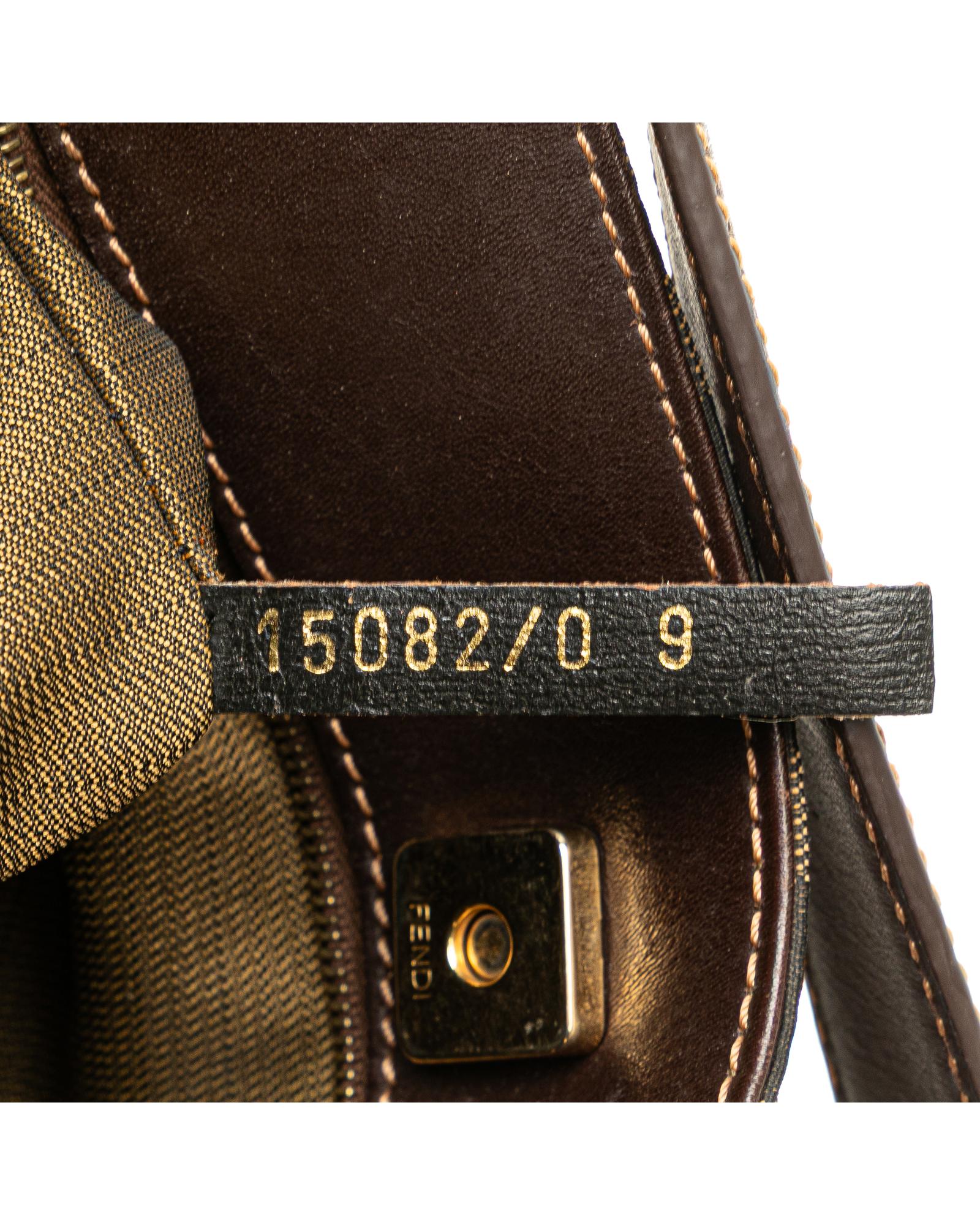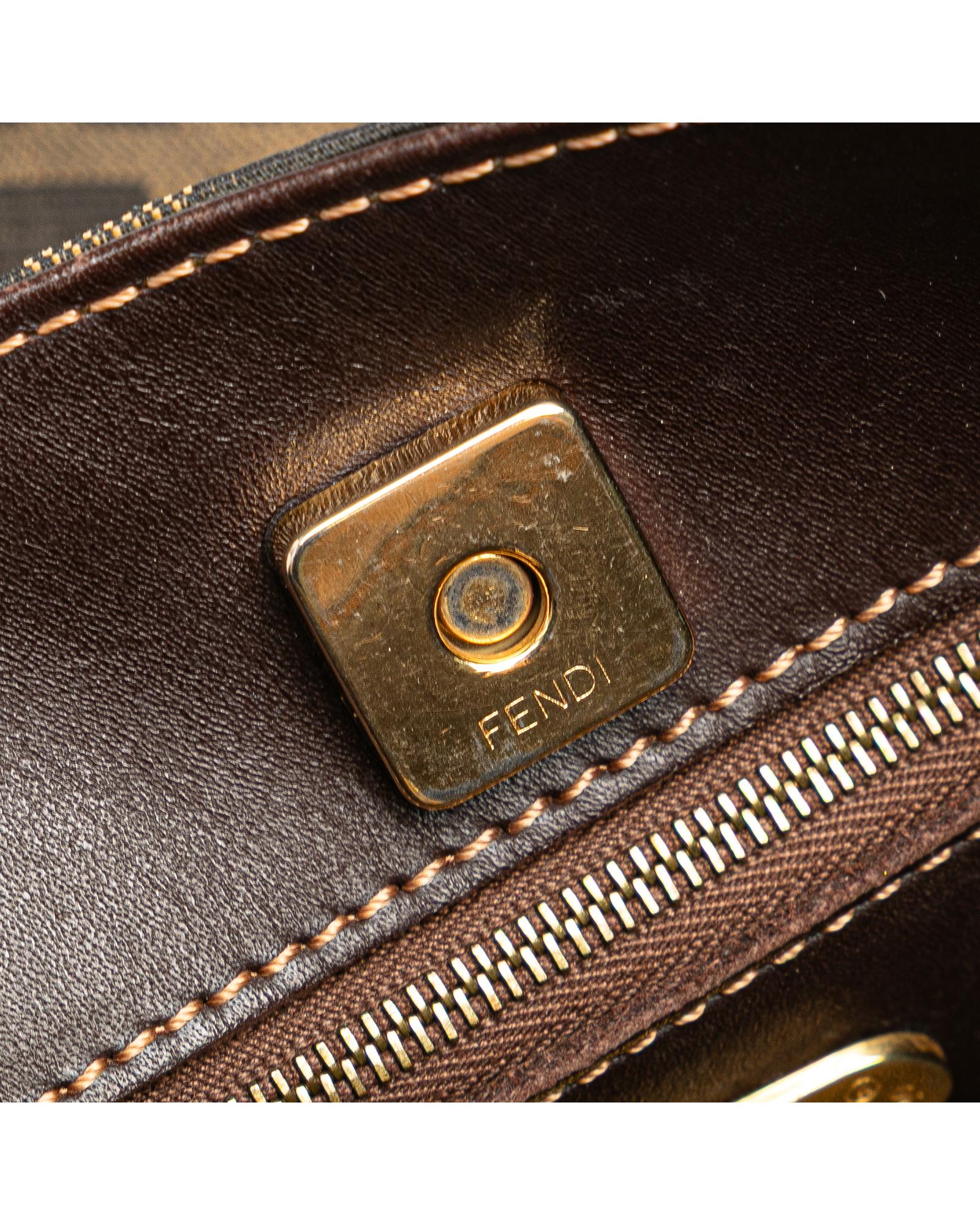 This shoulder bag features a canvas body with leather trim a flat leather strap an open top with magnetic snap closure and an interior zip pocket.Brand: Fendi