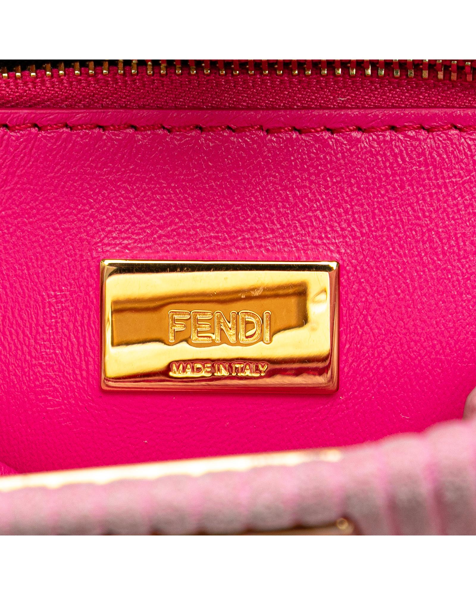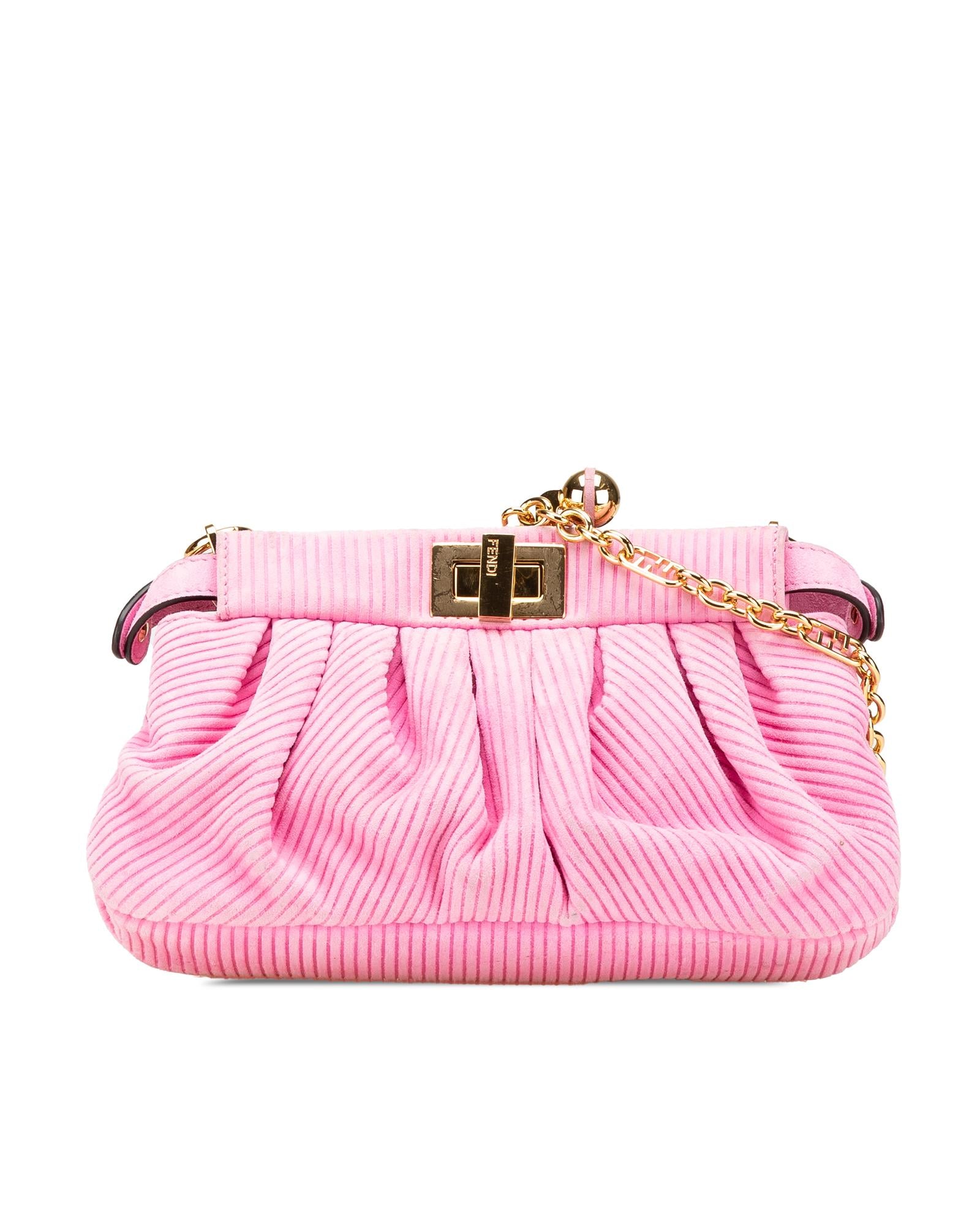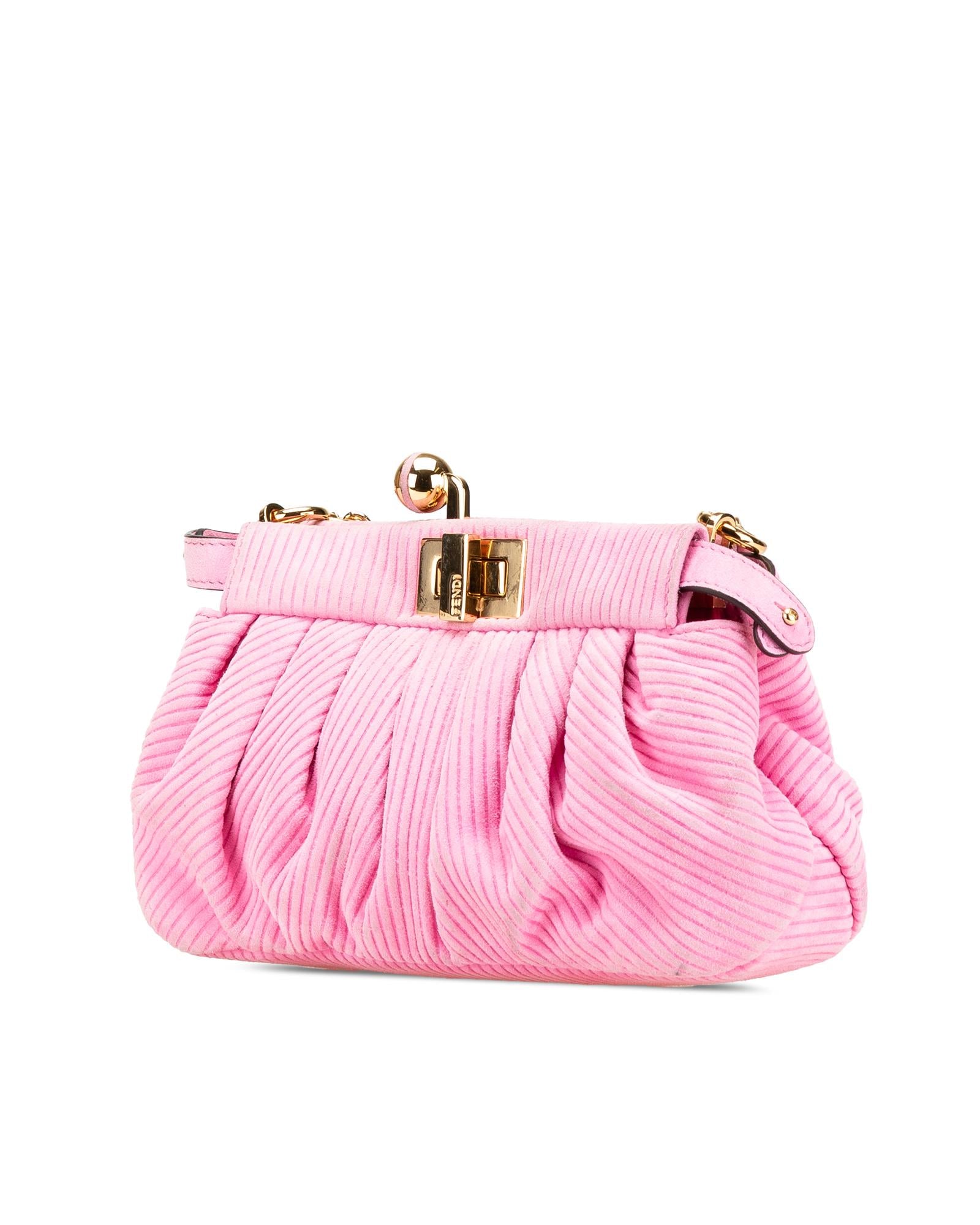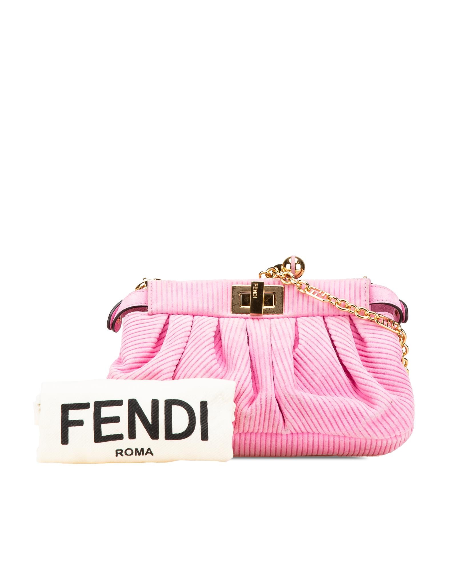 The Peekaboo Click features an embossed suede body a detachable chain link strap an open top with twist lock closure and an interior zip pocket.Brand: Fendi