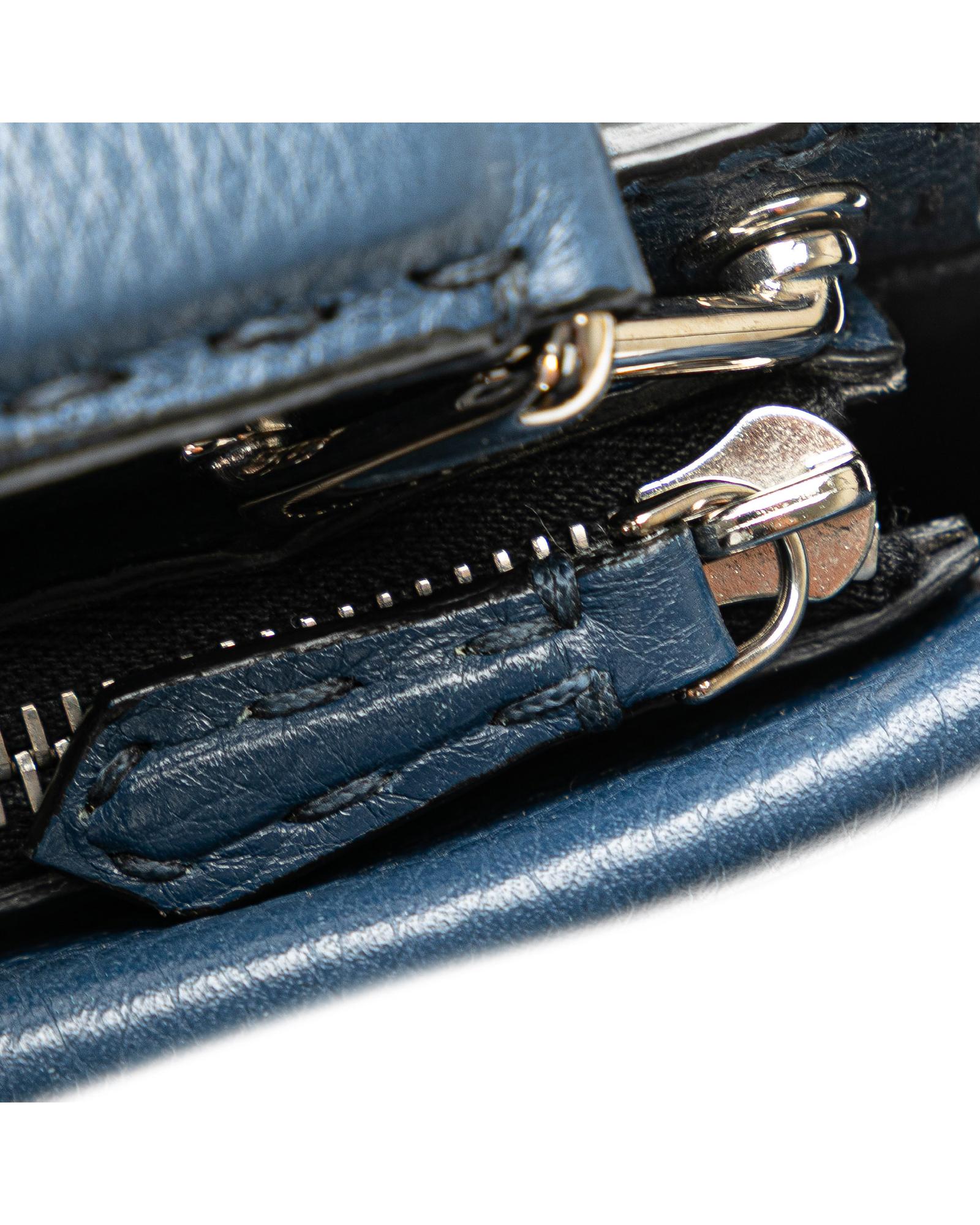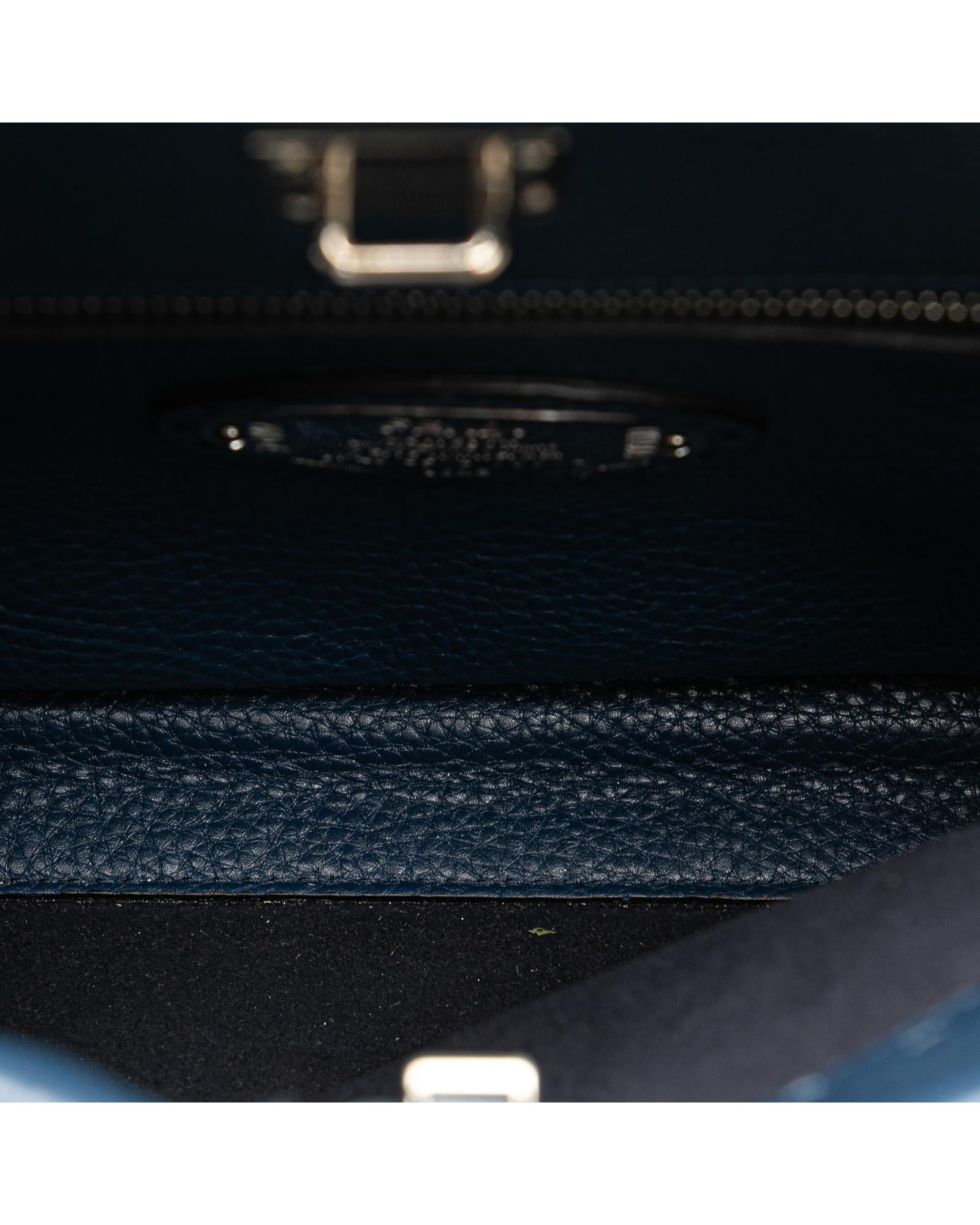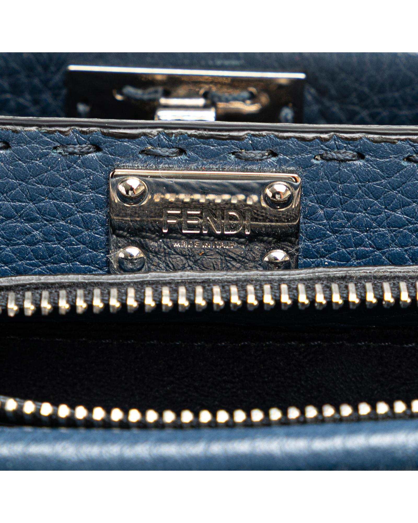 The Peekaboo features leather body a flat leather handle a detachable shoulder strap an open top with clasp closure and an interior zip pocket.