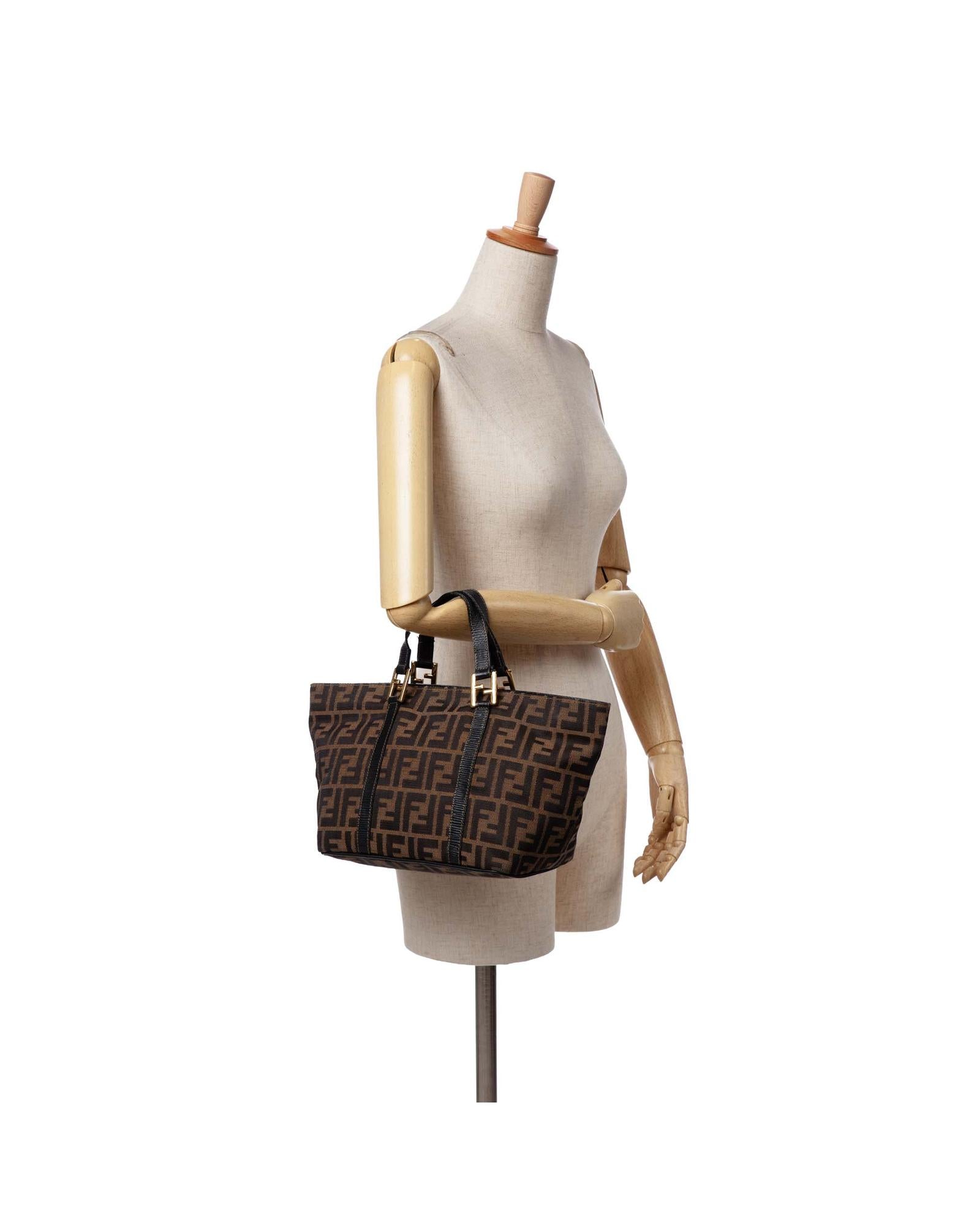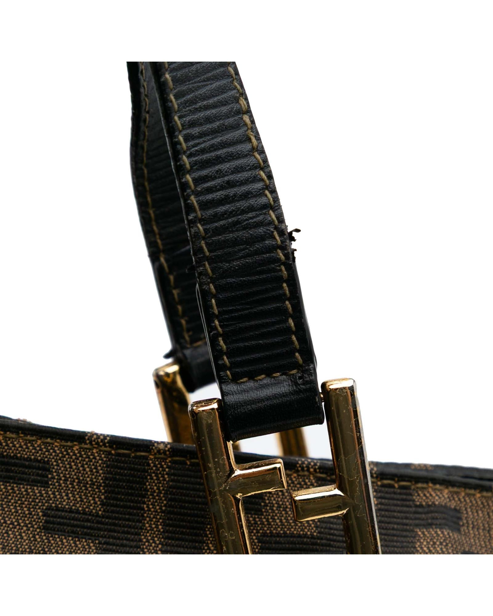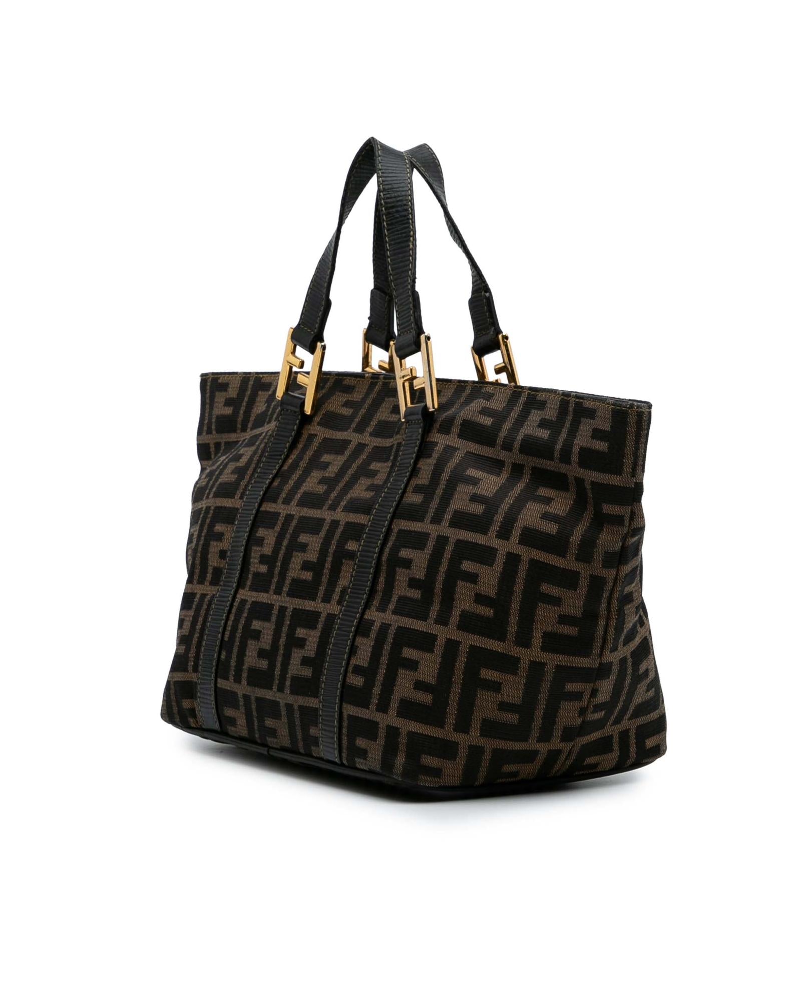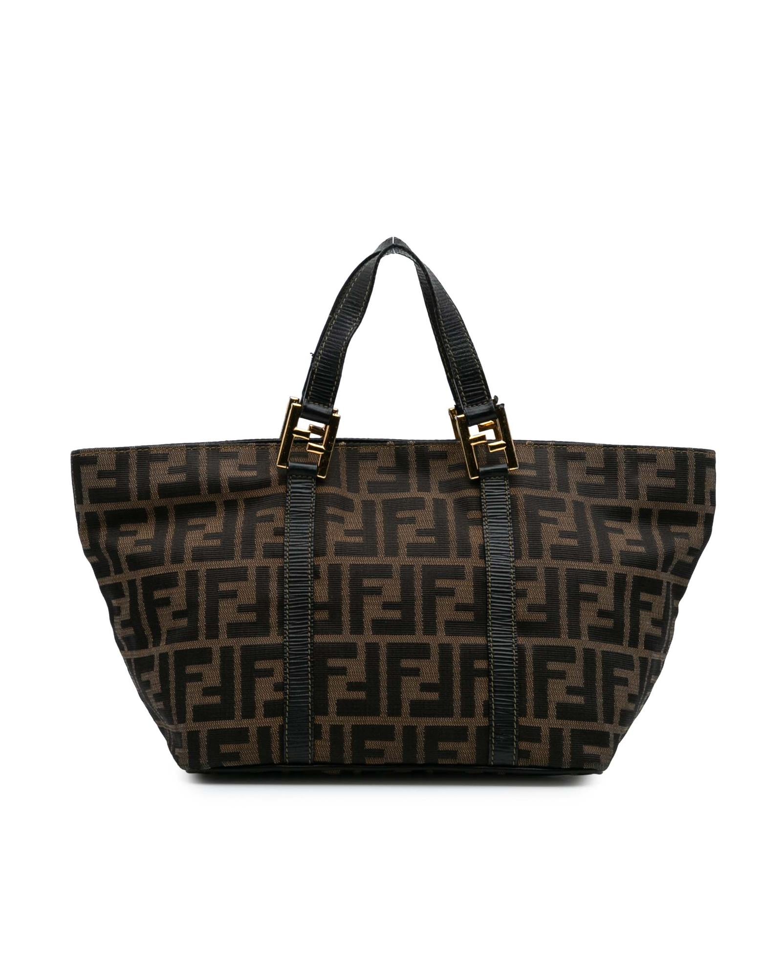 This tote bag features a canvas body with leather trim flat leather handles a top zip closure and an interior zip pocket.Brand: Fendi